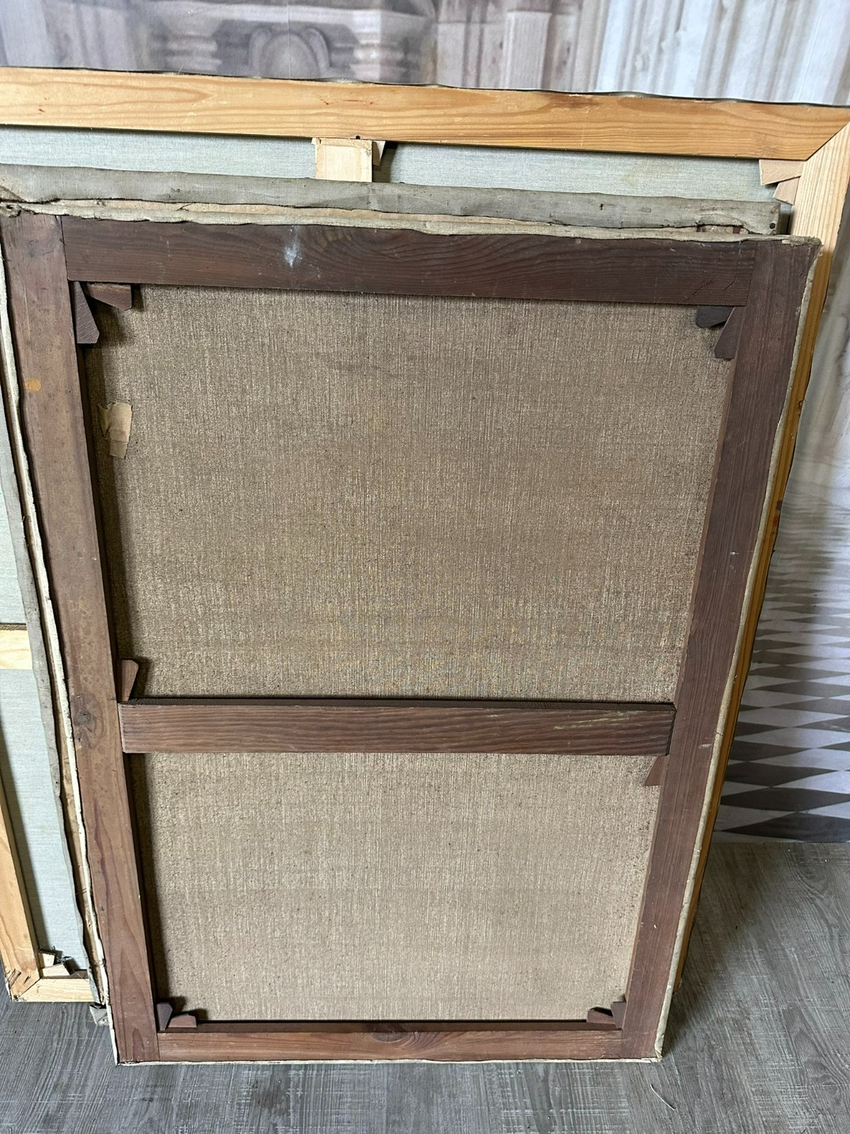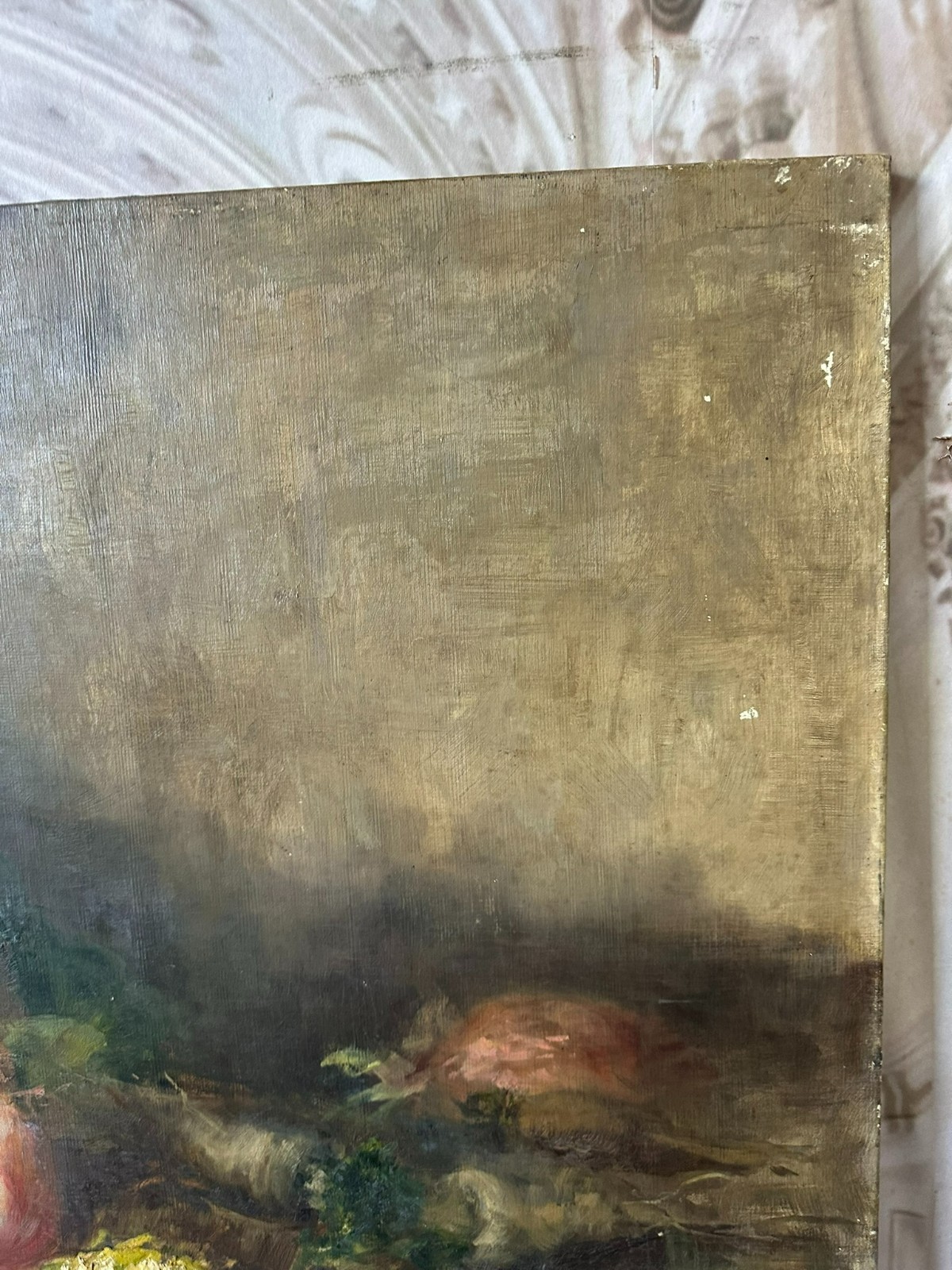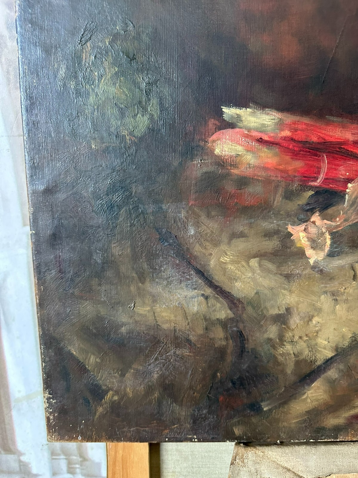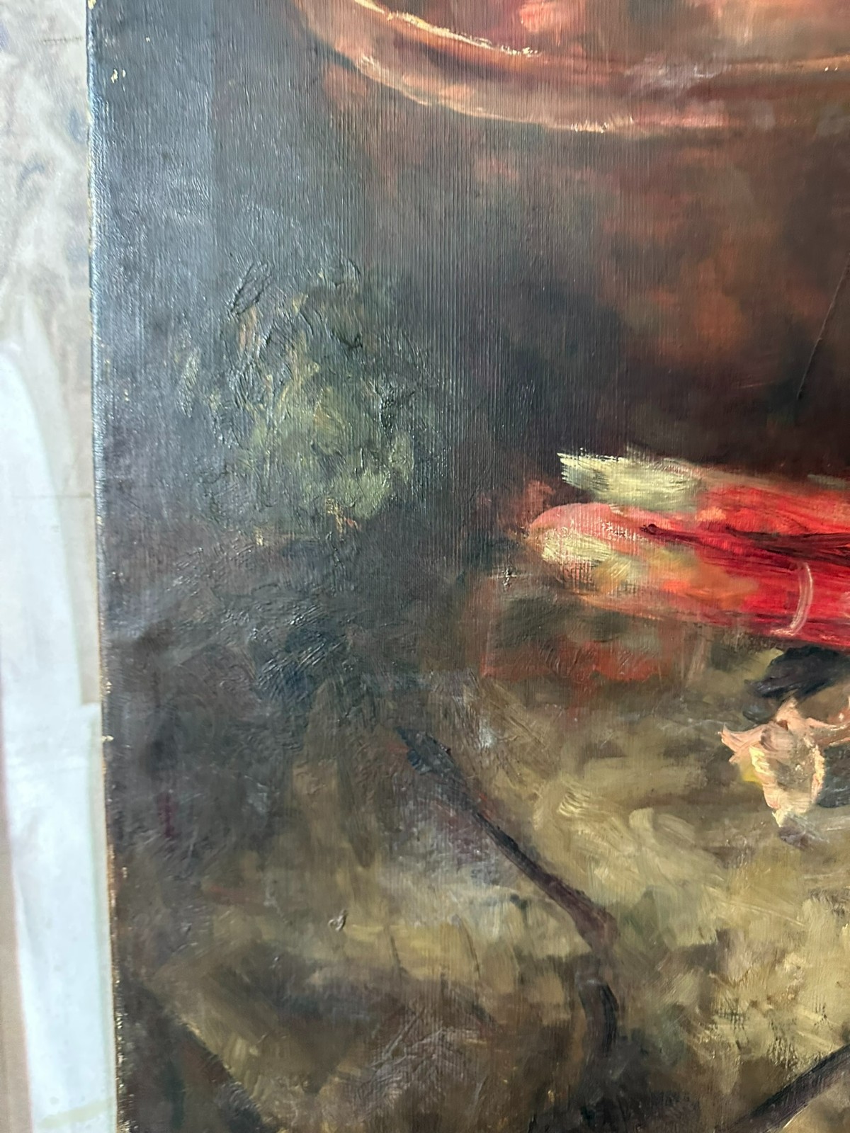 Altes Ölgemälde auf Leinwand, Stillleben mit Gemüse. Die gesamte Oberfläche mit Craquelle, schmutzig und vergilbt. Weiterhin an der gesamten Oberfläche Farbabplatzer. Das Gemälde wurde bereits mal restauriert und dabei auf Leinwand doubliert. Abmessungen 110x77cm.