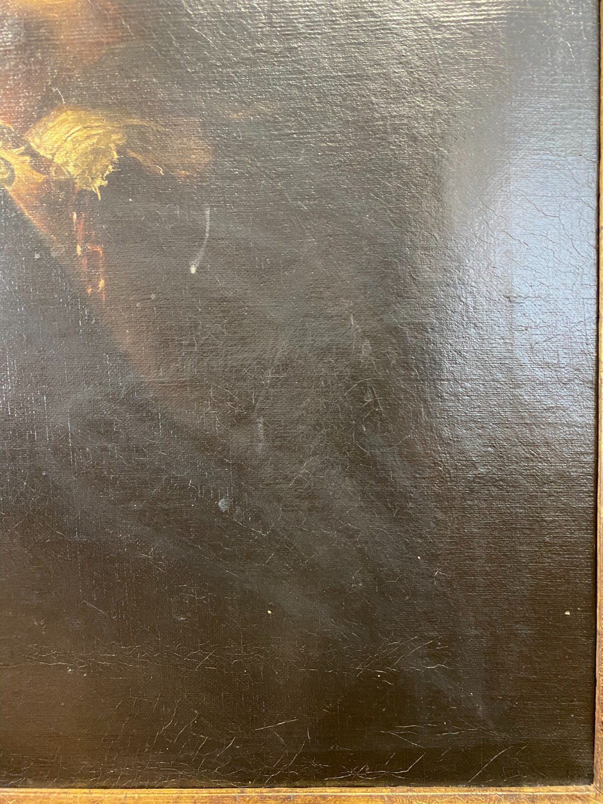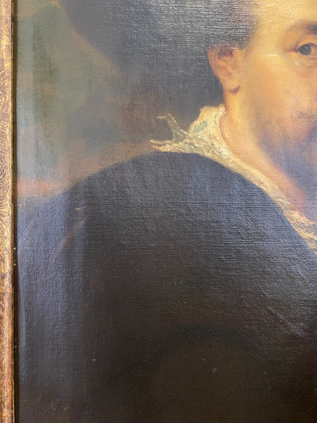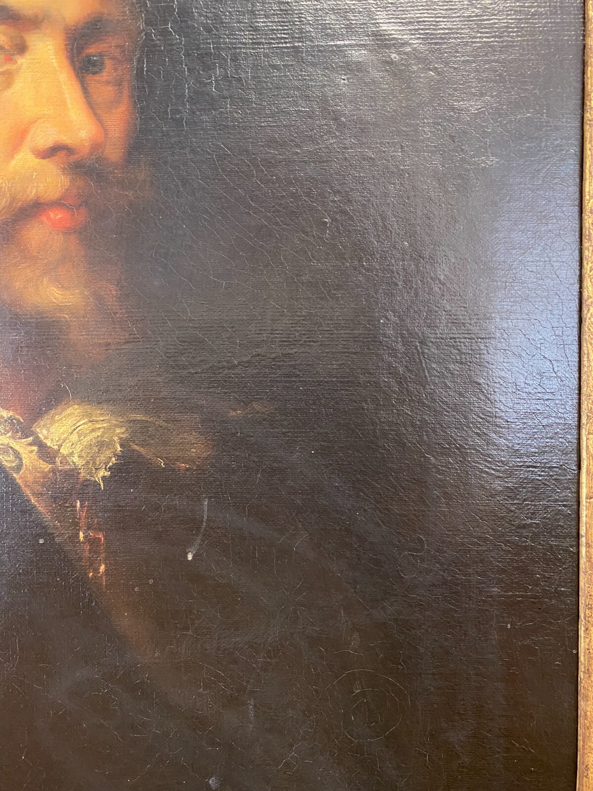 Artikelstandort: 83727 Schliersee – Nach Peter Paul Rubens, Selbstportrait Rubens, der berühmteste flämische Maler des 17. Jahrhunderts, wird hier mit einem großen Hut gezeigt. Ein Umhang verbirgt seine Kleidung, von der nur die Spitze des weißen Kragens sowie ein Teil einer Kette zu sehen ist. Attribute, die auf seinen Beruf hindeuten sind nicht erkennbar. Er blickt würdevoll und selbstsicher den Betrachter an. In der Manier von Hermann Kaulbach. Öl auf Leinwand, unsigniert, um 1900 angefertigt. An der gesamten Oberfläche leichtes Craquelee, wenige minimale Farbabplatzer. Im oberen Bereich diverse Leinwandschäden, diese wurden gekittet und übermalt. Die Leinwand wurde mal auf einen anderen Keilrahmen überspannt. Die Leinwand ist minimal dellig, der Rahmen leicht berieben und mit altem inaktiven Wurmfraß. Die blattgoldüberzogene Innenleiste hat Risse und wenige kleine Abplatzer. Abmessungen 58,5×73,5cm, mit Rahmen 74x91cm.