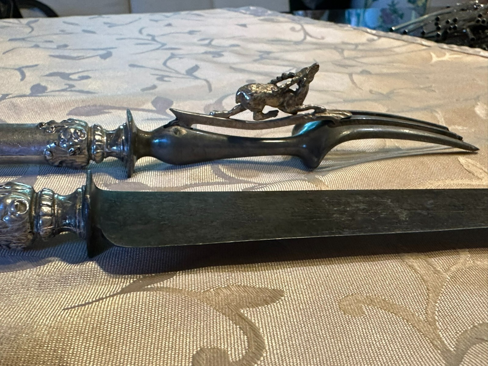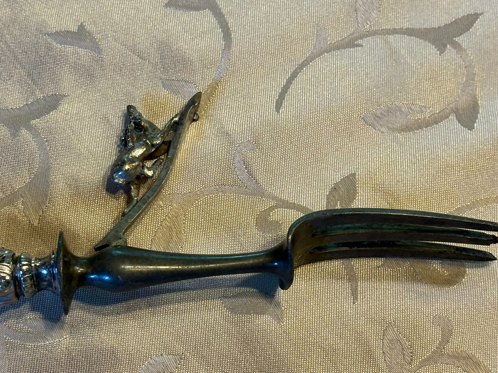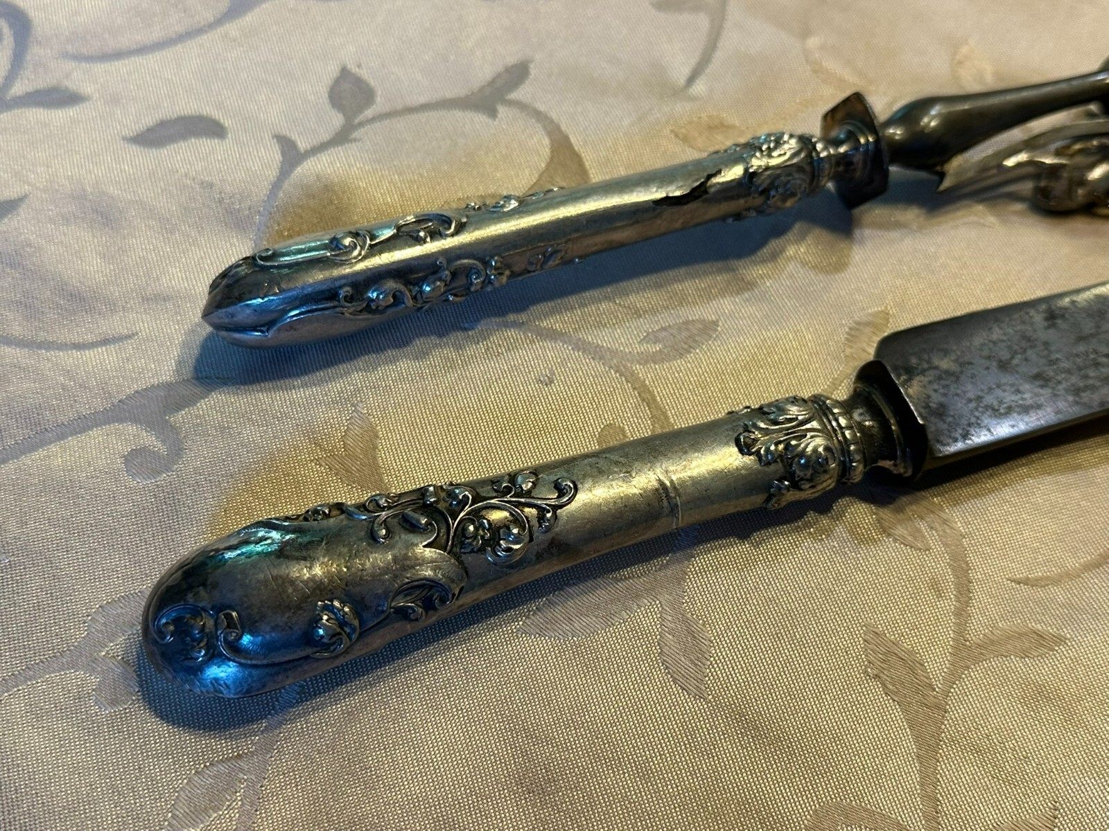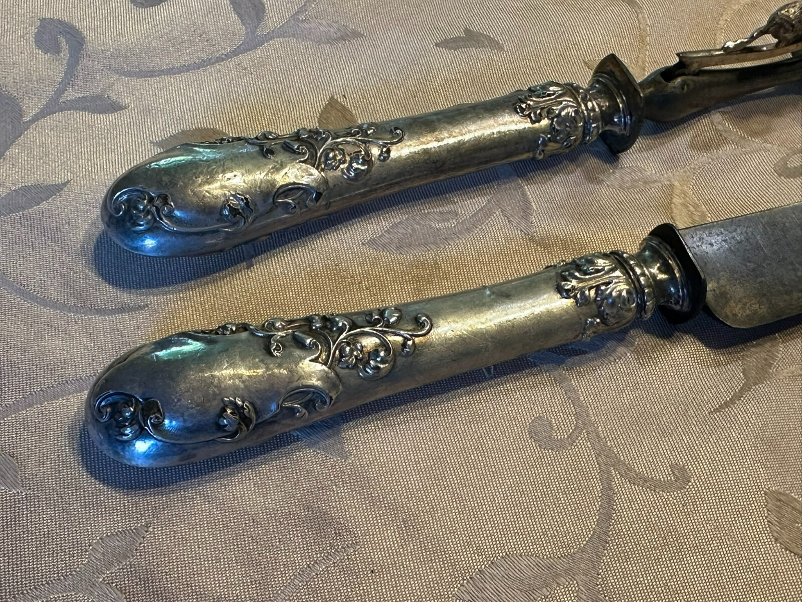 Großes antikes Vorlegebesteck, die Griffe aus Silber, punziert mit dem Kopf der Diana nach rechts. An den Griffen diverse Knicke und kleinere Beschädigungen, Vorderteil der Gabel ist wohl aus Zinn, die Messerklinge zum Teil korrodiert, Länge 26,5cm und 31cm, Gesamtgewicht 159g.
