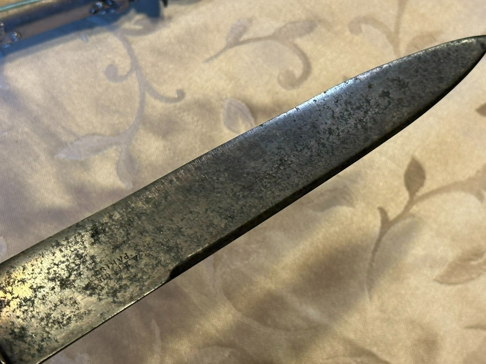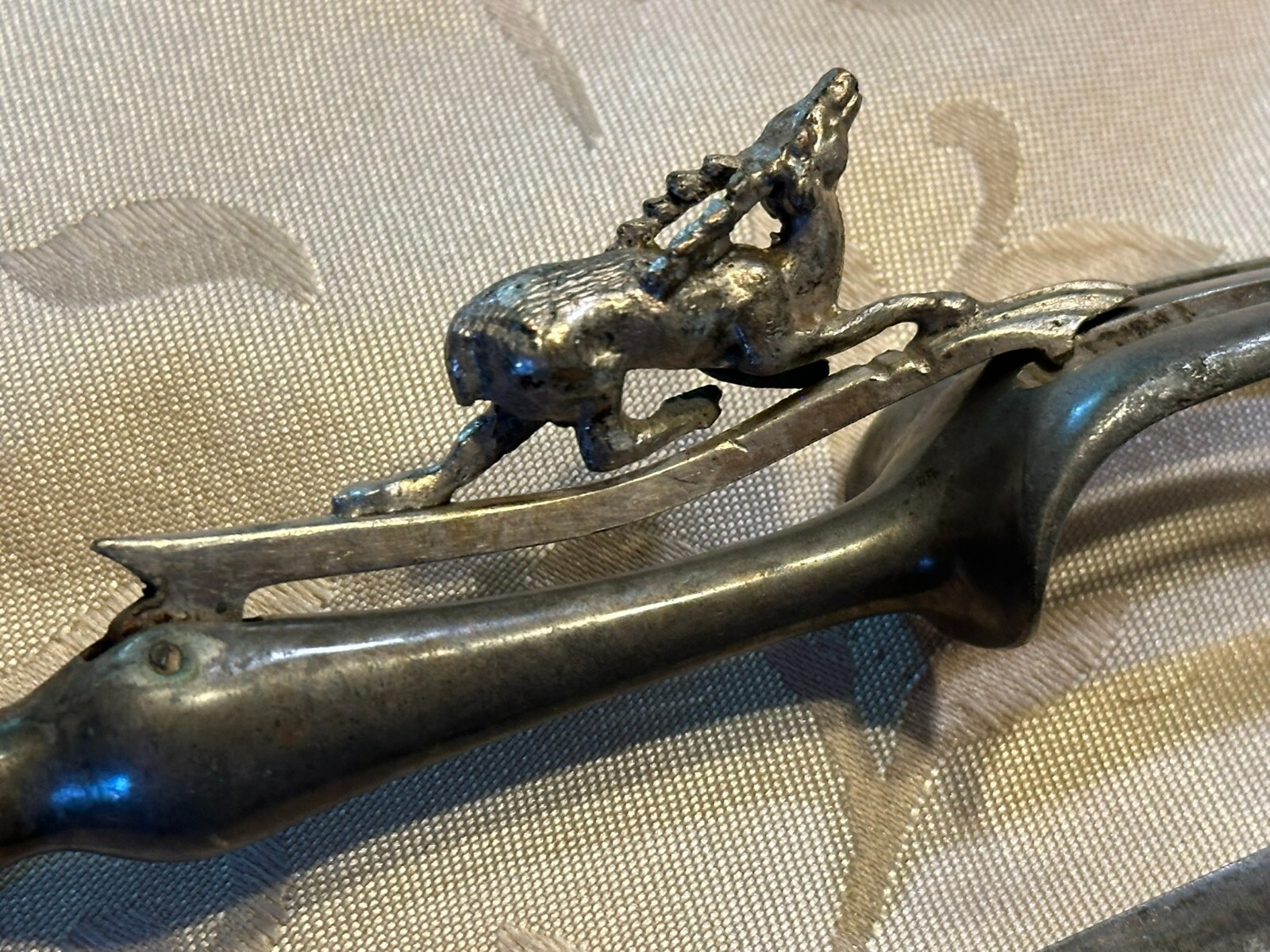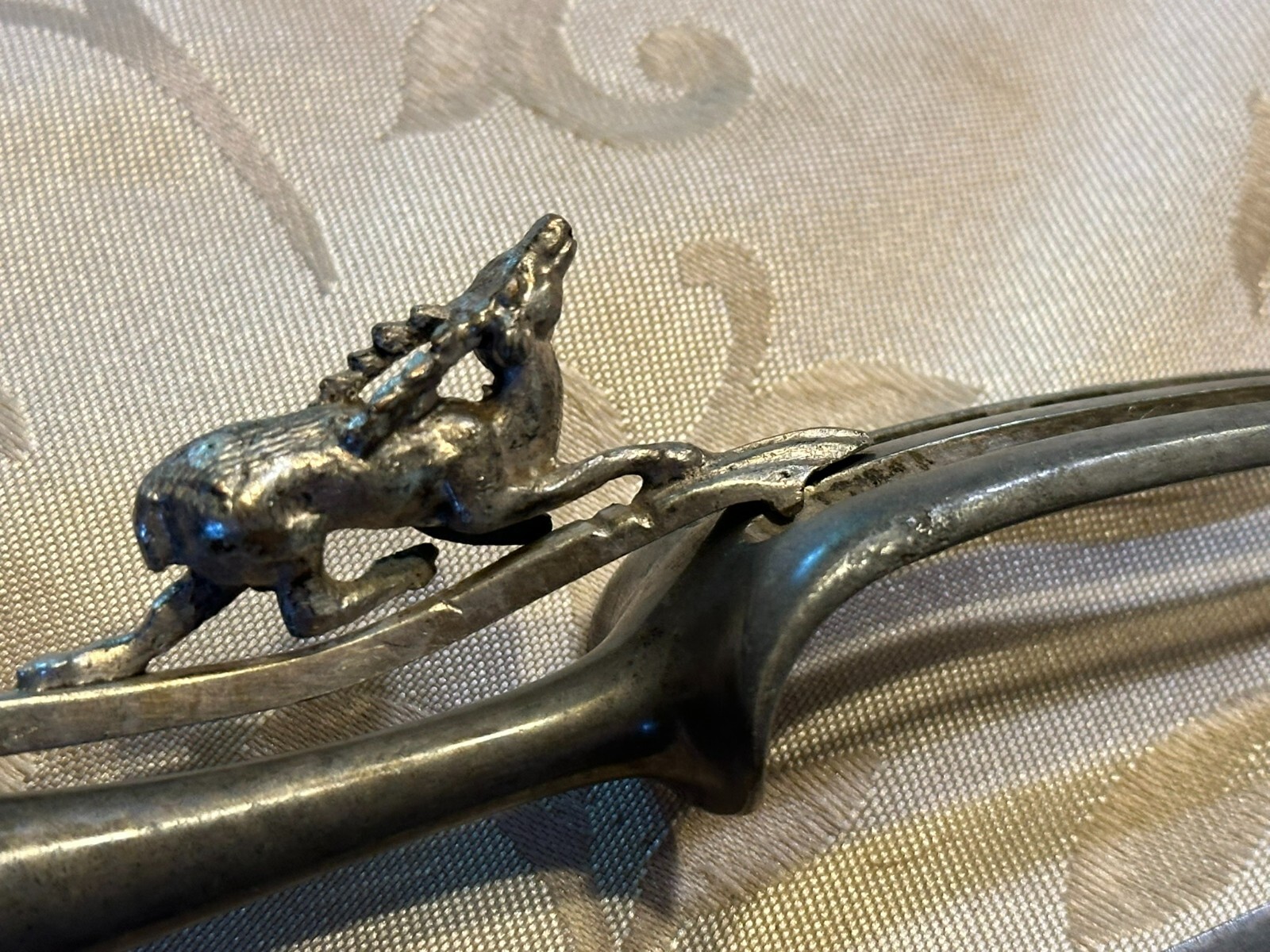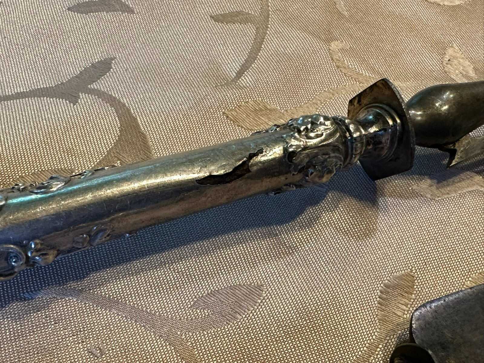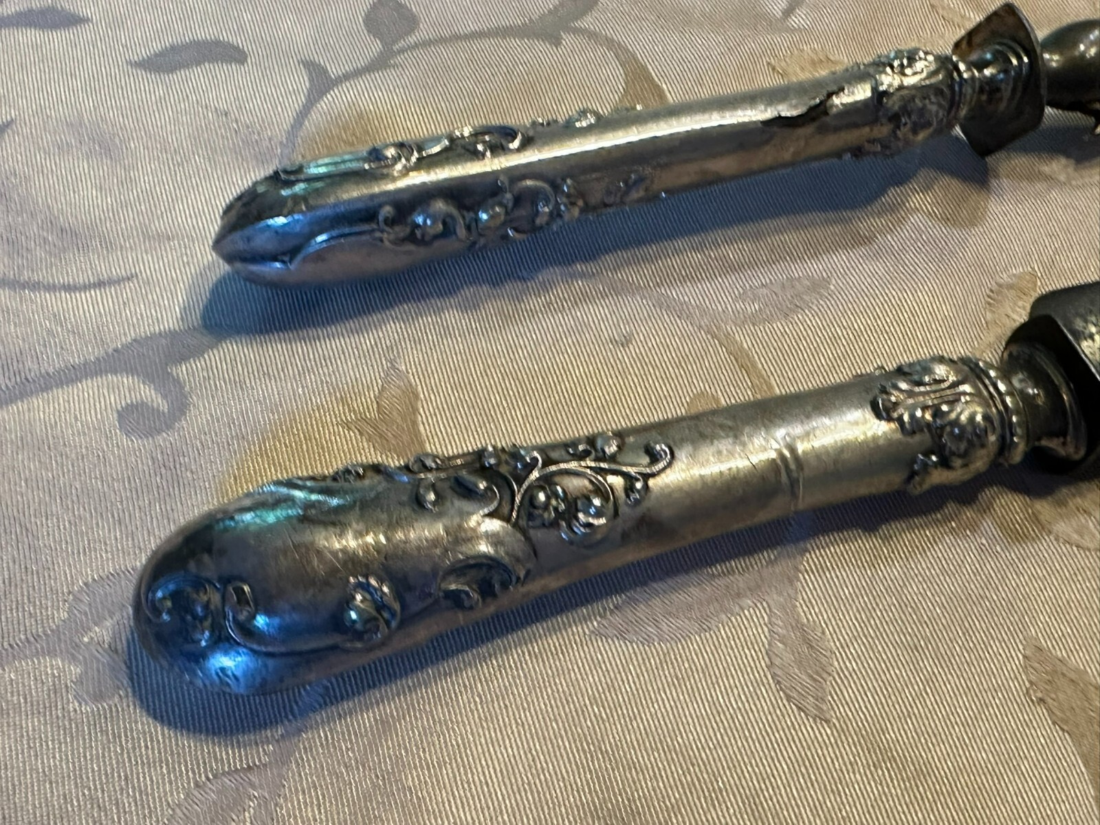 Großes antikes Vorlegebesteck, die Griffe aus Silber, punziert mit dem Kopf der Diana nach rechts. An den Griffen diverse Knicke und kleinere Beschädigungen, Vorderteil der Gabel ist wohl aus Zinn, die Messerklinge zum Teil korrodiert, Länge 26,5cm und 31cm, Gesamtgewicht 159g.