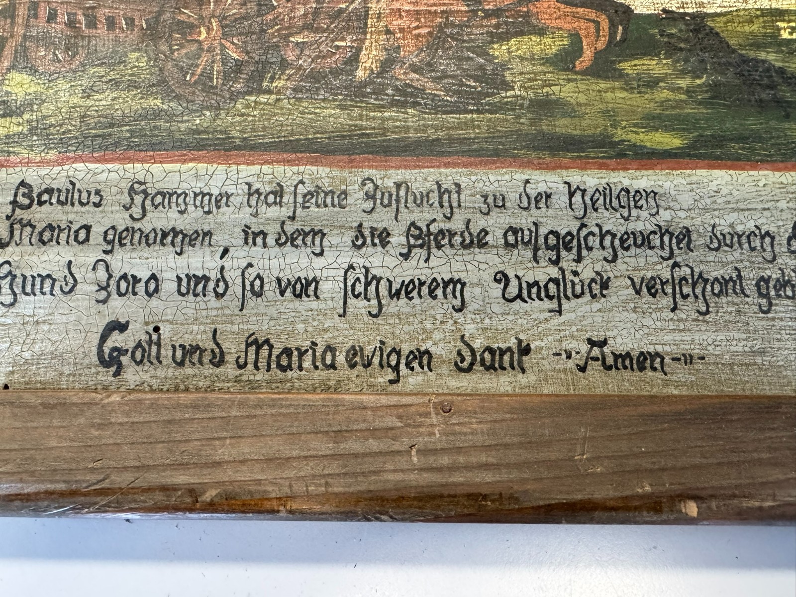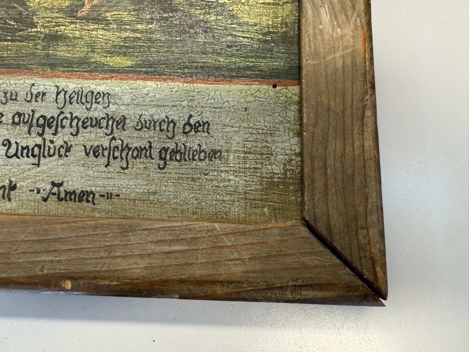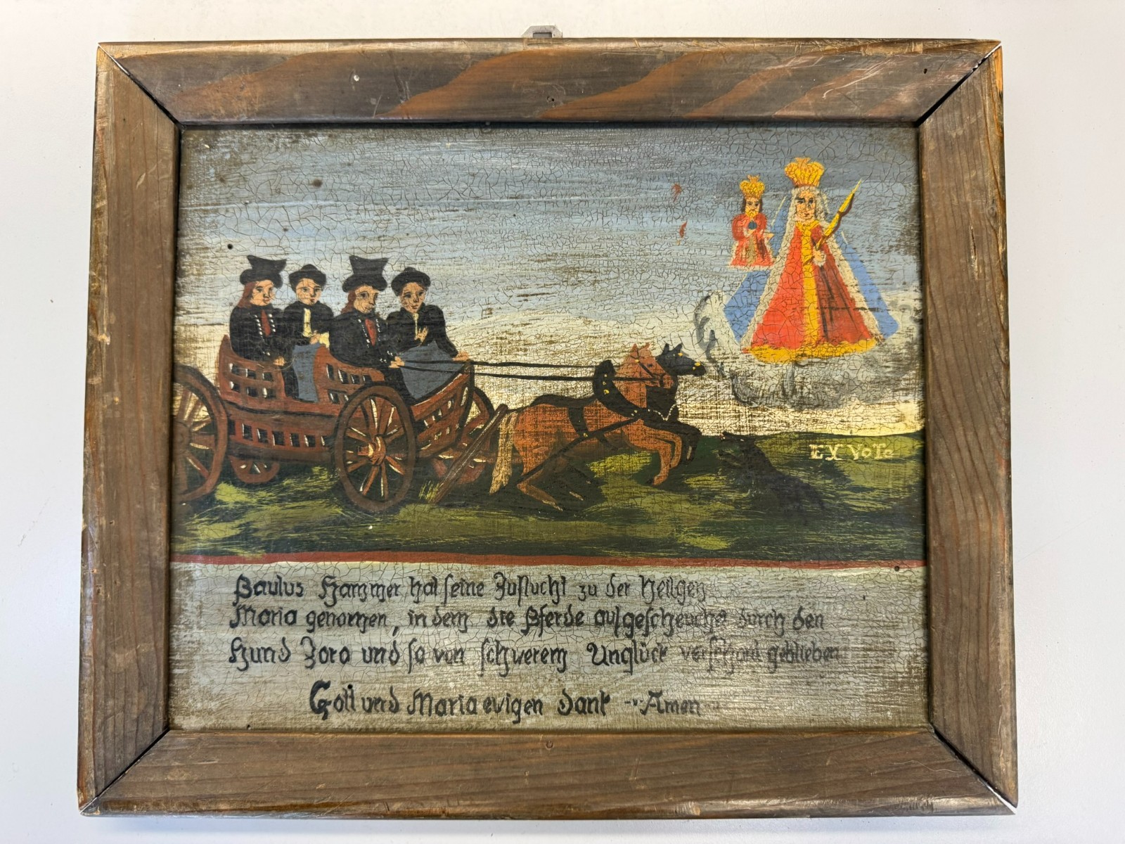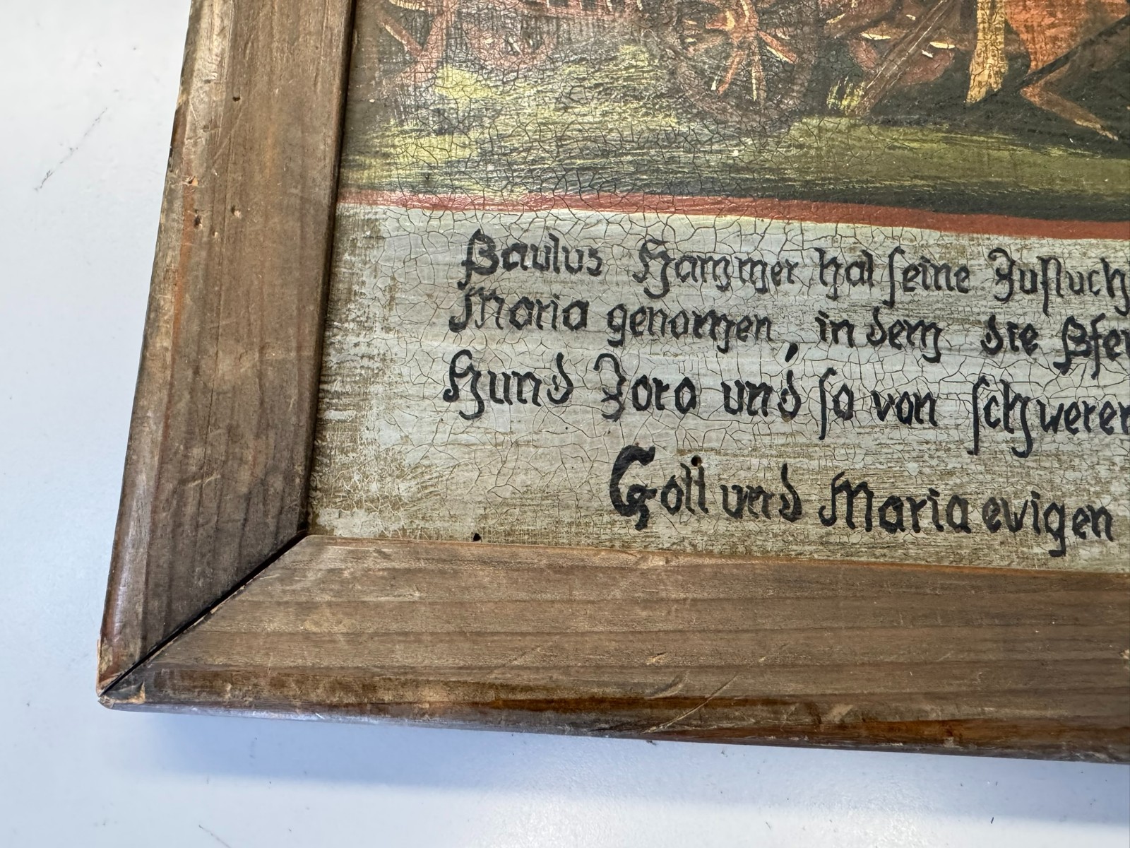 Sehr schönes Votivbild mit Gebet auf einer Holztafel, die Bemalung des Rahmens ist inzwischen verblasst, auf der Platte leider starkes Krakelee, teils schmutzig, der Rahmen ist an den Ecken bestoßen und geht dort leicht auseinander. Abmessungen gesamt: 34x29cm, ohne Rahmen: 29x24cm.