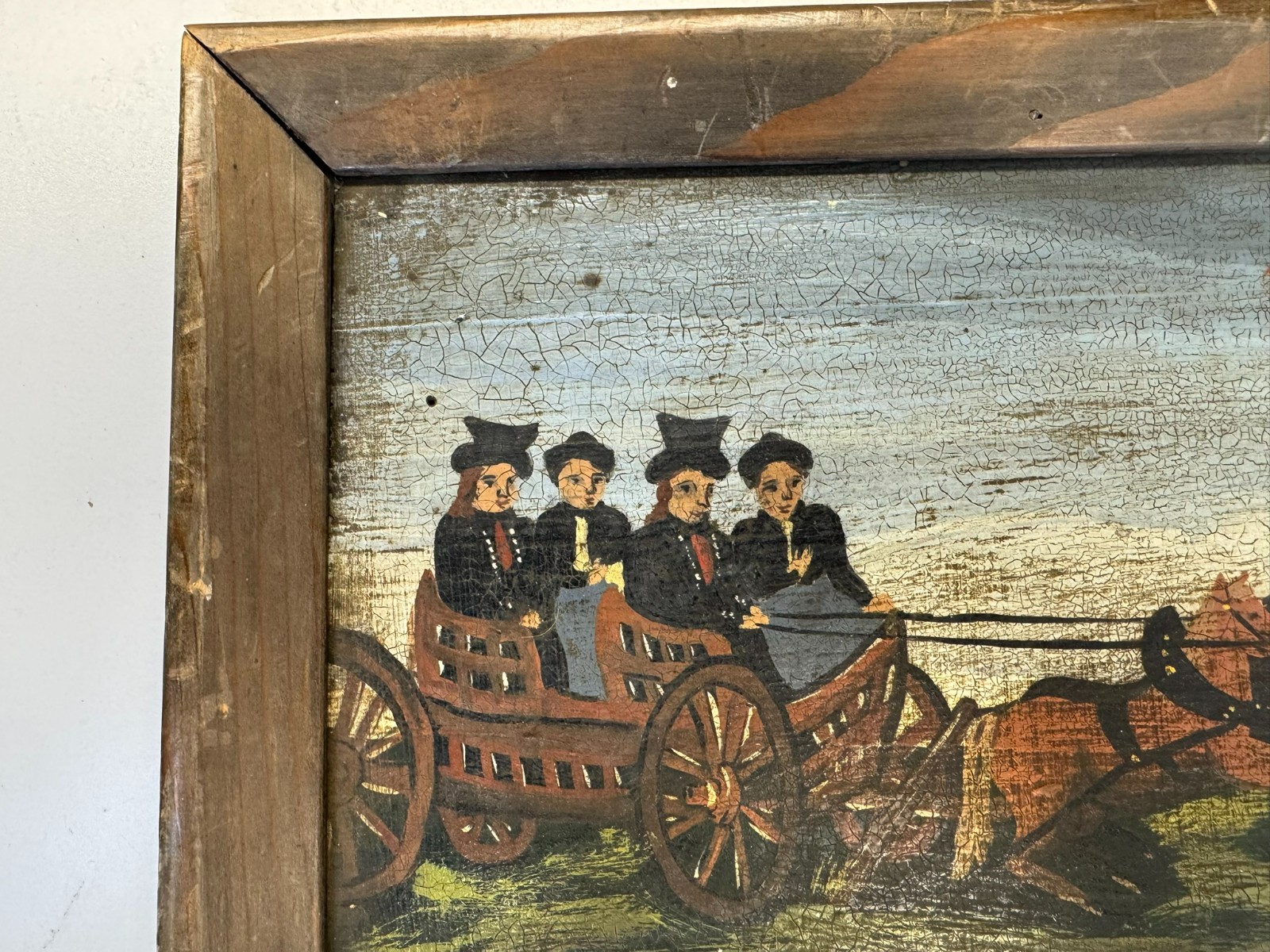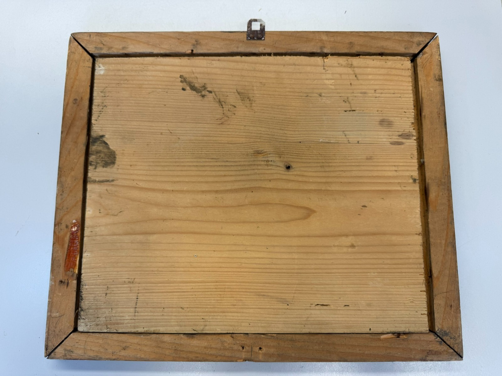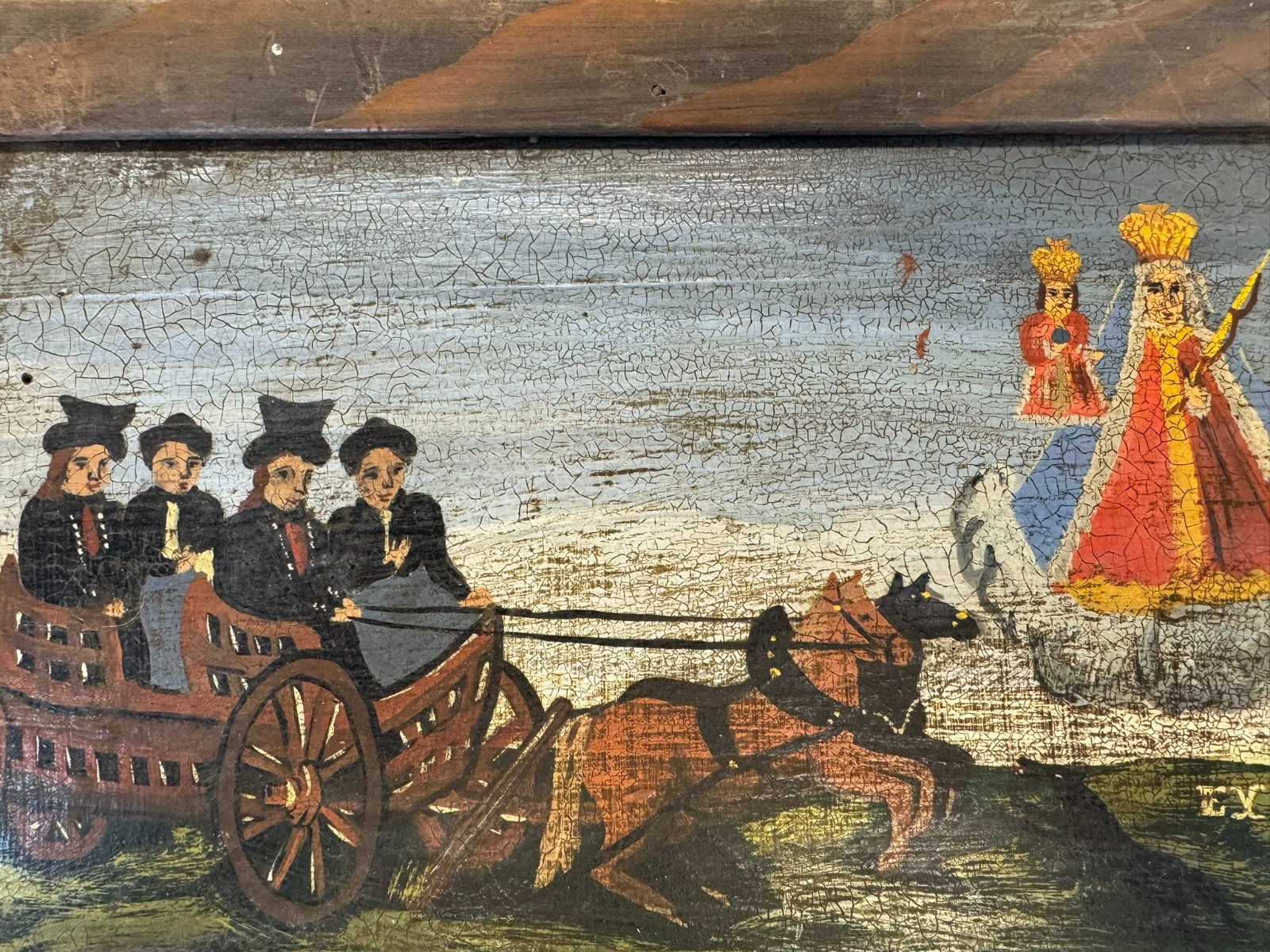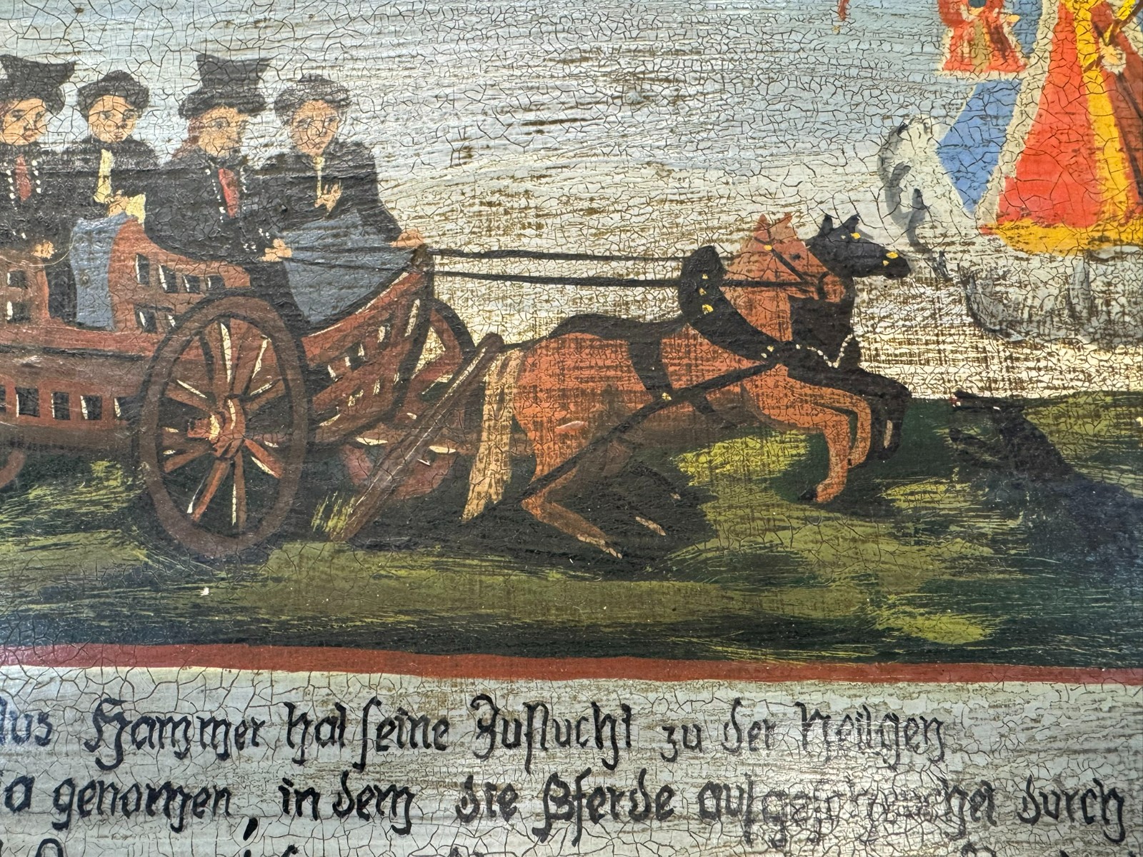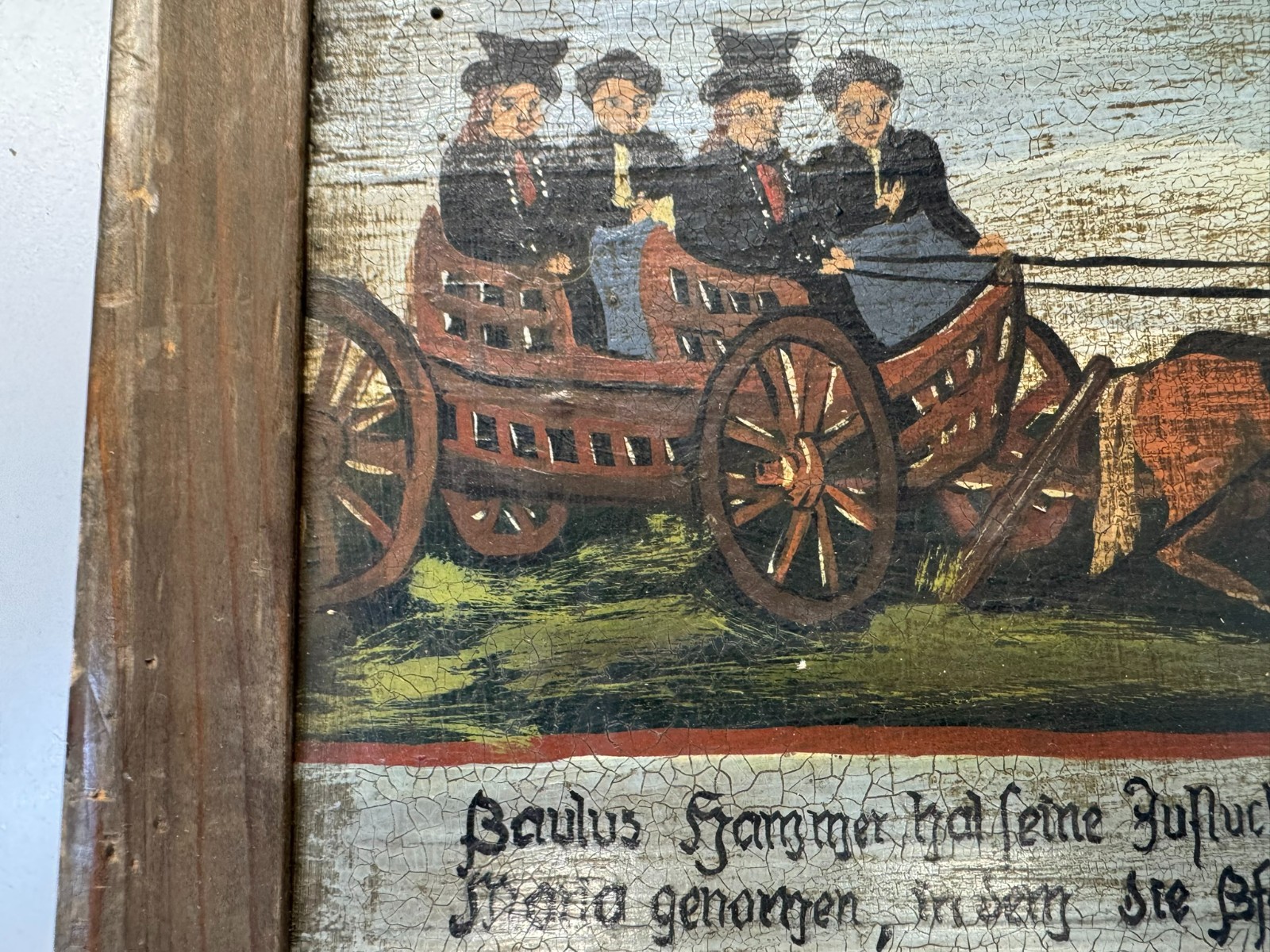 Sehr schönes Votivbild mit Gebet auf einer Holztafel, die Bemalung des Rahmens ist inzwischen verblasst, auf der Platte leider starkes Krakelee, teils schmutzig, der Rahmen ist an den Ecken bestoßen und geht dort leicht auseinander. Abmessungen gesamt: 34x29cm, ohne Rahmen: 29x24cm.