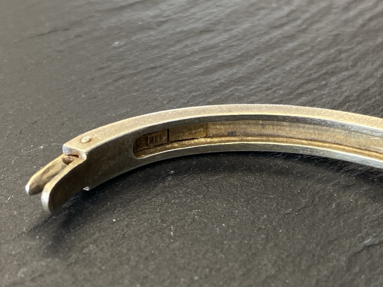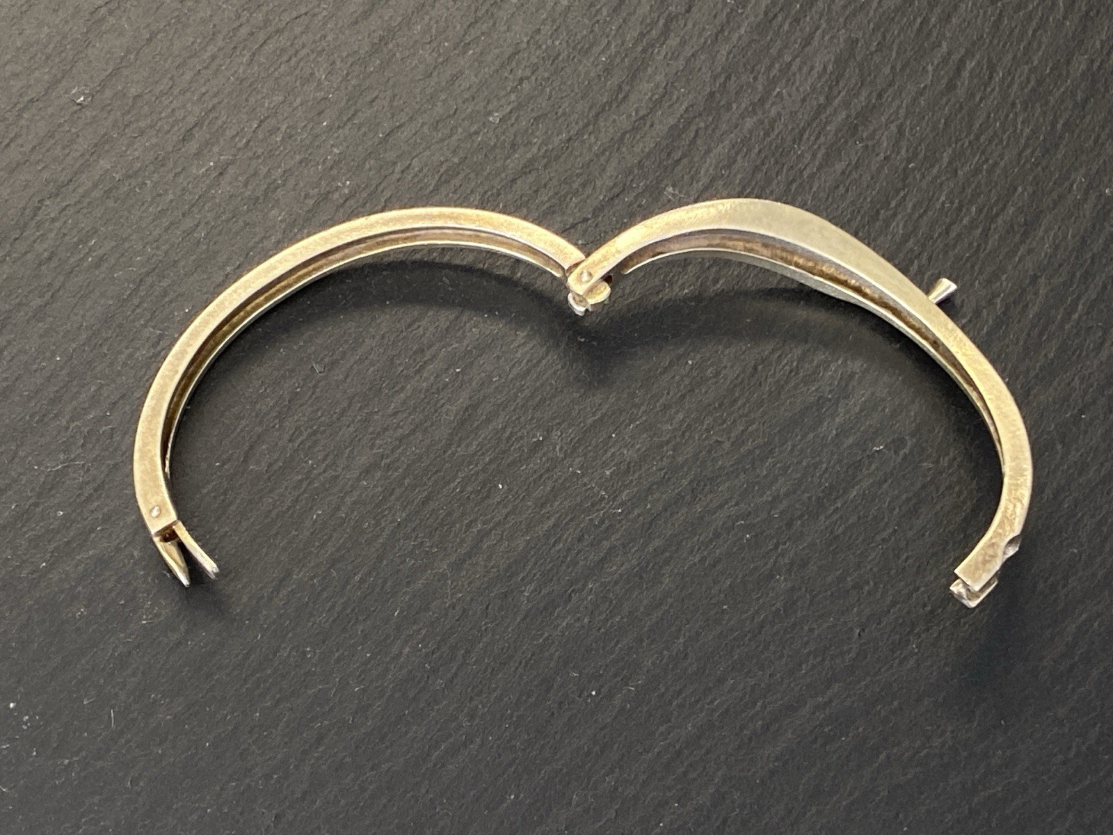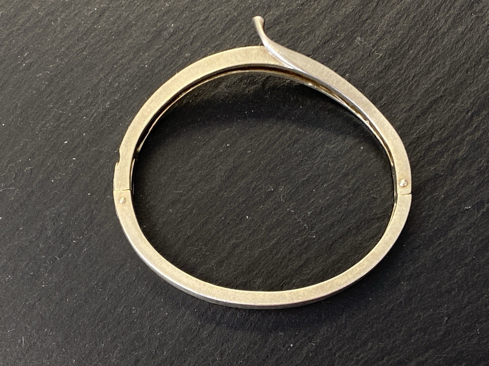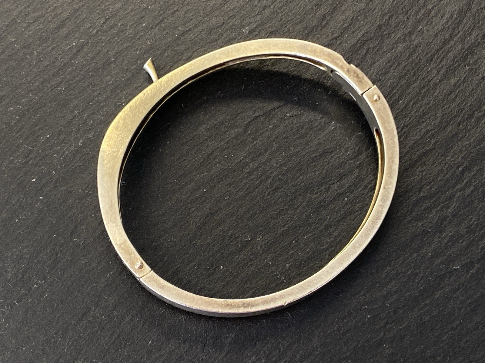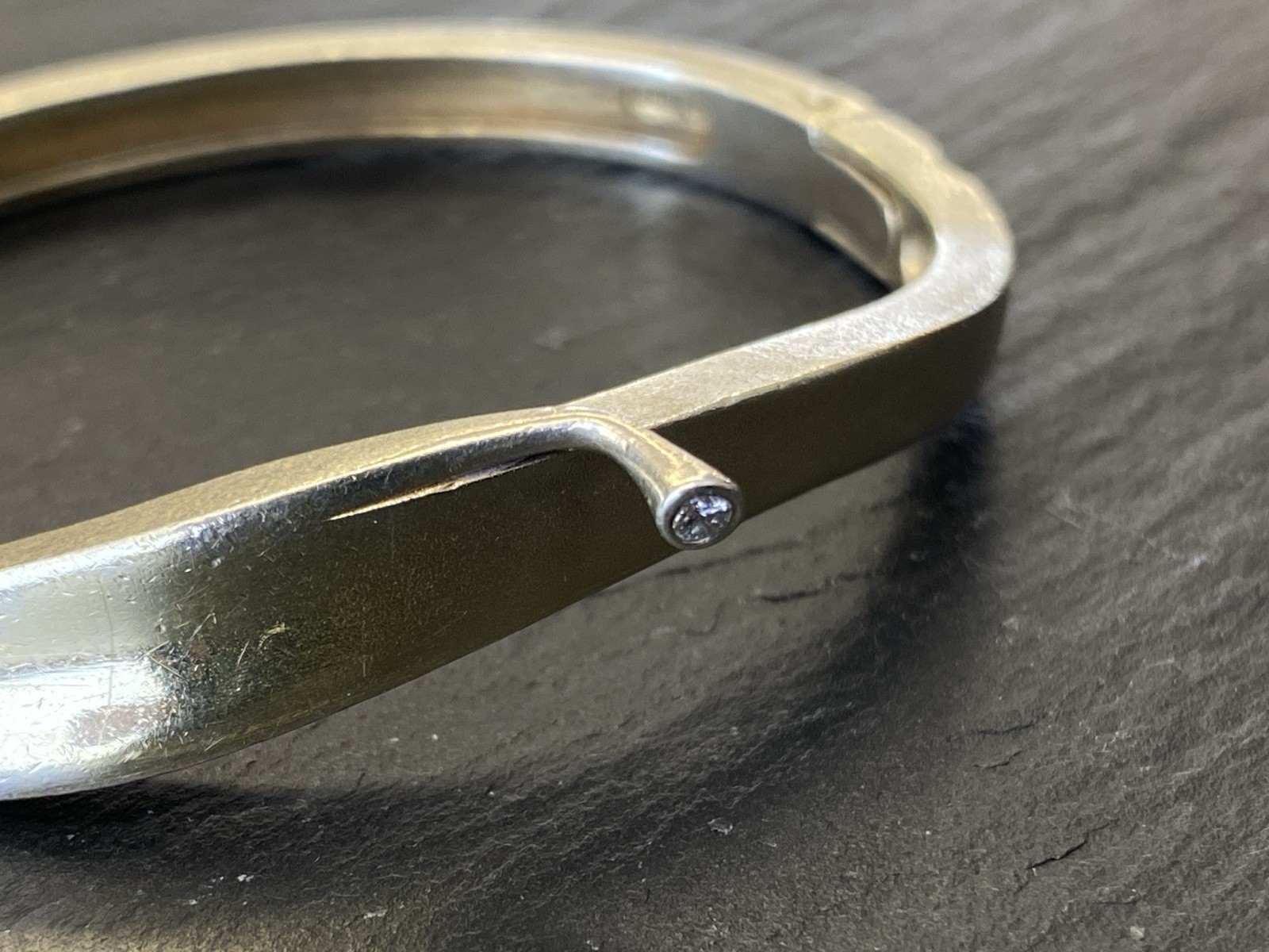 Eleganter Armreif aus 925 Sterling Silber, gestempelt, ebenfalls mit Gravur. Der Armreif ist oben geschwungen und mit einem kleinen Diamanten von ca. 0,03ct. in VS1/G, soweit in der Fassung messbar, versehen. Die Oberfläche weist einige Abnutzungsspuren auf, kleinere Kratzer möglich. Insgesamt Oxydation sichtbar. Der Armreif lässt sich an der Seite öffnen, der Verschluss ist funktionsfähig. B/H oben 1,1/0,4cm, unten 0,6/0,3cm. Durchmesser 6,5×5,5cm, Gewicht ca. 23,51g.