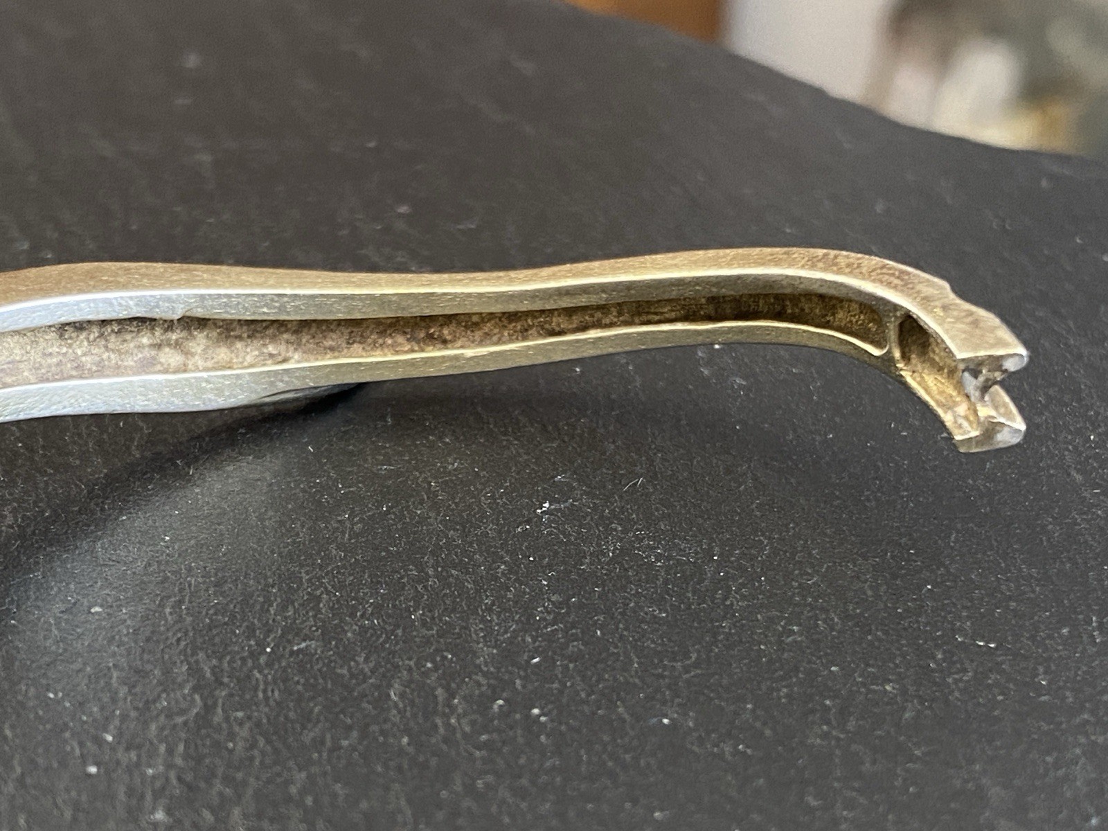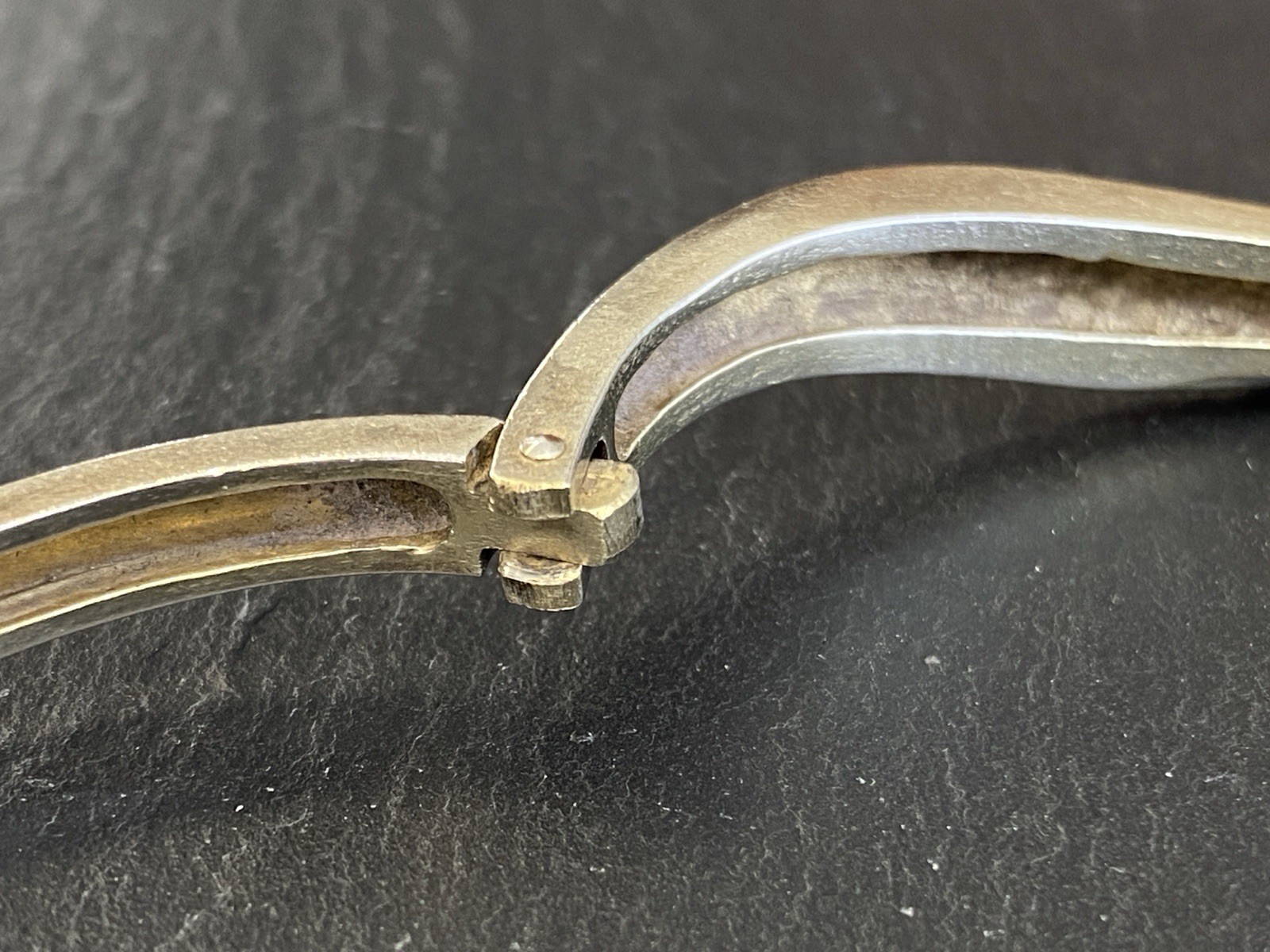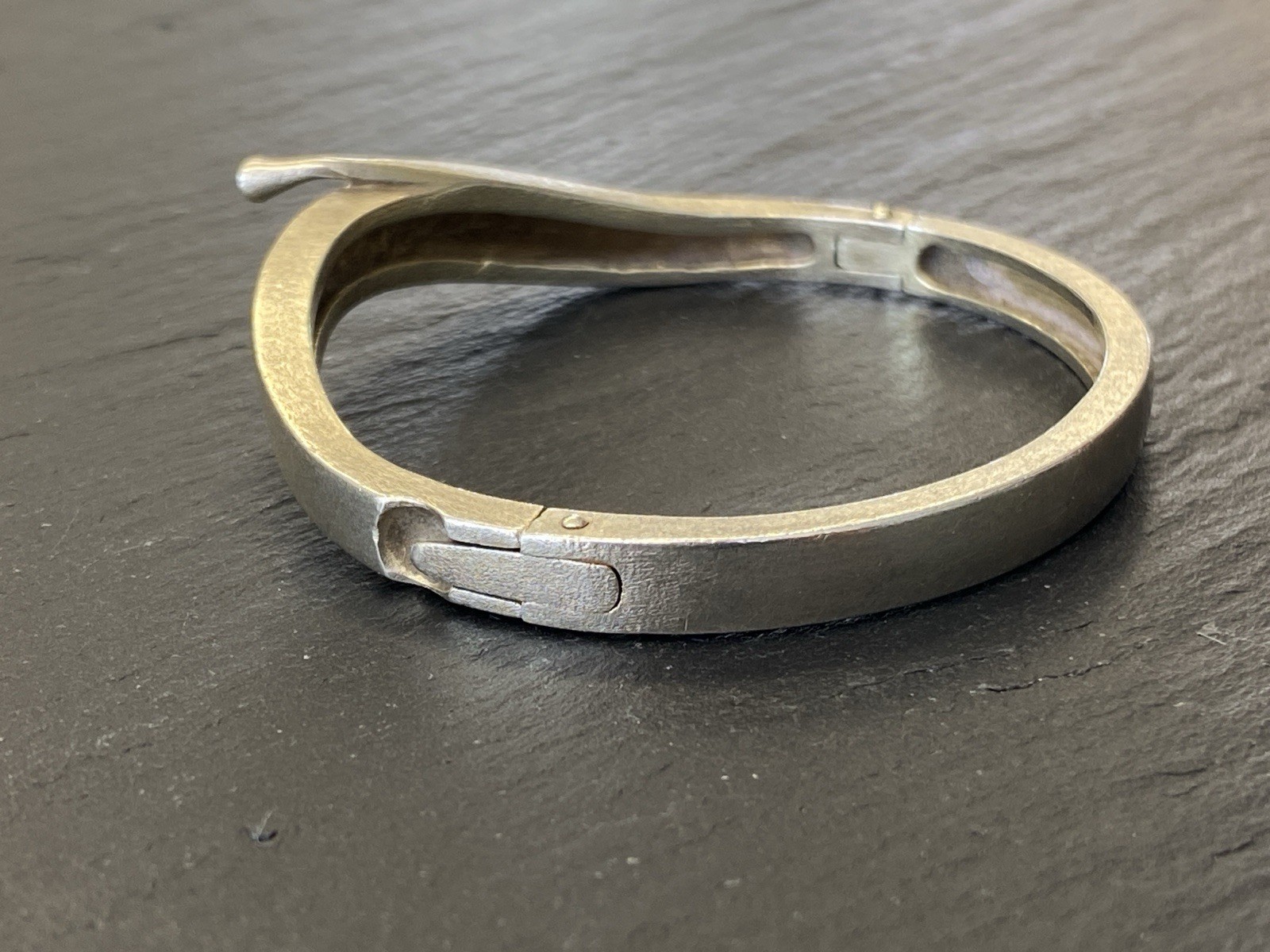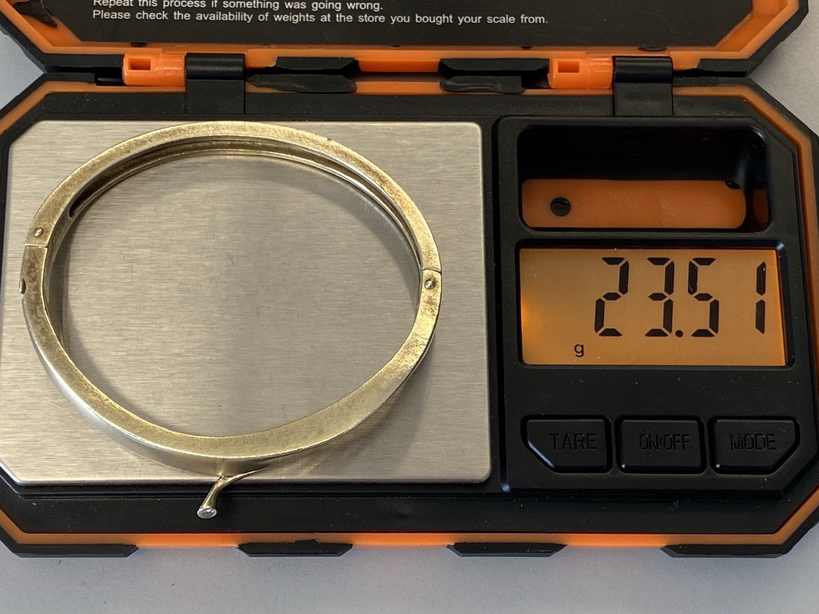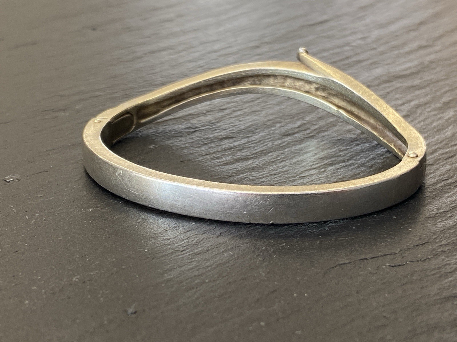 Eleganter Armreif aus 925 Sterling Silber, gestempelt, ebenfalls mit Gravur. Der Armreif ist oben geschwungen und mit einem kleinen Diamanten von ca. 0,03ct. in VS1/G, soweit in der Fassung messbar, versehen. Die Oberfläche weist einige Abnutzungsspuren auf, kleinere Kratzer möglich. Insgesamt Oxydation sichtbar. Der Armreif lässt sich an der Seite öffnen, der Verschluss ist funktionsfähig. B/H oben 1,1/0,4cm, unten 0,6/0,3cm. Durchmesser 6,5×5,5cm, Gewicht ca. 23,51g.