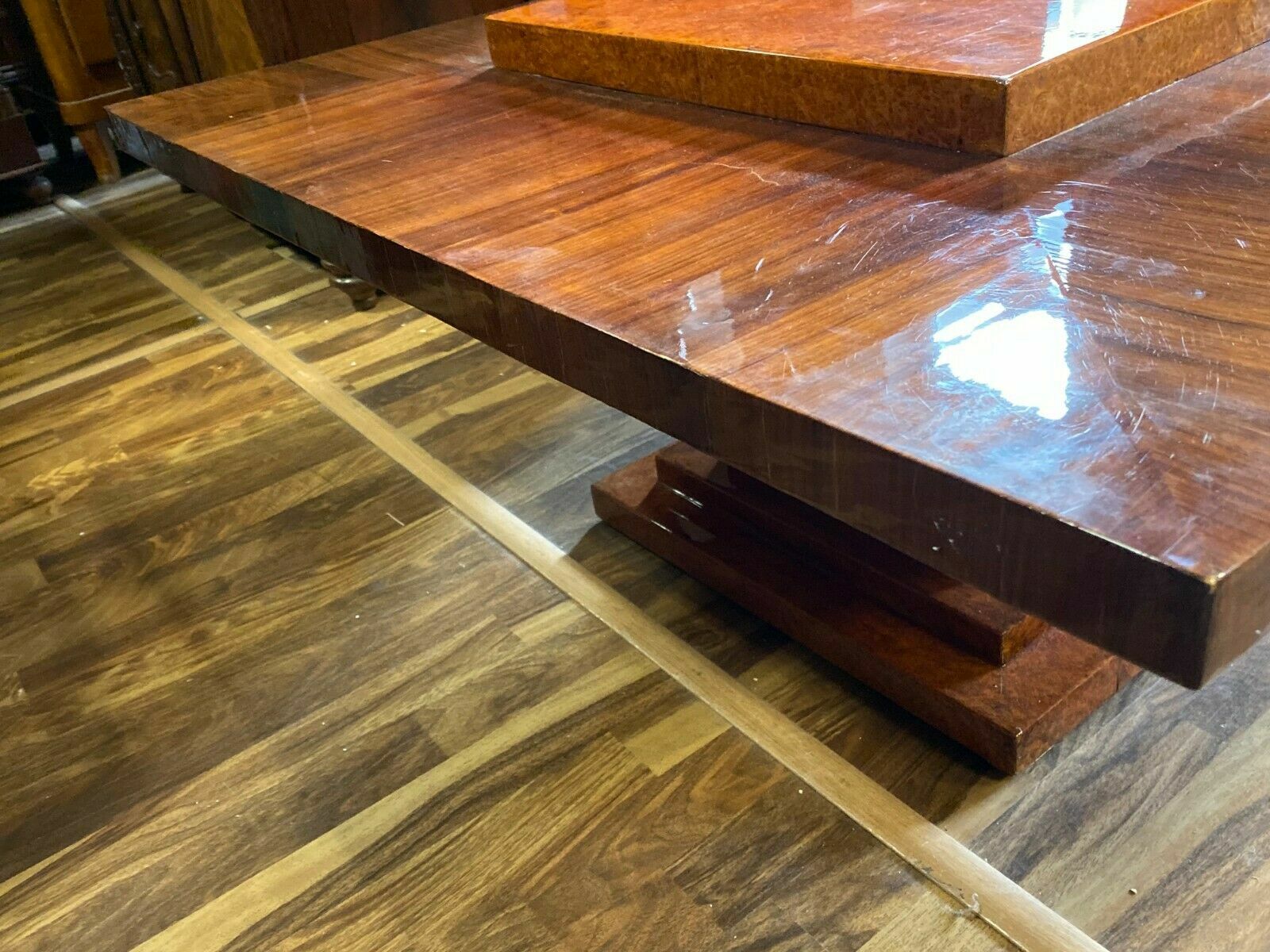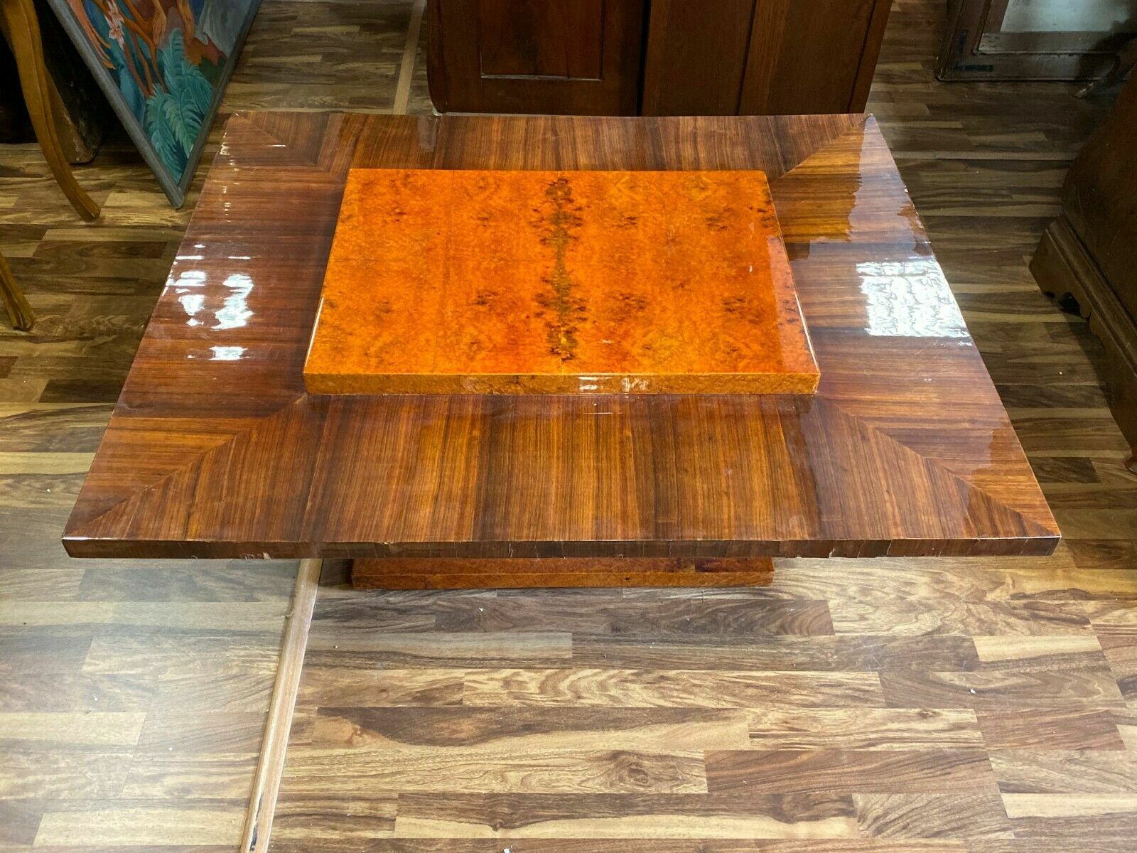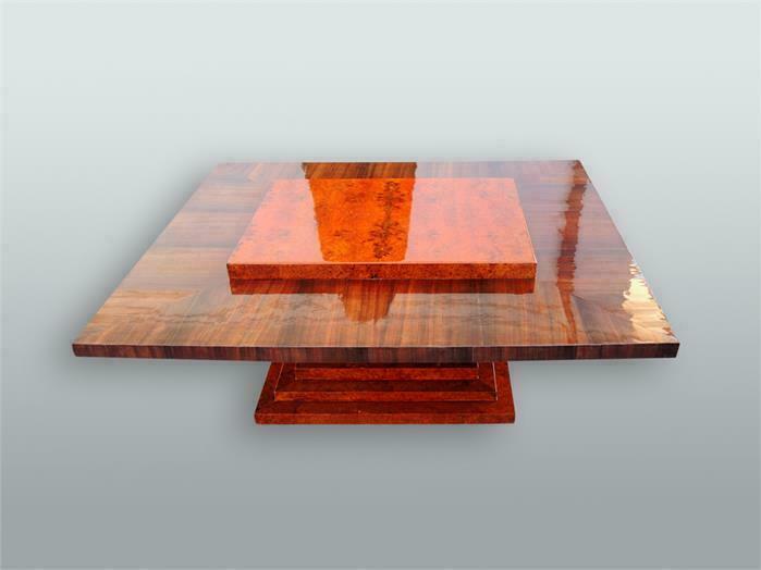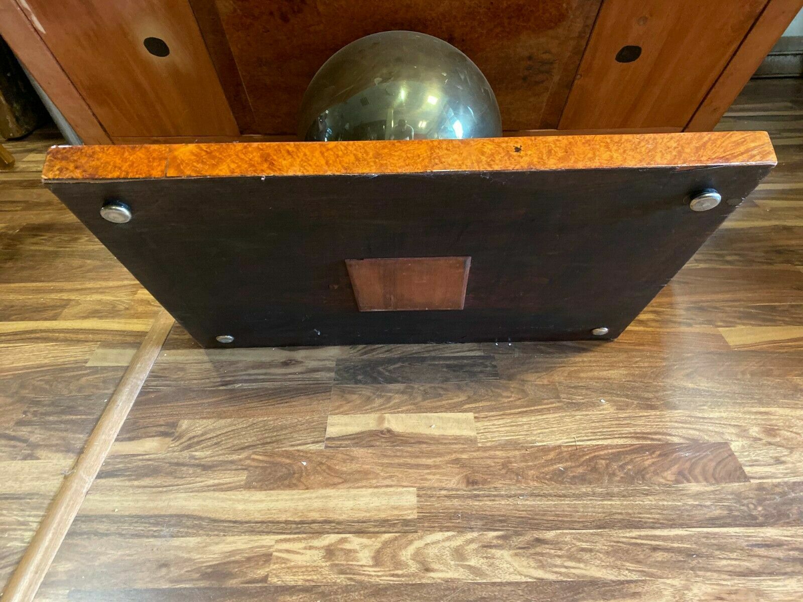 Ausgefallener Art-Deco Tisch, Makassar-Ebenholz, mit einer großen Metallkugel als Standfuß. Seltene Ausführung, Art-Deco. Deutschland, um 1920. das seitliche Furnier müsste komplett restauriert werden, teilweise unvollständig, an der Oberfläche feine Kratzer, altrestauriert, Die Kugel am Fuß ist aus Metall, sehr solide, Abmessungen BTH: 120cm x 100cm x 50cm, Beinfreiheit 41cm.