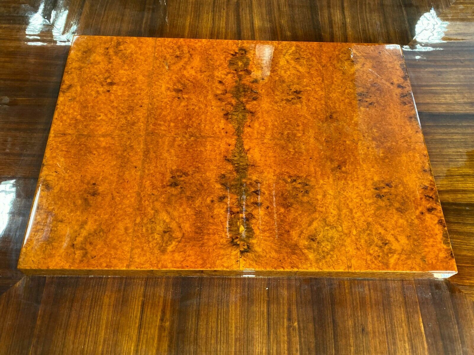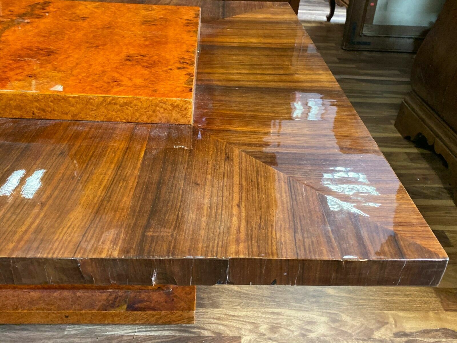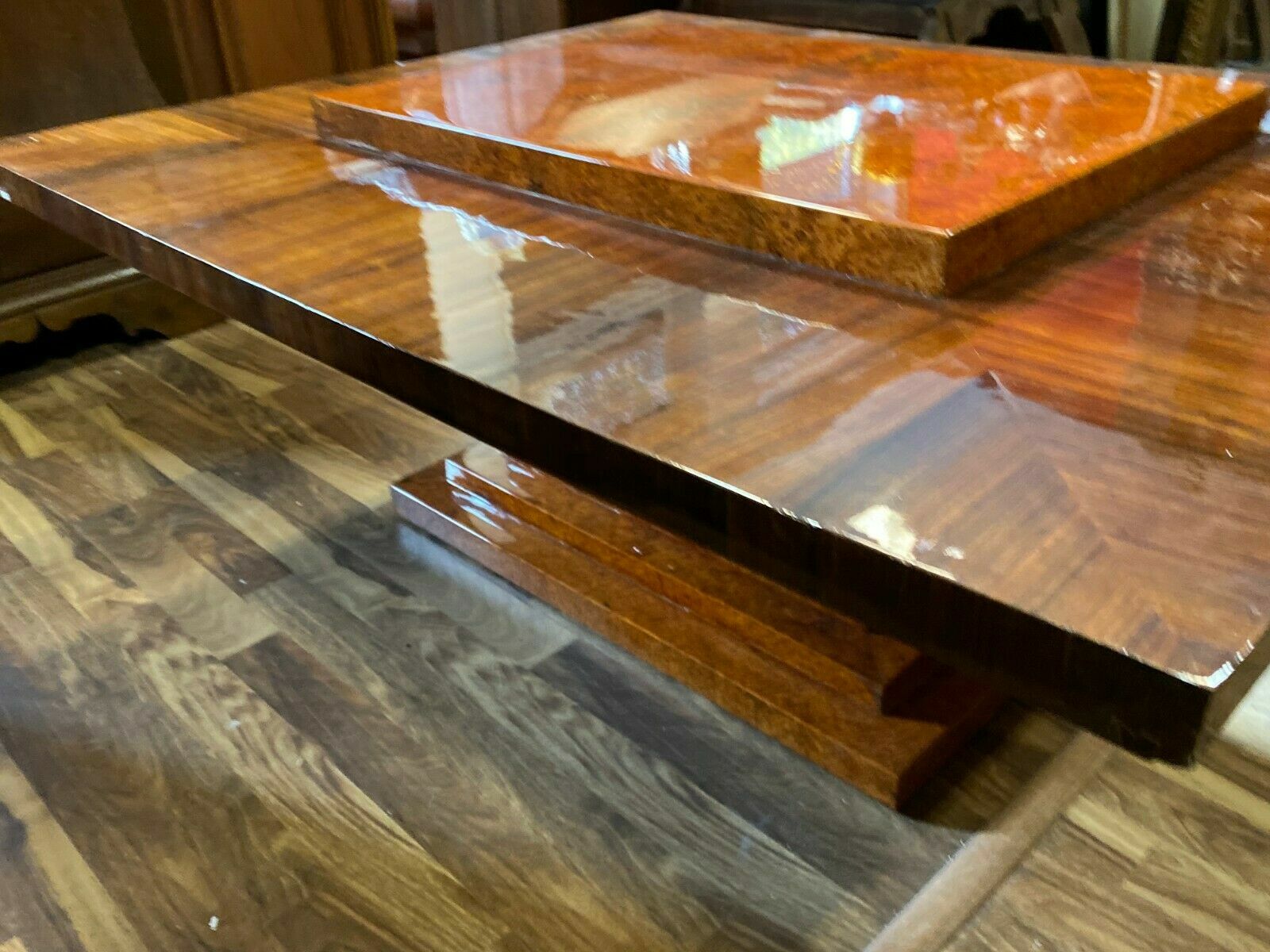 Ausgefallener Art-Deco Tisch, Makassar-Ebenholz, mit einer großen Metallkugel als Standfuß. Seltene Ausführung, Art-Deco. Deutschland, um 1920. das seitliche Furnier müsste komplett restauriert werden, teilweise unvollständig, an der Oberfläche feine Kratzer, altrestauriert, Die Kugel am Fuß ist aus Metall, sehr solide, Abmessungen BTH: 120cm x 100cm x 50cm, Beinfreiheit 41cm.
