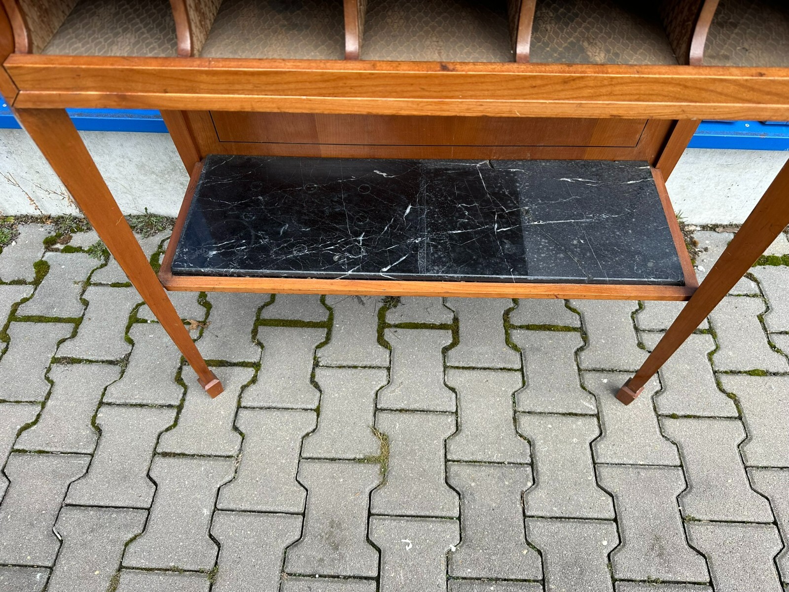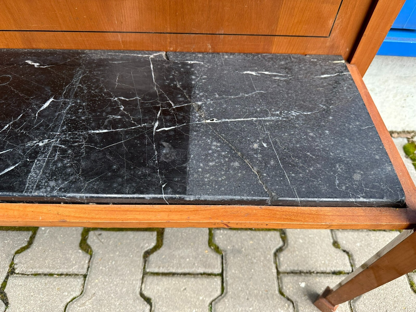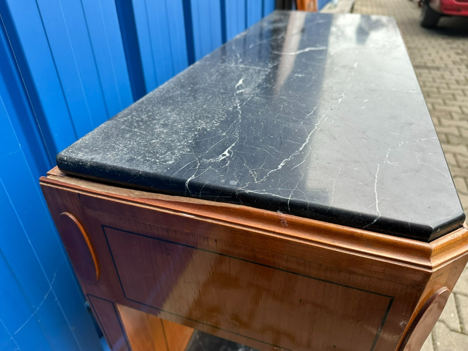 Sehr schönes Sideboard / Kommode mit ausziehbarem Fach, um 1930, Art Deco. Massiver Holzkorpus, Nussbaum mit Bandintarsien und Marmorplatten. Die untere Platte gebrochen , beide Platten teilweise mit grauer, rauer Oberfläche. Am Gestell leicht berieben, oben links Leiste unvollständig. Die Fächer fleckig. Das Möbel hatte mal einen Aufsatz, dieser ist nicht mehr vorhanden. Abmessungen BTH: 90x36x91cm.