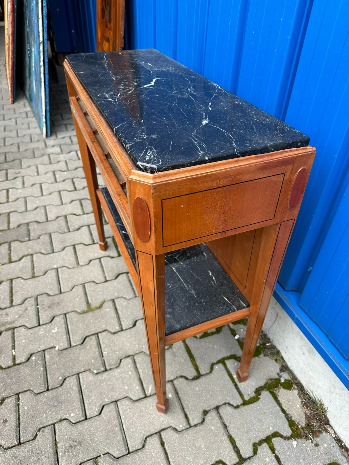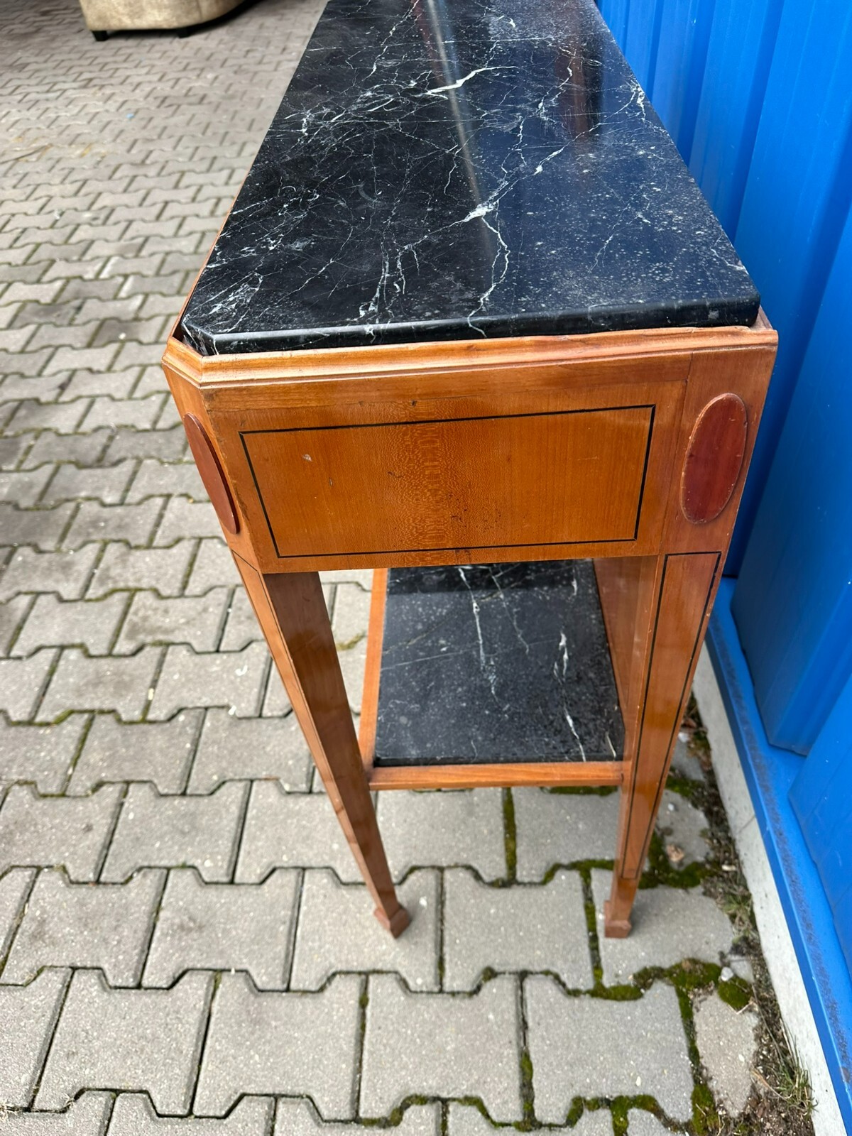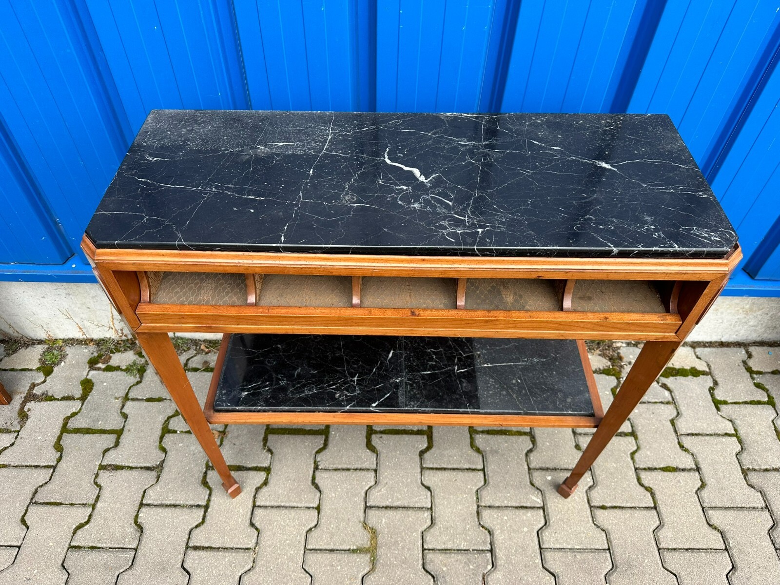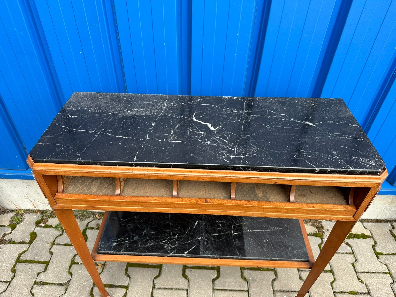 Sehr schönes Sideboard / Kommode mit ausziehbarem Fach, um 1930, Art Deco. Massiver Holzkorpus, Nussbaum mit Bandintarsien und Marmorplatten. Die untere Platte gebrochen , beide Platten teilweise mit grauer, rauer Oberfläche. Am Gestell leicht berieben, oben links Leiste unvollständig. Die Fächer fleckig. Das Möbel hatte mal einen Aufsatz, dieser ist nicht mehr vorhanden. Abmessungen BTH: 90x36x91cm.