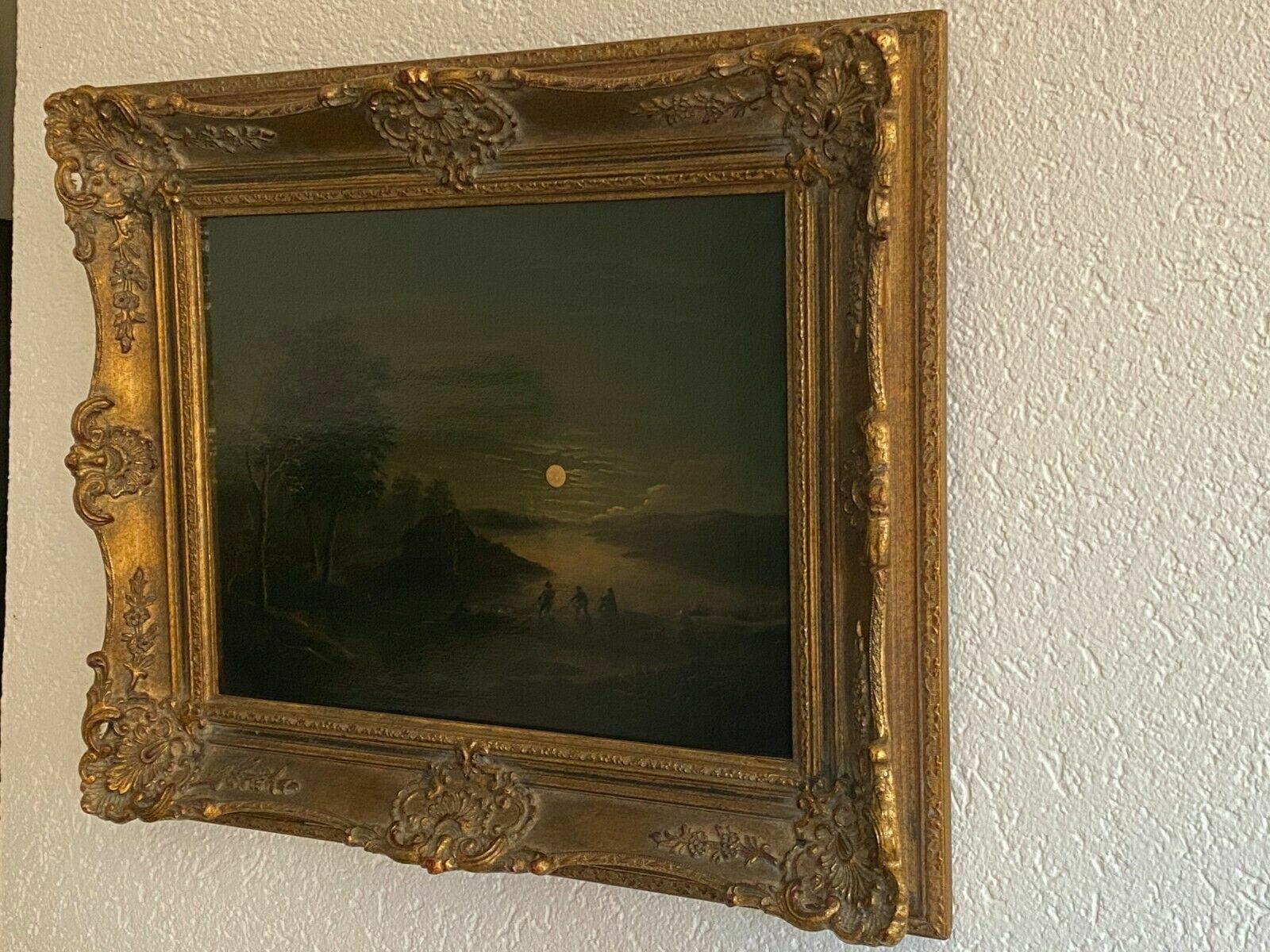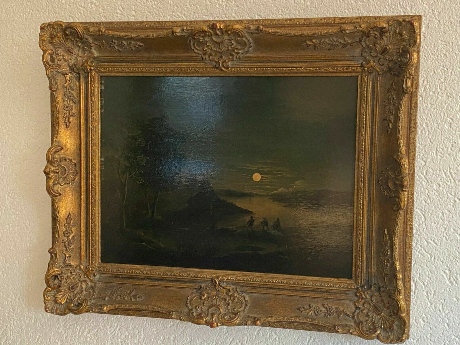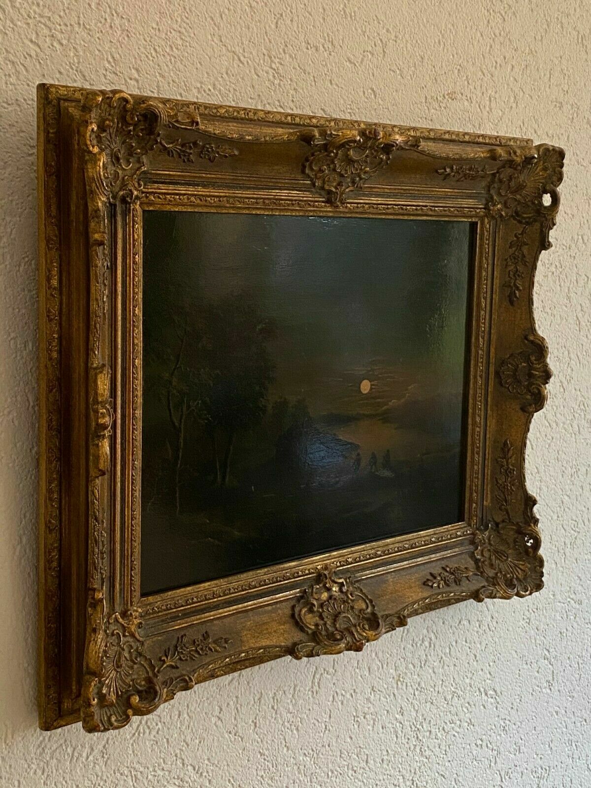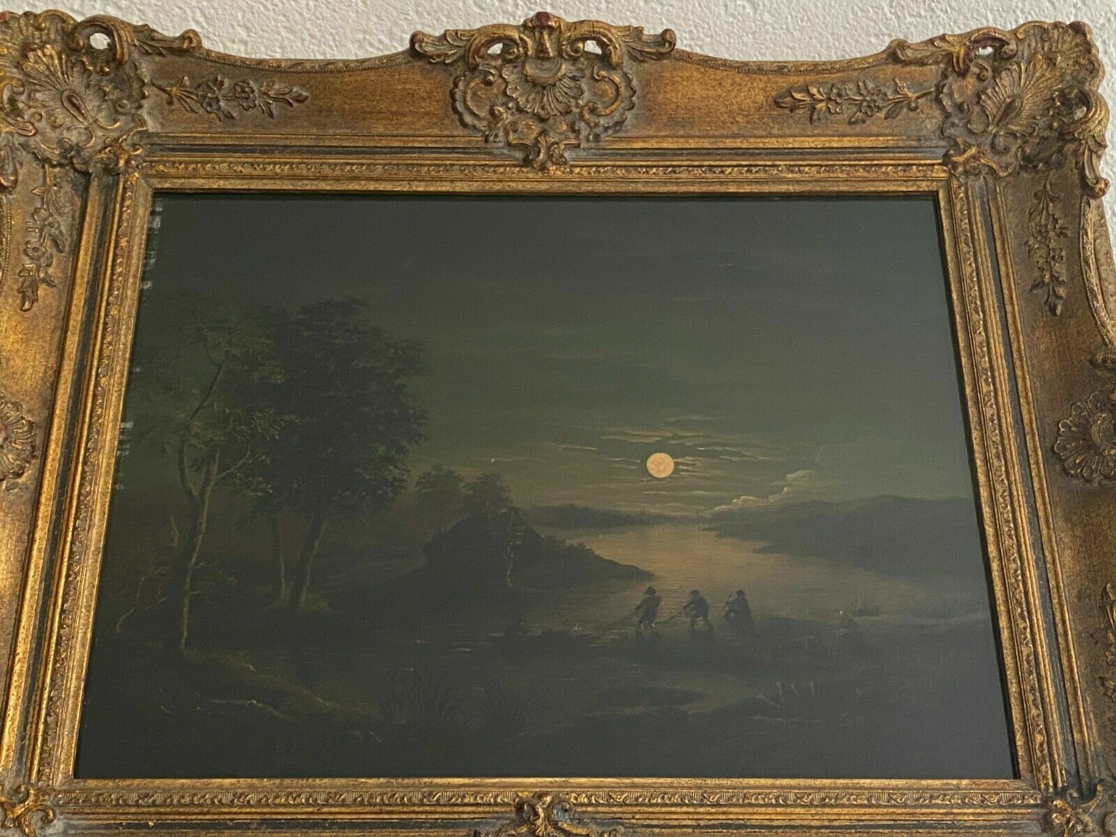 Restaurierter Barock-Altmeister, Fischer bei Mondlicht, Öl auf Holz, wohl 18-tes Jhdt. Das Gemälde ist nicht signiert, hat an der Rückseite Nummerierungen aus alter Sammlung. Das Gemälde wurde komplett restauriert, und neu gefirnist. Das Gemälde ist dunkel, sollte gut beleuchtet werden. Zustand sehr gut, in der Firnisschicht kleinere Abreibungen, mittig noch eine Stelle von ca 4cm, an der der Firnis gekräuselt ist. Abmessungen 39x30cm. Gesamtabmessungen 53x45cm. Der Rahmen ist neuer, befindet sich in sehr gutem Zustand.
