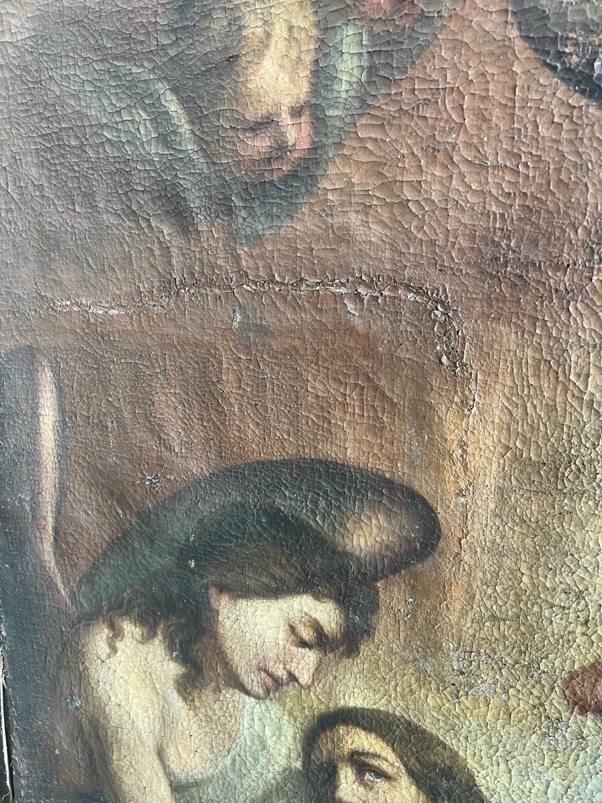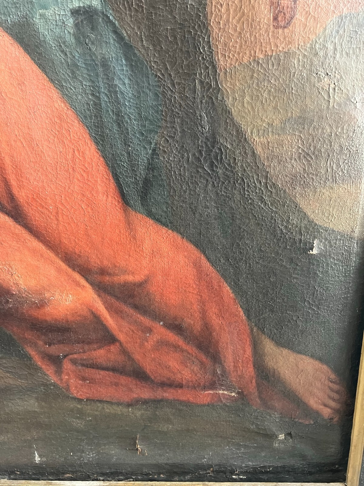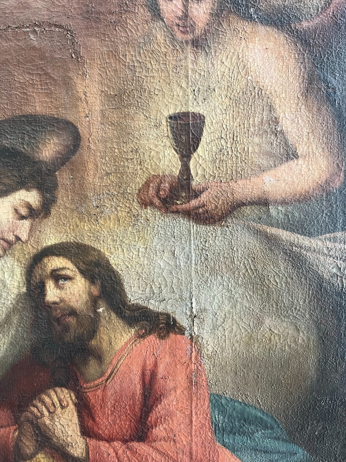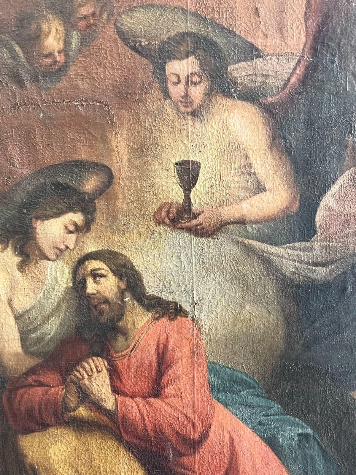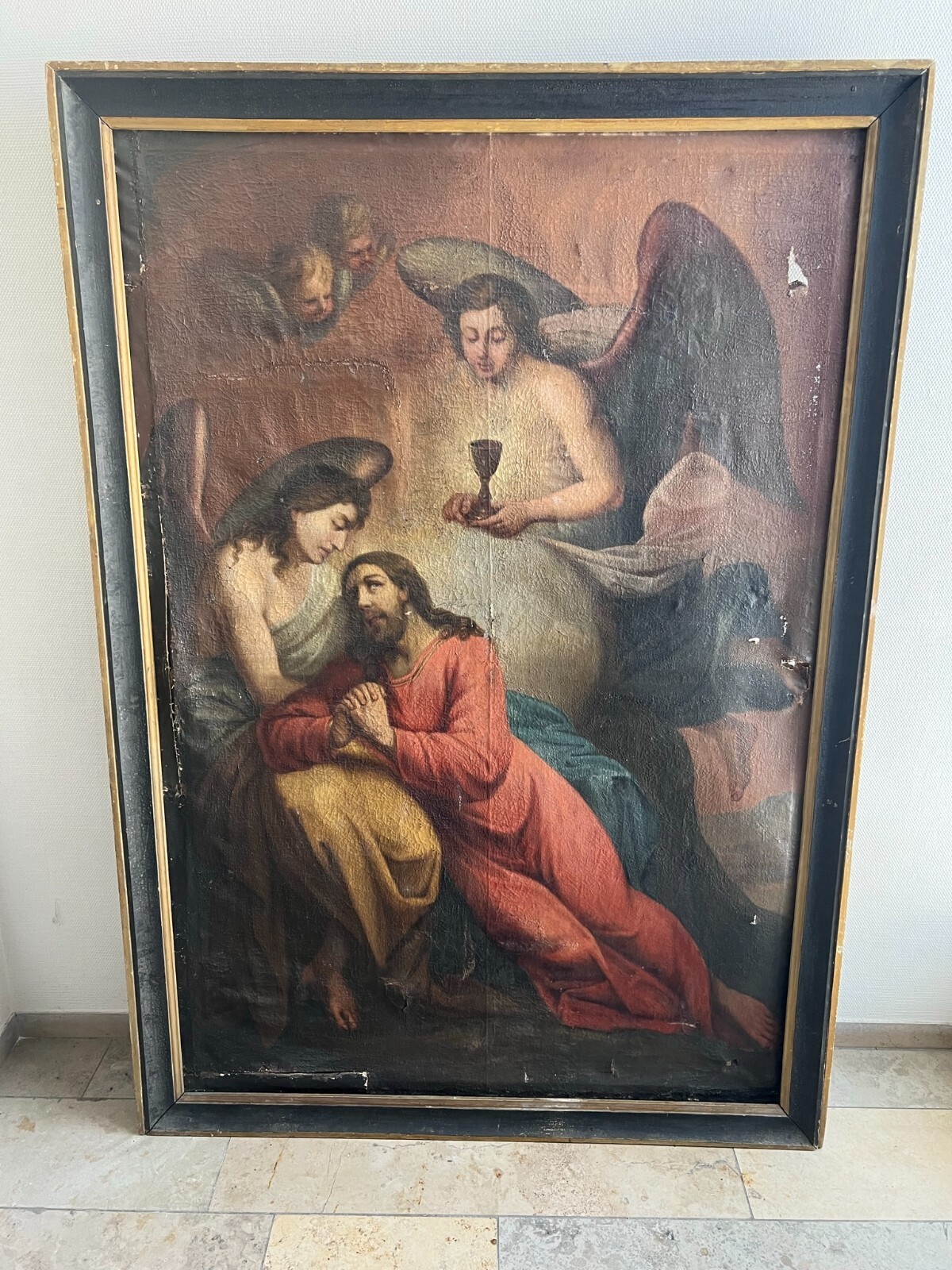 Sehr schönes, antikes Ölgemälde auf Leinwand, Altartafel aus dem 18-ten Jhdt. Restaurationsobjekt. Der originale Rahmen ist berieben, bestoßen, hat diverse Abplatzer und Fehlstellen. Das Gemälde zeigt Jesus mit Erzengeln, die ihn  trösten. Oberfläche mit starkem Krakelee, diversen Löchern, Rissen, mittig verläuft die Leinwandnaht. Die Farbe blättert partiell ab und im Randbereich sind Druckstellen des Keilrahmens zu sehen. Das Gemälde wurde diverse male Restauriert, teils übermalt. Abmessungen BxH: 160x224cm. Der Versand erfolgt mit persönlichem Kurier.