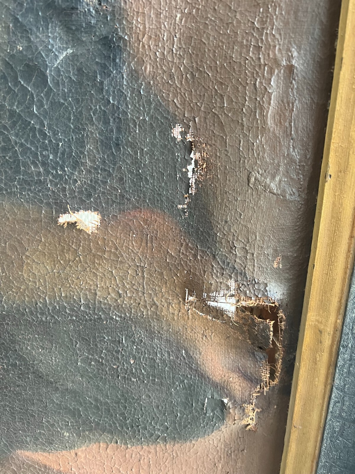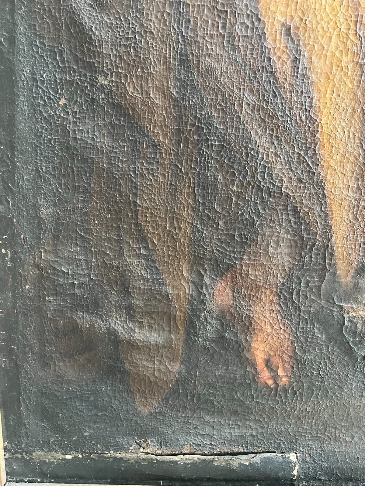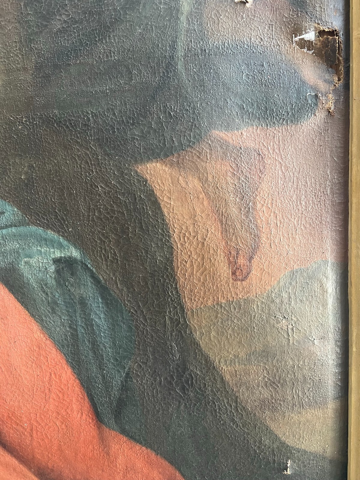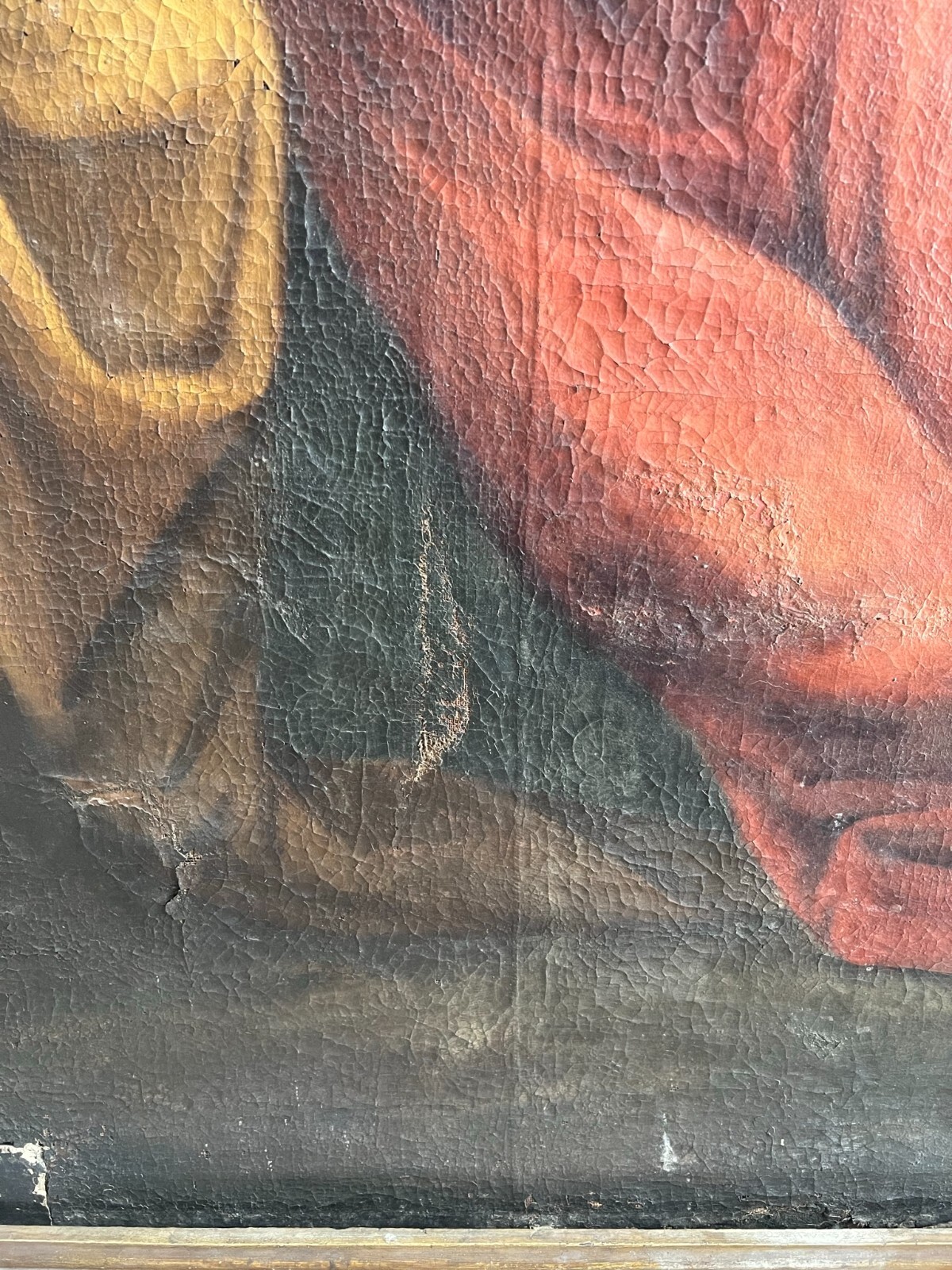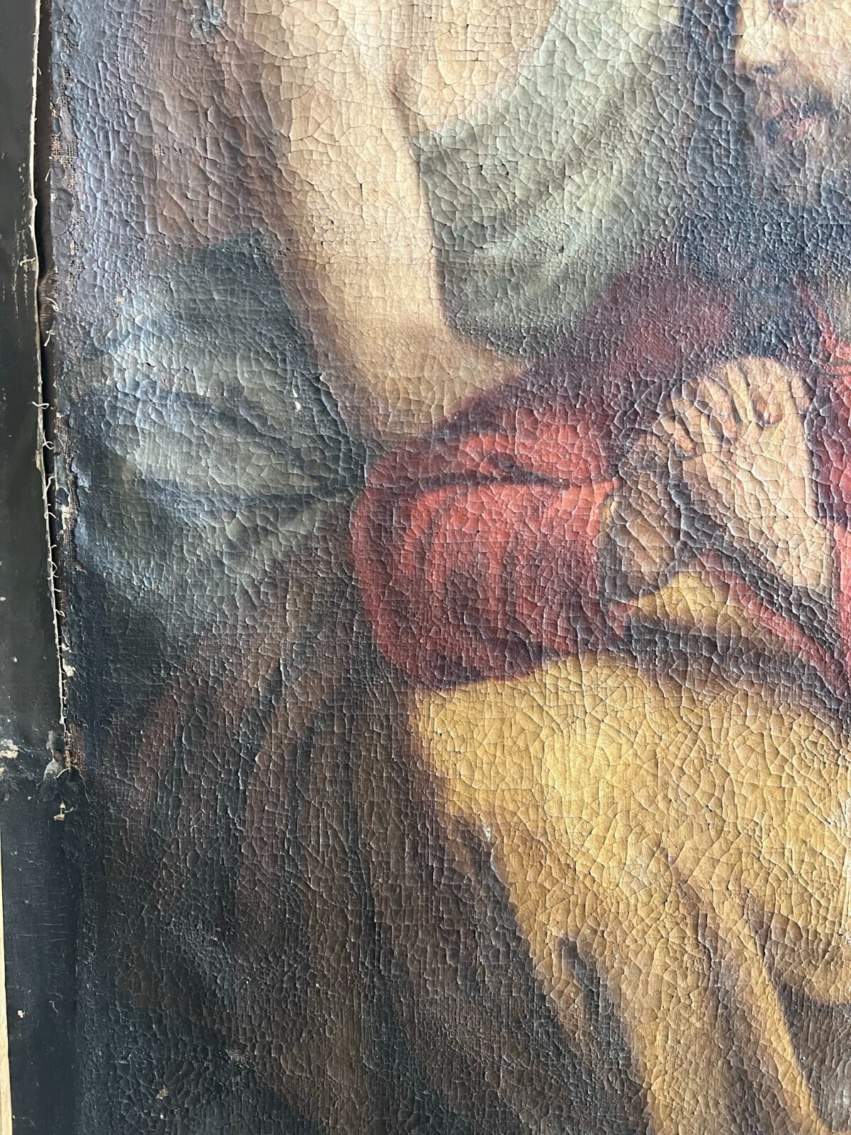 Sehr schönes, antikes Ölgemälde auf Leinwand, Altartafel aus dem 18-ten Jhdt. Restaurationsobjekt. Der originale Rahmen ist berieben, bestoßen, hat diverse Abplatzer und Fehlstellen. Das Gemälde zeigt Jesus mit Erzengeln, die ihn  trösten. Oberfläche mit starkem Krakelee, diversen Löchern, Rissen, mittig verläuft die Leinwandnaht. Die Farbe blättert partiell ab und im Randbereich sind Druckstellen des Keilrahmens zu sehen. Das Gemälde wurde diverse male Restauriert, teils übermalt. Abmessungen BxH: 160x224cm. Der Versand erfolgt mit persönlichem Kurier.
