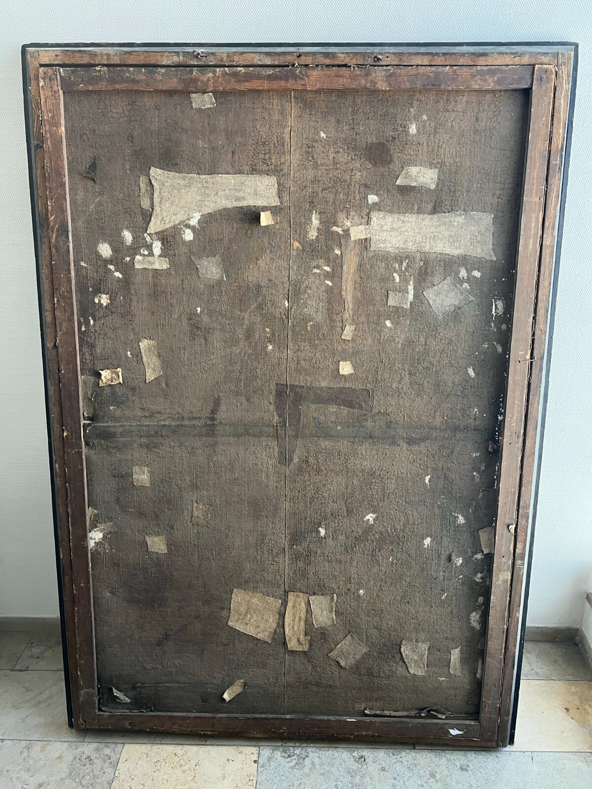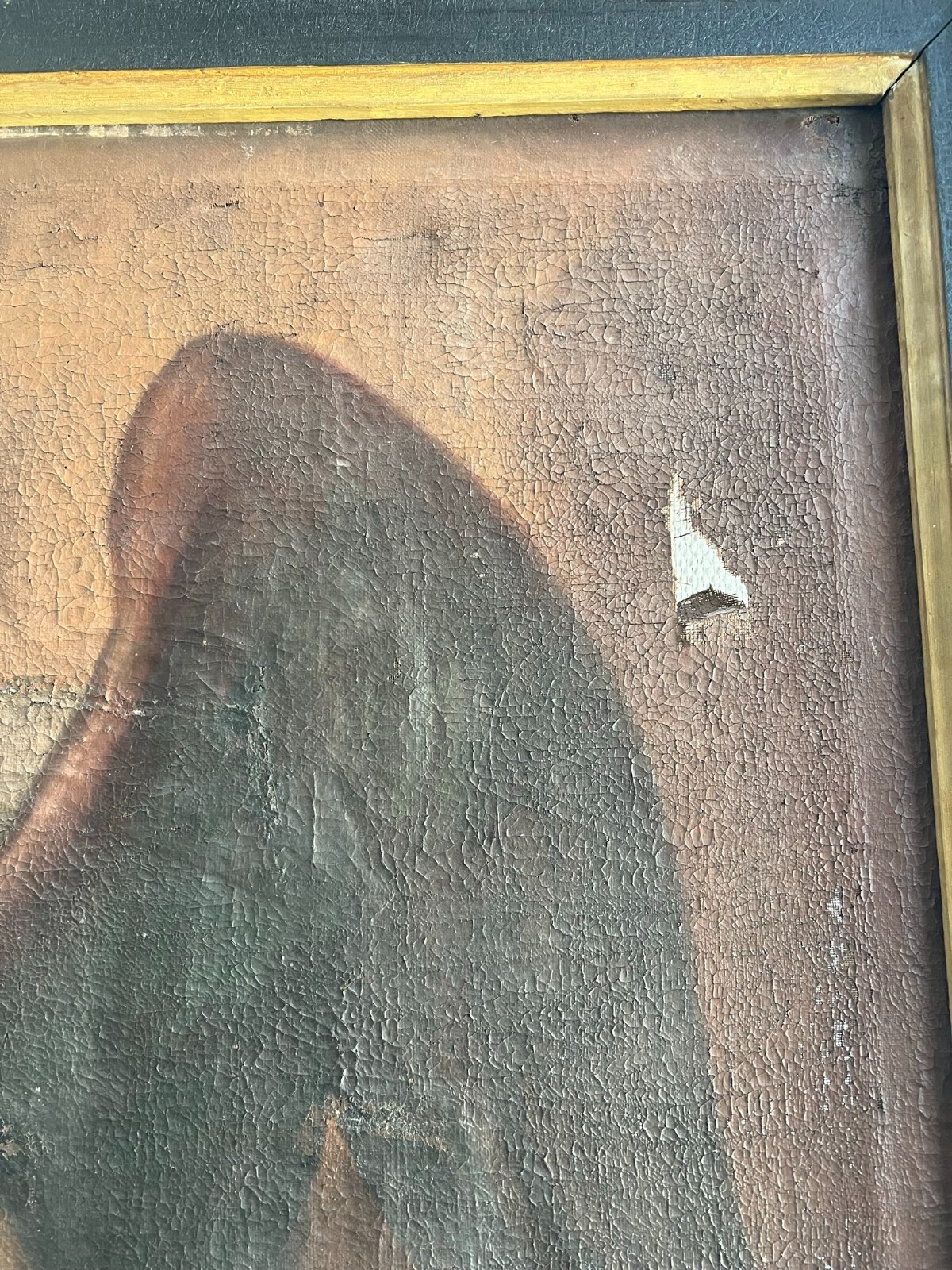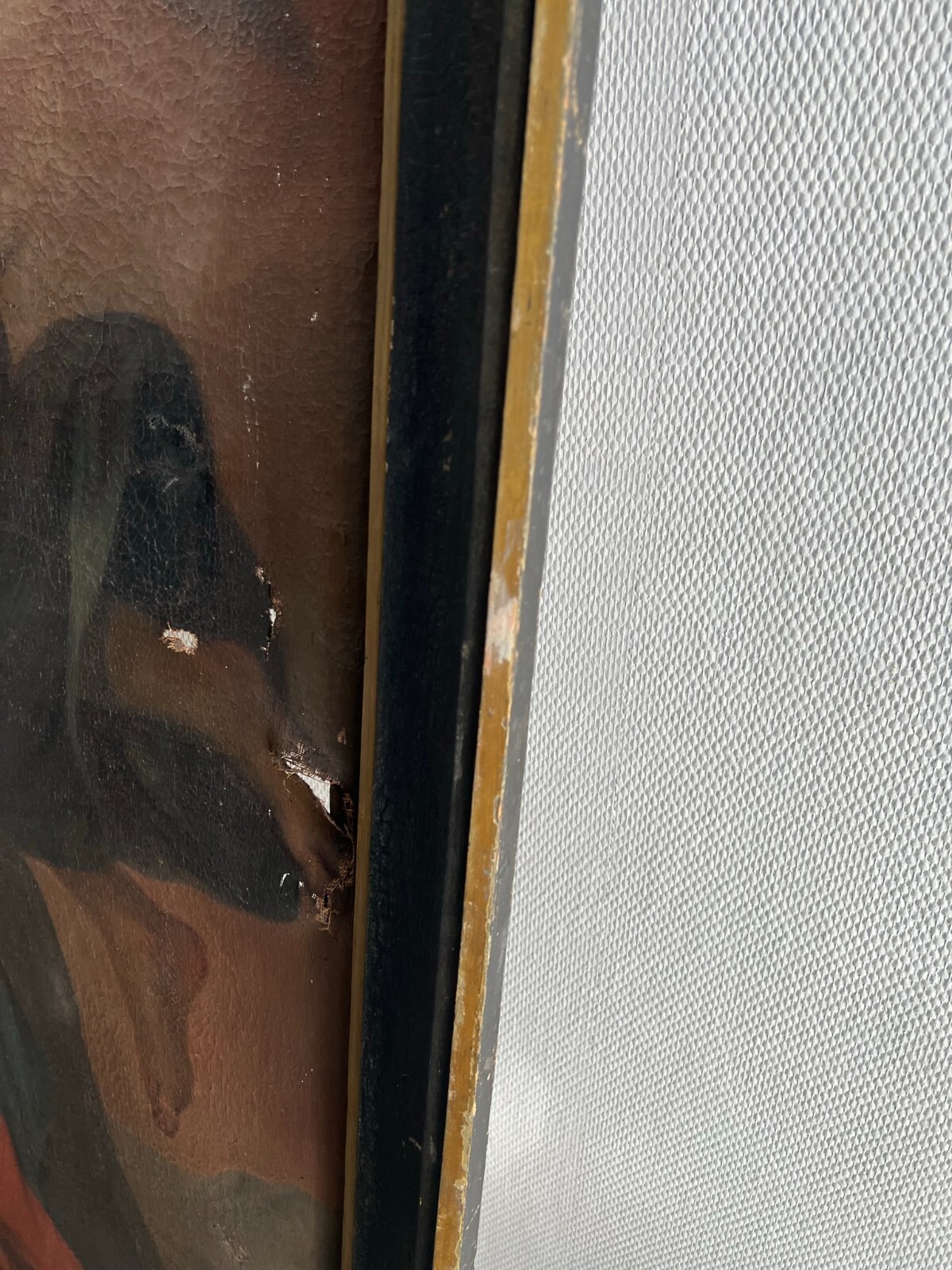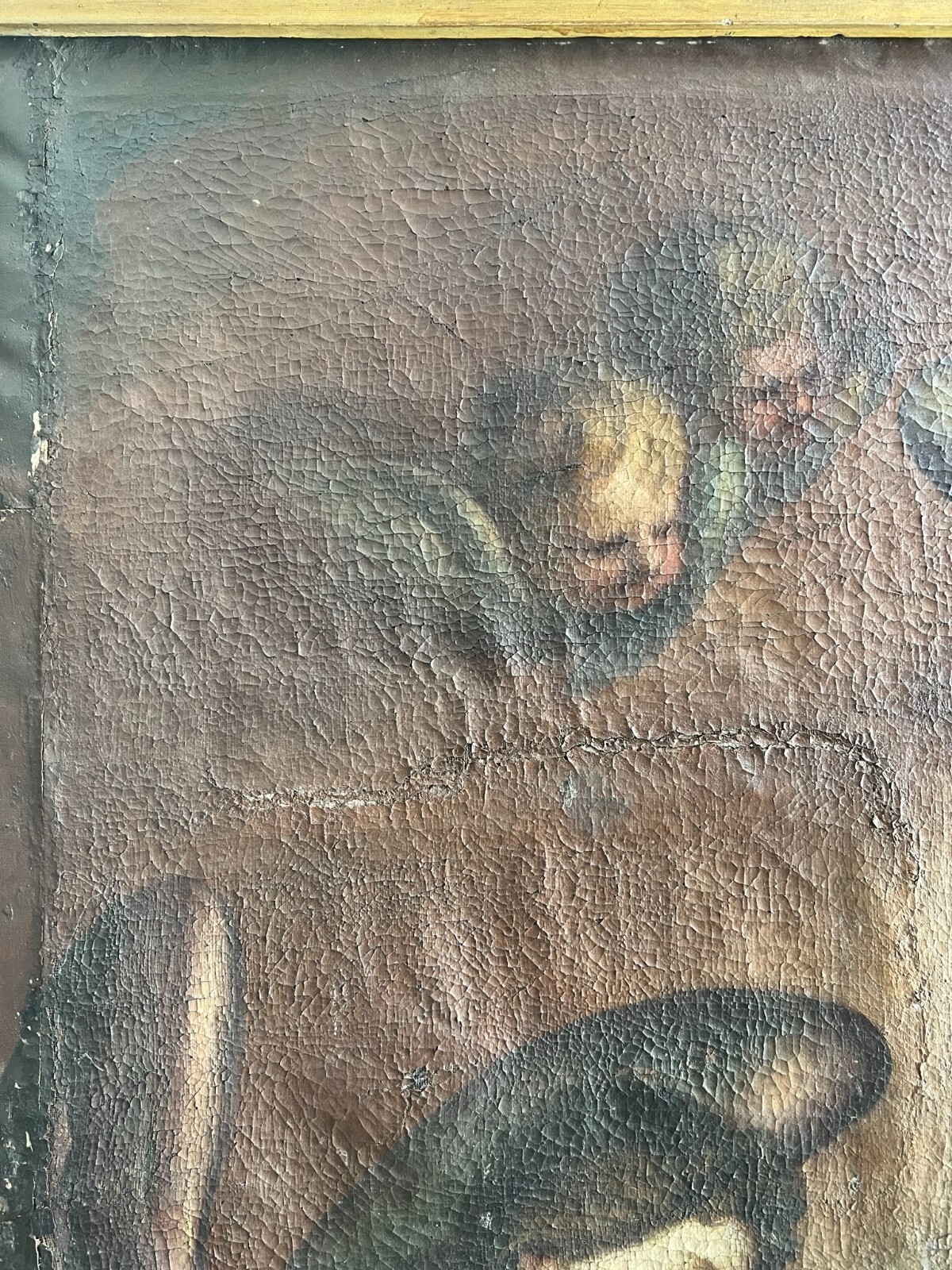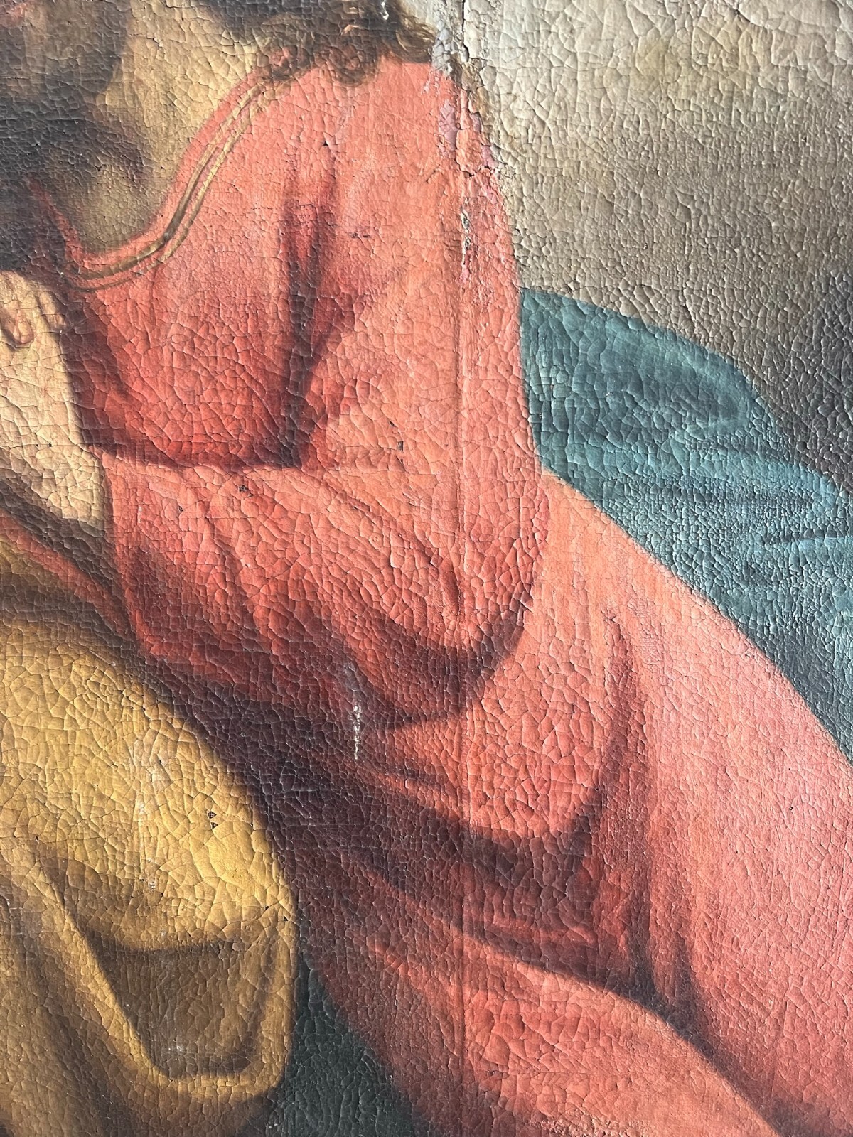 Sehr schönes, antikes Ölgemälde auf Leinwand, Altartafel aus dem 18-ten Jhdt. Restaurationsobjekt. Der originale Rahmen ist berieben, bestoßen, hat diverse Abplatzer und Fehlstellen. Das Gemälde zeigt Jesus mit Erzengeln, die ihn  trösten. Oberfläche mit starkem Krakelee, diversen Löchern, Rissen, mittig verläuft die Leinwandnaht. Die Farbe blättert partiell ab und im Randbereich sind Druckstellen des Keilrahmens zu sehen. Das Gemälde wurde diverse male Restauriert, teils übermalt. Abmessungen BxH: 160x224cm. Der Versand erfolgt mit persönlichem Kurier.