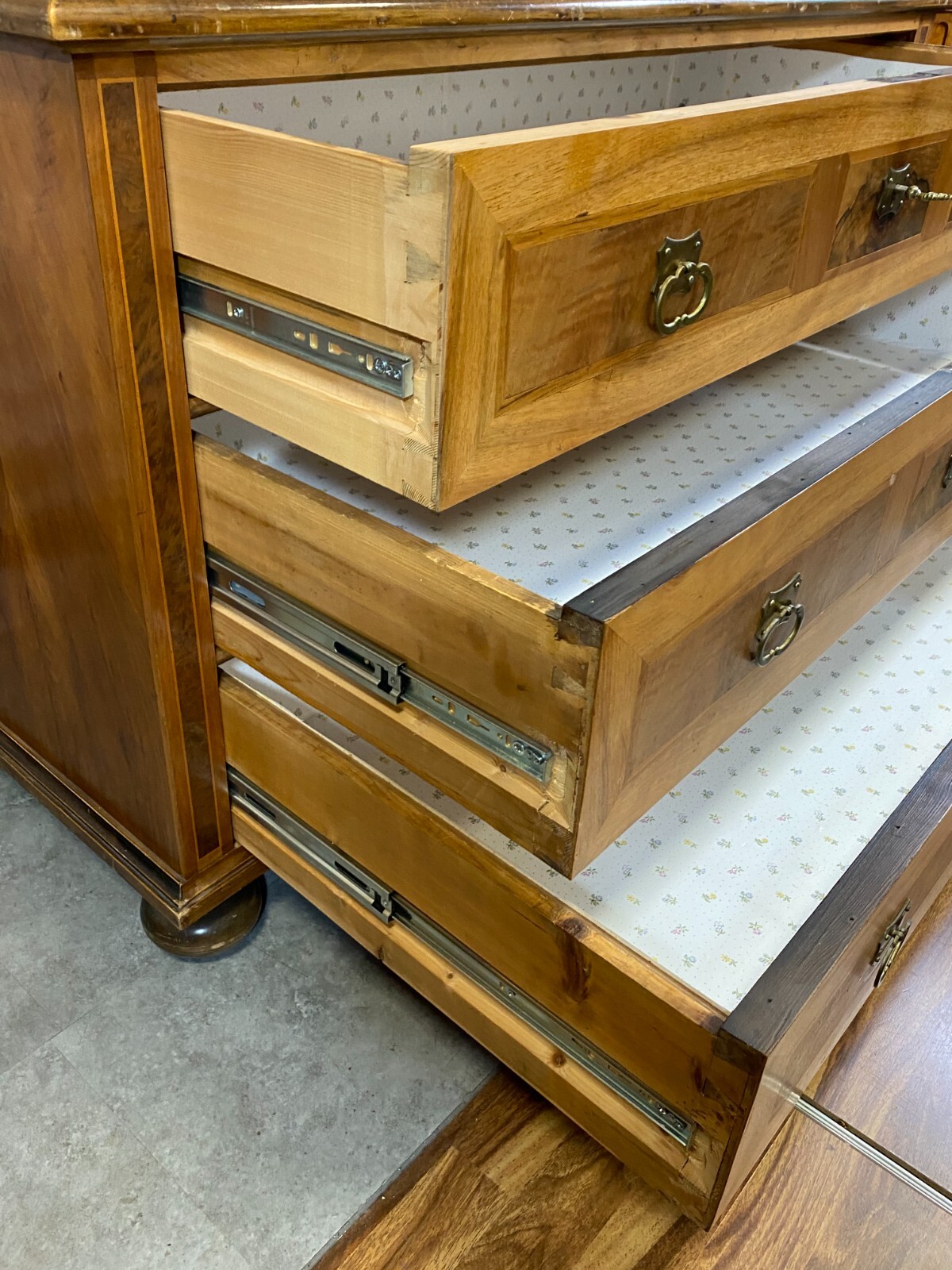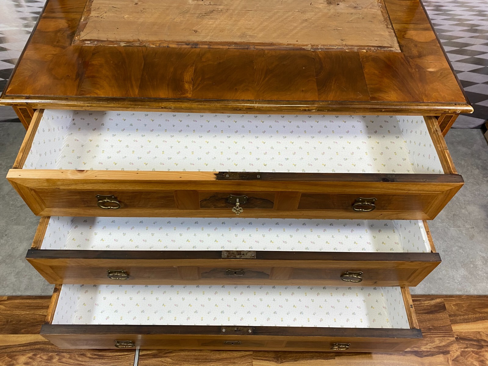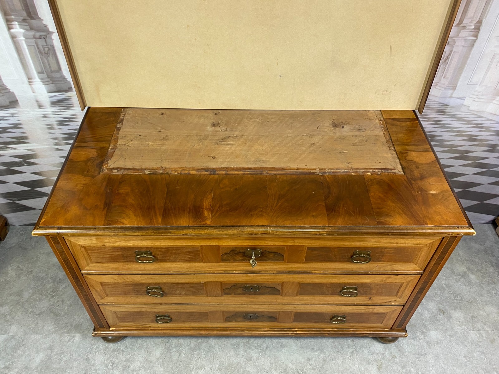 Antike Barockkommode um 1880, ehemals mit einem Aufsatz versehen, an beiden Seitenwänden Dehnungsrisse, an den Leisten zum Teil berieben und bestoßen. Auf der Kommode wurde eine Platte neu angefertigt, im ursprünglichen Auslass für den Aufsatz ist das Möbel nicht furniert. Die Schubladen wurden komplett auf Schienensysteme umgebaut und mit Papier ausgelegt. Das Möbel ist sehr sauber und kann sofort genutzt werden. KEIN Schlüssel vorhanden (der Abgebildete wurde nur zu Testzwecken genutzt), alle Schlösser funktionsfähig. Abmessungen BTH: 132x66x82cm. Abmessungen des Ausschnitts: 101×40,5cm.