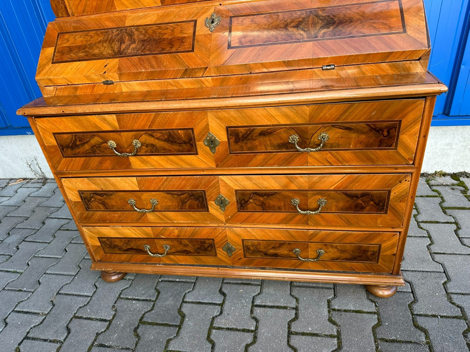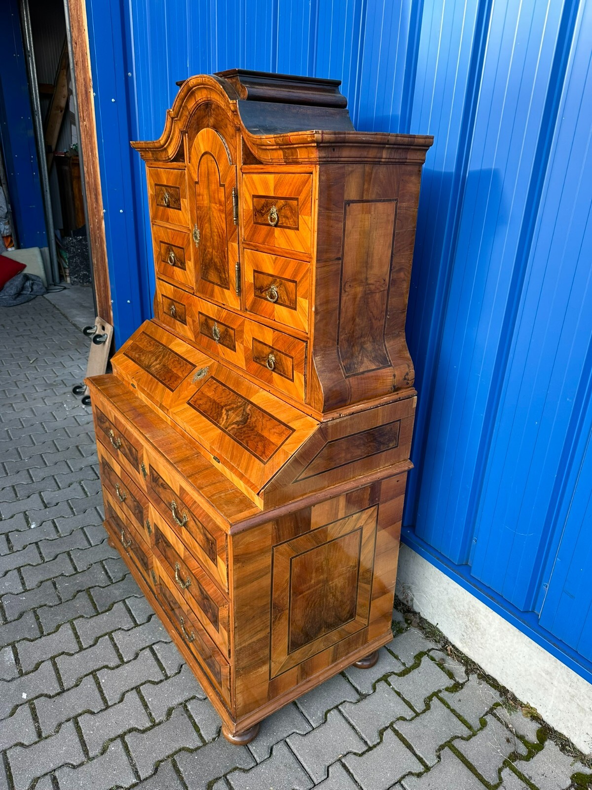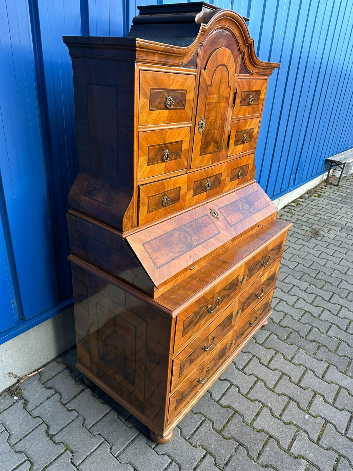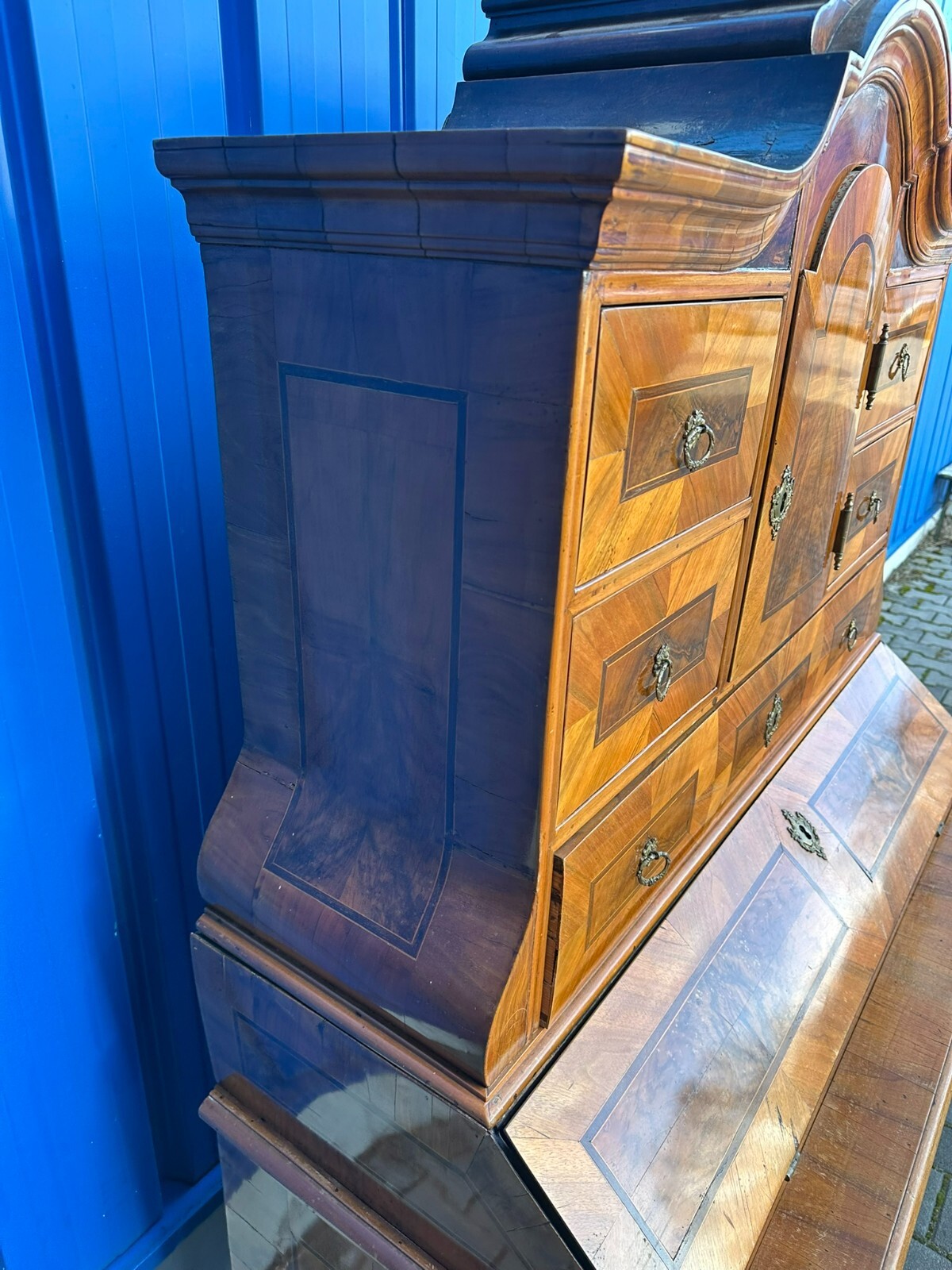 Sehr schöner, Barocker Aufsatzsekretär, 18tes Jahrhundert. Oberfläche ganz leicht berieben. Massiver Holzkorpus im Nussbaum und Wurzelnuss furniert und intarsiert. Der Sekretär wurde mal professionell überarbeitet, kleinste Furnierstücke ausgetauscht, Risse gefüllt und abstehendes Furnier gelegt. Der Innenraum wurde mit Stoff komplett beklebt. Hier teilweise kleinere Flecken. Zwei Schlüssel vorhanden, die unteren drei Schubladen mit zum Teil ausgetauschten Schlössern, an der mittleren Schublade komplett ausgetauschter Boden. An den Schubladenfronten kleine Furnierfehlstellen, unterste Leiste zum Teil berieben. Das Möbel ist dreiteilig. Die vorhandenen Schlüssel passen nur an den vier großen Schubladen, für die Sekretärklappe und die oberste Tür kein Schlüssel vorhanden. Die Sekretärklappe und die oberste Tür sind leicht in sich gewölbt, die Funktionalität wird jedoch nicht beeinträchtigt. Abmessungen BTH: 123x64x188cm, Höhe der Sekretärklappe: 84cm.