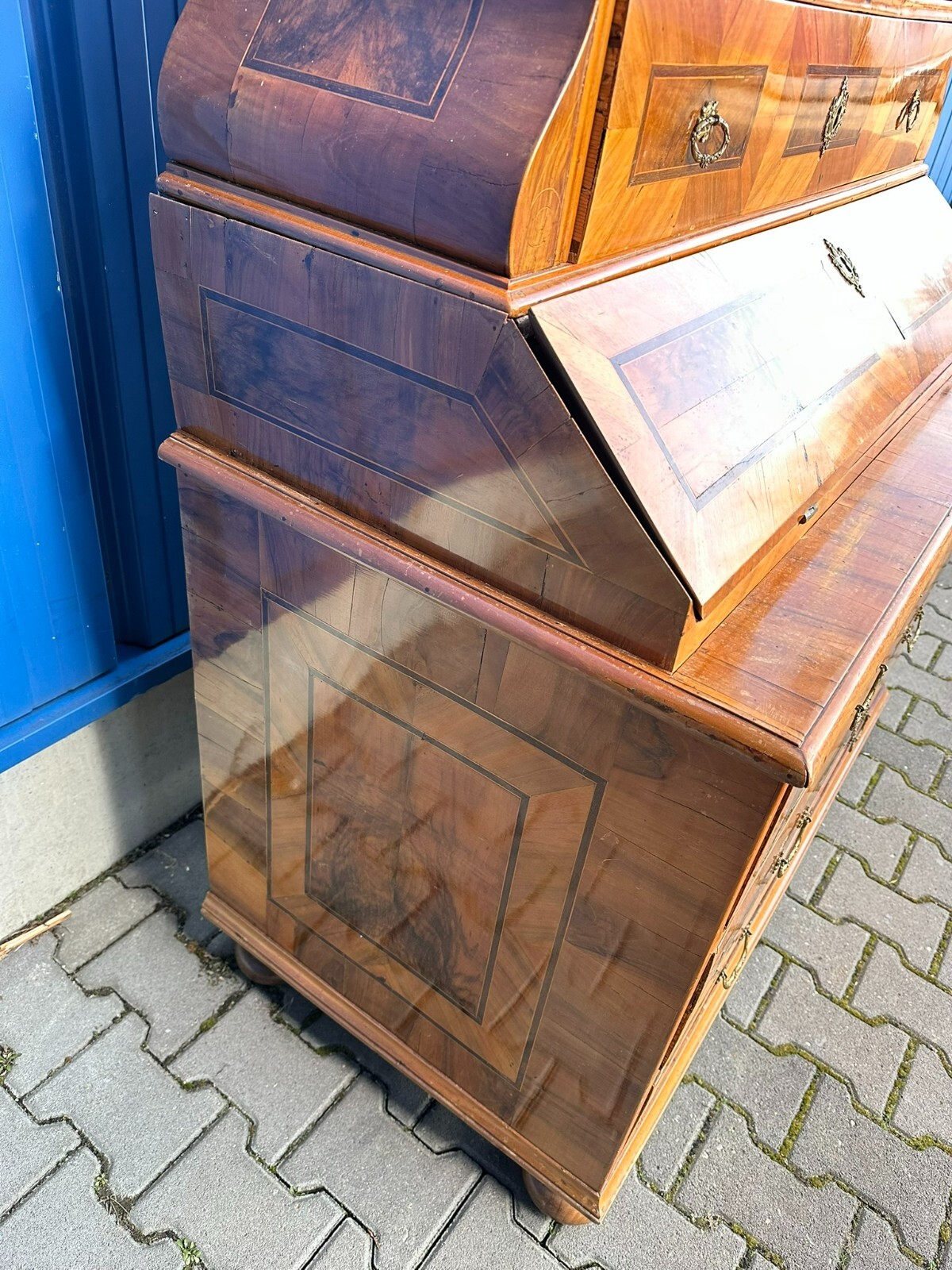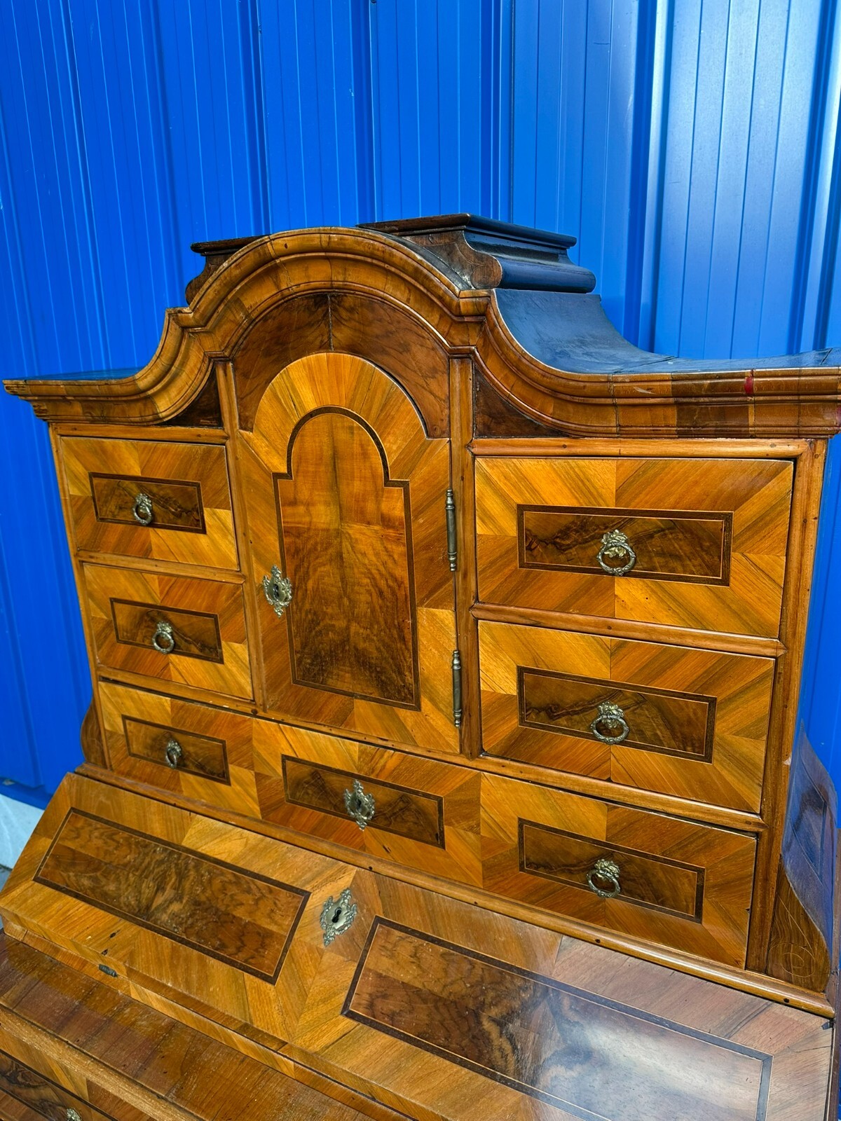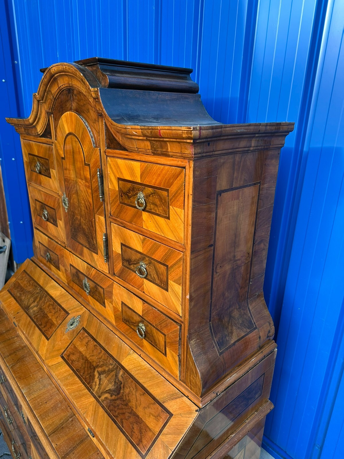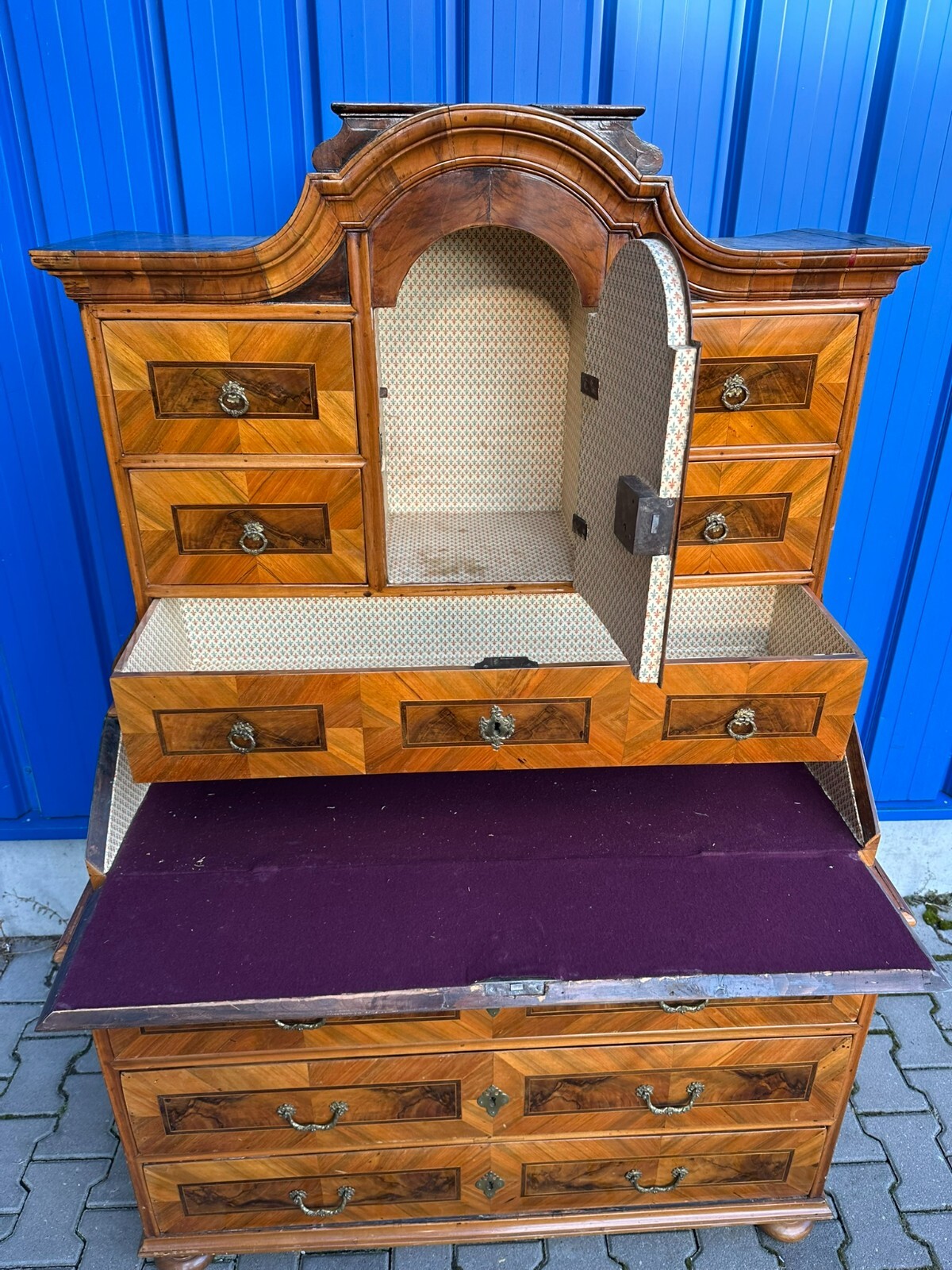 Sehr schöner, Barocker Aufsatzsekretär, 18tes Jahrhundert. Oberfläche ganz leicht berieben. Massiver Holzkorpus im Nussbaum und Wurzelnuss furniert und intarsiert. Der Sekretär wurde mal professionell überarbeitet, kleinste Furnierstücke ausgetauscht, Risse gefüllt und abstehendes Furnier gelegt. Der Innenraum wurde mit Stoff komplett beklebt. Hier teilweise kleinere Flecken. Zwei Schlüssel vorhanden, die unteren drei Schubladen mit zum Teil ausgetauschten Schlössern, an der mittleren Schublade komplett ausgetauschter Boden. An den Schubladenfronten kleine Furnierfehlstellen, unterste Leiste zum Teil berieben. Das Möbel ist dreiteilig. Die vorhandenen Schlüssel passen nur an den vier großen Schubladen, für die Sekretärklappe und die oberste Tür kein Schlüssel vorhanden. Die Sekretärklappe und die oberste Tür sind leicht in sich gewölbt, die Funktionalität wird jedoch nicht beeinträchtigt. Abmessungen BTH: 123x64x188cm, Höhe der Sekretärklappe: 84cm.