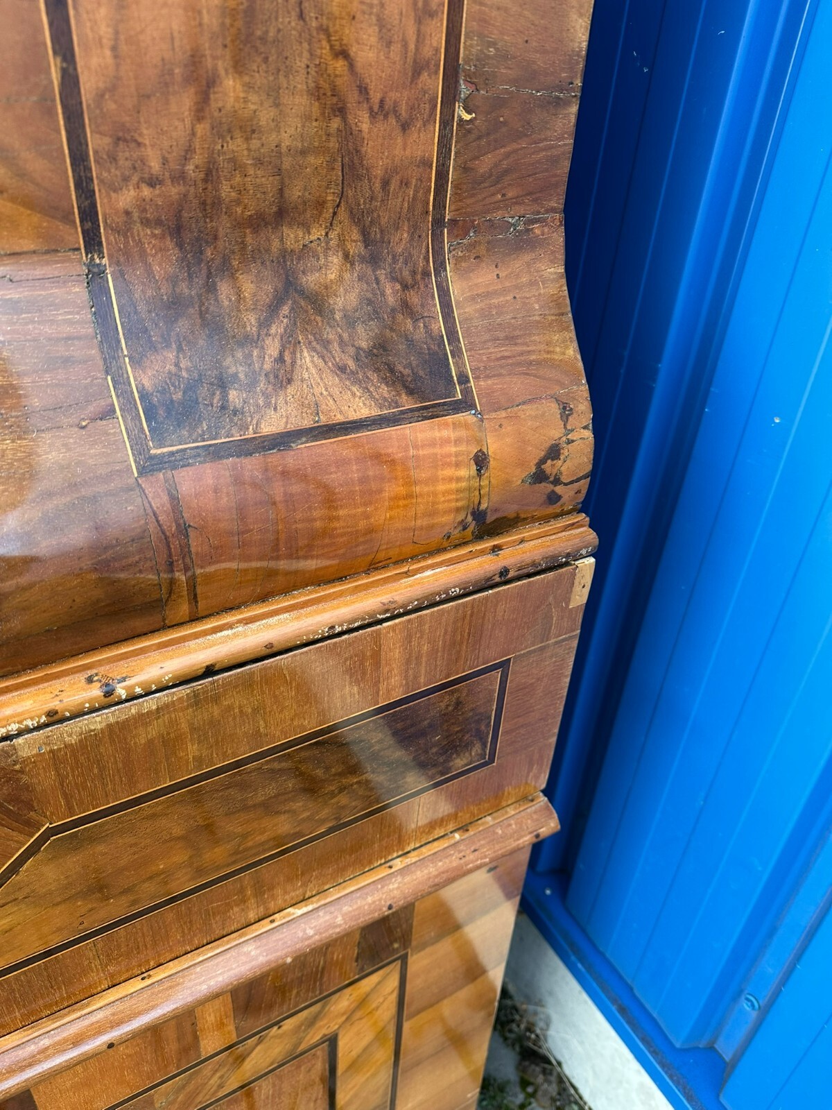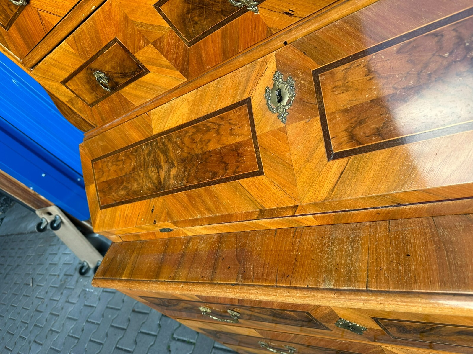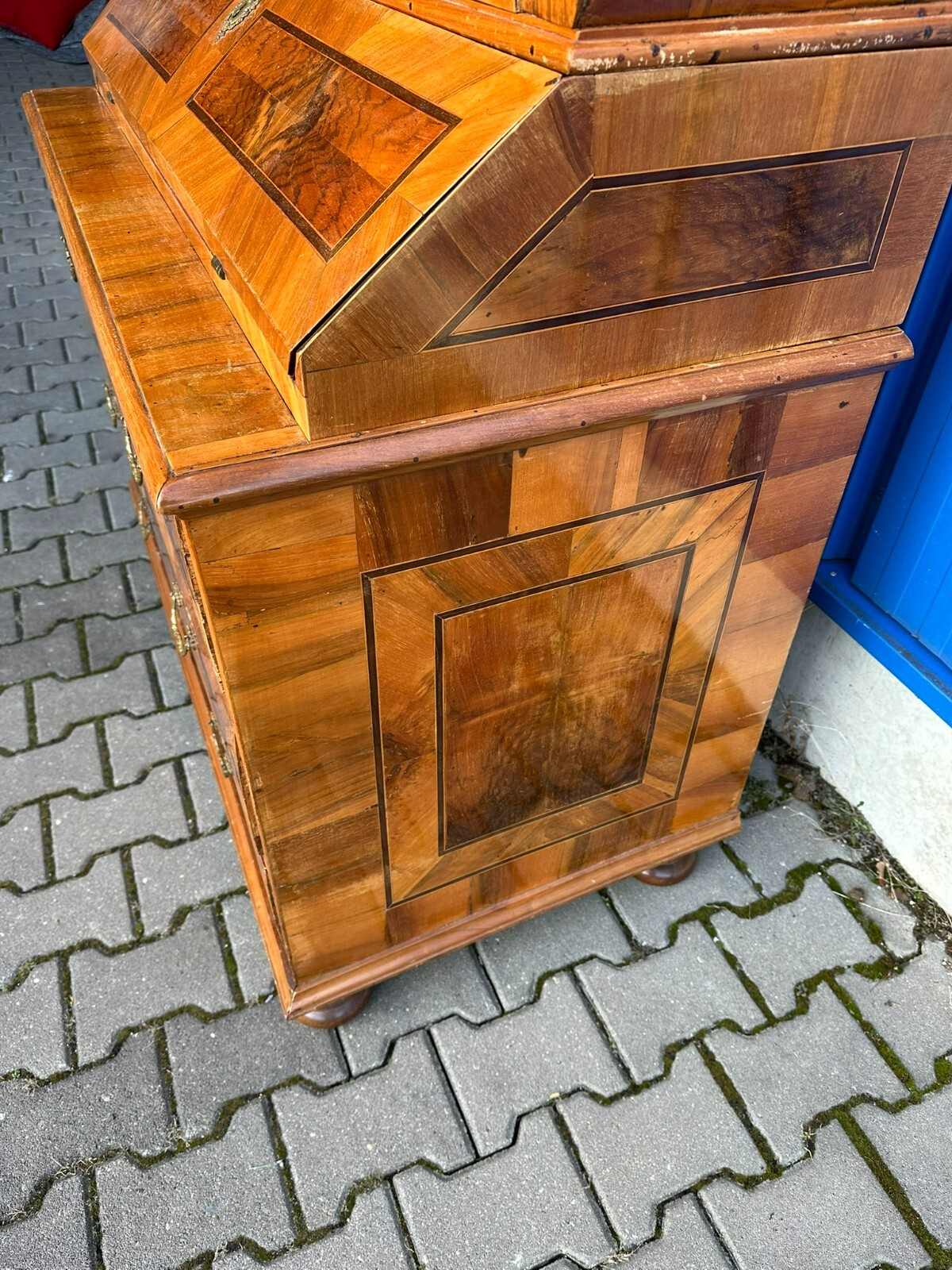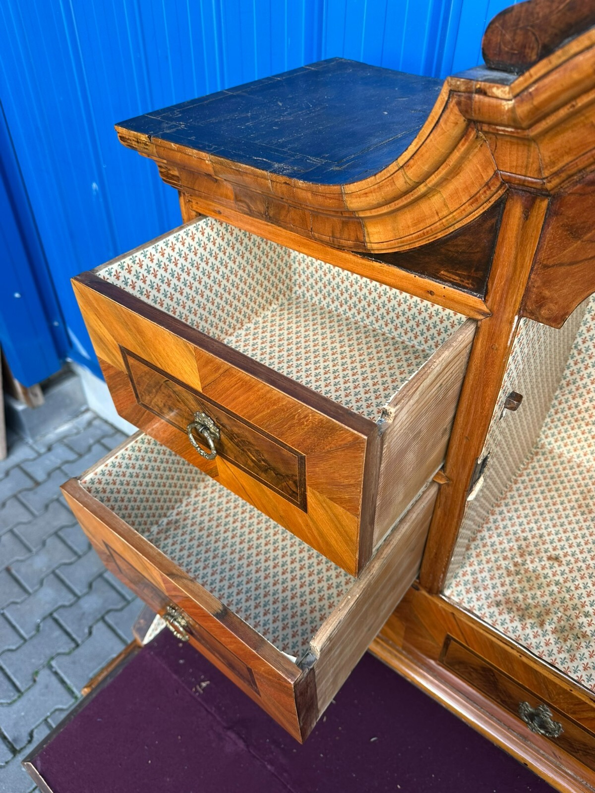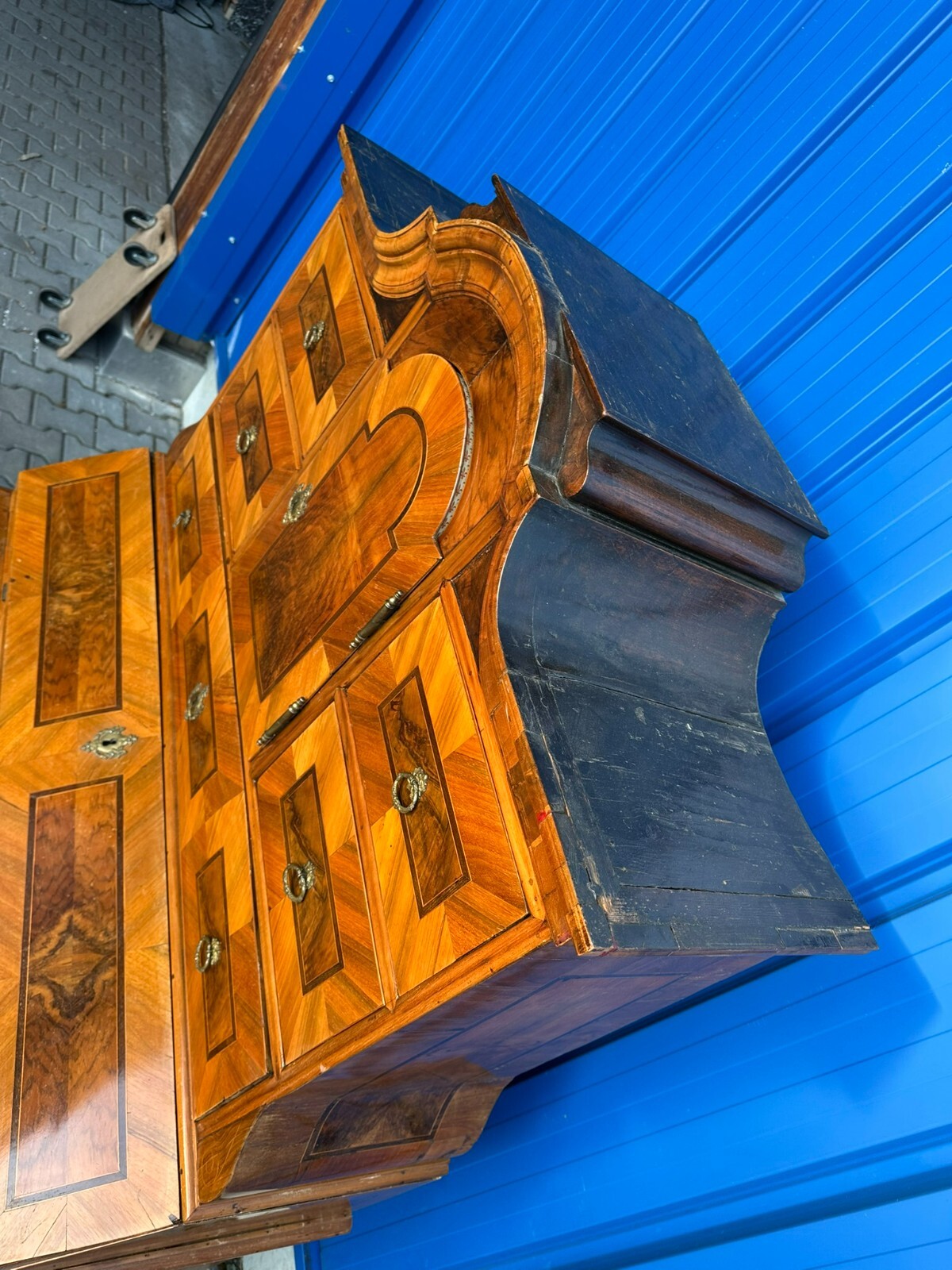 Sehr schöner, Barocker Aufsatzsekretär, 18tes Jahrhundert. Oberfläche ganz leicht berieben. Massiver Holzkorpus im Nussbaum und Wurzelnuss furniert und intarsiert. Der Sekretär wurde mal professionell überarbeitet, kleinste Furnierstücke ausgetauscht, Risse gefüllt und abstehendes Furnier gelegt. Der Innenraum wurde mit Stoff komplett beklebt. Hier teilweise kleinere Flecken. Zwei Schlüssel vorhanden, die unteren drei Schubladen mit zum Teil ausgetauschten Schlössern, an der mittleren Schublade komplett ausgetauschter Boden. An den Schubladenfronten kleine Furnierfehlstellen, unterste Leiste zum Teil berieben. Das Möbel ist dreiteilig. Die vorhandenen Schlüssel passen nur an den vier großen Schubladen, für die Sekretärklappe und die oberste Tür kein Schlüssel vorhanden. Die Sekretärklappe und die oberste Tür sind leicht in sich gewölbt, die Funktionalität wird jedoch nicht beeinträchtigt. Abmessungen BTH: 123x64x188cm, Höhe der Sekretärklappe: 84cm.
