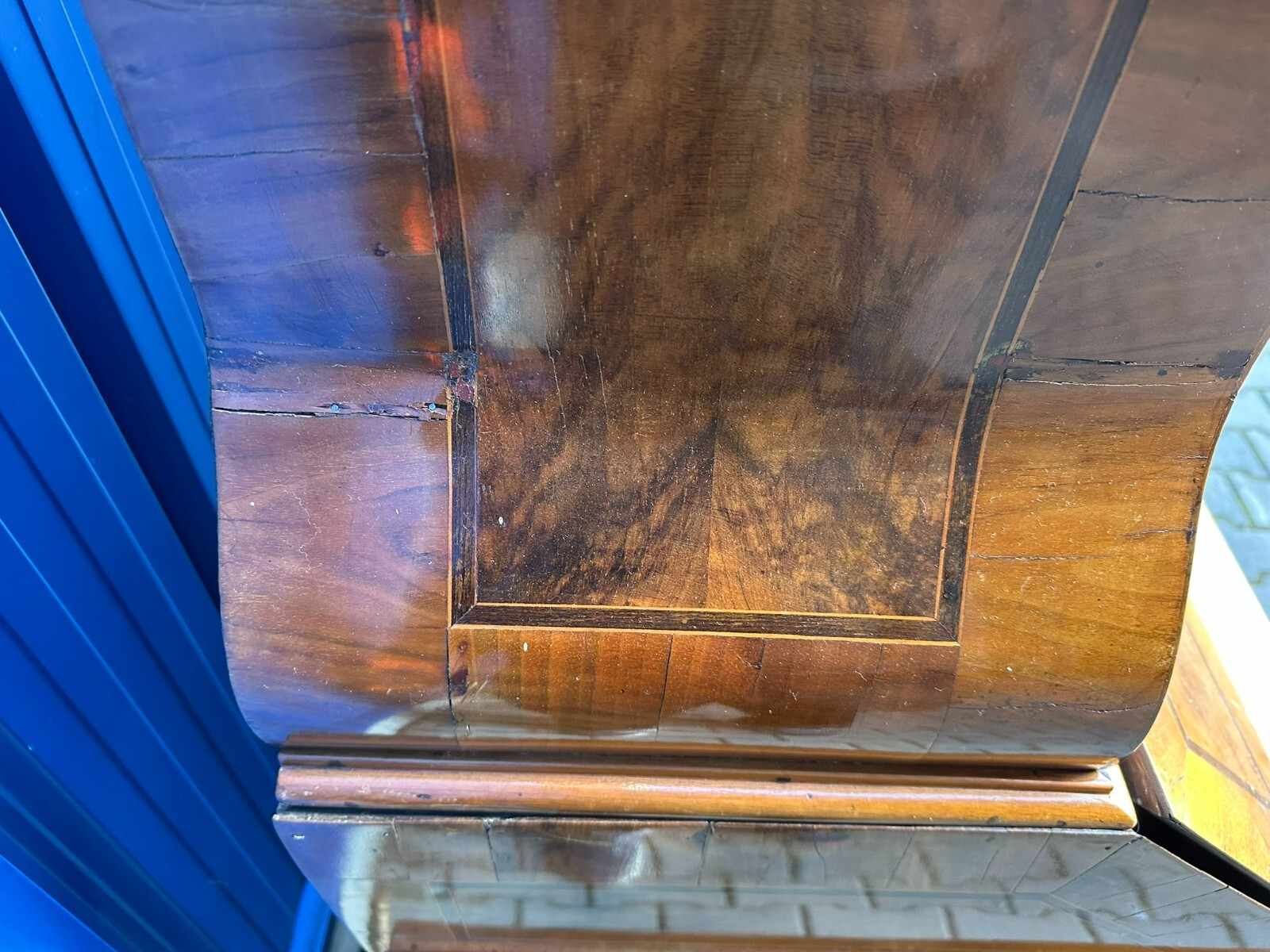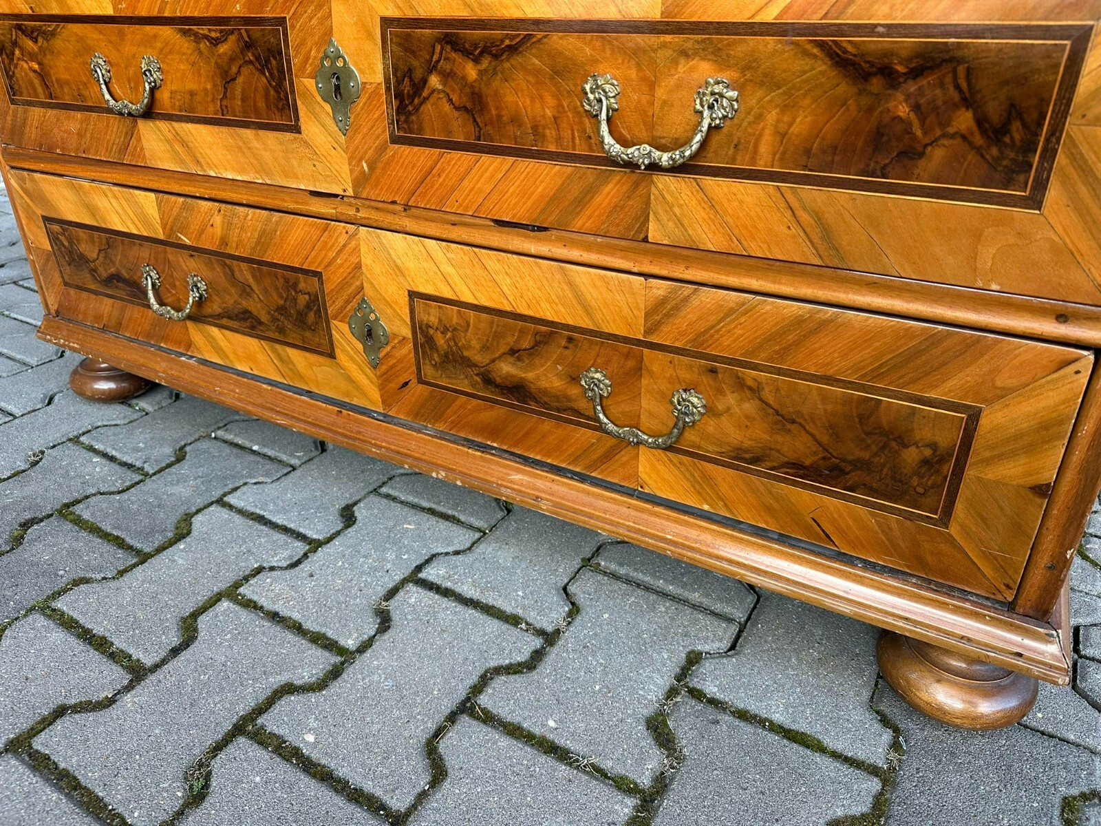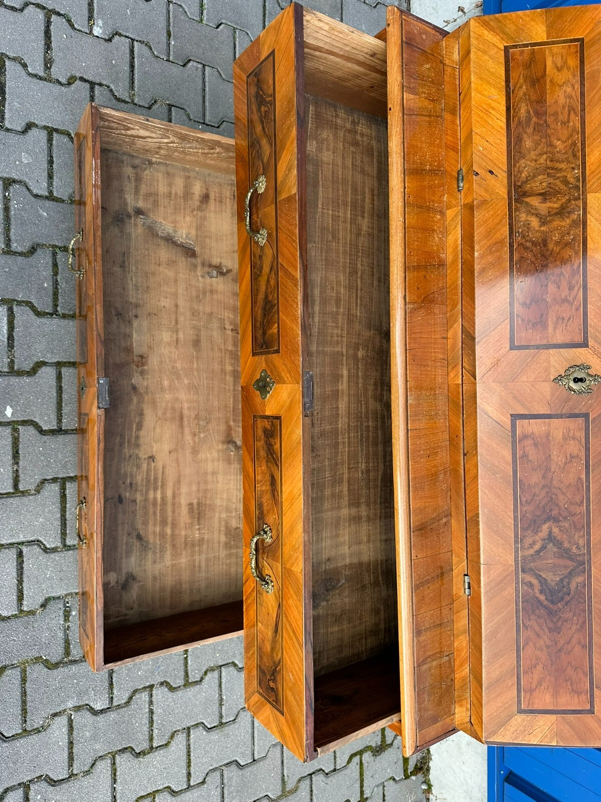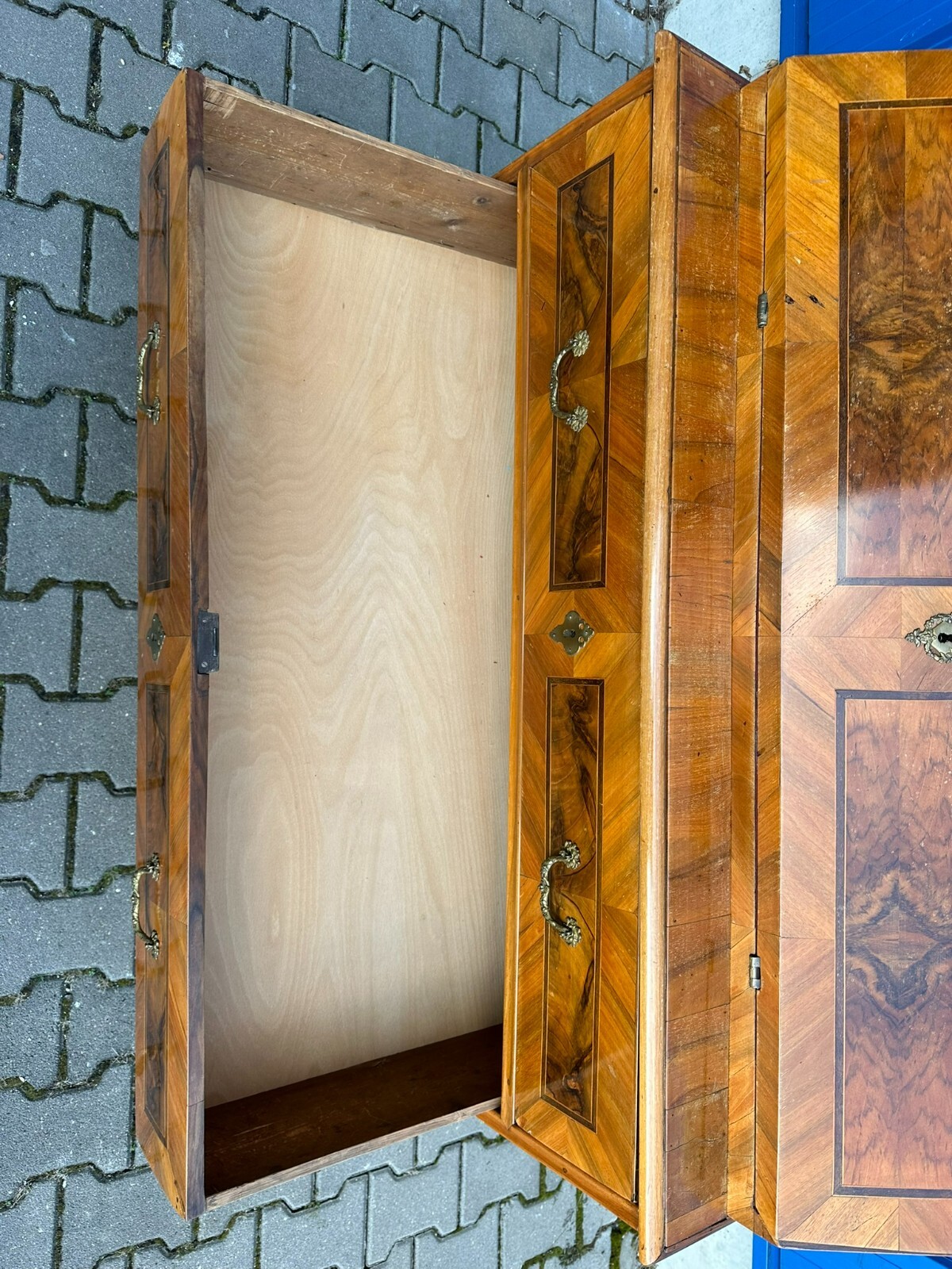 Sehr schöner, Barocker Aufsatzsekretär, 18tes Jahrhundert. Oberfläche ganz leicht berieben. Massiver Holzkorpus im Nussbaum und Wurzelnuss furniert und intarsiert. Der Sekretär wurde mal professionell überarbeitet, kleinste Furnierstücke ausgetauscht, Risse gefüllt und abstehendes Furnier gelegt. Der Innenraum wurde mit Stoff komplett beklebt. Hier teilweise kleinere Flecken. Zwei Schlüssel vorhanden, die unteren drei Schubladen mit zum Teil ausgetauschten Schlössern, an der mittleren Schublade komplett ausgetauschter Boden. An den Schubladenfronten kleine Furnierfehlstellen, unterste Leiste zum Teil berieben. Das Möbel ist dreiteilig. Die vorhandenen Schlüssel passen nur an den vier großen Schubladen, für die Sekretärklappe und die oberste Tür kein Schlüssel vorhanden. Die Sekretärklappe und die oberste Tür sind leicht in sich gewölbt, die Funktionalität wird jedoch nicht beeinträchtigt. Abmessungen BTH: 123x64x188cm, Höhe der Sekretärklappe: 84cm.