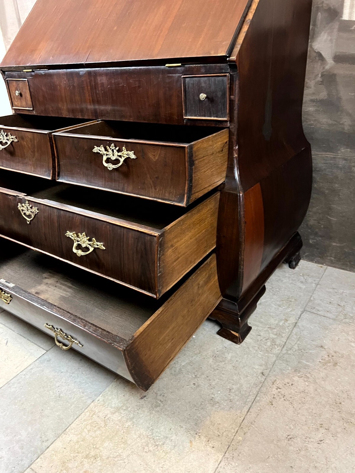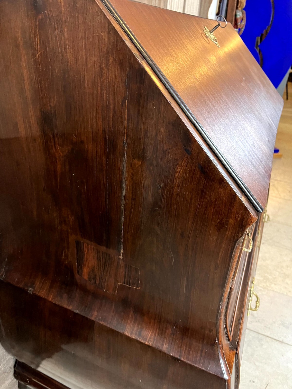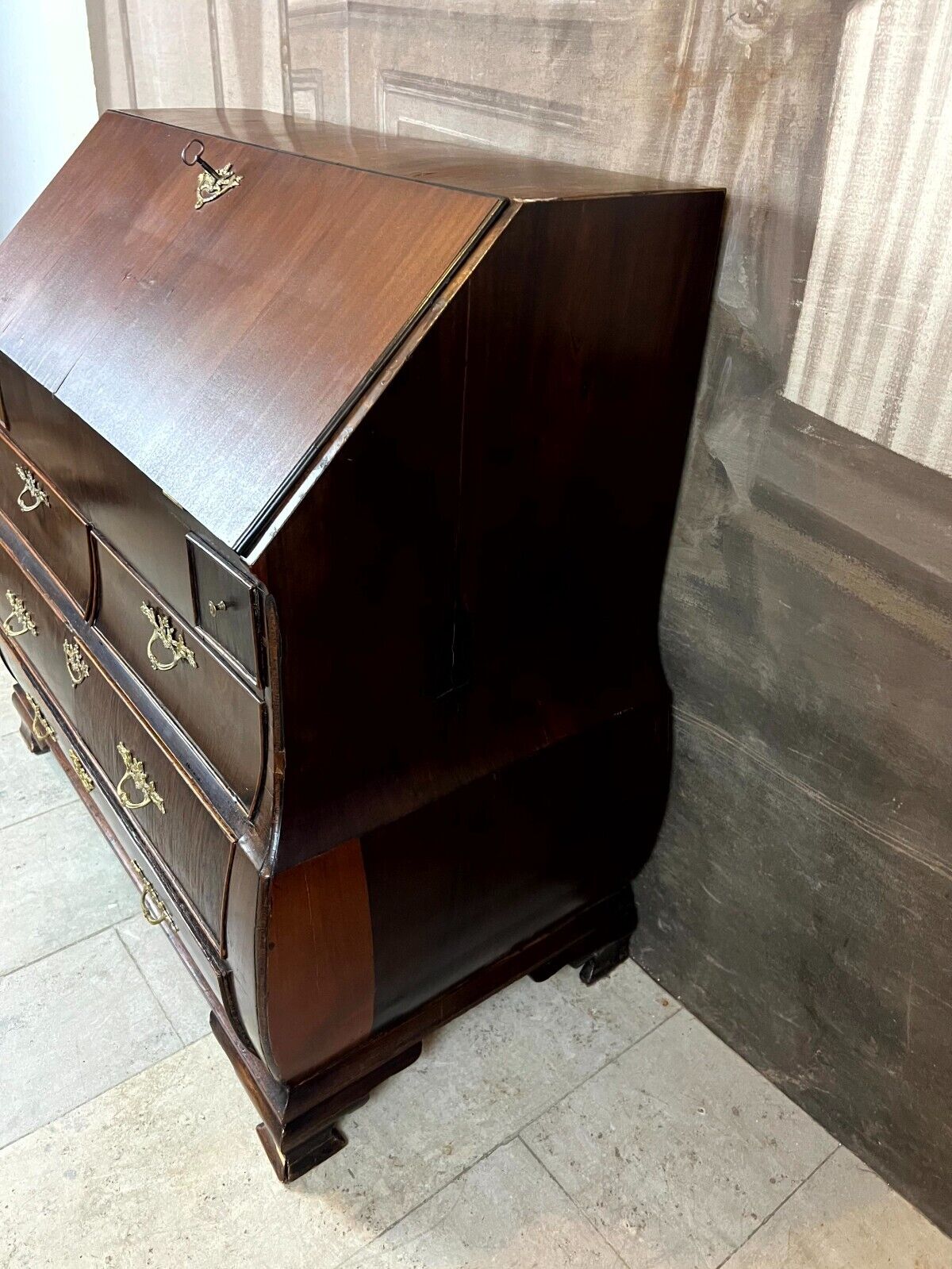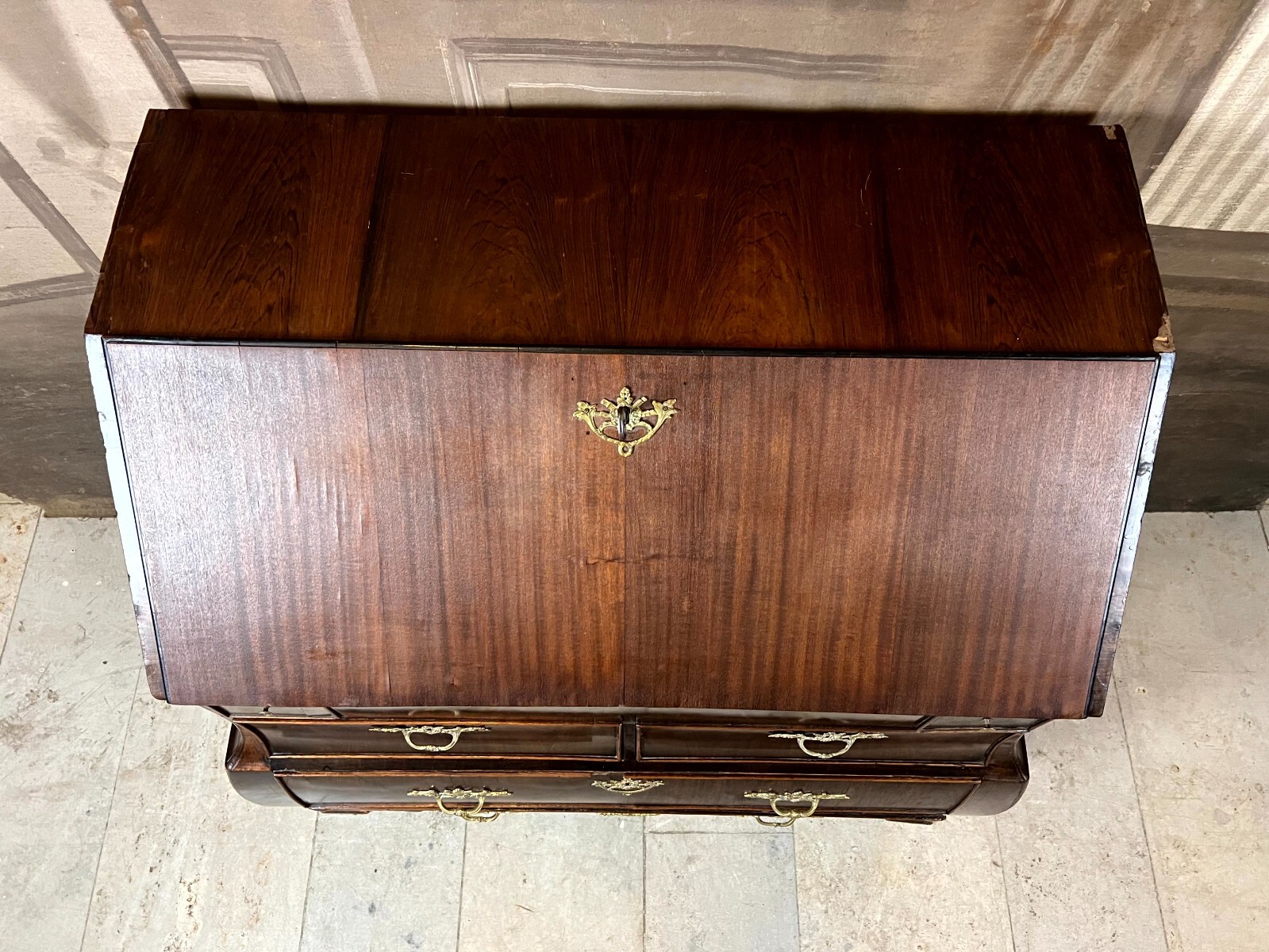 Antiker Louis XV Sekretär um 1760 aus Mahagoni mit Bronzebeschlag. Das Möbel wurde bereits mal restauriert. Im Fußraum berieben und zum Teil bestoßen, am rechten Fuß lange Unvollständigkeit. An der oberen Platte ist das Furnier zum Teil ergänzt und ebenfalls unvollständig. An der gesamten Oberfläche leichte Kratzer und diverse Furnieraufblähungen mit Rissen. An den Seitenteilen Dehnungsrisse, zum Teil gefüllt und unfachmännisch überlackiert. Im Rahmen der Restauration wurde das Furnier an verschiedenen Stellen großflächig ausgetauscht, hier sind zum Teil verschiedene Nuancen zu sehen. An den Schubladenfronten kleinere Risse, hier sind die Ornamentleisten zum Teil unvollständig. Schubladeninnenräume zum Teil fleckig. Im Innenraum leichter Abrieb, die Filzablage ist nicht original und fleckig. Schlüssel nur für die Sekretärklappe vorhanden, hier ist das Schloss funktionsfähig. Stabiler Zustand, Abmessungen BTH: 108x56x106cm, Höhe der Schreibklappe: 79cm.