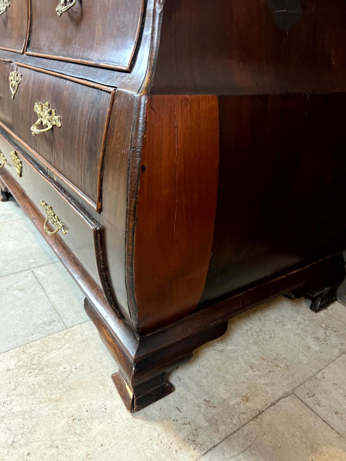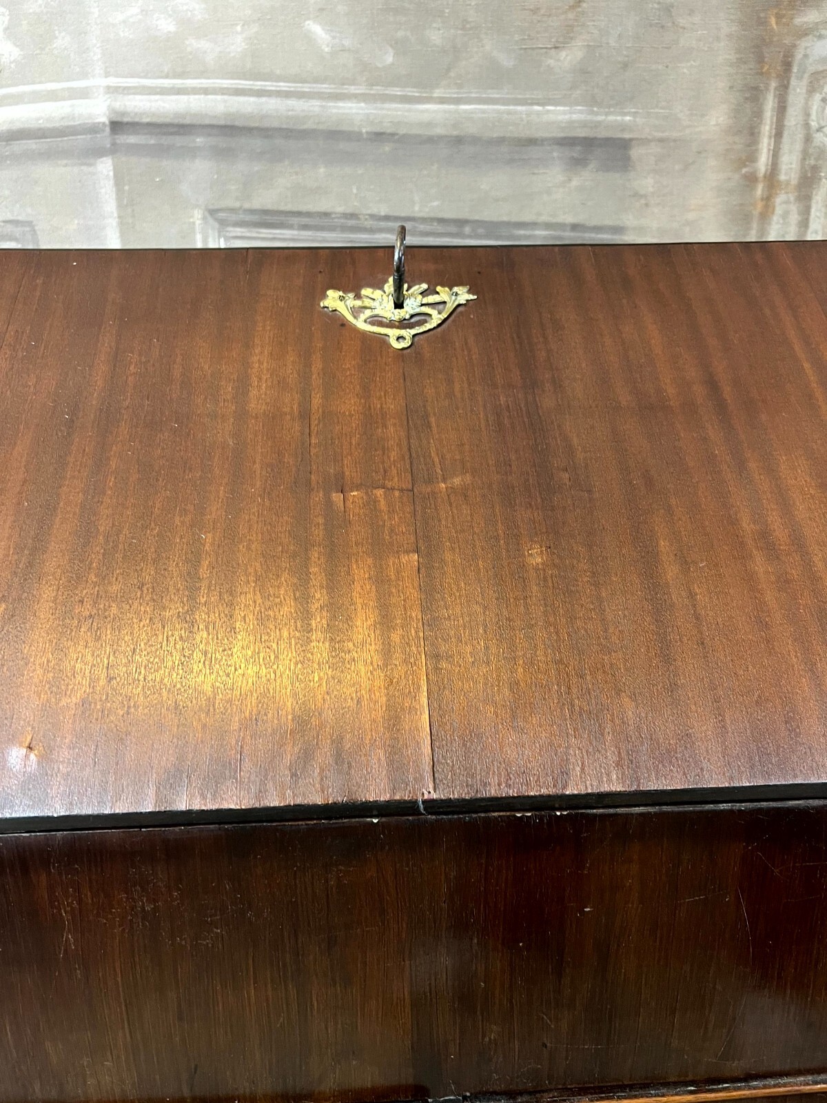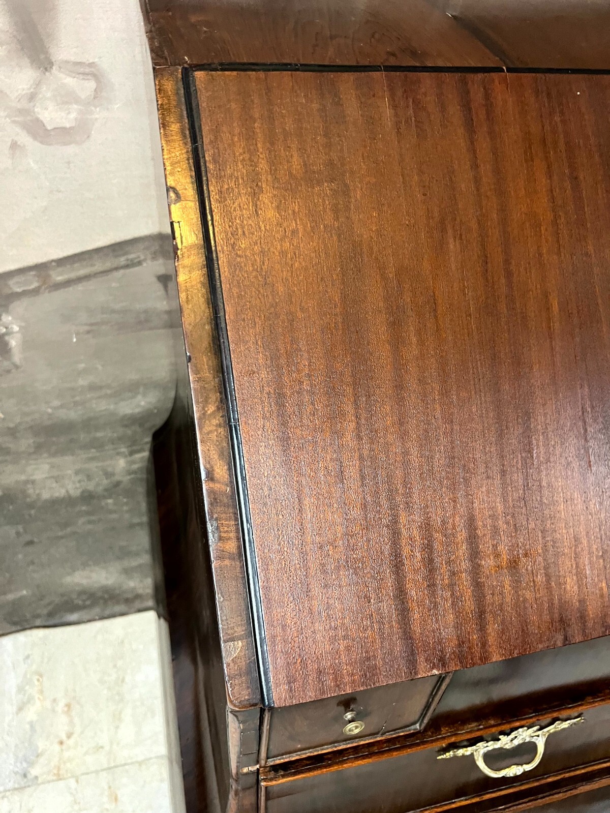 Antiker Louis XV Sekretär um 1760 aus Mahagoni mit Bronzebeschlag. Das Möbel wurde bereits mal restauriert. Im Fußraum berieben und zum Teil bestoßen, am rechten Fuß lange Unvollständigkeit. An der oberen Platte ist das Furnier zum Teil ergänzt und ebenfalls unvollständig. An der gesamten Oberfläche leichte Kratzer und diverse Furnieraufblähungen mit Rissen. An den Seitenteilen Dehnungsrisse, zum Teil gefüllt und unfachmännisch überlackiert. Im Rahmen der Restauration wurde das Furnier an verschiedenen Stellen großflächig ausgetauscht, hier sind zum Teil verschiedene Nuancen zu sehen. An den Schubladenfronten kleinere Risse, hier sind die Ornamentleisten zum Teil unvollständig. Schubladeninnenräume zum Teil fleckig. Im Innenraum leichter Abrieb, die Filzablage ist nicht original und fleckig. Schlüssel nur für die Sekretärklappe vorhanden, hier ist das Schloss funktionsfähig. Stabiler Zustand, Abmessungen BTH: 108x56x106cm, Höhe der Schreibklappe: 79cm.
