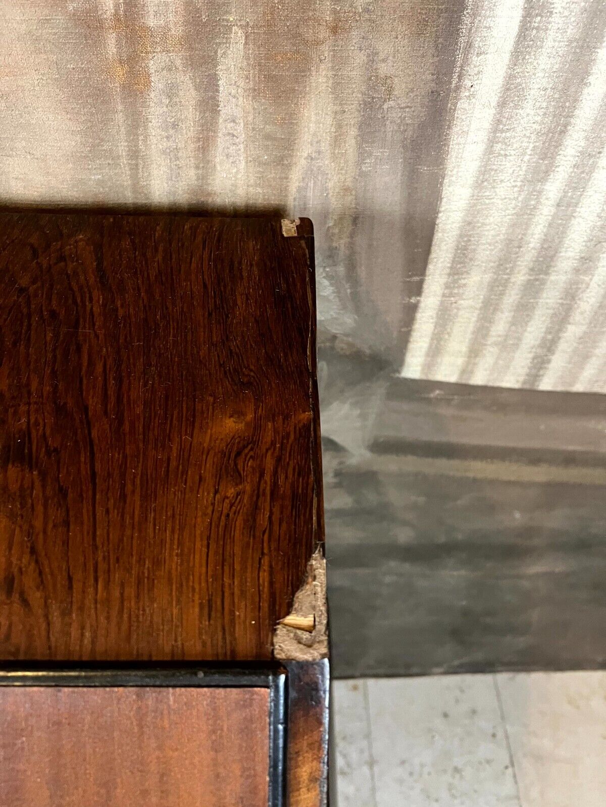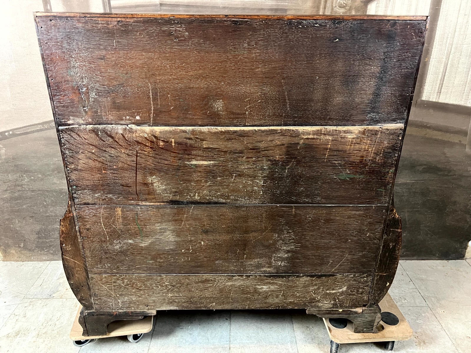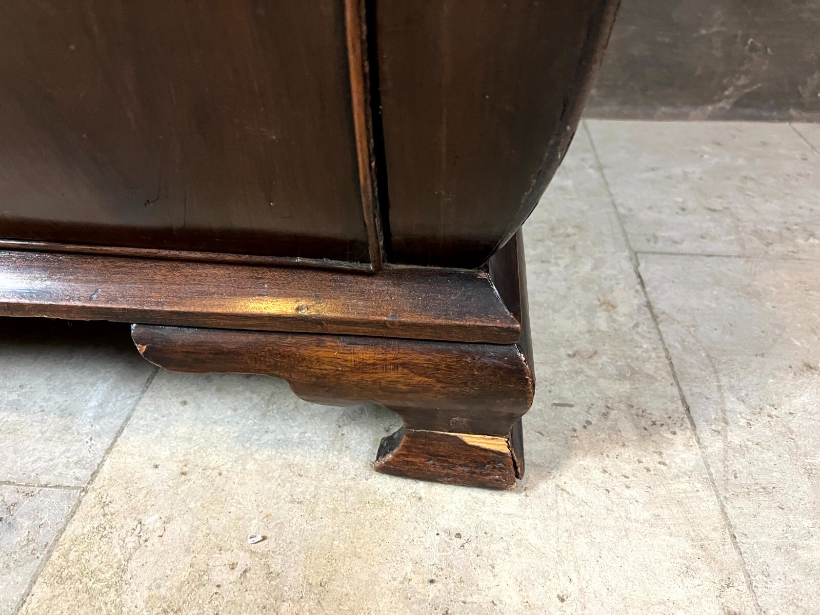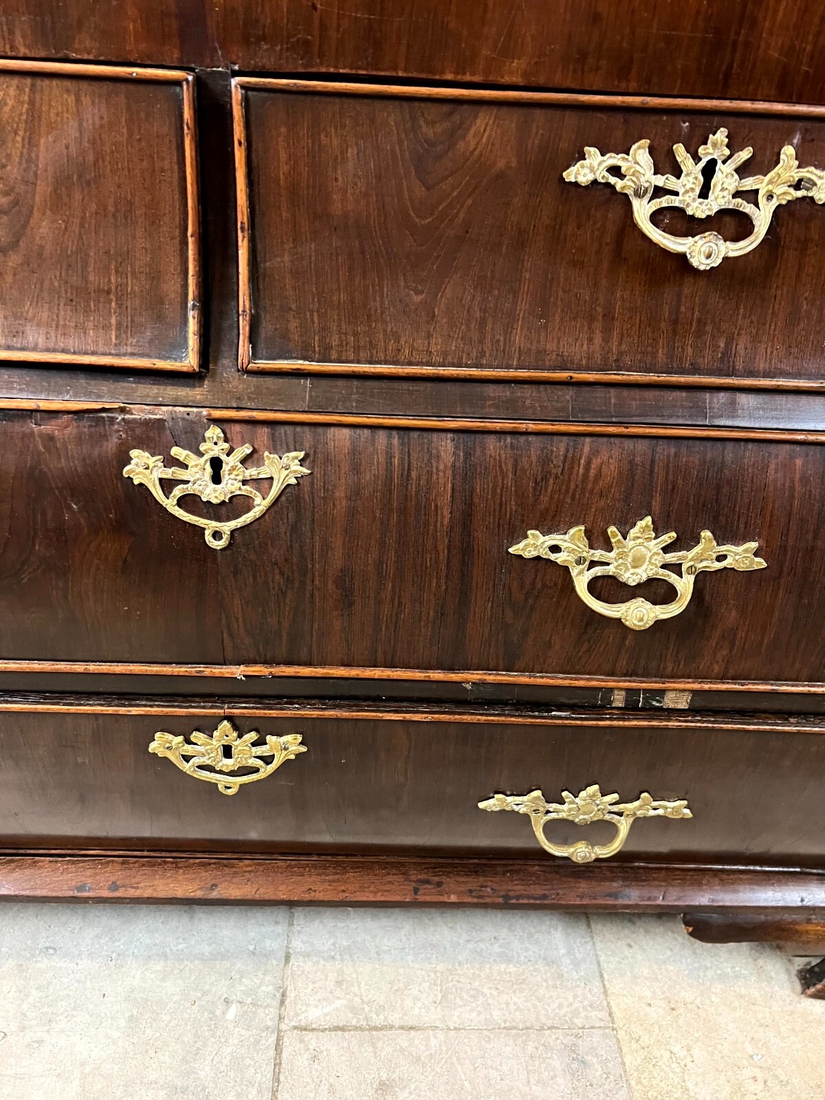 Antiker Louis XV Sekretär um 1760 aus Mahagoni mit Bronzebeschlag. Das Möbel wurde bereits mal restauriert. Im Fußraum berieben und zum Teil bestoßen, am rechten Fuß lange Unvollständigkeit. An der oberen Platte ist das Furnier zum Teil ergänzt und ebenfalls unvollständig. An der gesamten Oberfläche leichte Kratzer und diverse Furnieraufblähungen mit Rissen. An den Seitenteilen Dehnungsrisse, zum Teil gefüllt und unfachmännisch überlackiert. Im Rahmen der Restauration wurde das Furnier an verschiedenen Stellen großflächig ausgetauscht, hier sind zum Teil verschiedene Nuancen zu sehen. An den Schubladenfronten kleinere Risse, hier sind die Ornamentleisten zum Teil unvollständig. Schubladeninnenräume zum Teil fleckig. Im Innenraum leichter Abrieb, die Filzablage ist nicht original und fleckig. Schlüssel nur für die Sekretärklappe vorhanden, hier ist das Schloss funktionsfähig. Stabiler Zustand, Abmessungen BTH: 108x56x106cm, Höhe der Schreibklappe: 79cm.