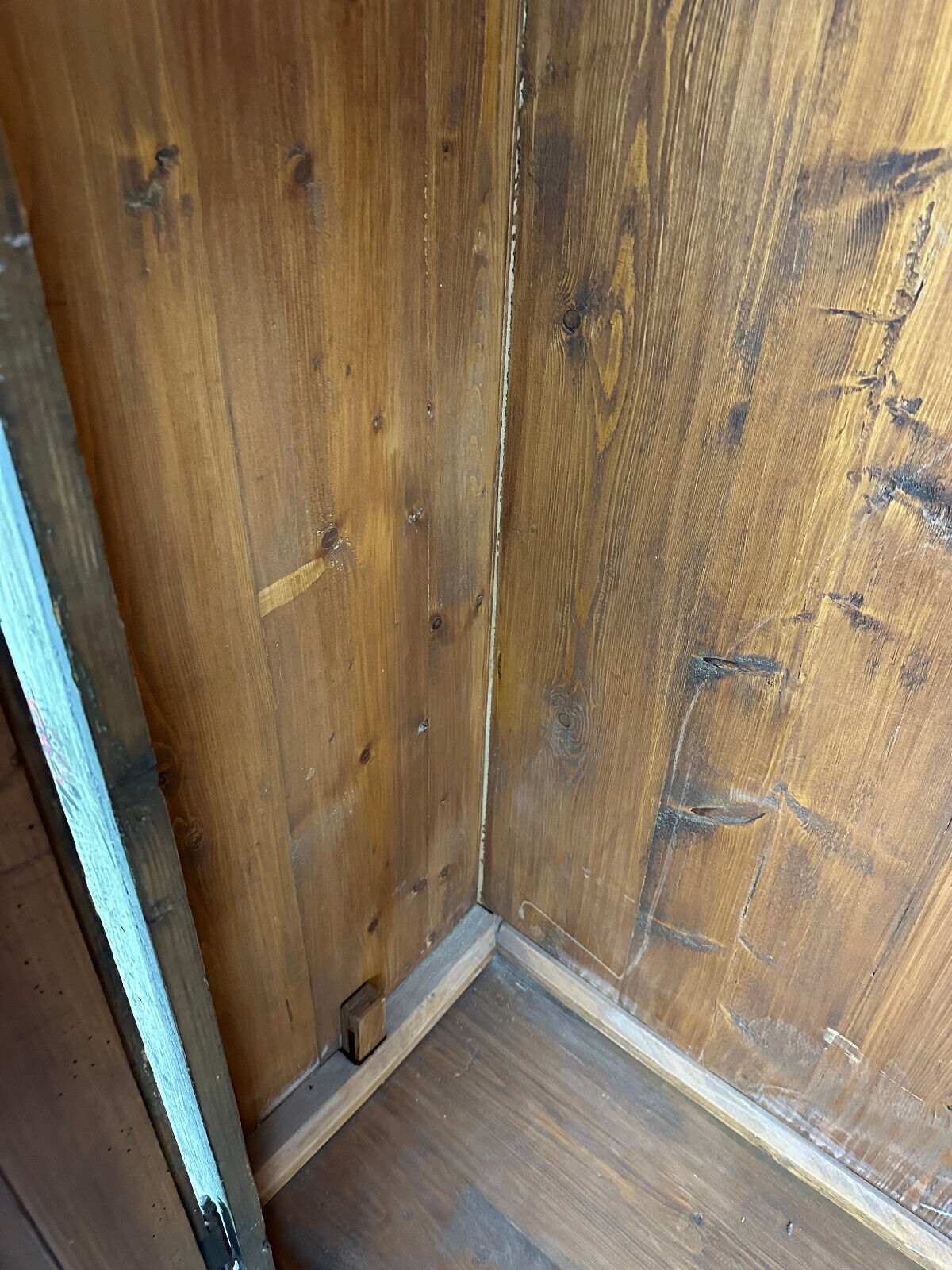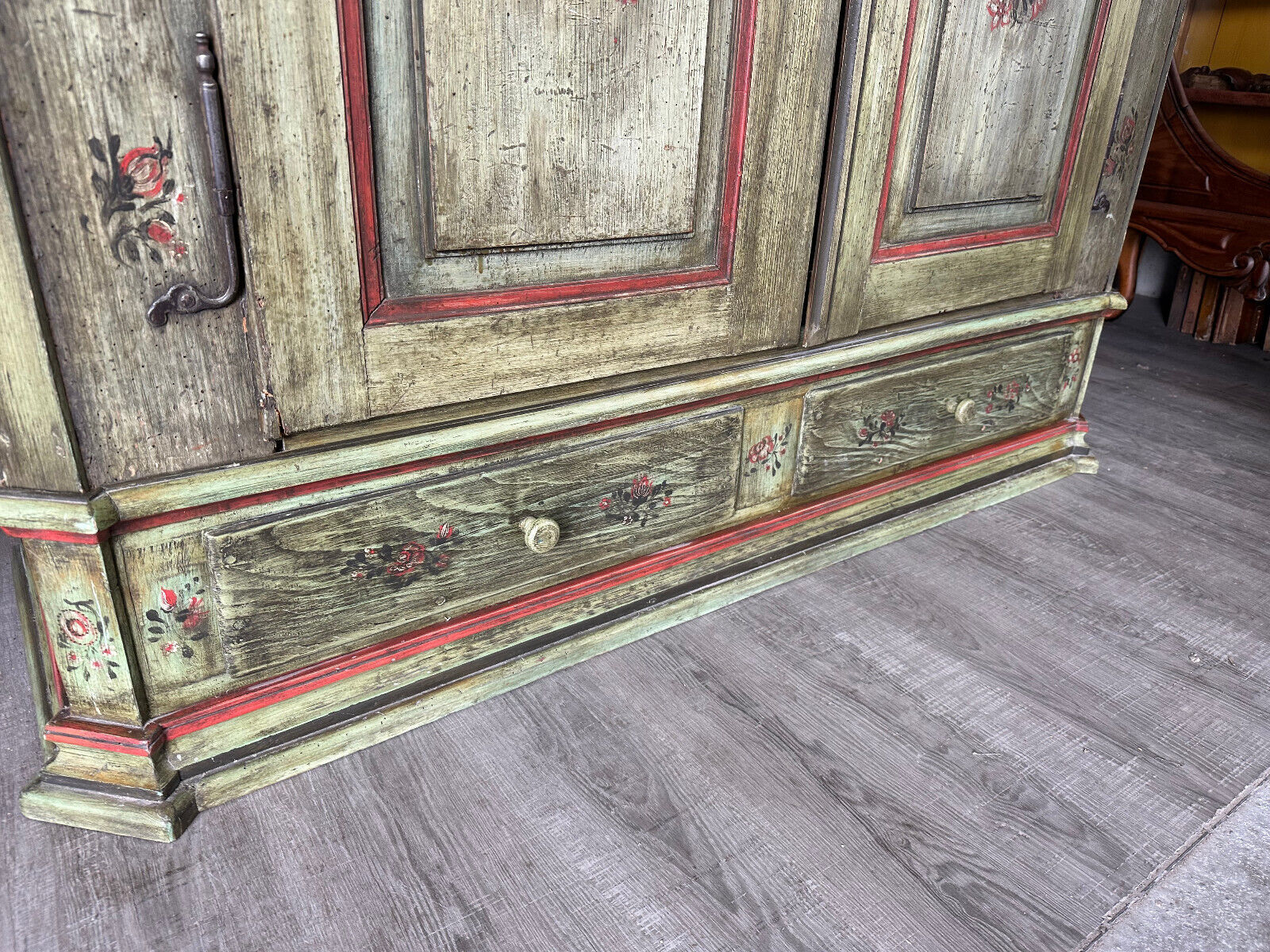 Großer, handbemalter Bauernschrank, nach antikem Vorbild. Weichholzkorpus, mit schönen alpenländischen Malereien und an der gesamten Oberfläche simulierter Abrieb und maschinell zugefügter Wurmfraßimitat. Der Schrank wurde um 1970 angefertigt und sollte die Patina eines echten Originals tragen. Das linke Seitenteil hat sich im Laufe der Zeit nach außen gewölbt, dementsprechend ist der ganze Schrank leicht in sich verzogen und hat an der Rückwand einen Dehnungsspalt. Das Dach fällt mittig nach unten, dementsprechend befindet sich zwischen den Türen ebenfalls ein Spalt. Der Schrank ist in drei Teile zerlegbar, Schlüssel vorhanden, Schloss funktionsfähig. Der obere Kranz ist vorne links und hinten rechts bestoßen und zum Teil unvollständig. Abmessungen BTH: 178x65x196cm.