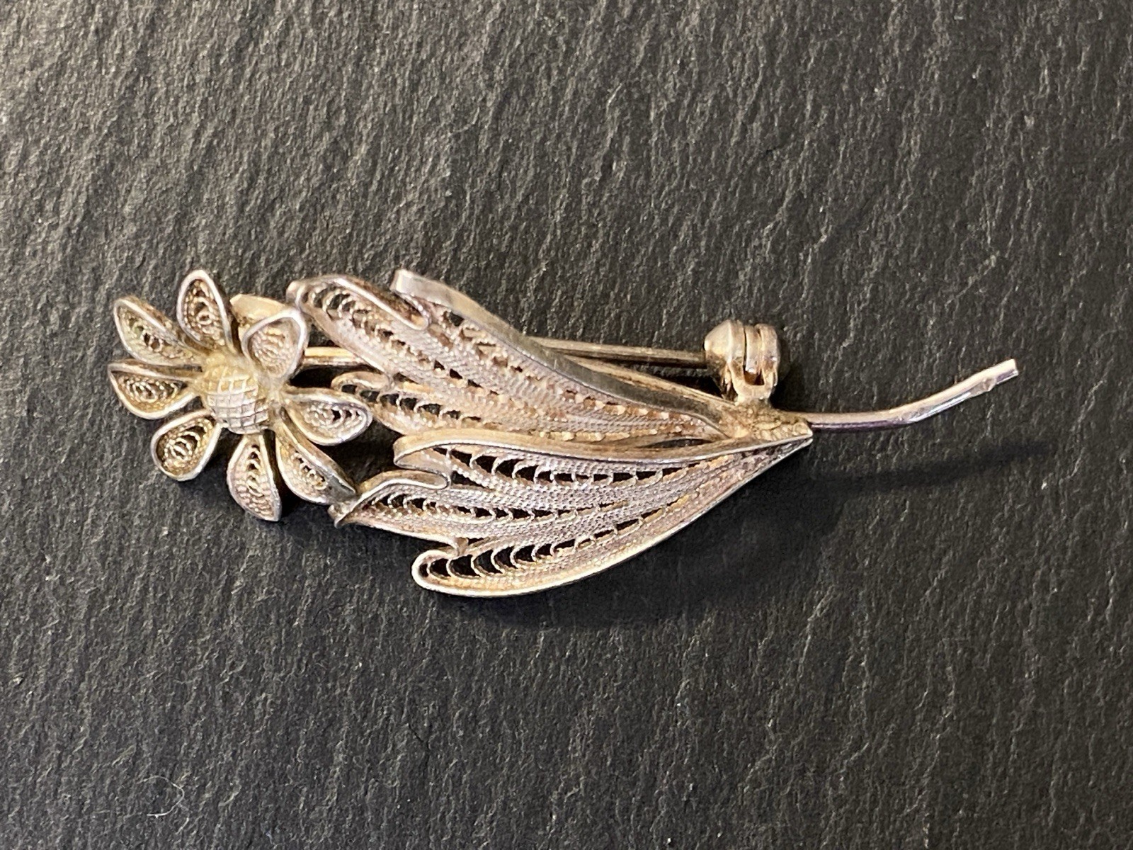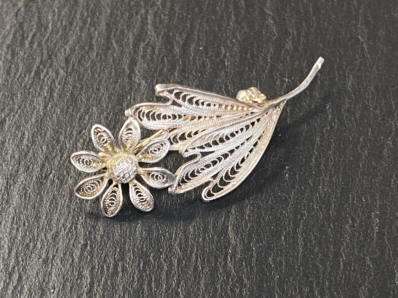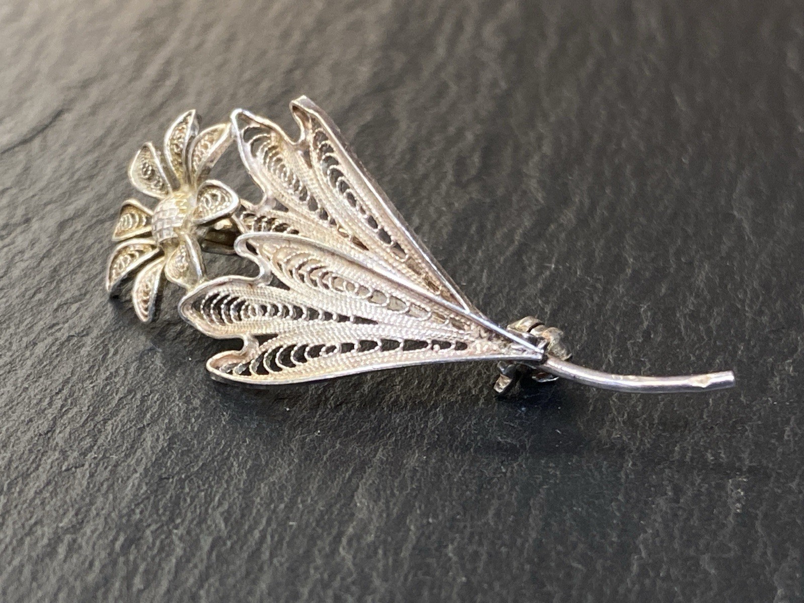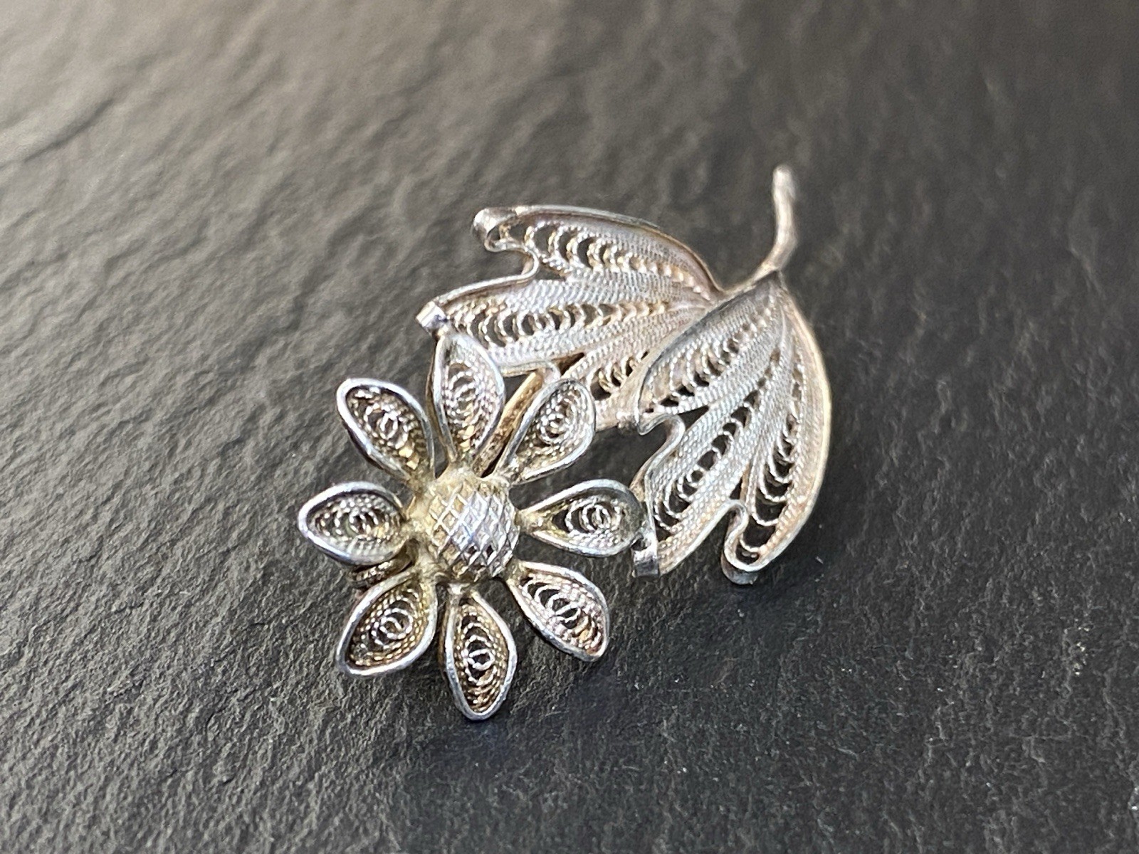Filigran gearbeitete Brosche, ungestempelt, in Form einer Blume. Wohl 960 Silber, mit Niton DXL getestet. Das Dekor ist vollständig, die Oberfläche ist angelaufen. BTH 4,67/1/1,9cm, Gesamtgewicht ca. 3,27g.