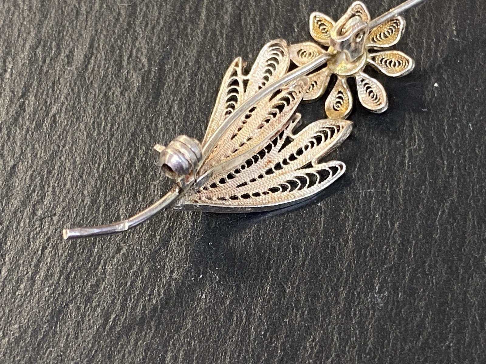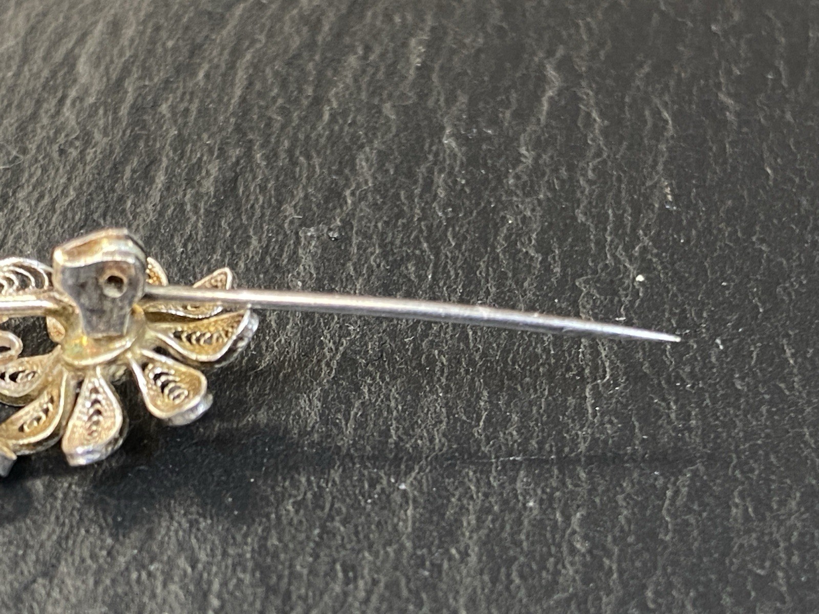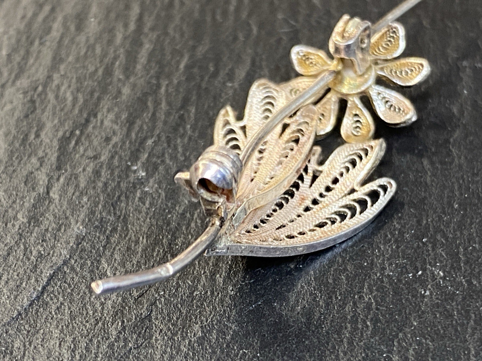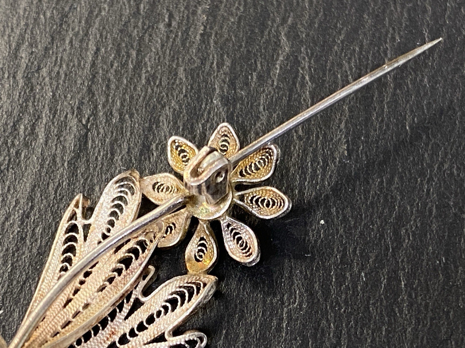 Filigran gearbeitete Brosche, ungestempelt, in Form einer Blume. Wohl 960 Silber, mit Niton DXL getestet. Das Dekor ist vollständig, die Oberfläche ist angelaufen. BTH 4,67/1/1,9cm, Gesamtgewicht ca. 3,27g.