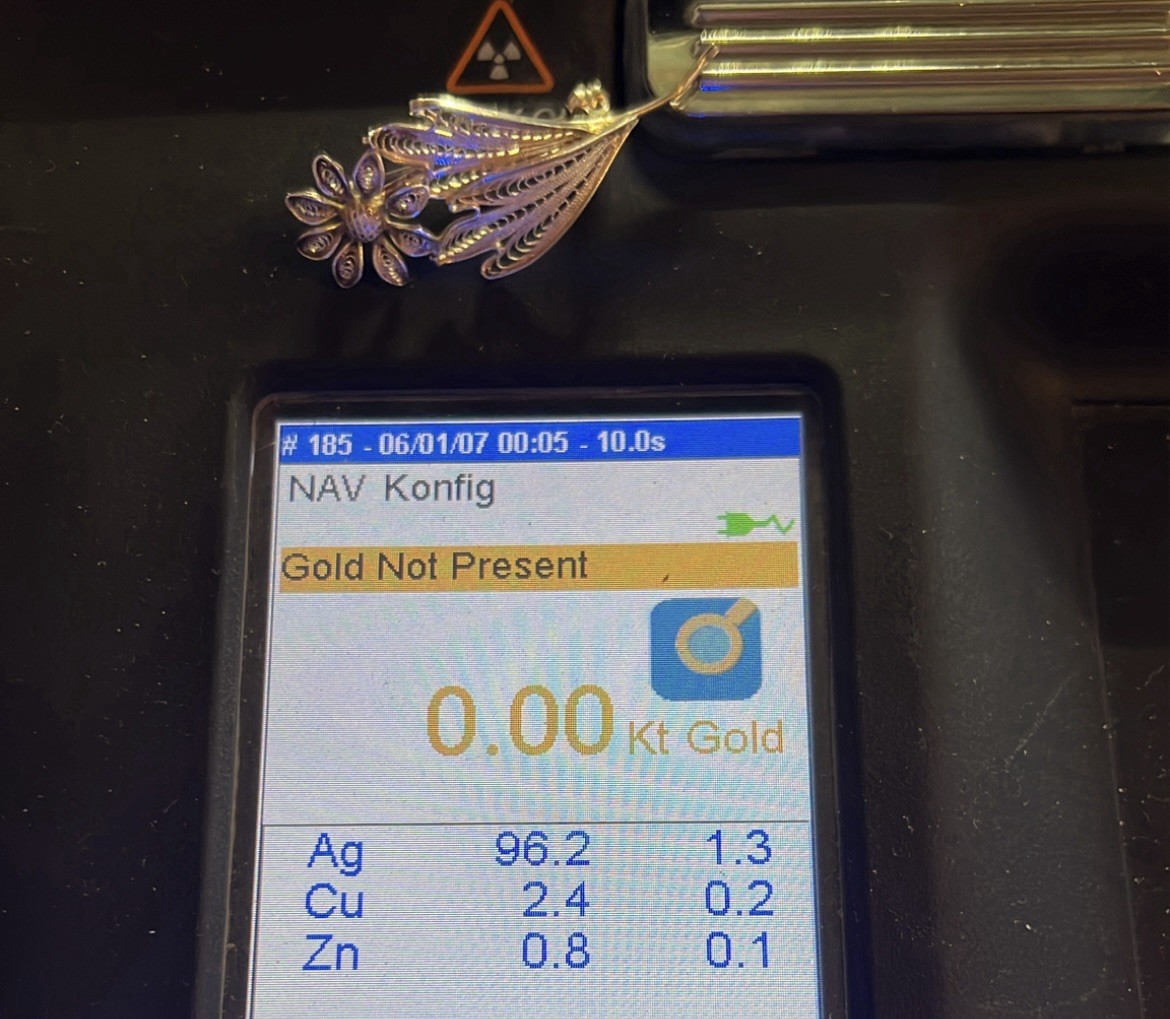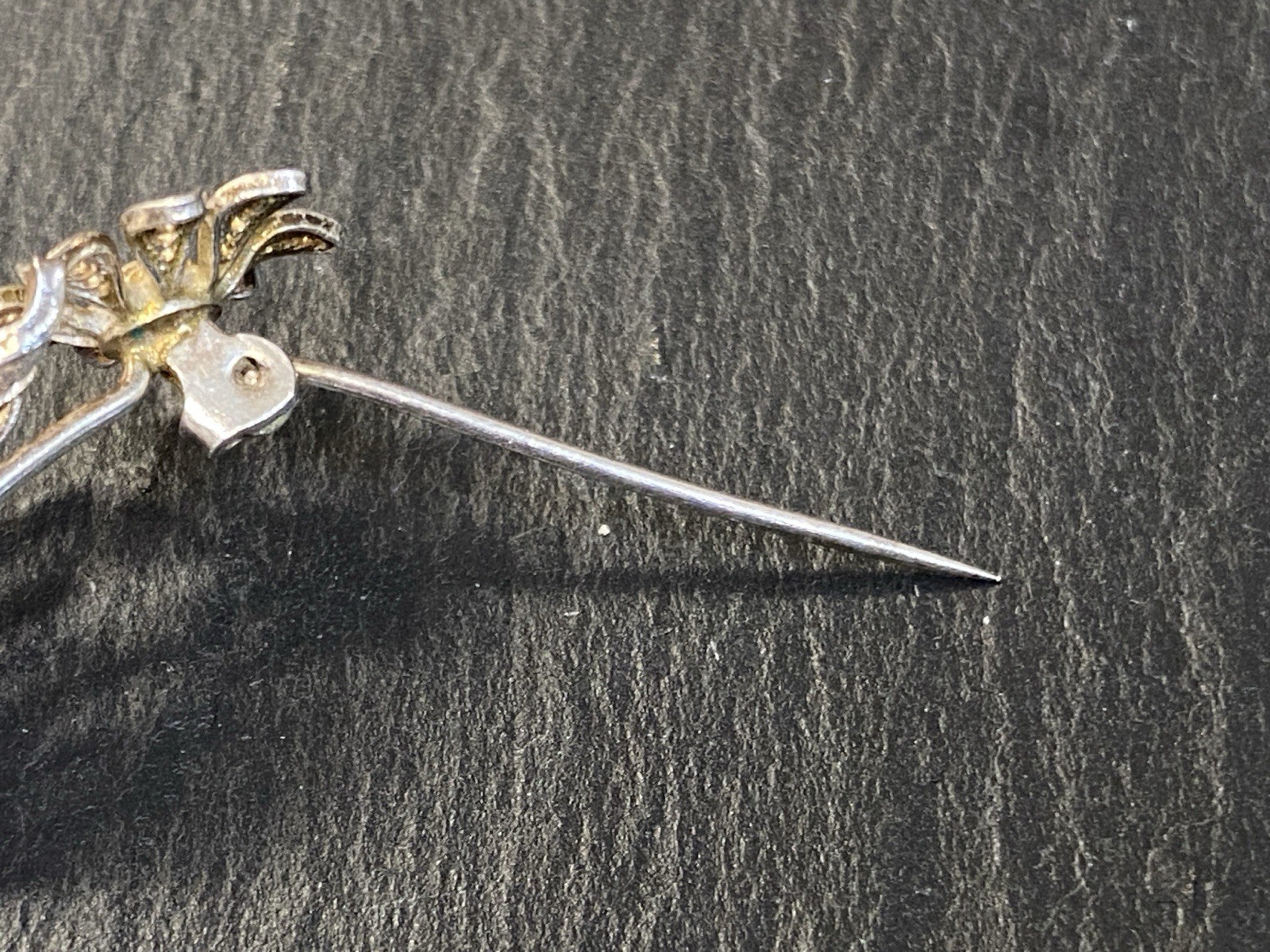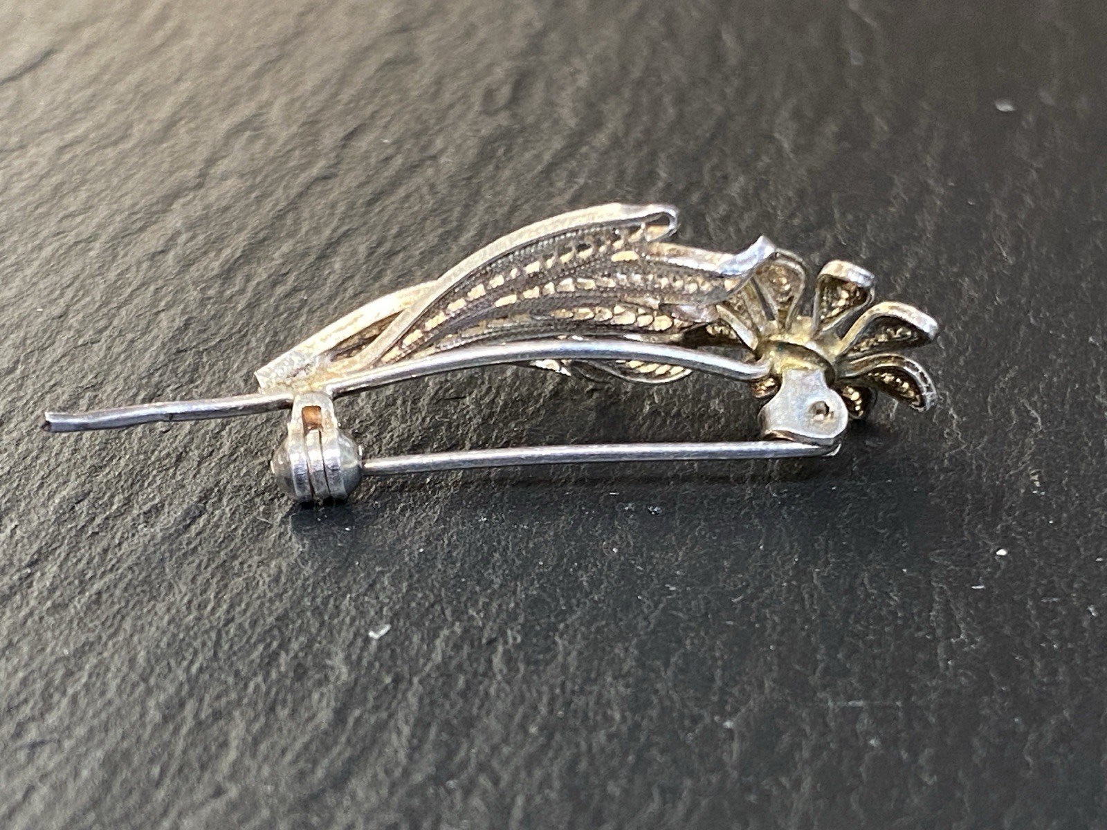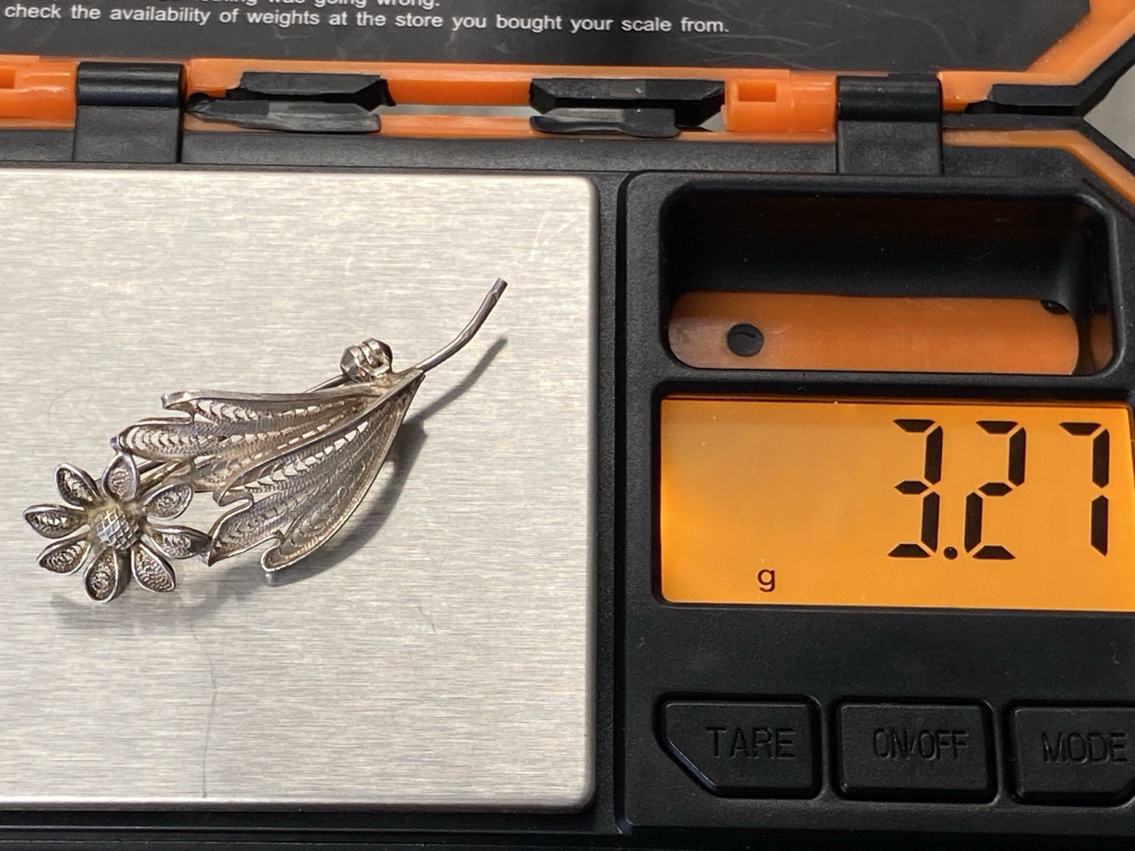 Filigran gearbeitete Brosche, ungestempelt, in Form einer Blume. Wohl 960 Silber, mit Niton DXL getestet. Das Dekor ist vollständig, die Oberfläche ist angelaufen. BTH 4,67/1/1,9cm, Gesamtgewicht ca. 3,27g.