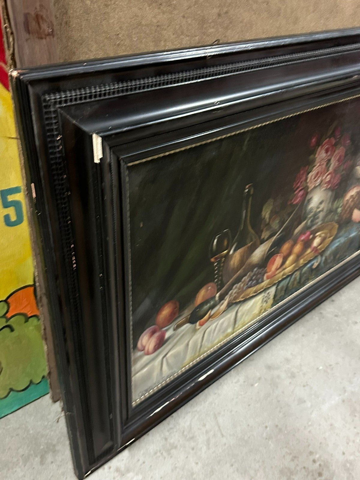 Antikes Ölgemälde auf Leinwand, unten links signiert und datiert. Der Firnis schmutzig, Oberfläche mit ganz leichtem Farbabrieb. Das Gemälde wurde wohl zum Teil gereinigt, insbesondere im unteren Bereich noch Restvergilbungen. Der Rahmen ist sehr massiv und hat diverse Abreibungen und Abplatzer. Abmessungen 112x57cm, mit Rahmen 137x82cm.