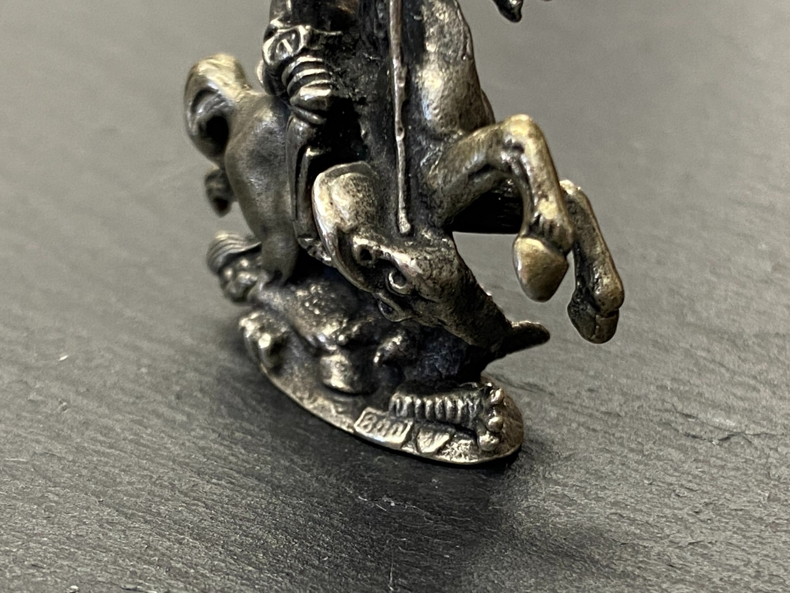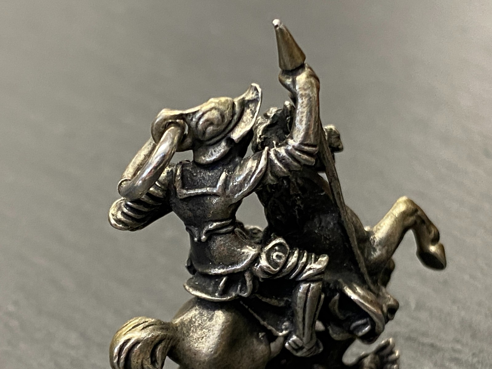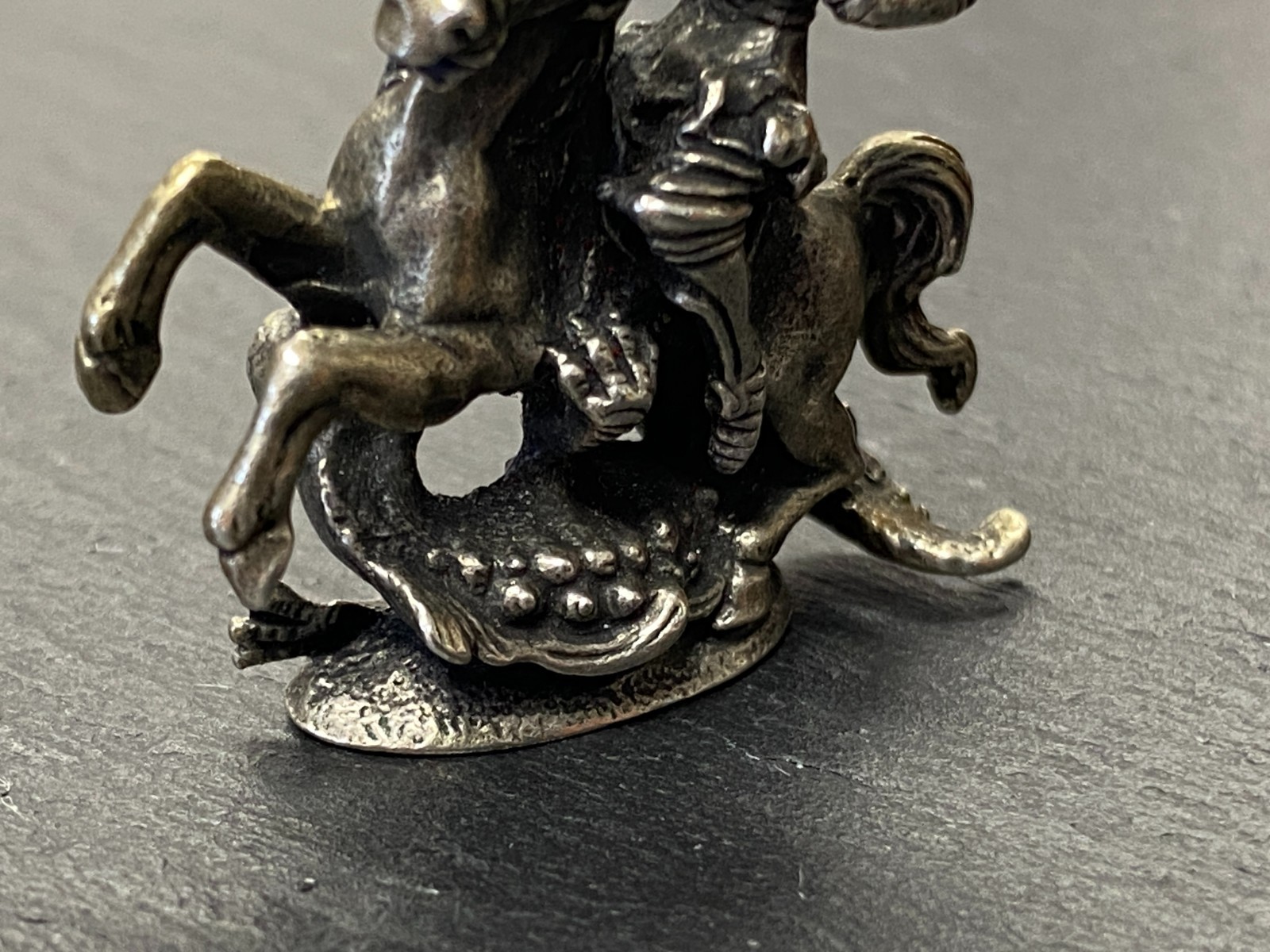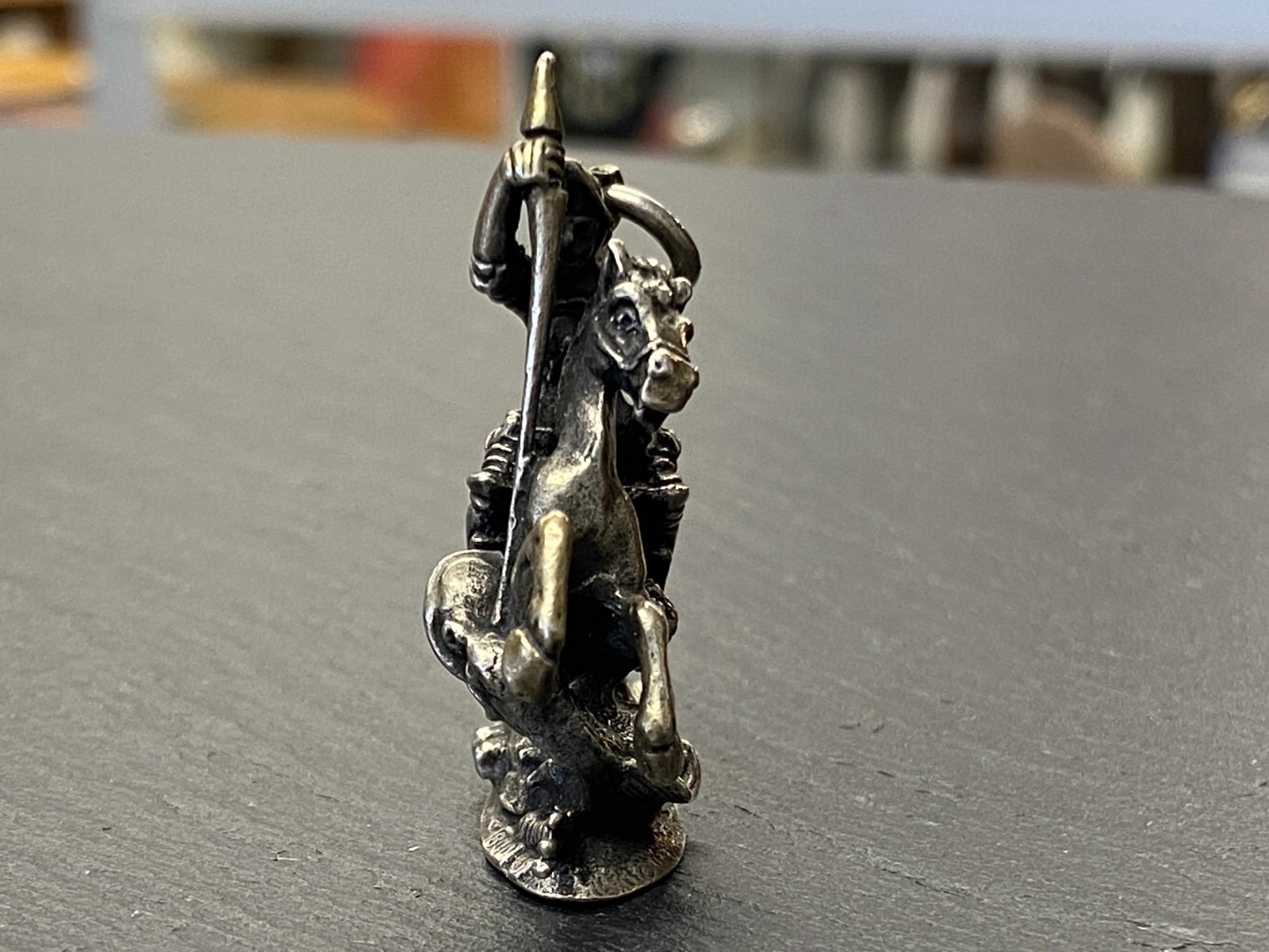 Alter Kettenanhänger aus 800 Silber, punziert, in Darstellung des heiligen Georg auf seinem Pferd, der den Drachen bezwingt. Das Metall ist insgesamt angelaufen, was dem Anhänger seinen Charme verleiht. Abnutzungsspuren insgesamt, der Anhänger ist aber in einem guten Zustand. BTH ca. 3,5/1,27/4cm, Gesamtgewicht ca. 29,70g.