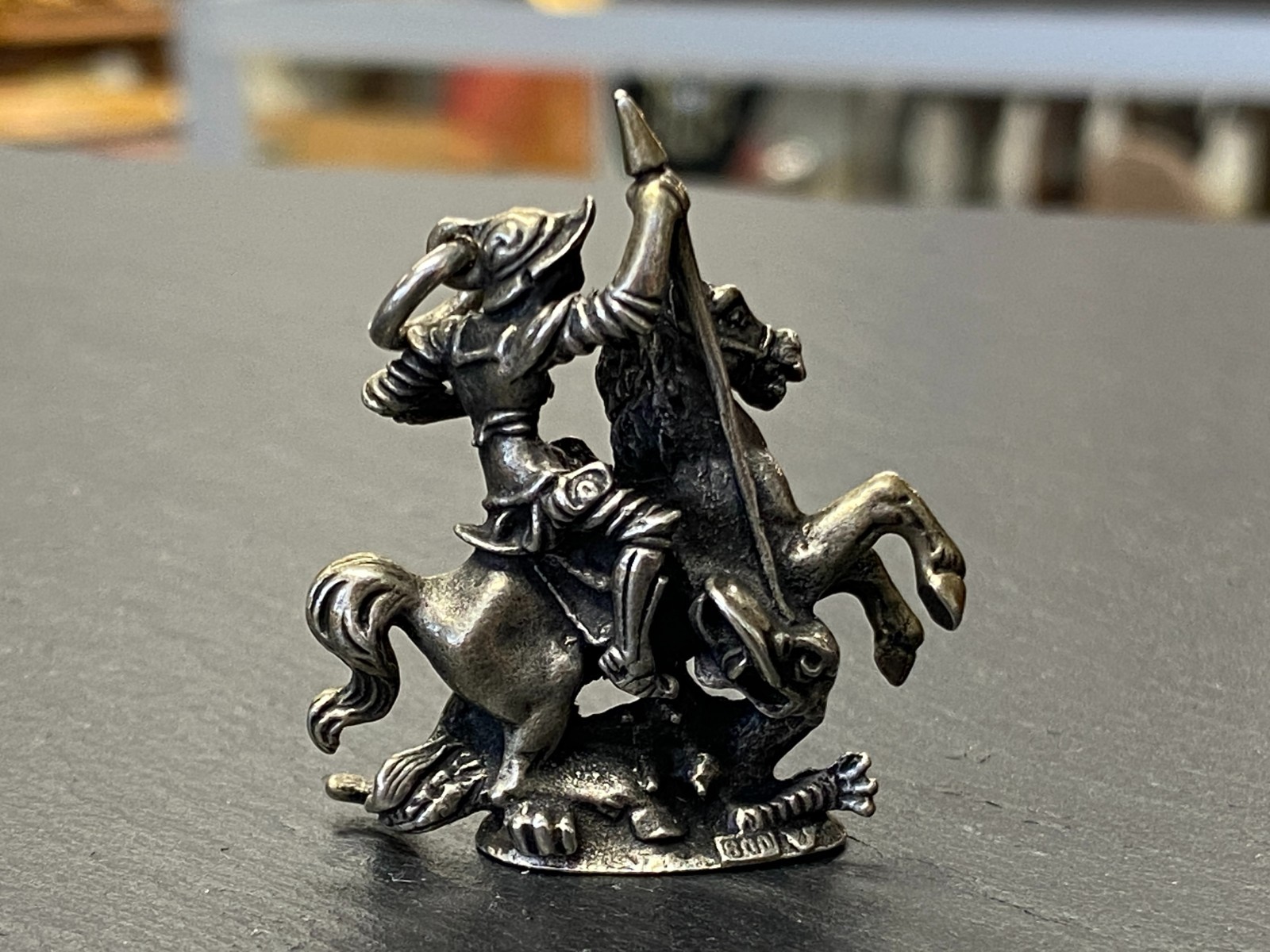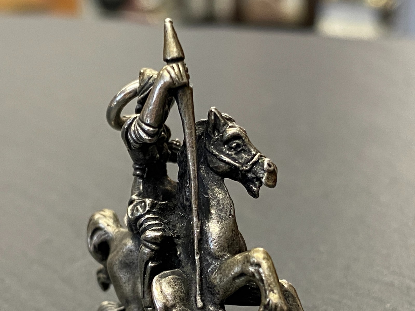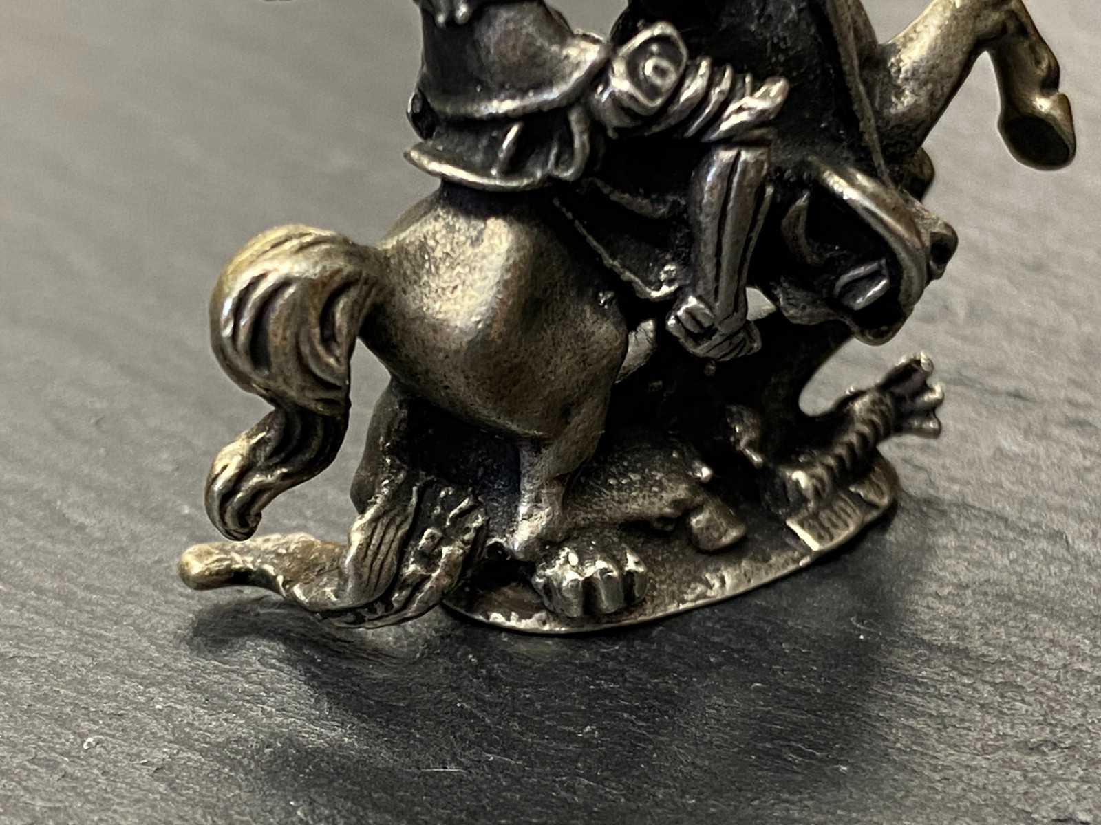 Alter Kettenanhänger aus 800 Silber, punziert, in Darstellung des heiligen Georg auf seinem Pferd, der den Drachen bezwingt. Das Metall ist insgesamt angelaufen, was dem Anhänger seinen Charme verleiht. Abnutzungsspuren insgesamt, der Anhänger ist aber in einem guten Zustand. BTH ca. 3,5/1,27/4cm, Gesamtgewicht ca. 29,70g.