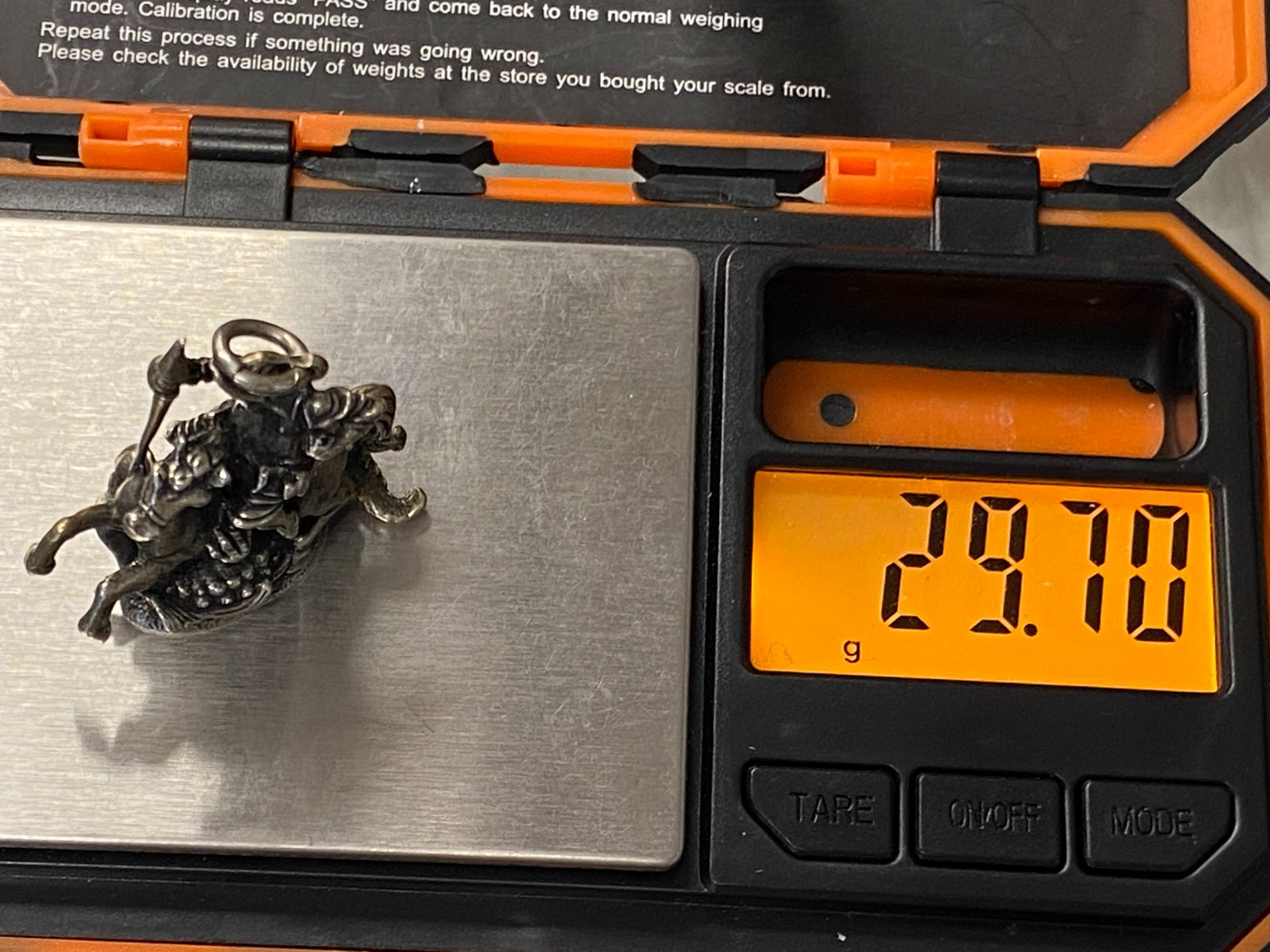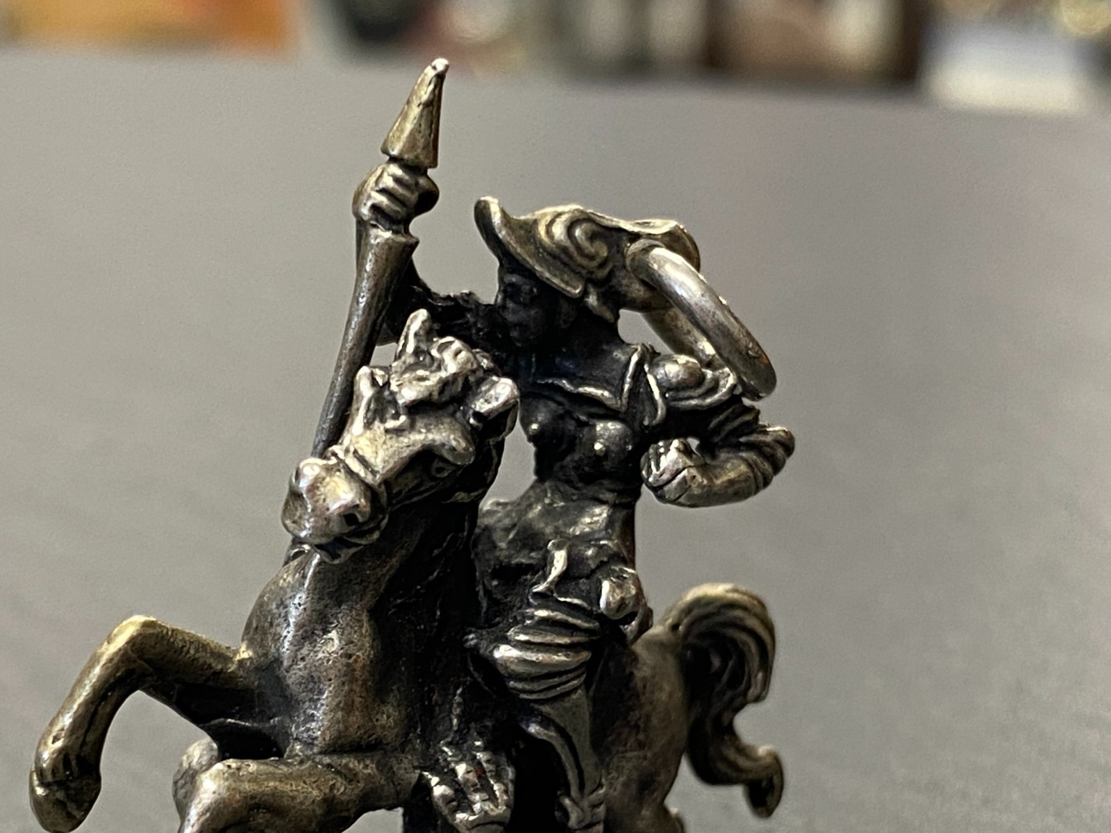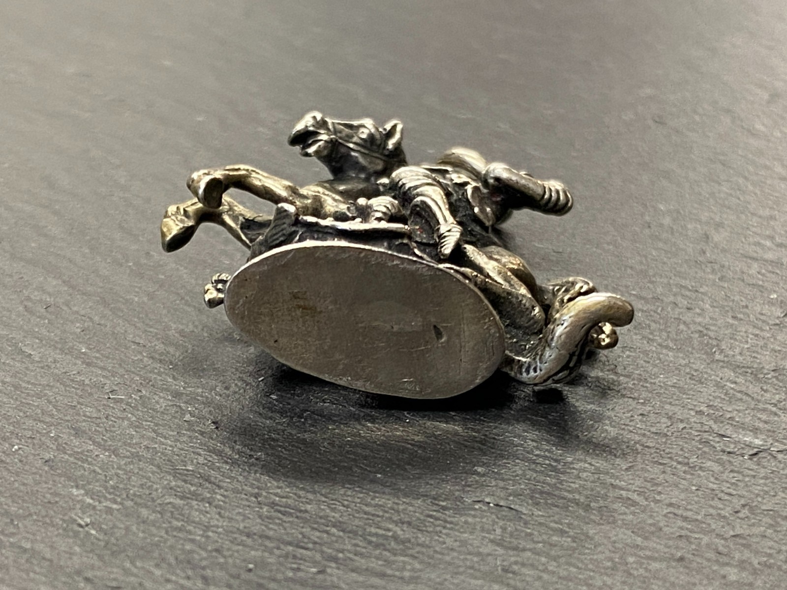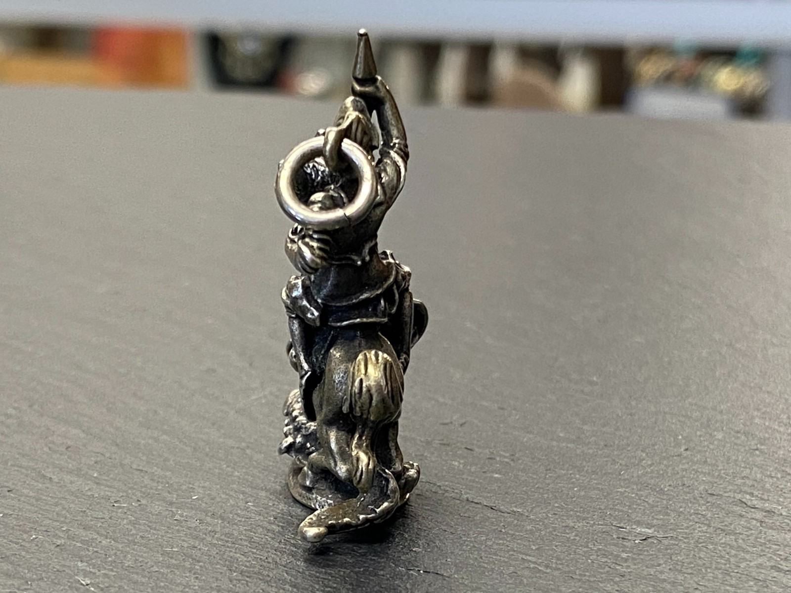 Alter Kettenanhänger aus 800 Silber, punziert, in Darstellung des heiligen Georg auf seinem Pferd, der den Drachen bezwingt. Das Metall ist insgesamt angelaufen, was dem Anhänger seinen Charme verleiht. Abnutzungsspuren insgesamt, der Anhänger ist aber in einem guten Zustand. BTH ca. 3,5/1,27/4cm, Gesamtgewicht ca. 29,70g.