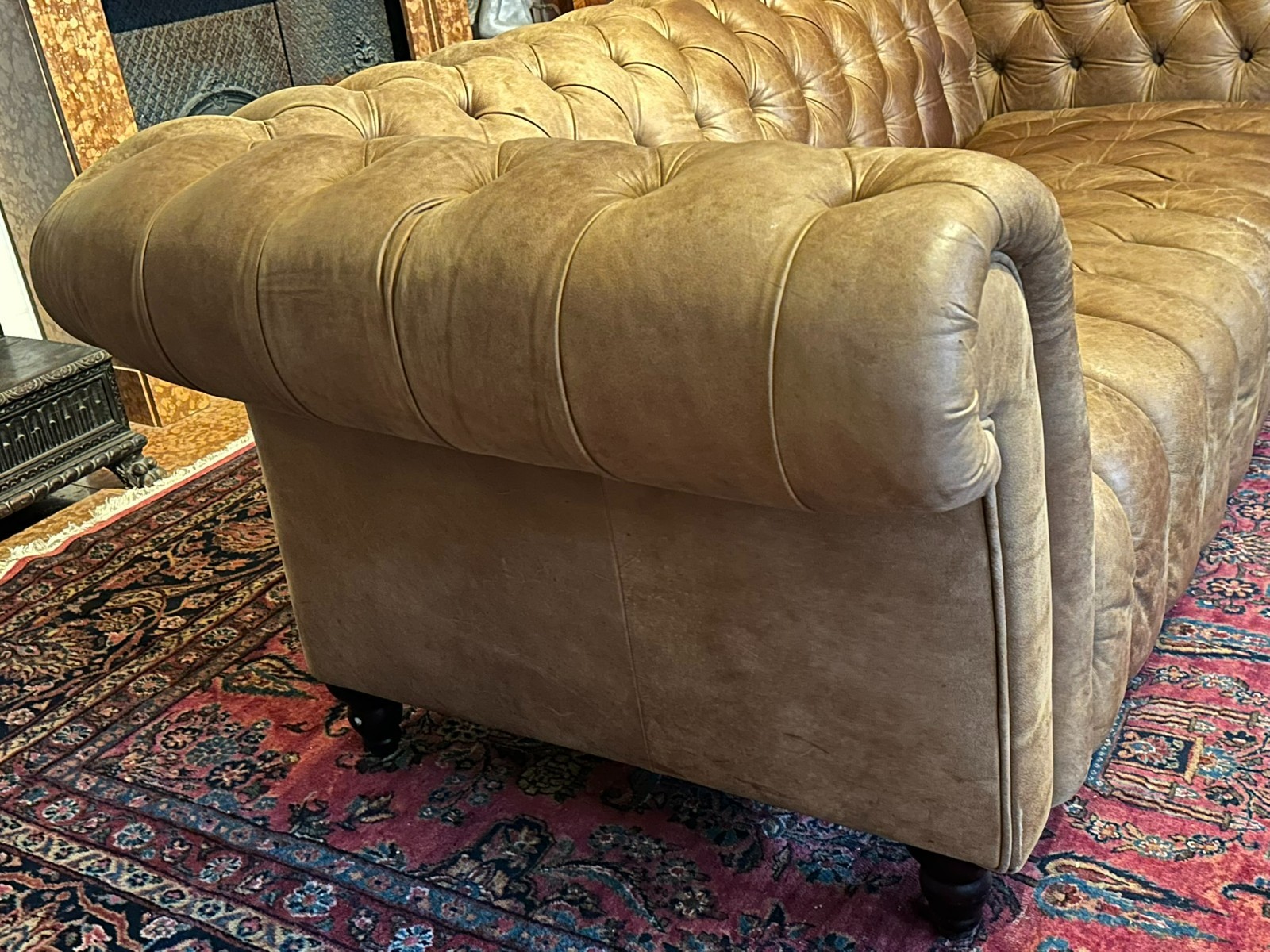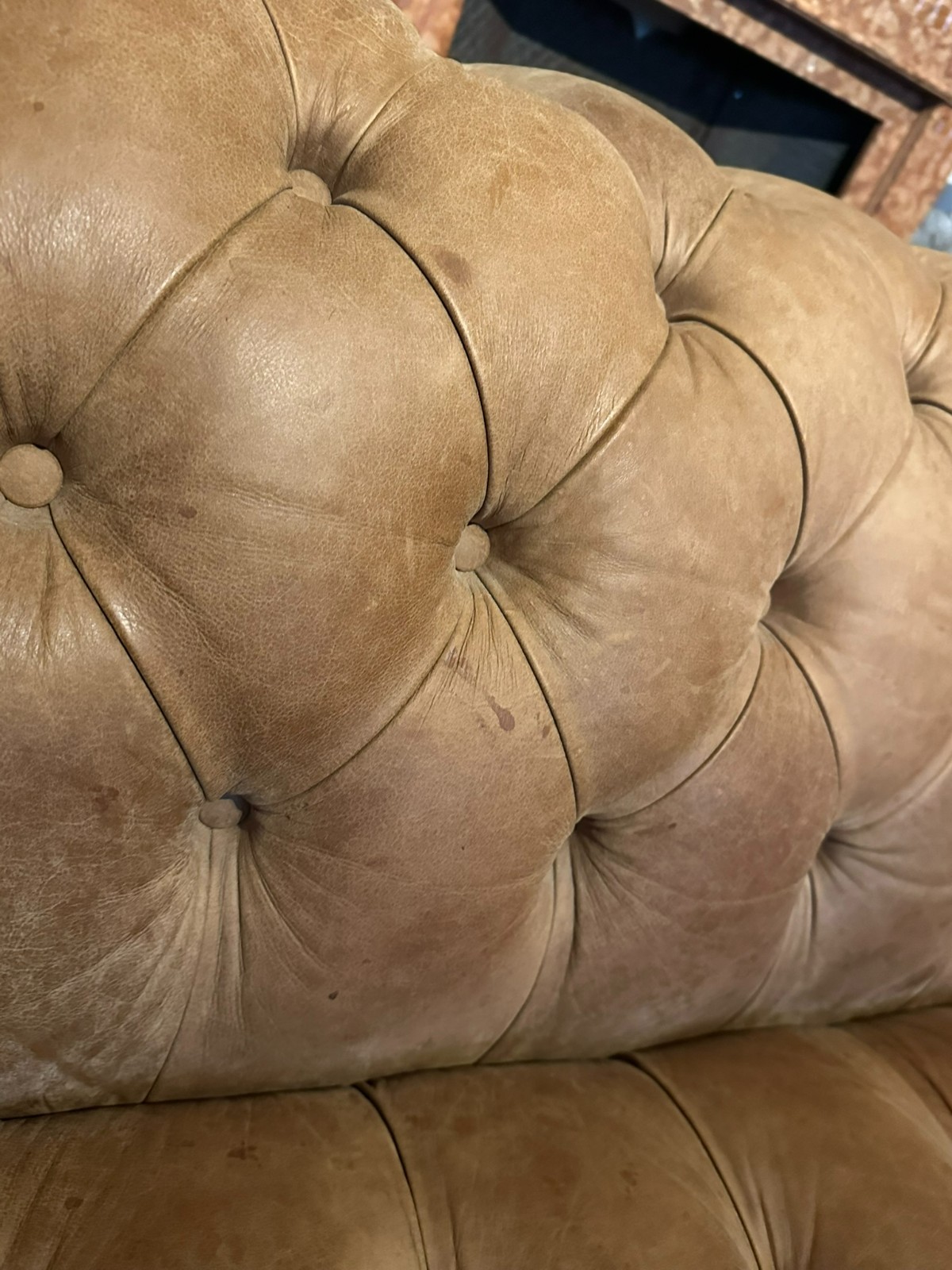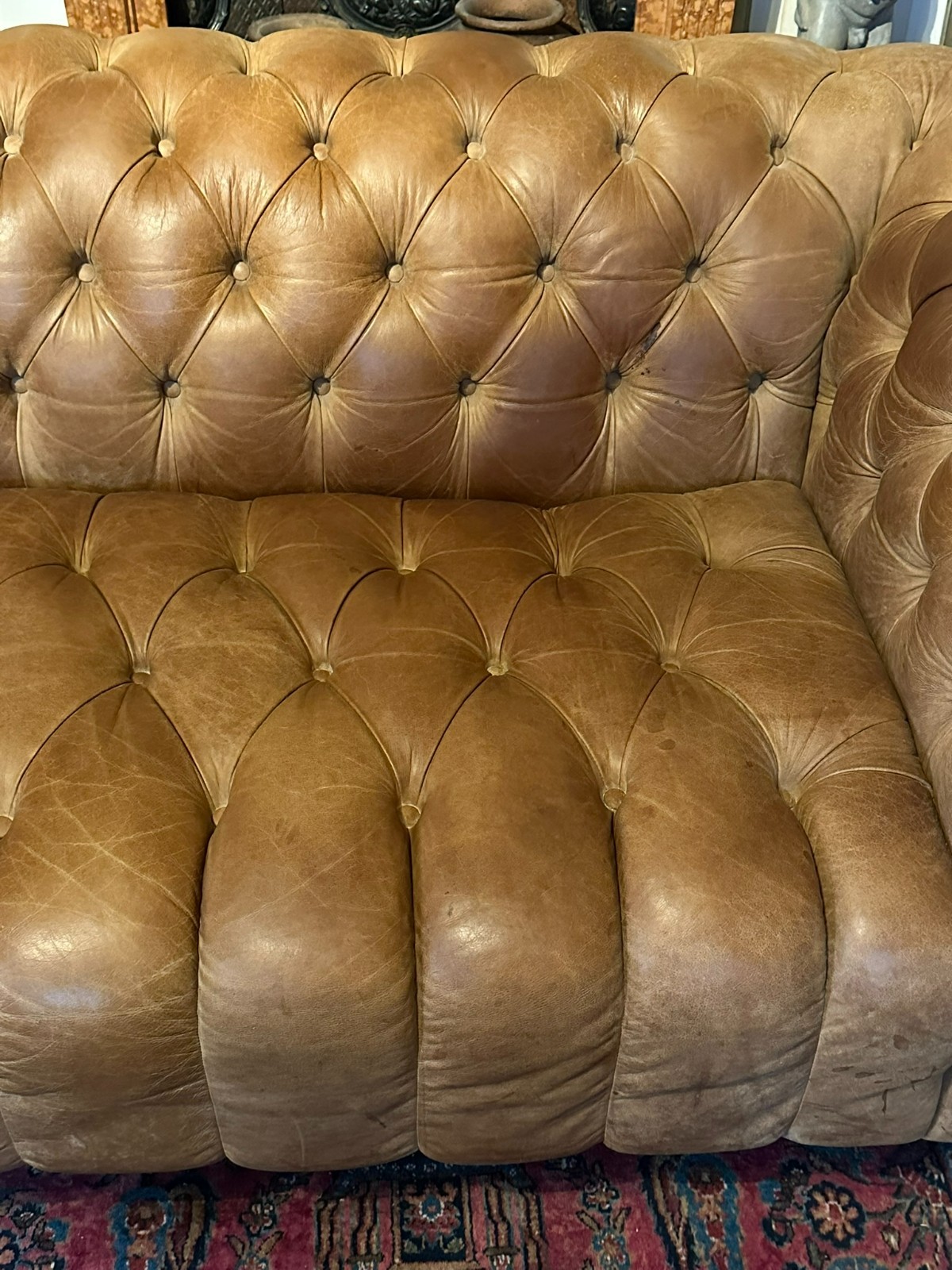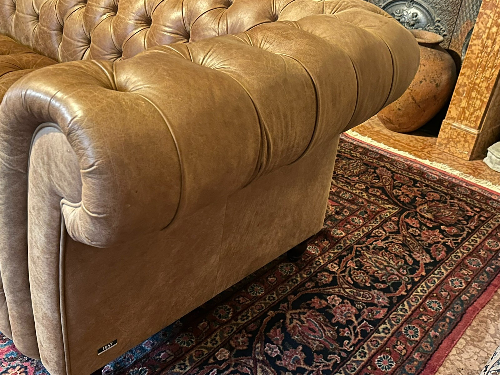 Gebrauchte Couch aus Leder in Chesterfield Look, Gutmann Collection 1867, NP wohl 1799 Euro. Am Leder keine Beschädigungen, sehr guter Sitzkomfort, wurde nur ein Jahr genutzt. Diverse kleinere Flecken, die normalerweise zu reinigen sind, einseitig dunklerer Farbton. Abmessungen BTH 224/99/74cm, Sitzhöhe 40cm.