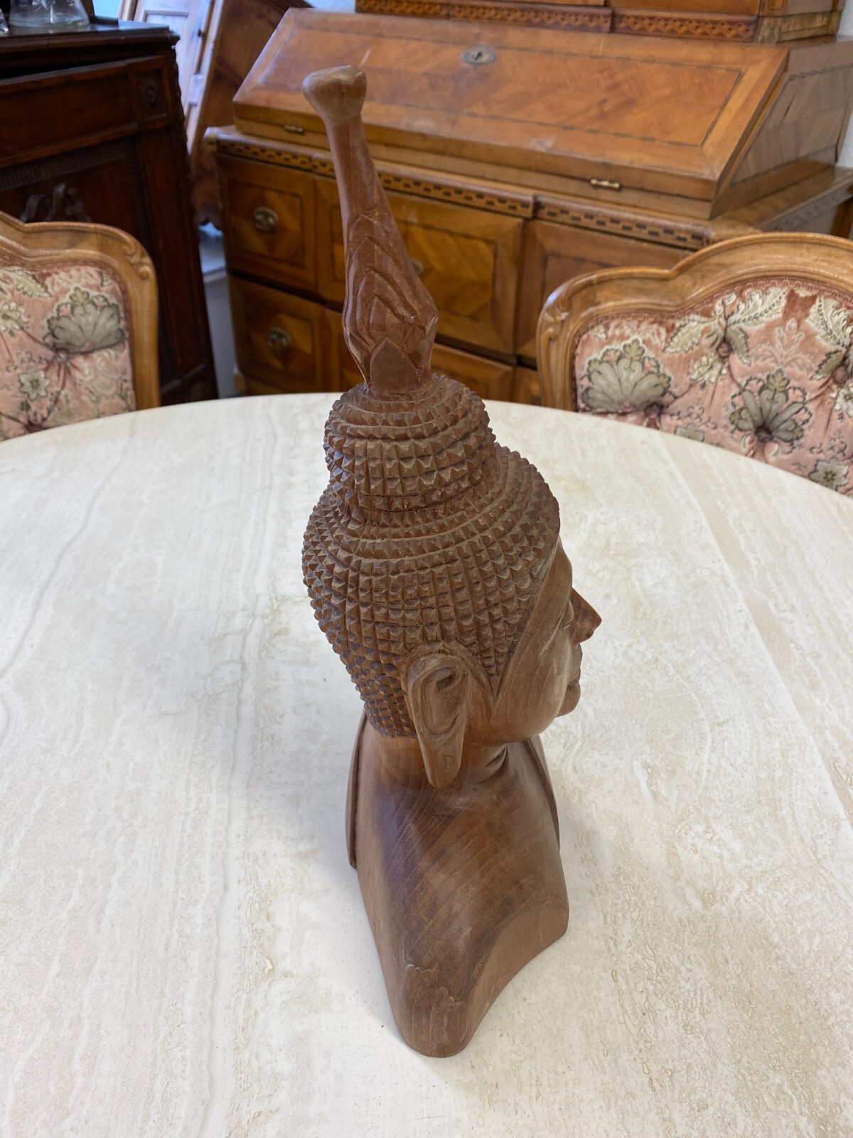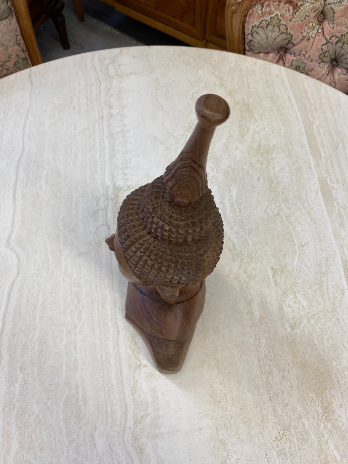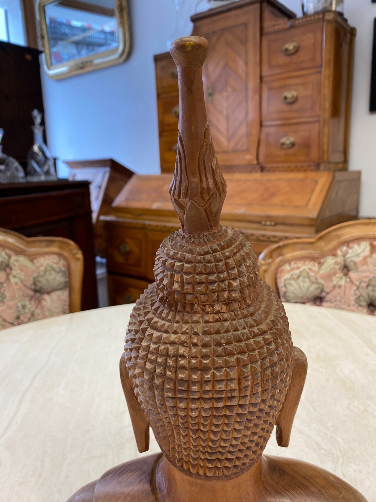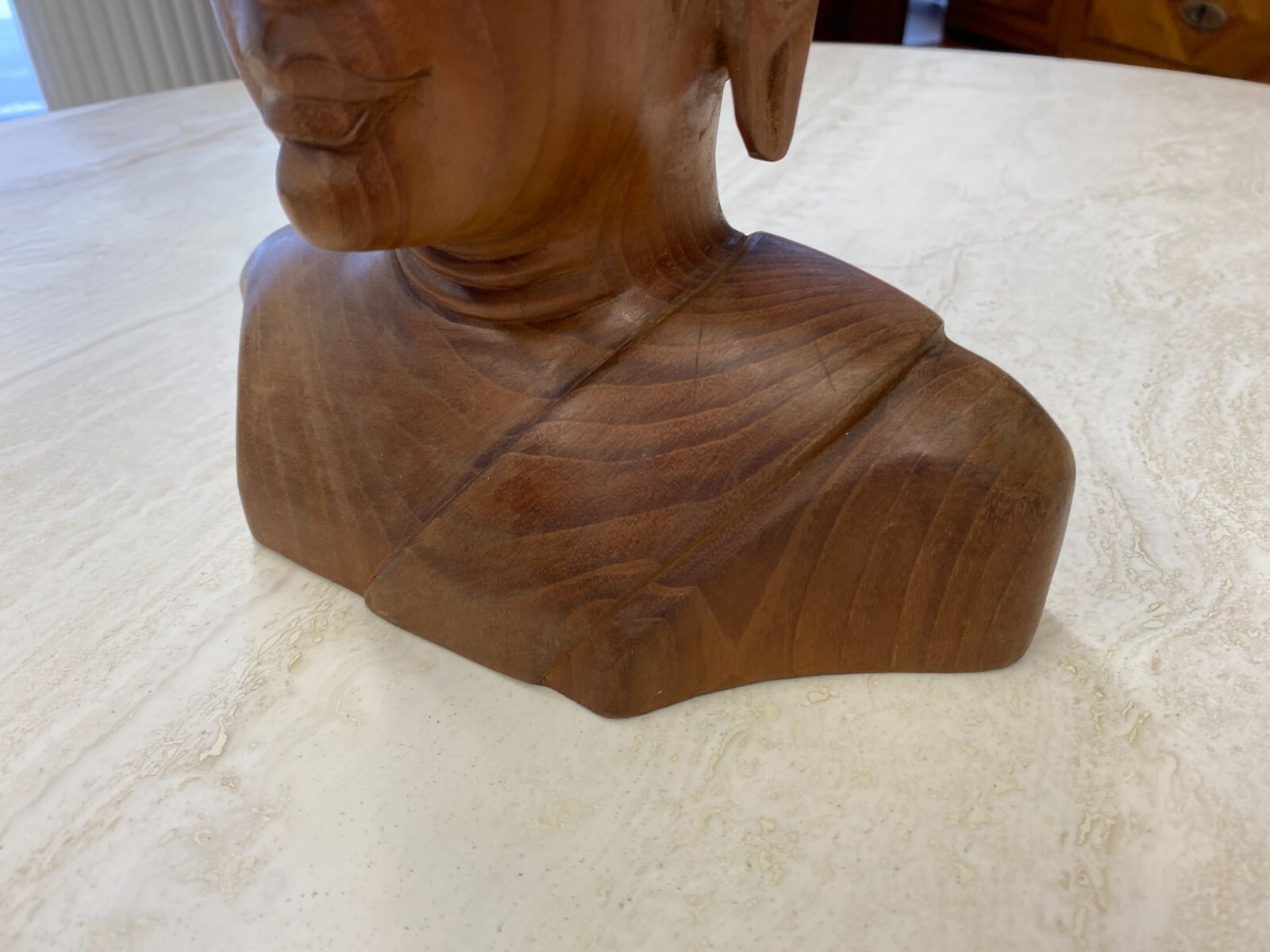 Asiatische Figur aus Holz, handgeschnitzt, 2-te Hälfte 20-tes Jhdt. Die Oberfläche ist leicht berieben, am Kopf wenige Teile bestoßen oder fehlend. Abmessungen BTH 19/10,5/34cm.