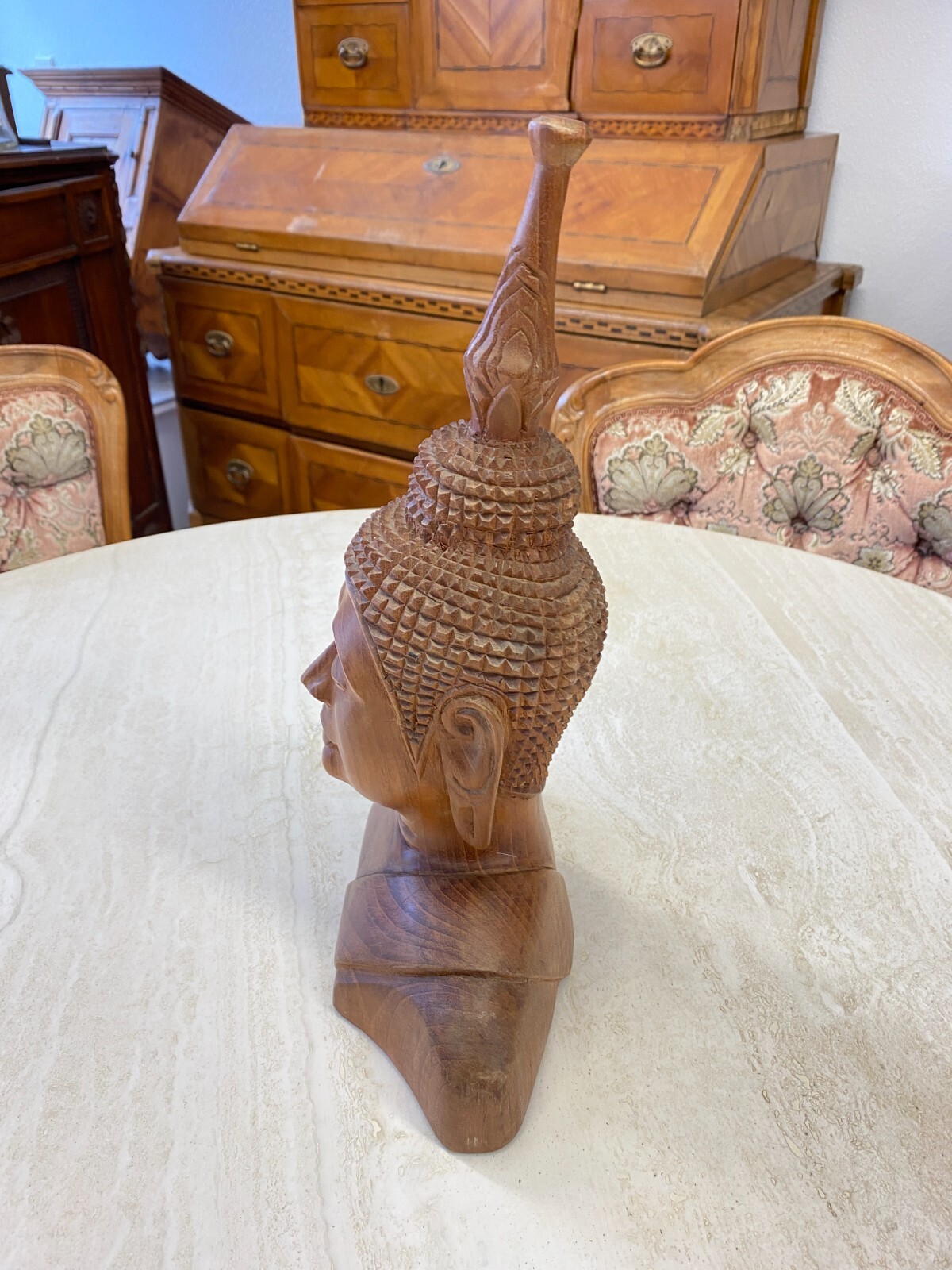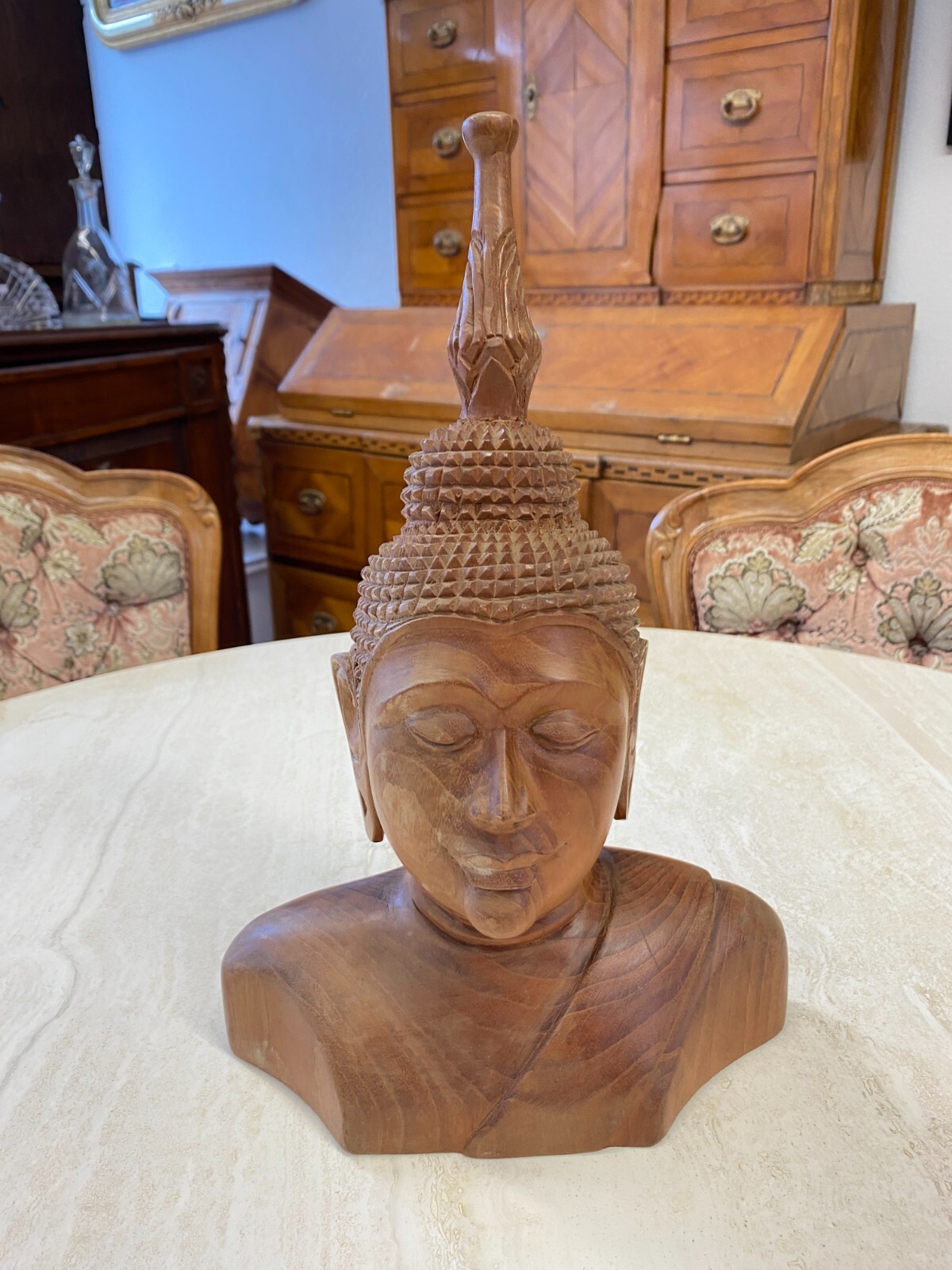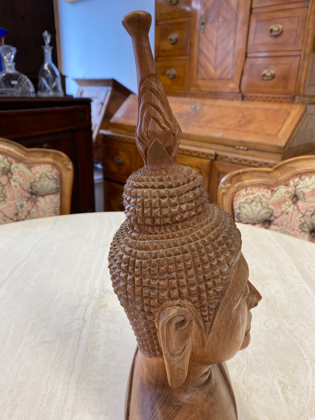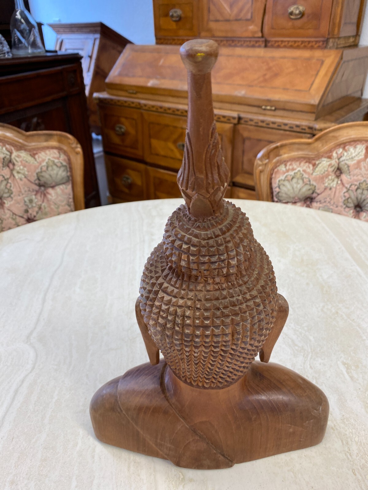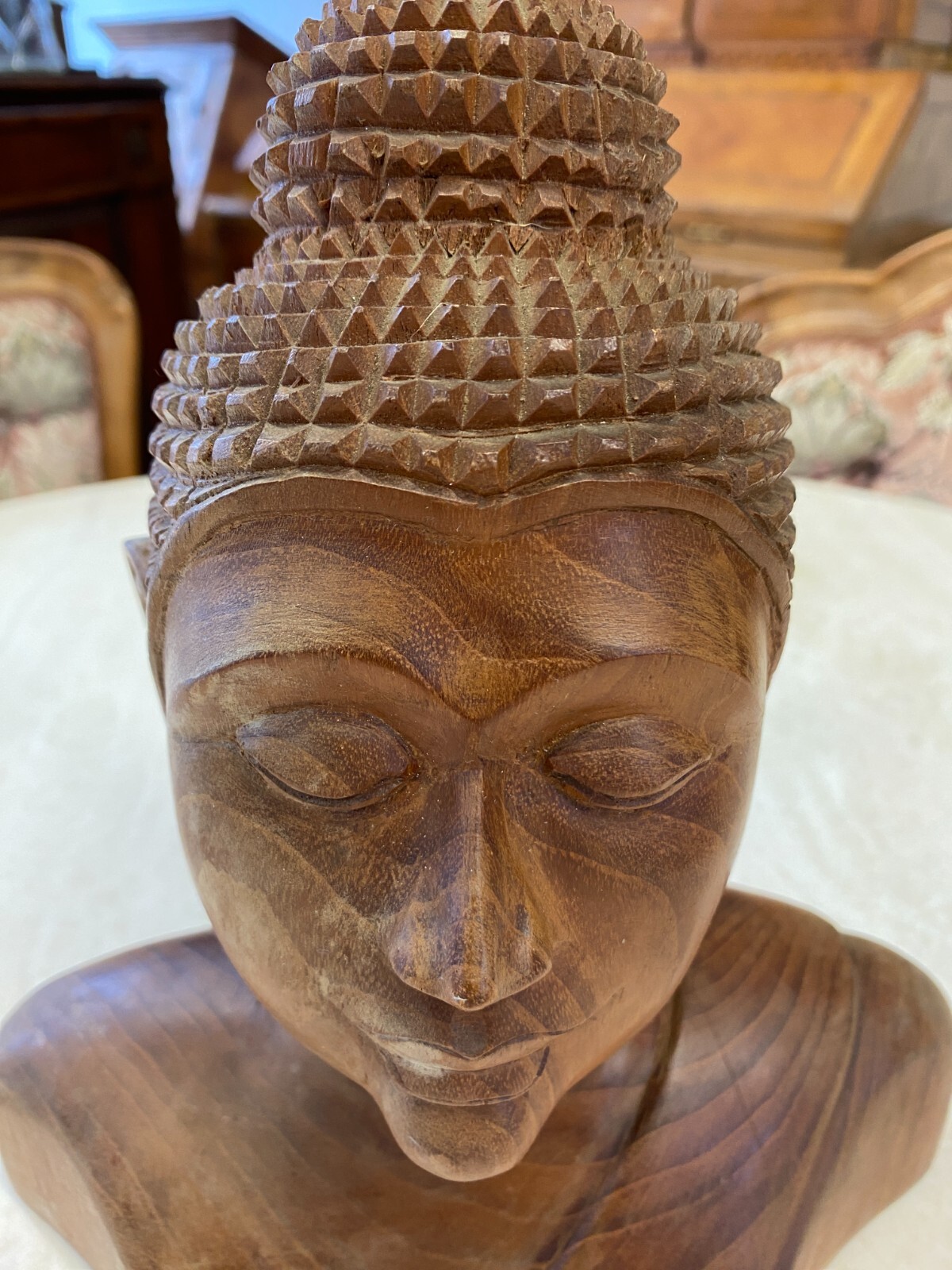 Asiatische Figur aus Holz, handgeschnitzt, 2-te Hälfte 20-tes Jhdt. Die Oberfläche ist leicht berieben, am Kopf wenige Teile bestoßen oder fehlend. Abmessungen BTH 19/10,5/34cm.