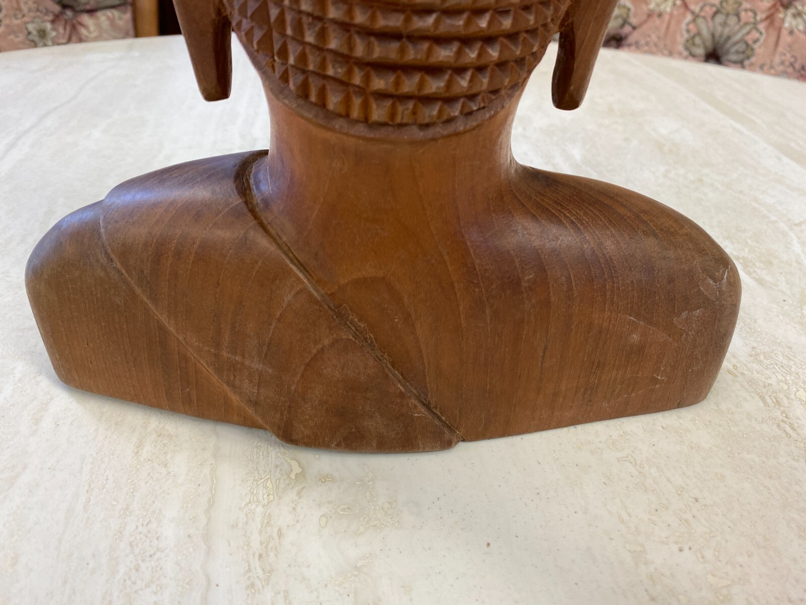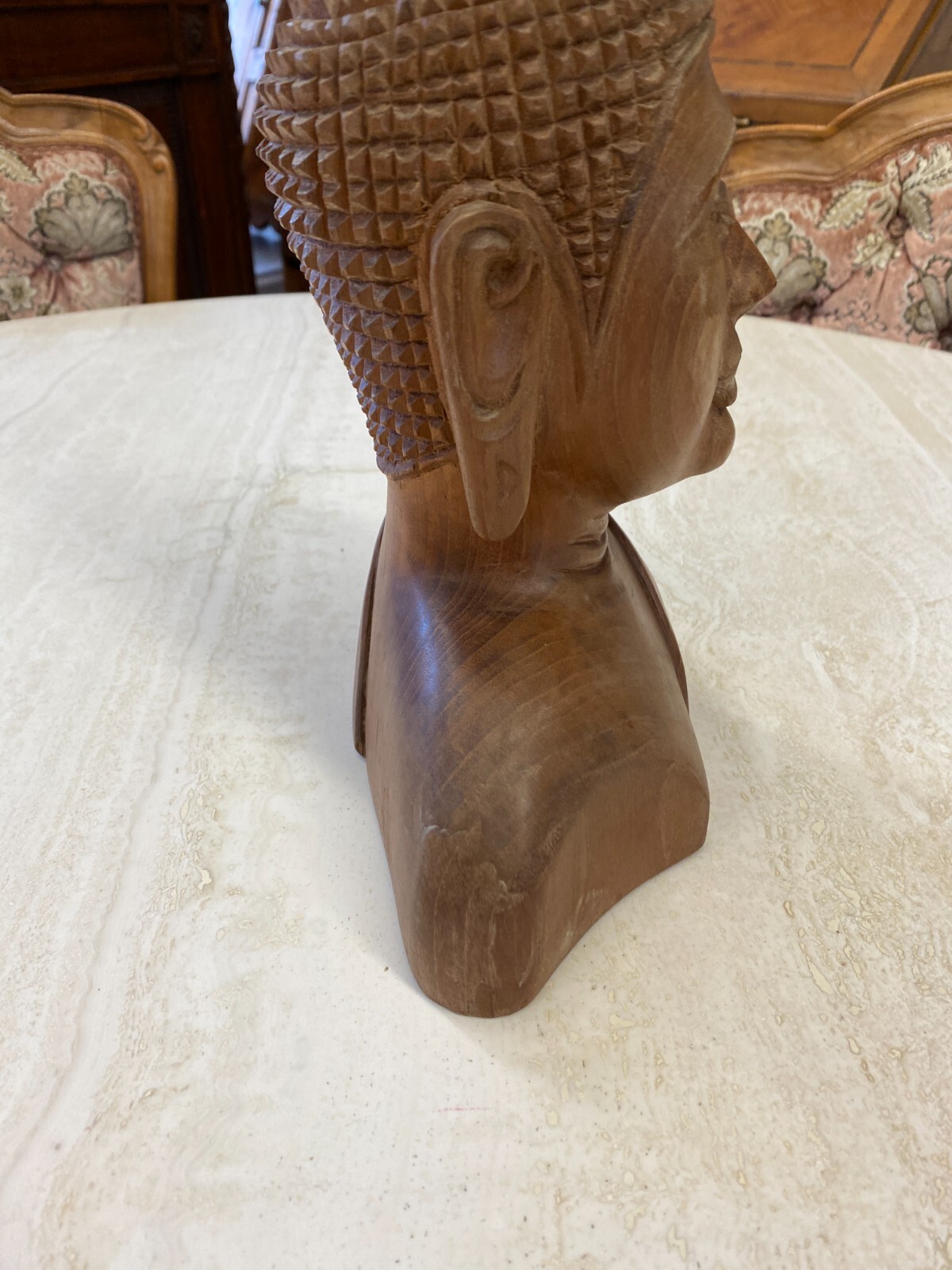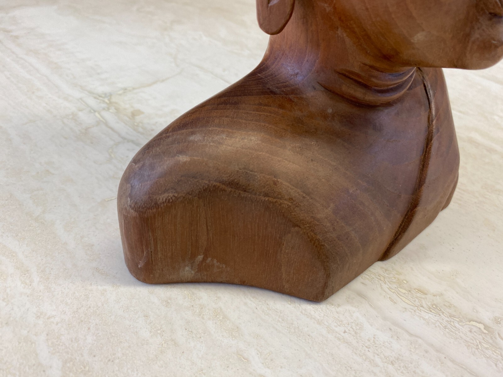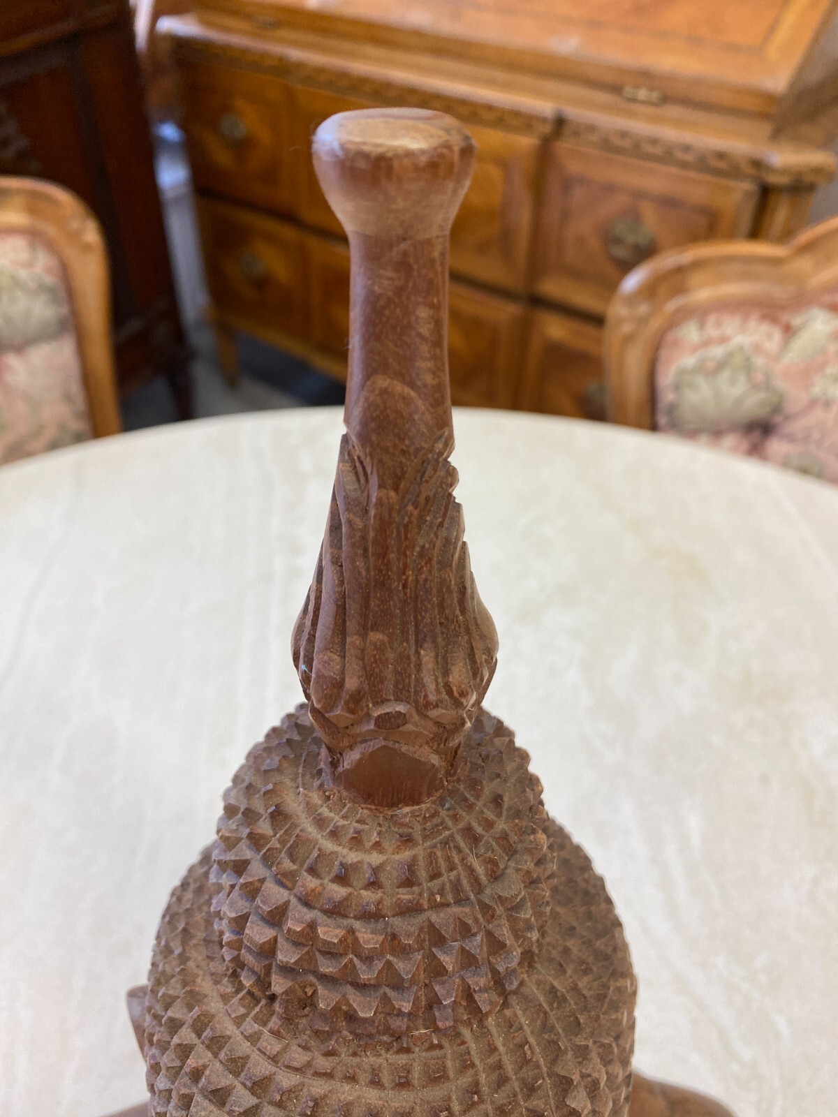 Asiatische Figur aus Holz, handgeschnitzt, 2-te Hälfte 20-tes Jhdt. Die Oberfläche ist leicht berieben, am Kopf wenige Teile bestoßen oder fehlend. Abmessungen BTH 19/10,5/34cm.