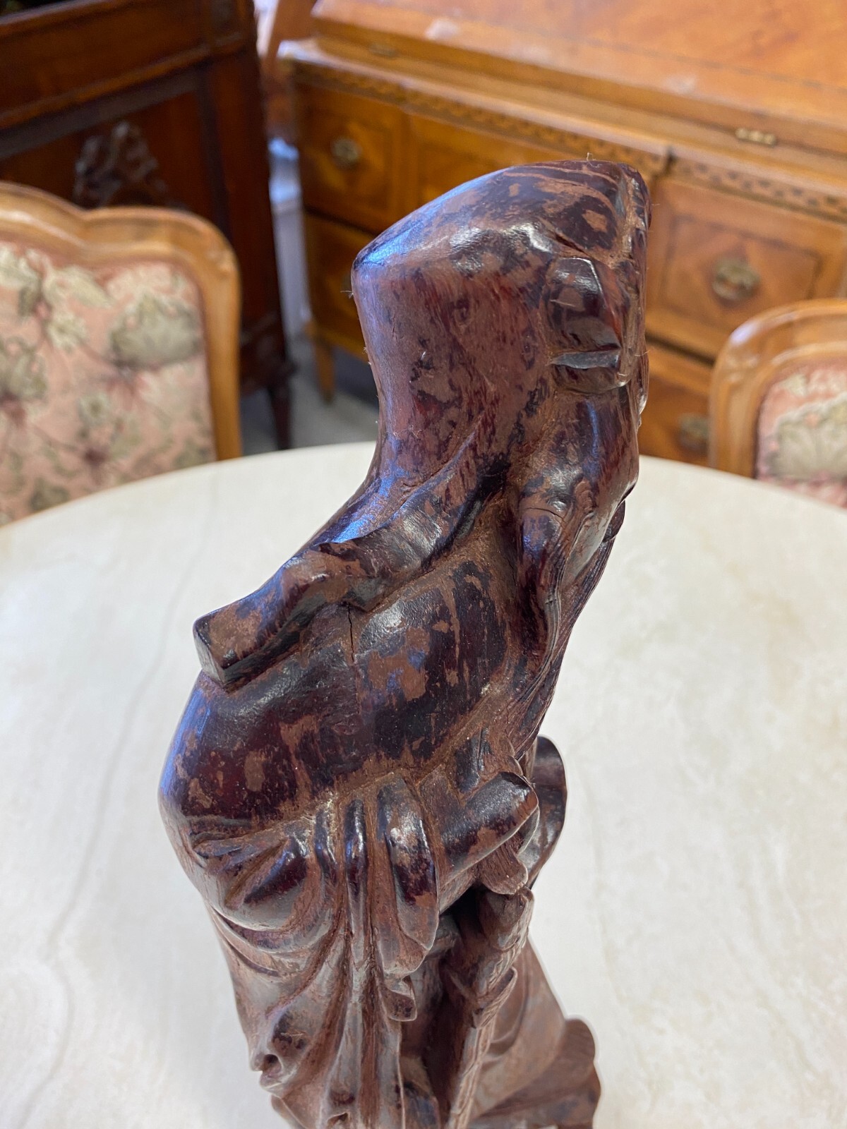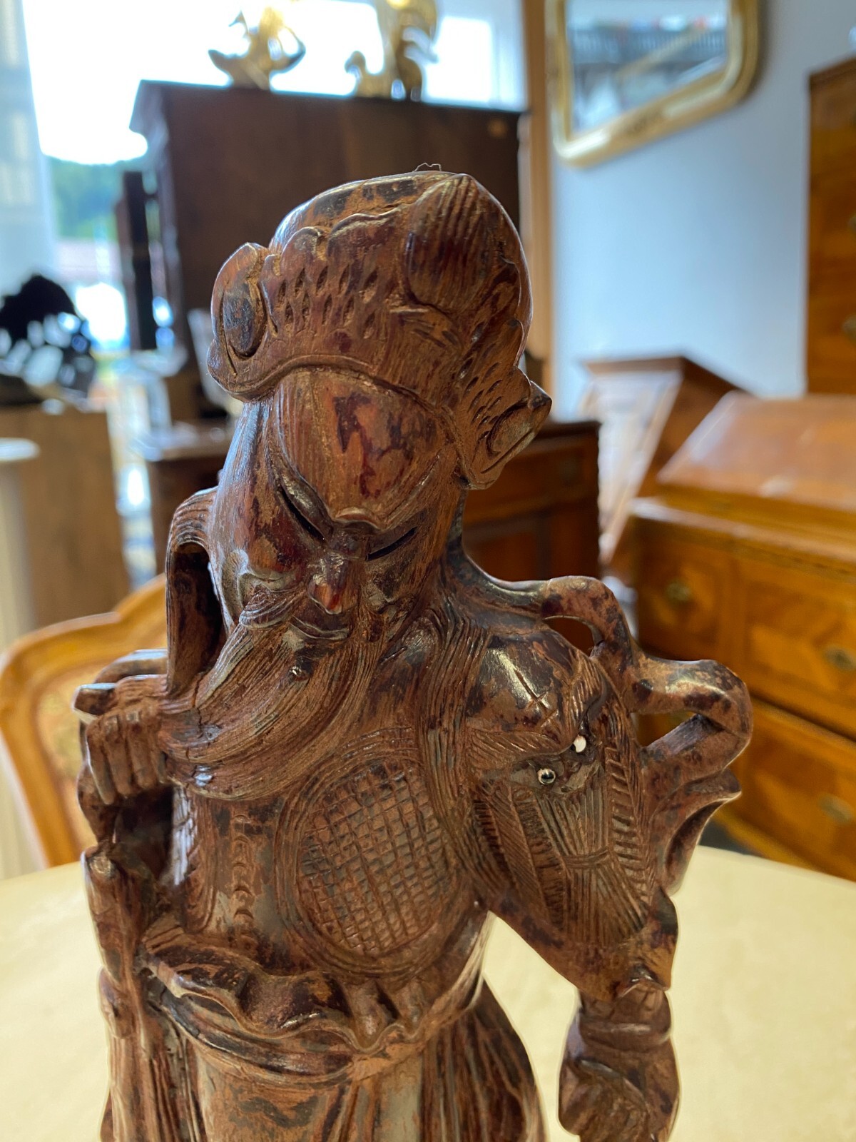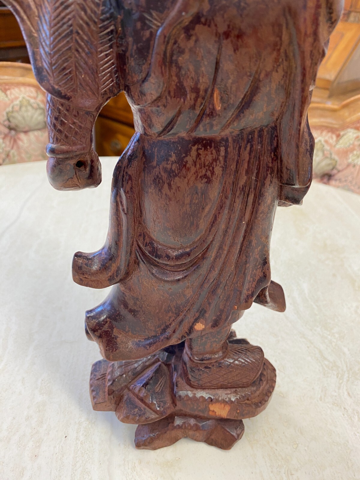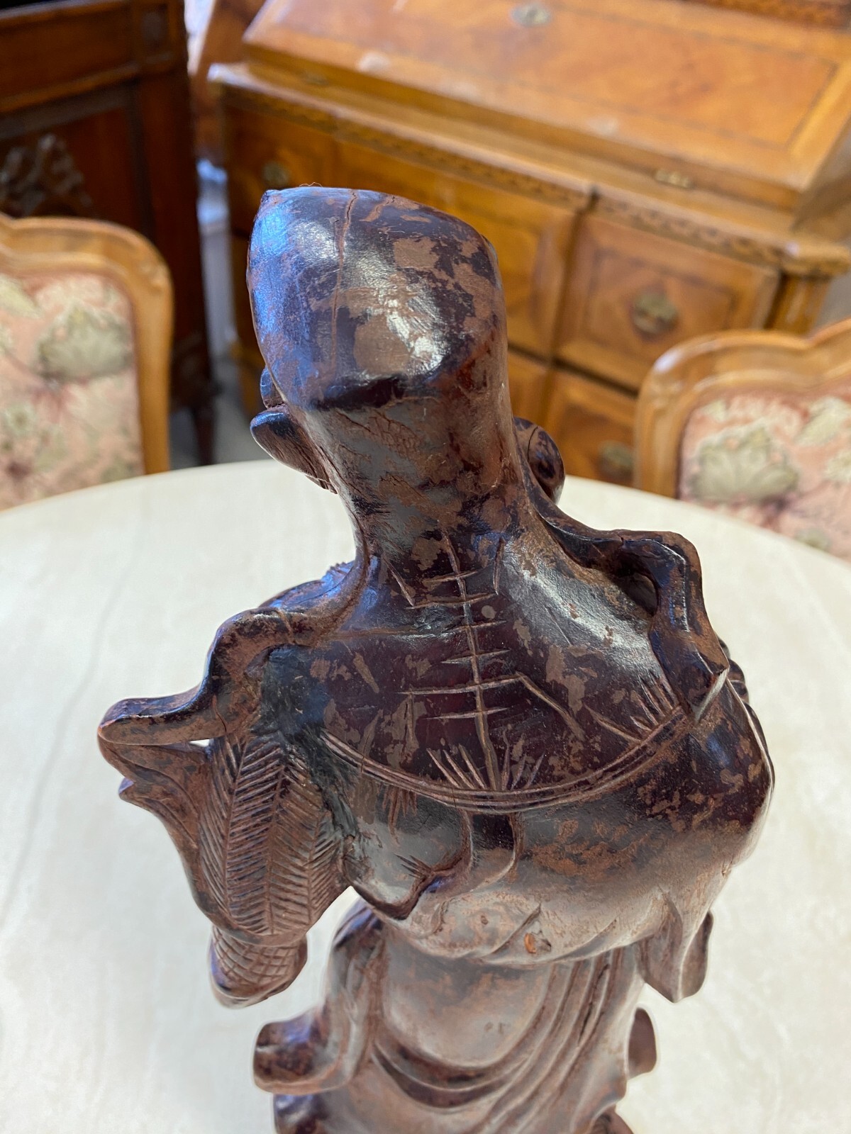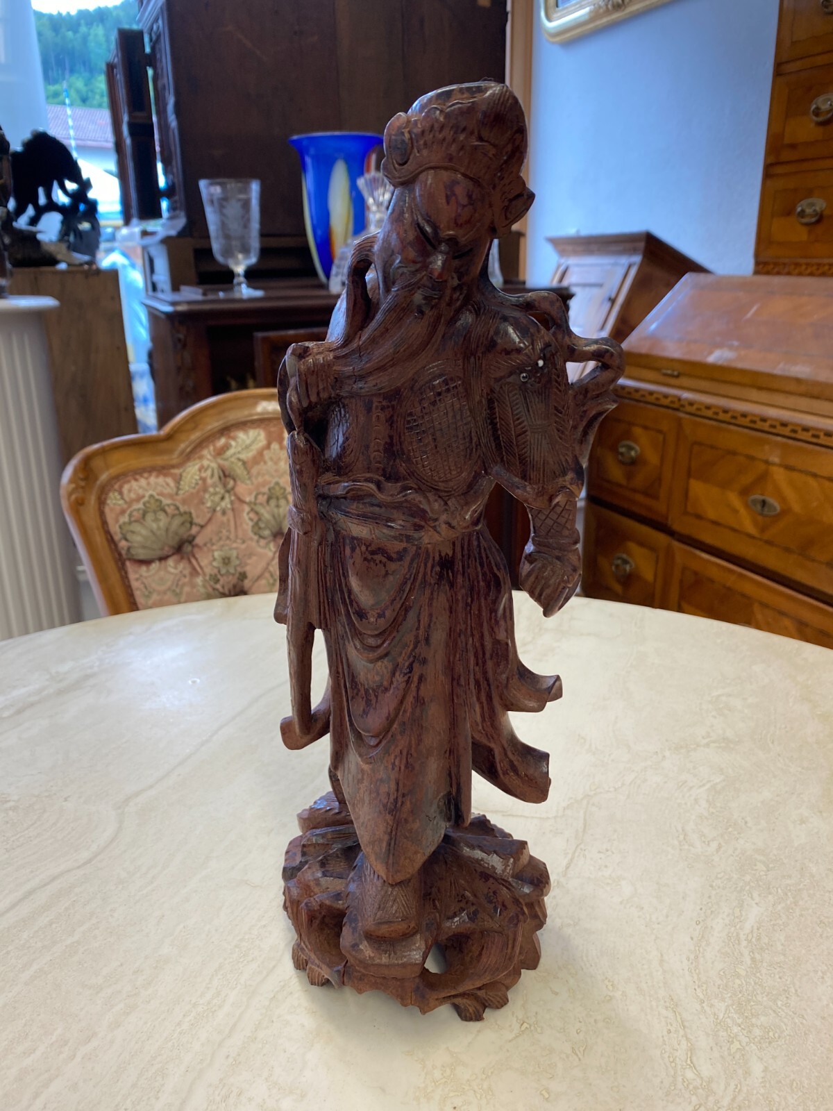 Asiatische Figur aus Holz, handgeschnitzt, genaues Alter unbekannt. Die Oberfläche ist ehemals gefasst und stark berieben, auf der Rückseite diverse Bestoßungen. In der Schulter sind Augen eingesetzt, div. Dehnungsrisse. Attribut in der Hand fehlend. Abmessungen BTH 11/10,5/36cm.