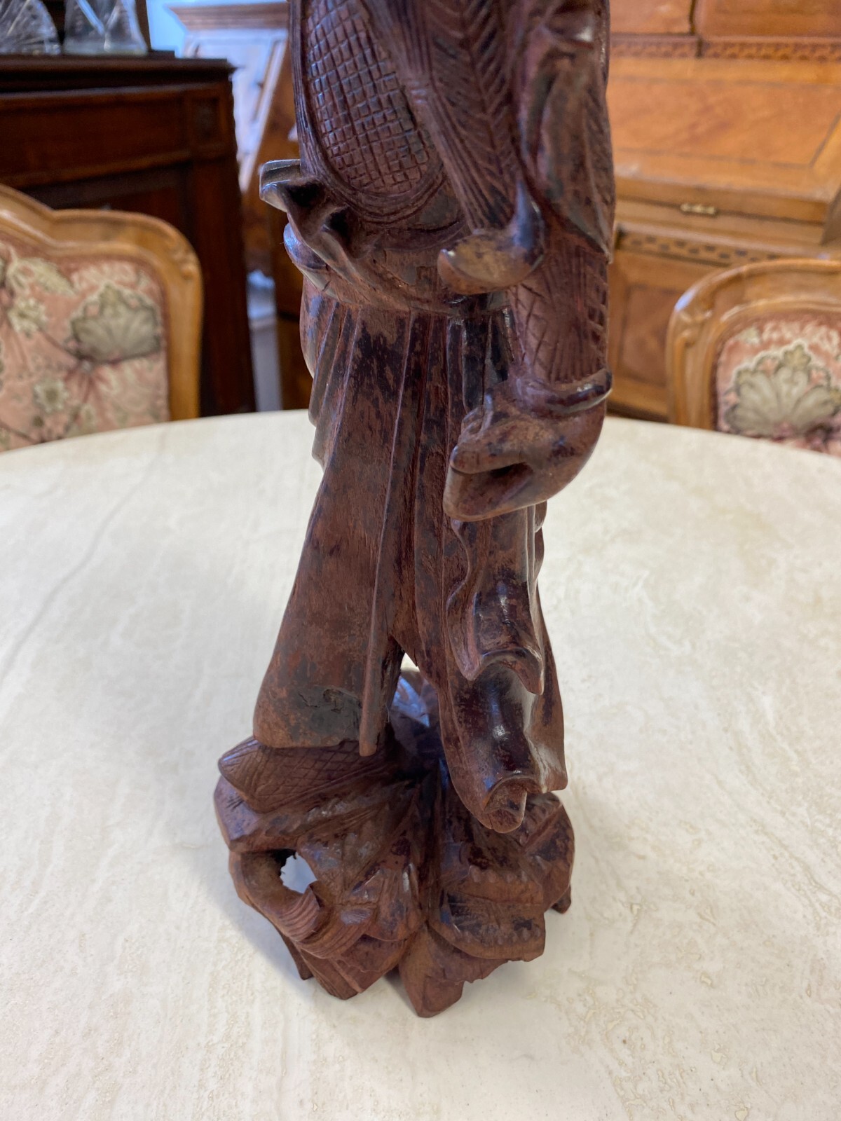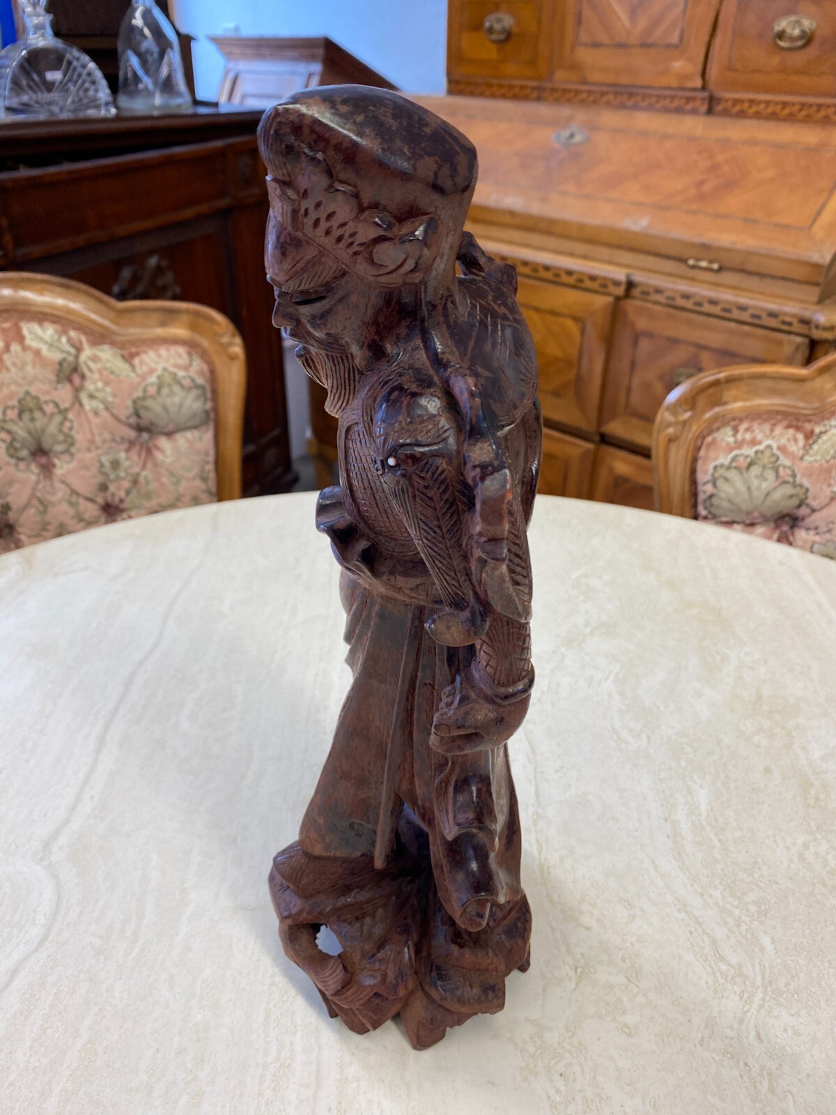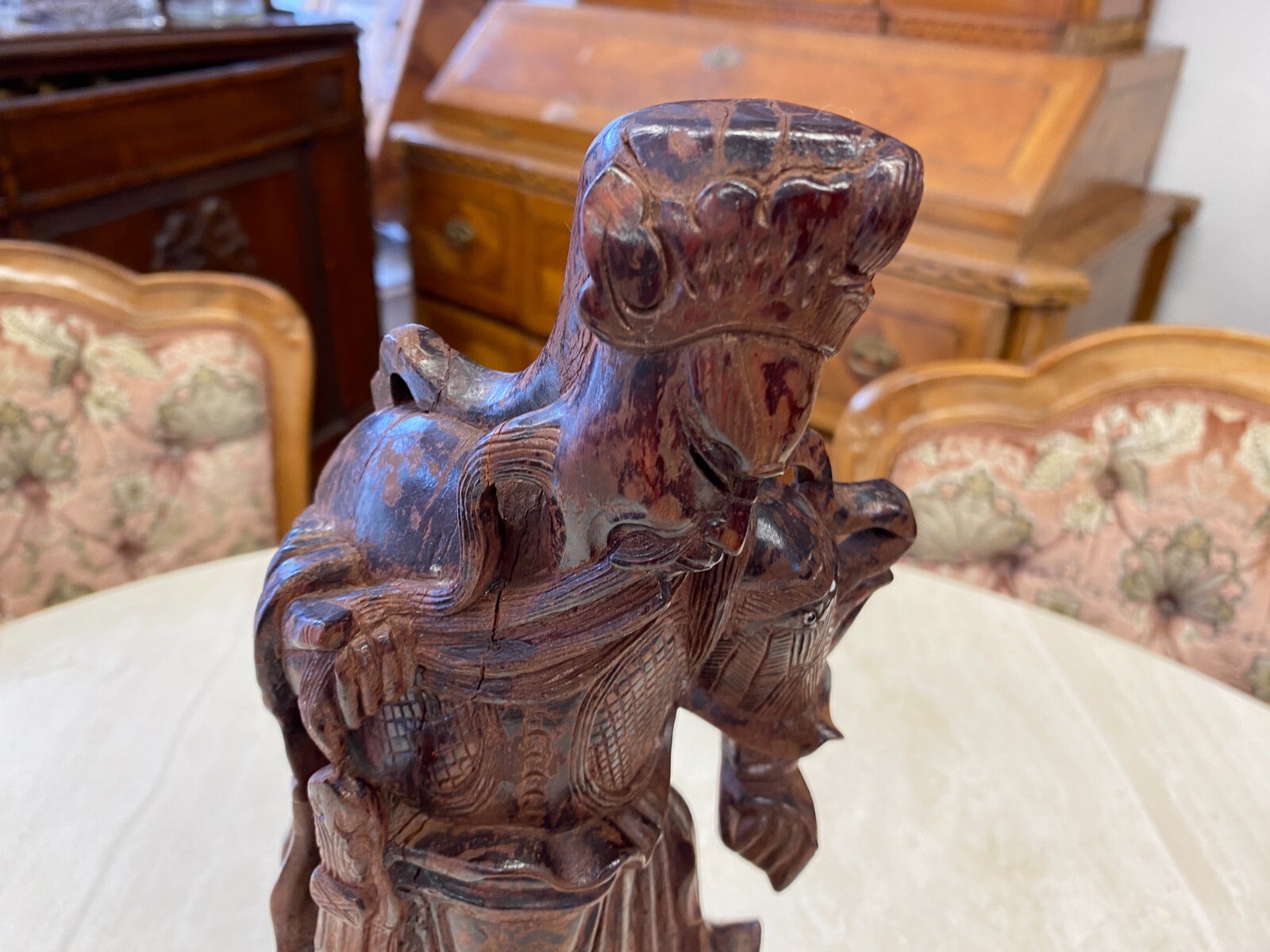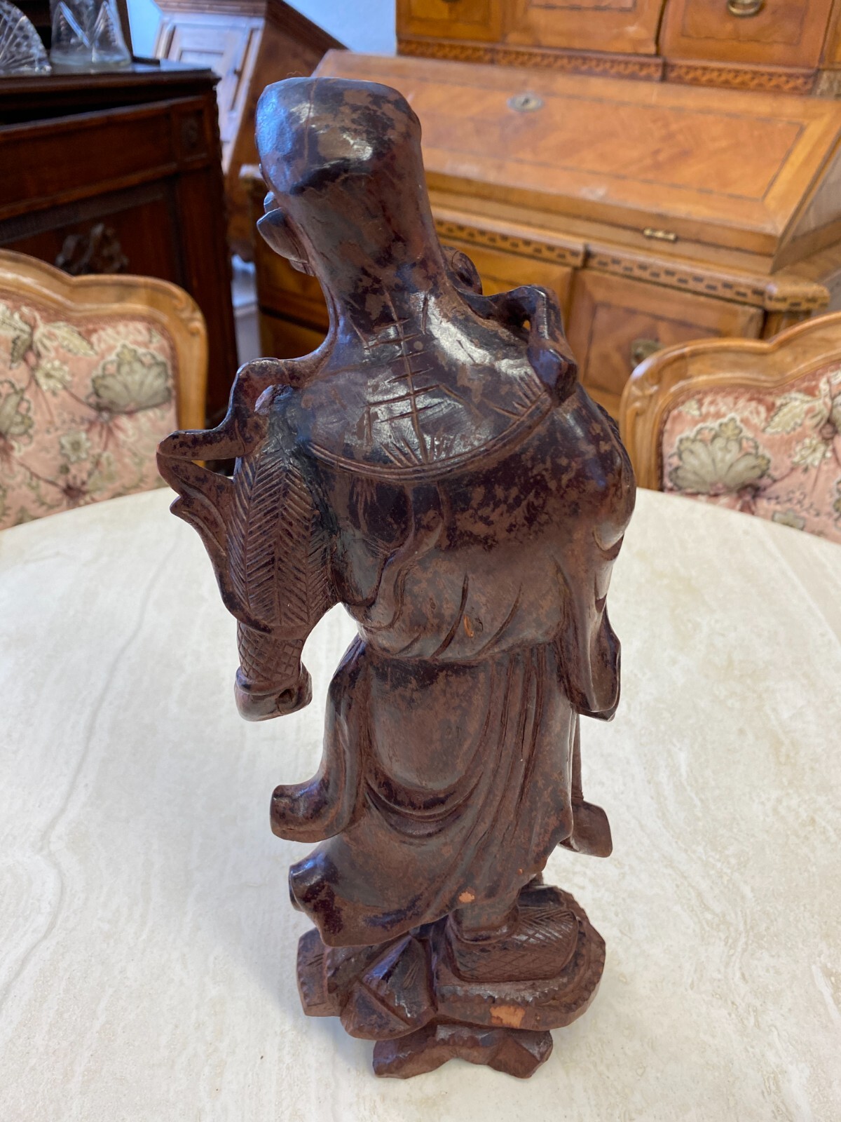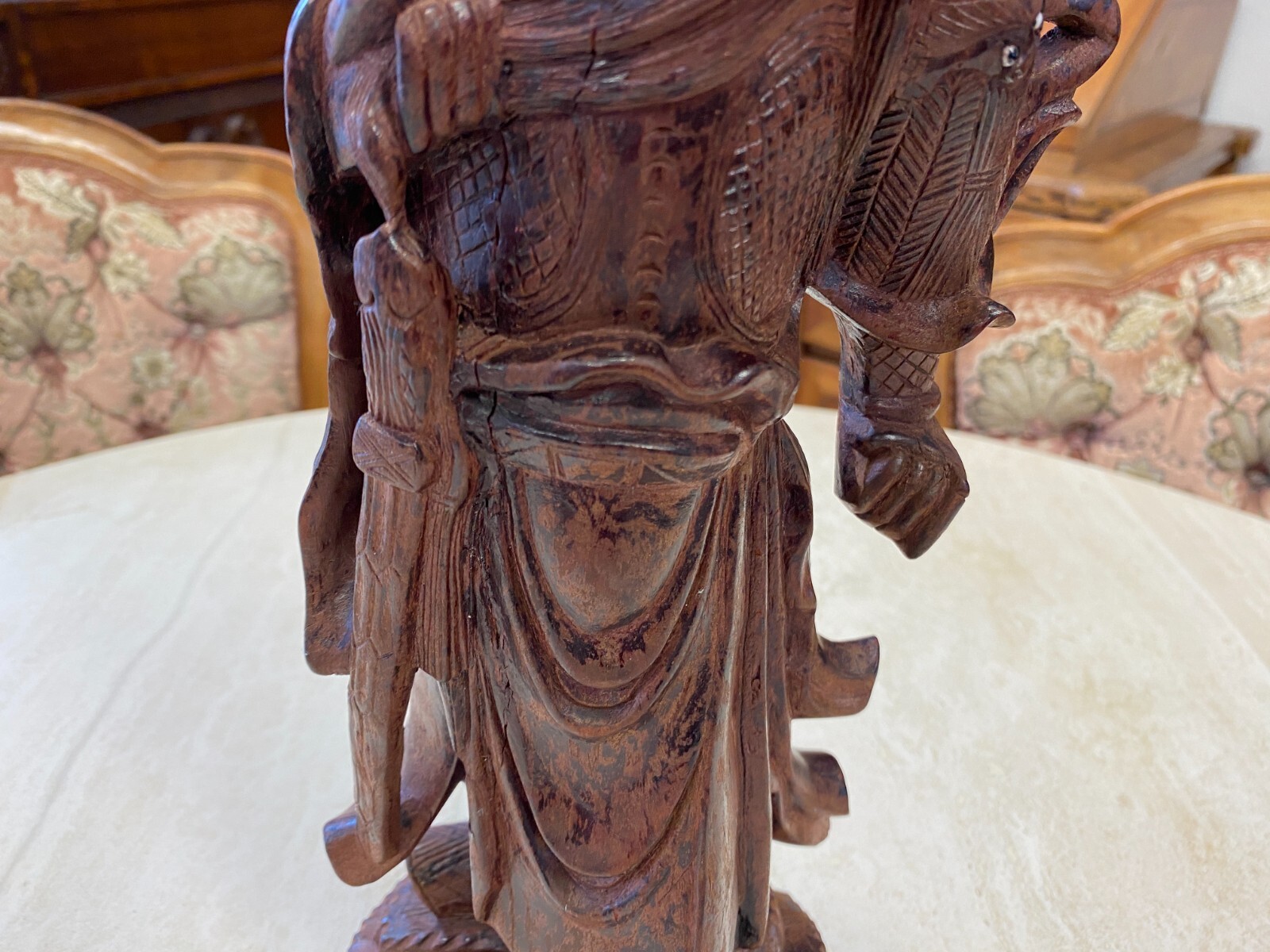 Asiatische Figur aus Holz, handgeschnitzt, genaues Alter unbekannt. Die Oberfläche ist ehemals gefasst und stark berieben, auf der Rückseite diverse Bestoßungen. In der Schulter sind Augen eingesetzt, div. Dehnungsrisse. Attribut in der Hand fehlend. Abmessungen BTH 11/10,5/36cm.