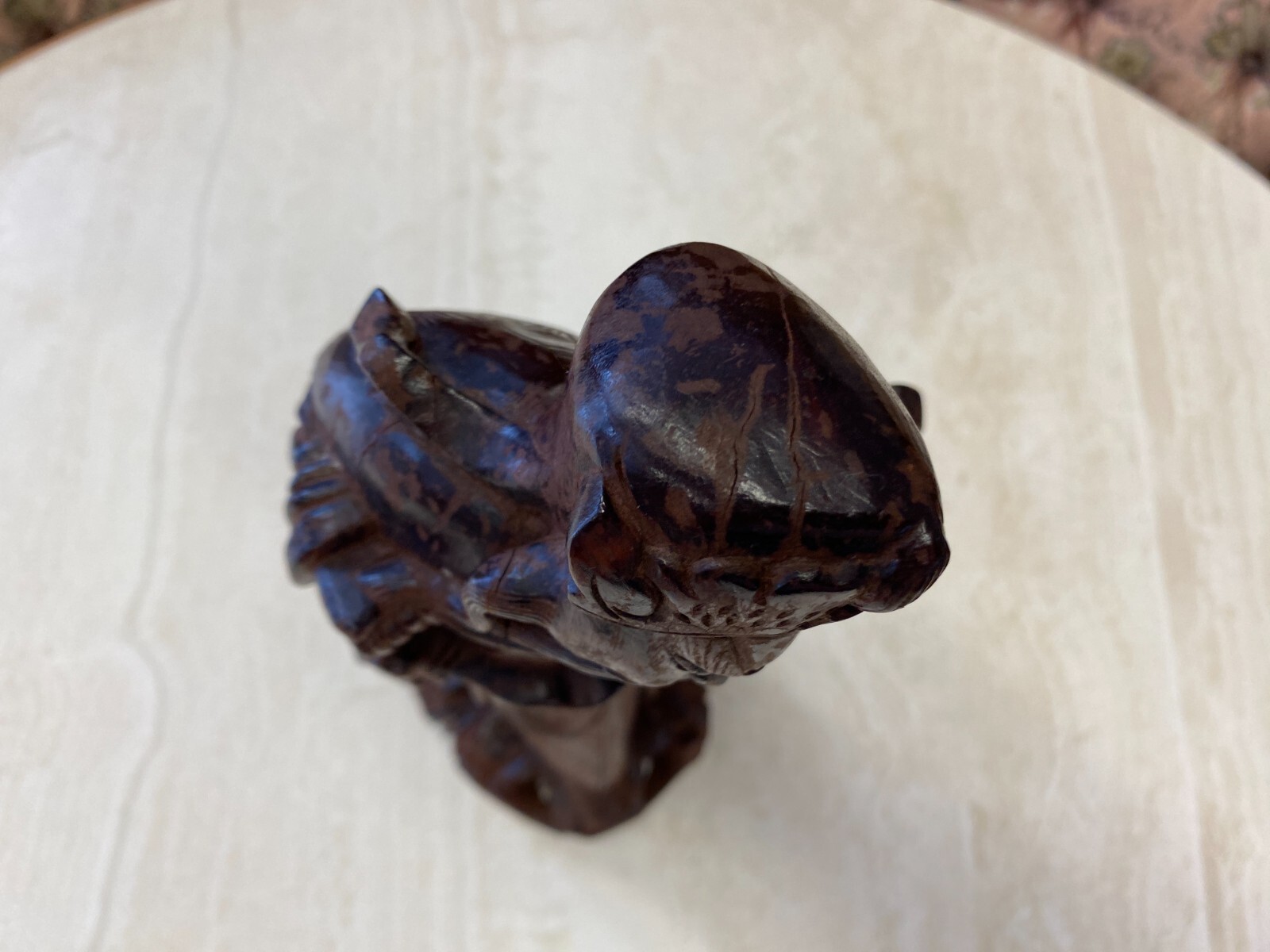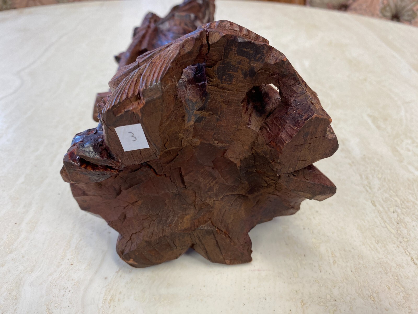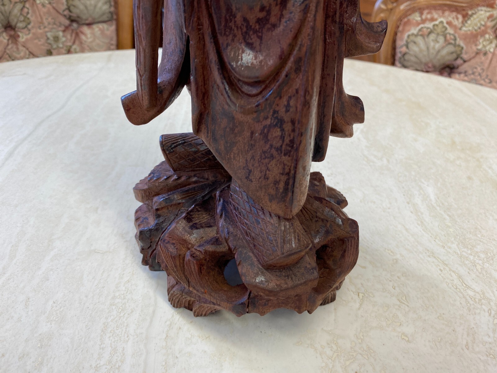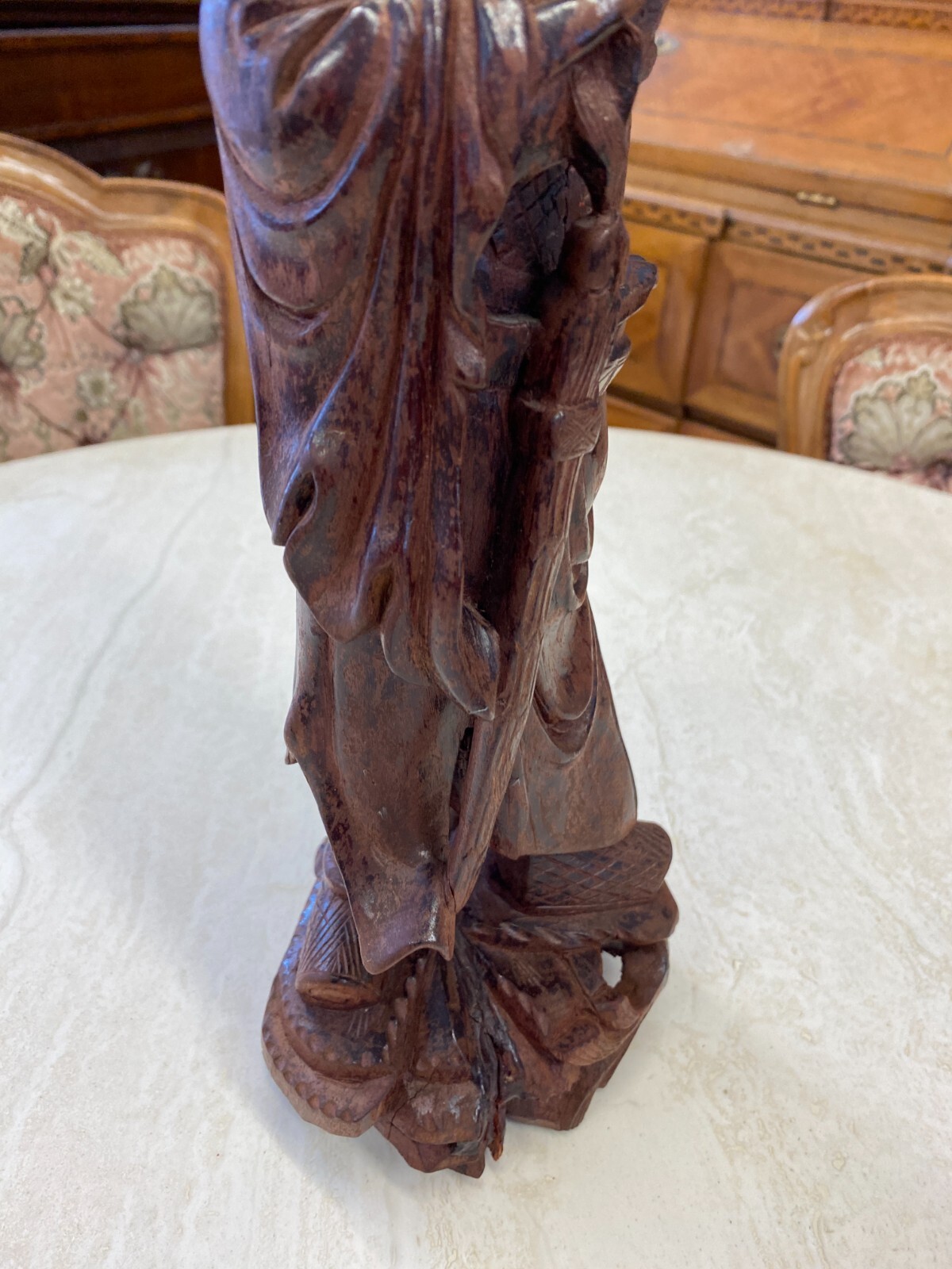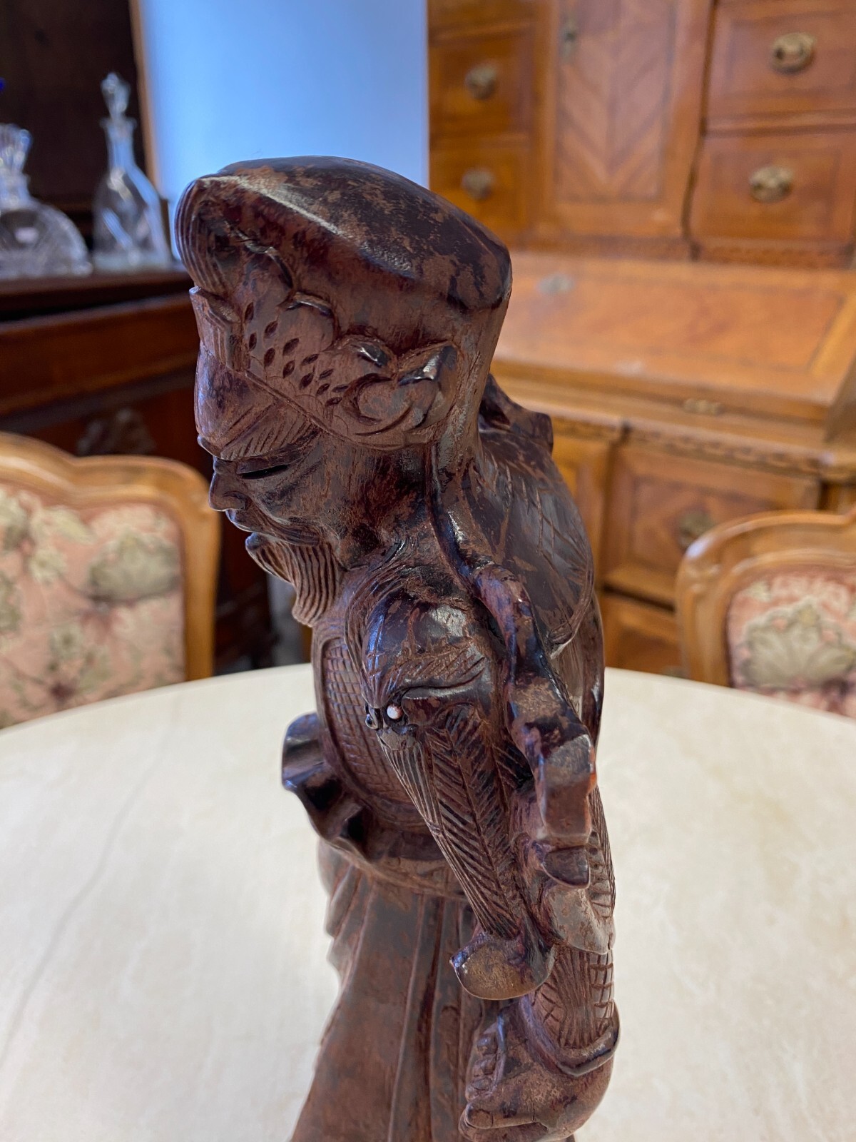 Asiatische Figur aus Holz, handgeschnitzt, genaues Alter unbekannt. Die Oberfläche ist ehemals gefasst und stark berieben, auf der Rückseite diverse Bestoßungen. In der Schulter sind Augen eingesetzt, div. Dehnungsrisse. Attribut in der Hand fehlend. Abmessungen BTH 11/10,5/36cm.