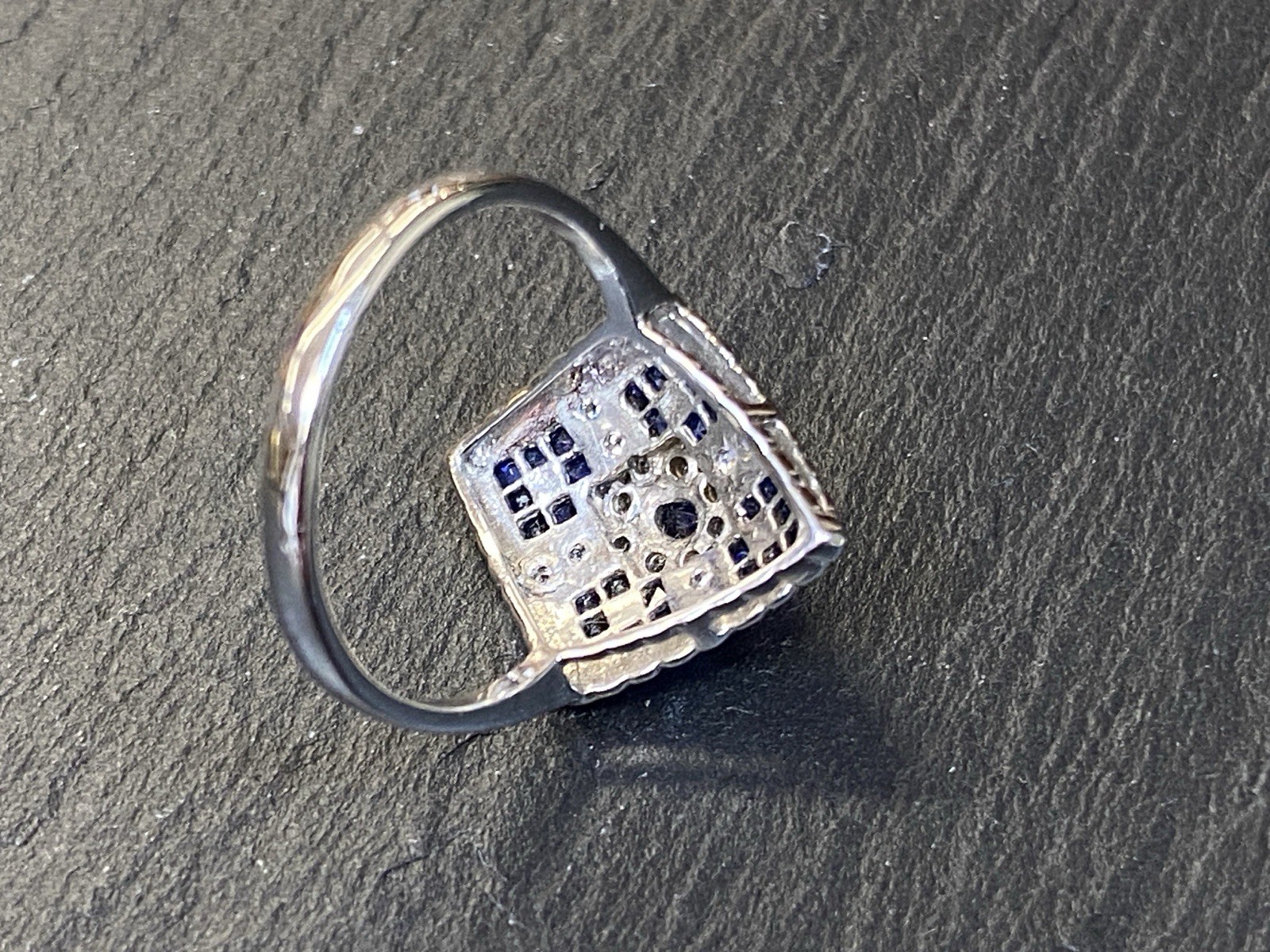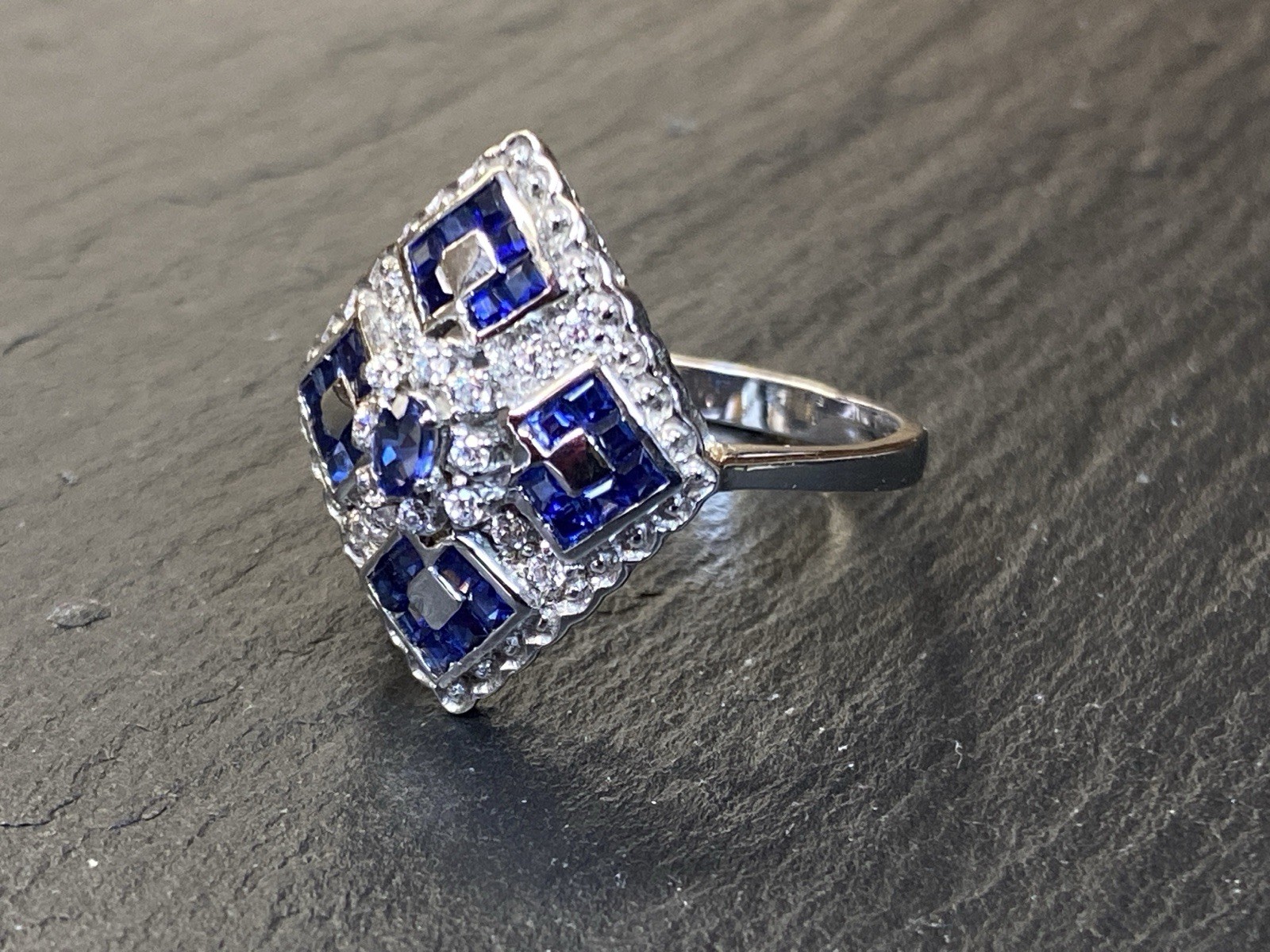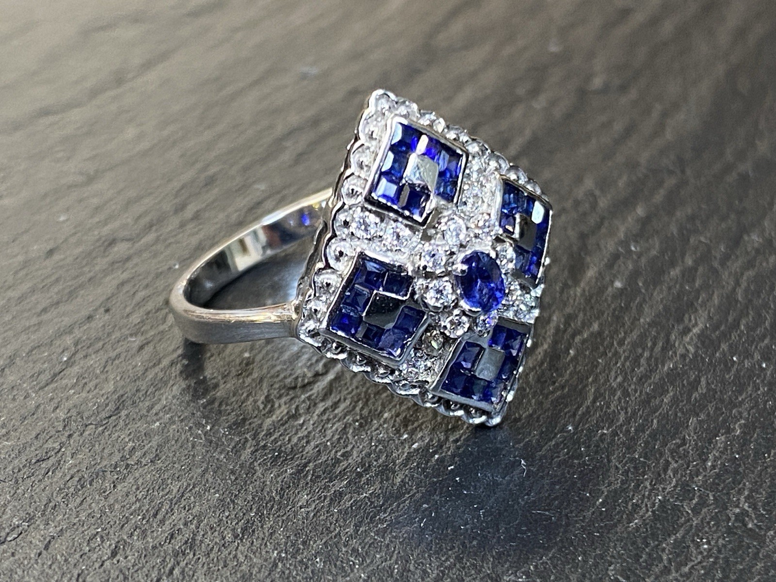 Ein auffälliger Ring im Art-Deco Stil angefertigt mit rautenförmig angeordneten Saphiren von zus. ca. 0,4 ct. Ergänzt werden diese wohl durch Zirkone. Ringgröße 56/57, Gesamtgewicht ca. 3,39 g. H x B ca. 1,9 x 1,6 cm. Alle Angaben soweit Sie in der Fassung messbar sind. Die Lieferung erfolgt mit personalisierter Rechnung, ohne Zertifikat.