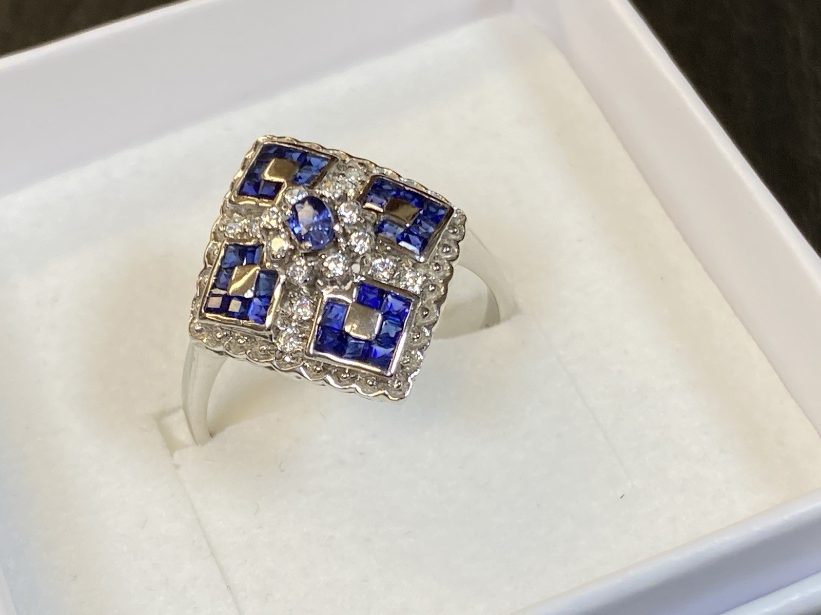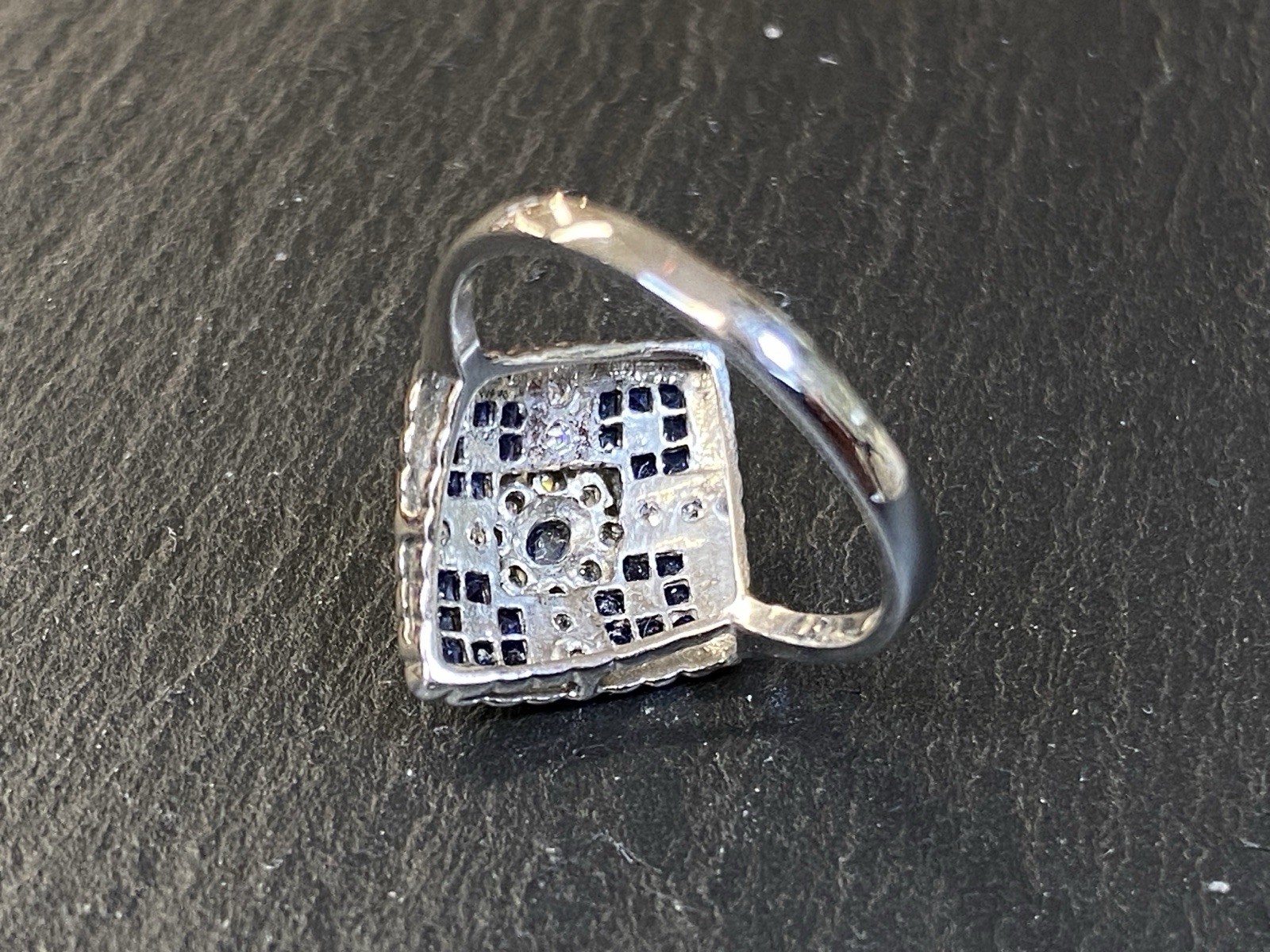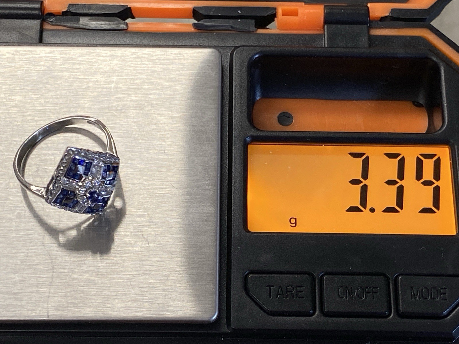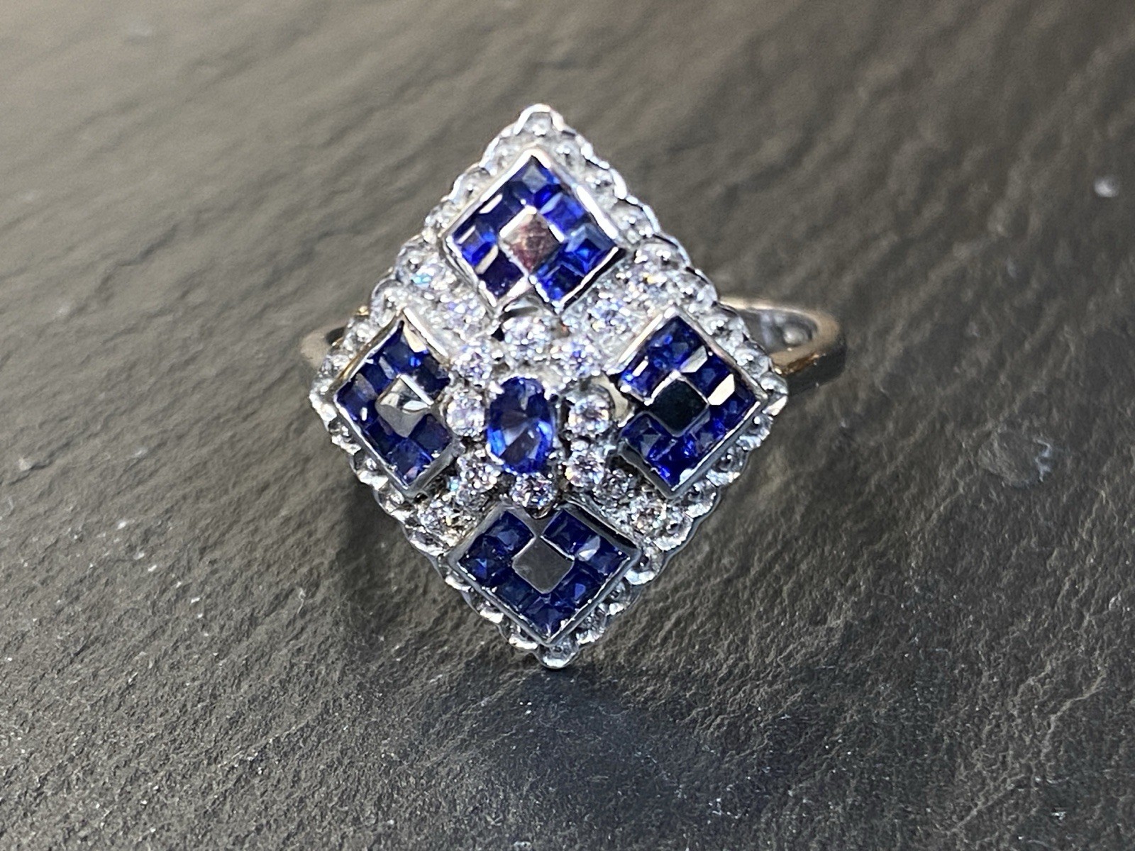 Ein auffälliger Ring im Art-Deco Stil angefertigt mit rautenförmig angeordneten Saphiren von zus. ca. 0,4 ct. Ergänzt werden diese wohl durch Zirkone. Ringgröße 56/57, Gesamtgewicht ca. 3,39 g. H x B ca. 1,9 x 1,6 cm. Alle Angaben soweit Sie in der Fassung messbar sind. Die Lieferung erfolgt mit personalisierter Rechnung, ohne Zertifikat.