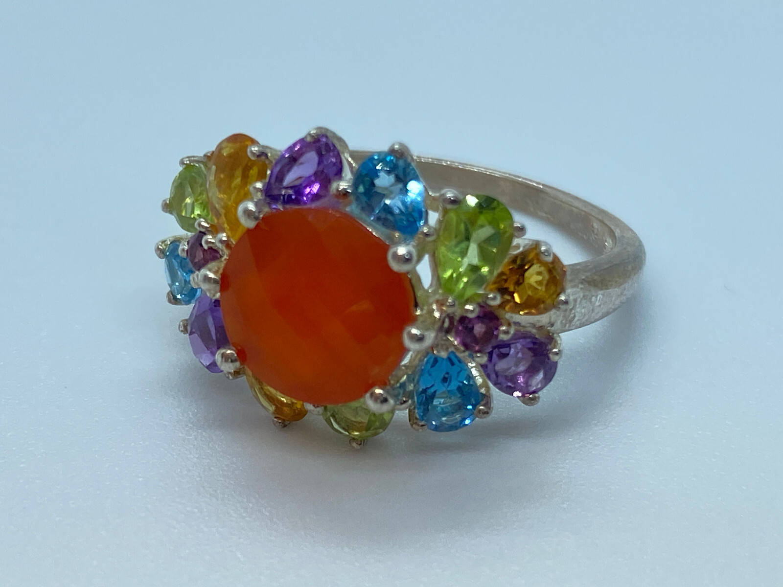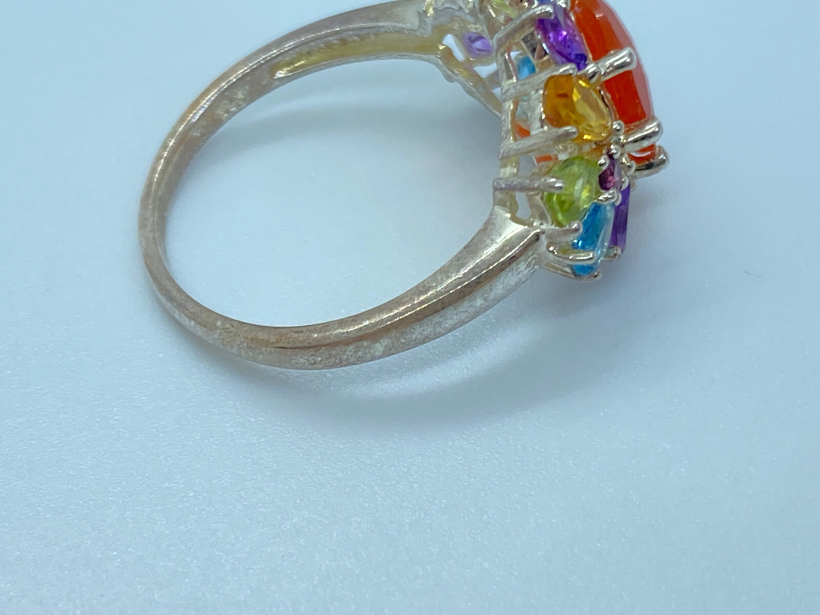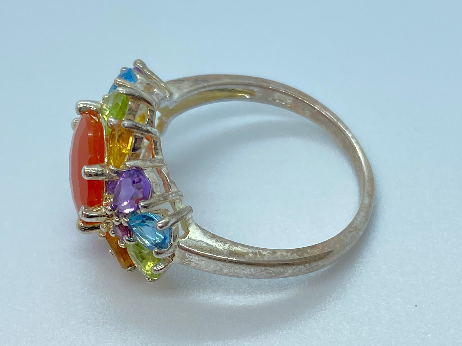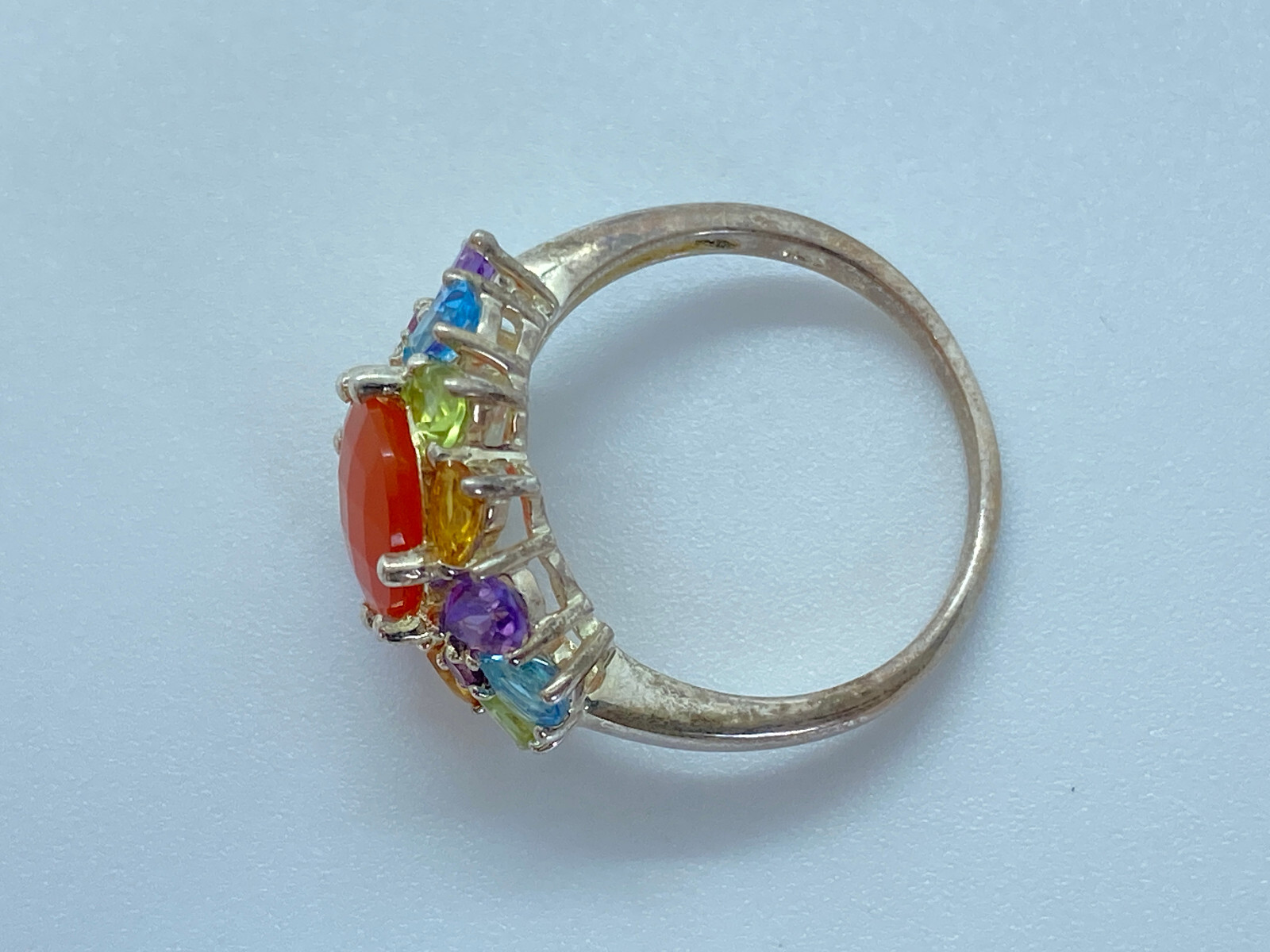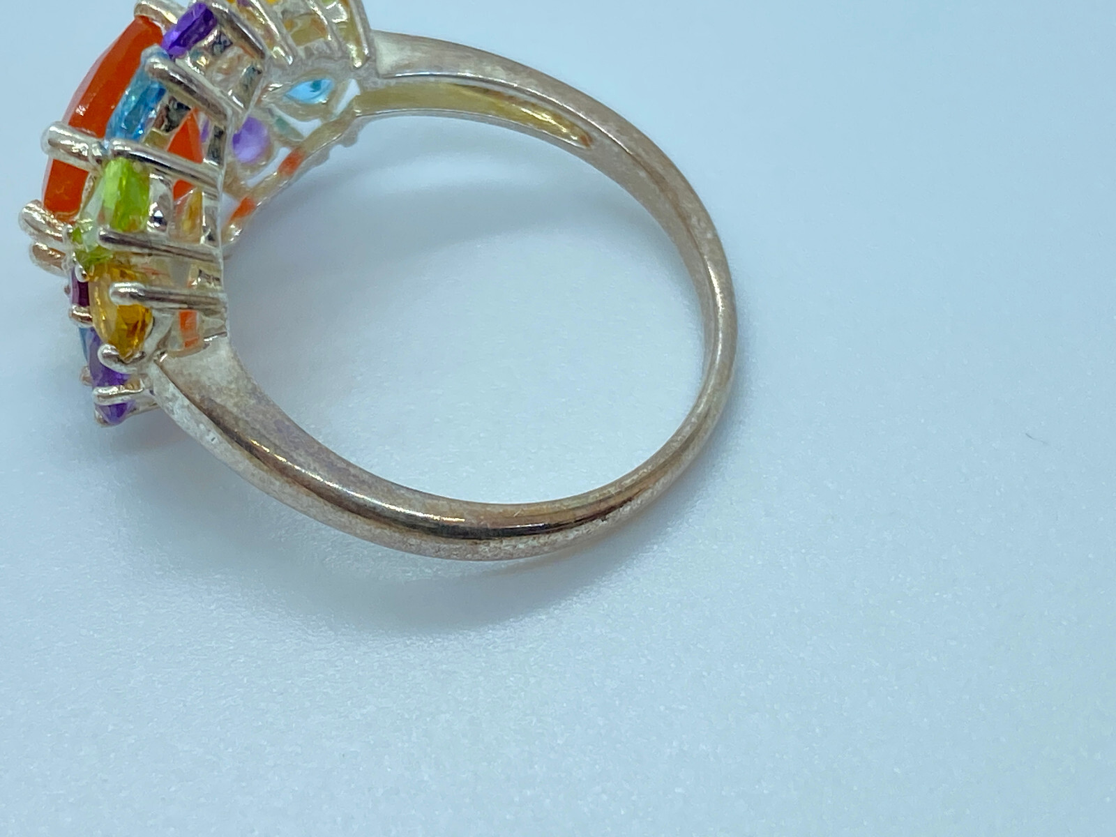 Farbenfroher Ring aus 925 Sterling Silber, gestempelt, ebenfalls mit wahrscheinlich einer 9 gestempelt. Besetzt ist der Ring zentral mit einem undursichtigen Feueropal von ca. 2,13ct., soweit in der Fassung messbar. Begleitet wird dieser von Amethysten (ca. 0,3ct.), Citrinen (ca. 0,3ct.), rosa (ca. 0,04ct.) – und grünfarbenen Turmalinen (ca. 0,4ct.) und blauen Spinellen (ca. 0,4ct.). Alle Angaben soweit sie in den Fassungen messbar waren. Die Oberfläche ist berieben, Ringgröße 59. BTH Mittelstück 2/0,7/1,4cm, B/H Ringschiene 0,2/0,1cm, Gesamtgewicht ca. 4,21g.