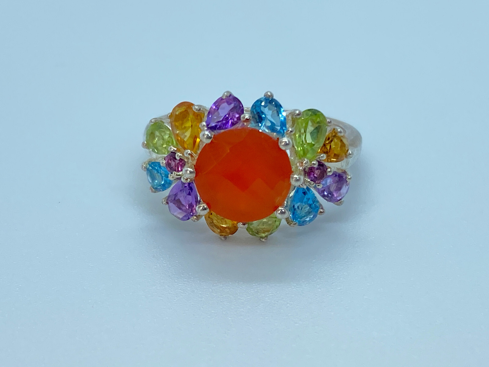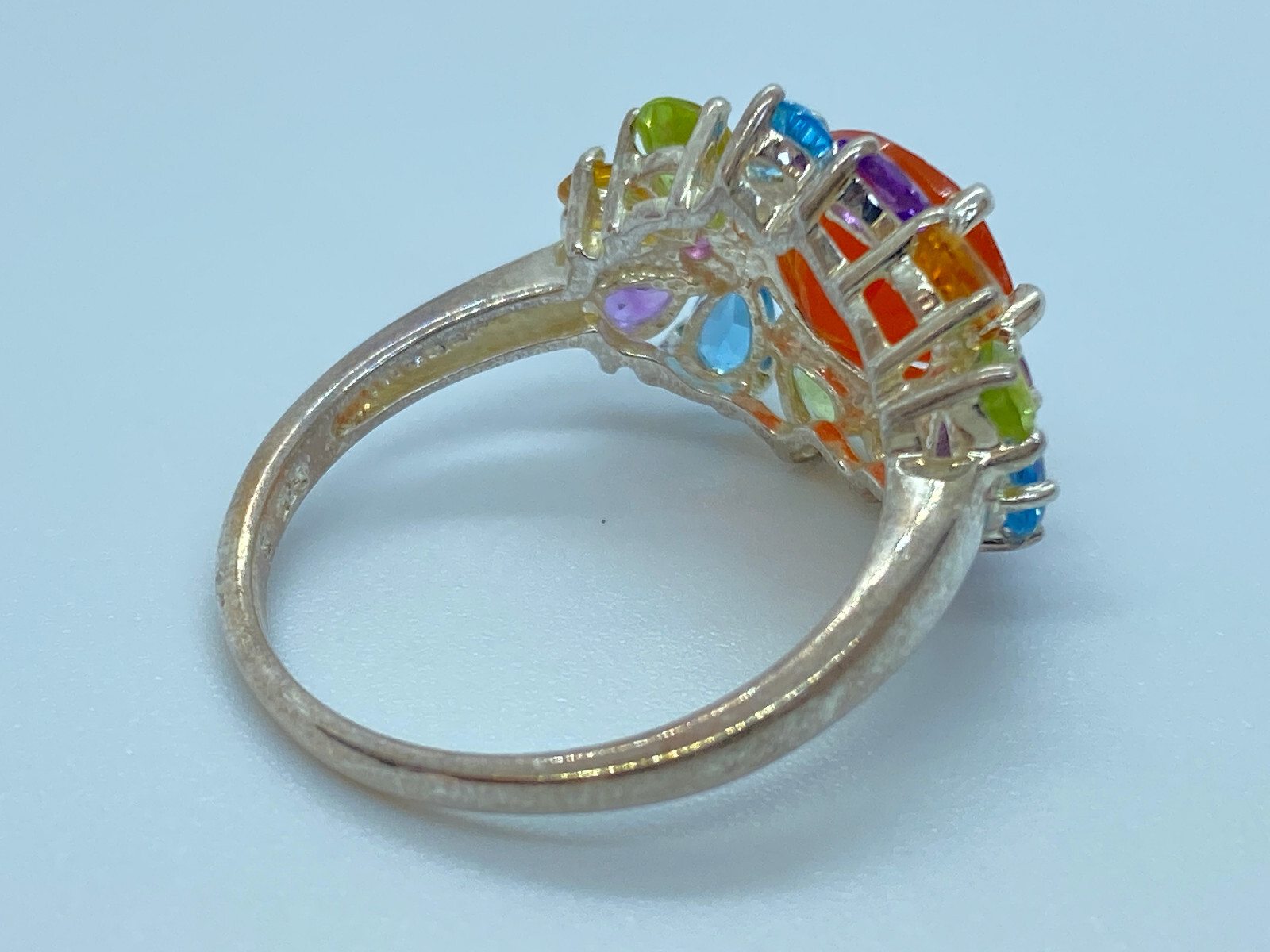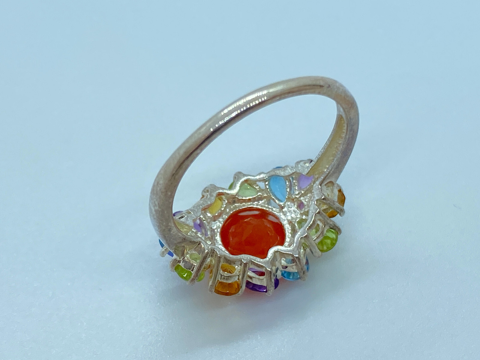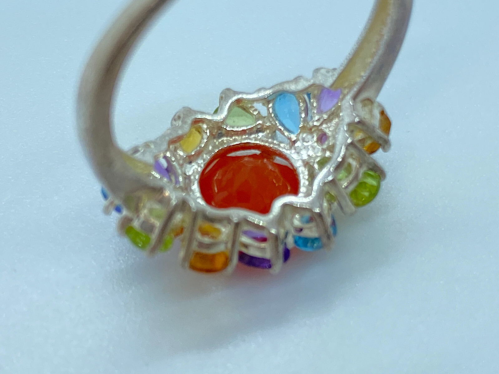 Farbenfroher Ring aus 925 Sterling Silber, gestempelt, ebenfalls mit wahrscheinlich einer 9 gestempelt. Besetzt ist der Ring zentral mit einem undursichtigen Feueropal von ca. 2,13ct., soweit in der Fassung messbar. Begleitet wird dieser von Amethysten (ca. 0,3ct.), Citrinen (ca. 0,3ct.), rosa (ca. 0,04ct.) – und grünfarbenen Turmalinen (ca. 0,4ct.) und blauen Spinellen (ca. 0,4ct.). Alle Angaben soweit sie in den Fassungen messbar waren. Die Oberfläche ist berieben, Ringgröße 59. BTH Mittelstück 2/0,7/1,4cm, B/H Ringschiene 0,2/0,1cm, Gesamtgewicht ca. 4,21g.