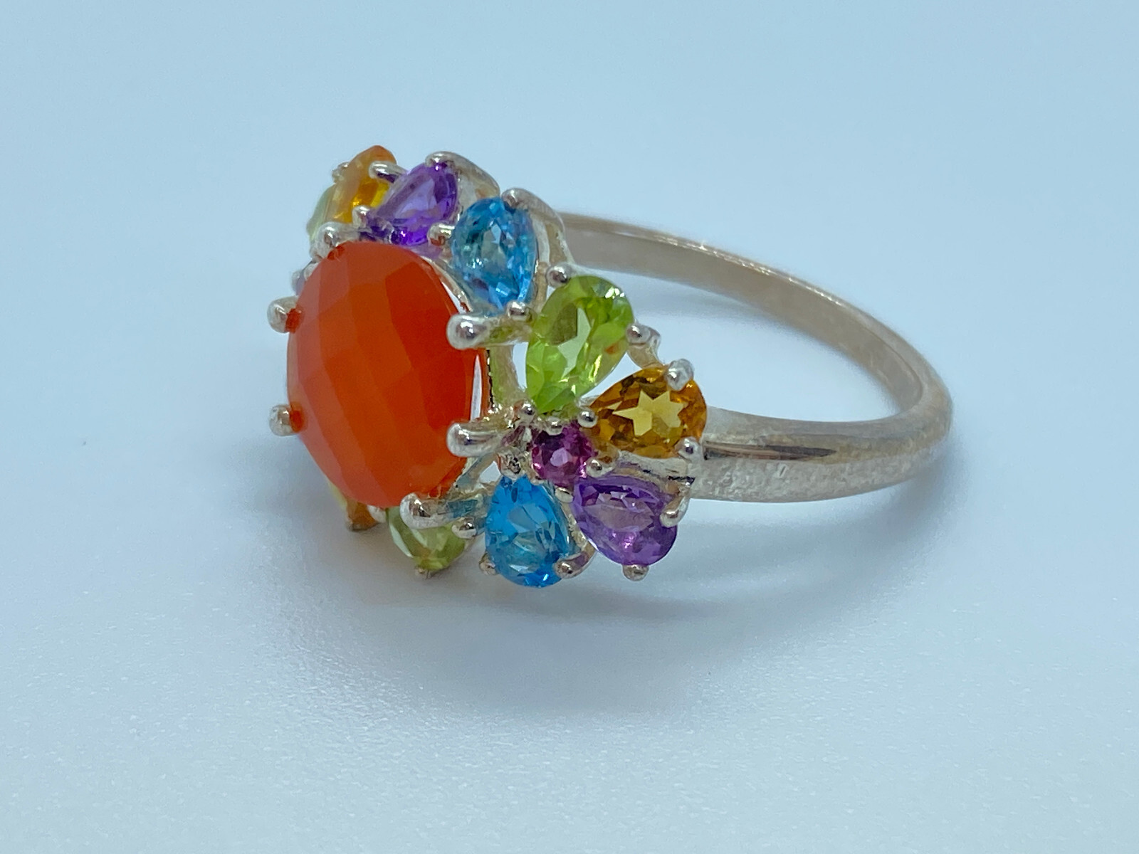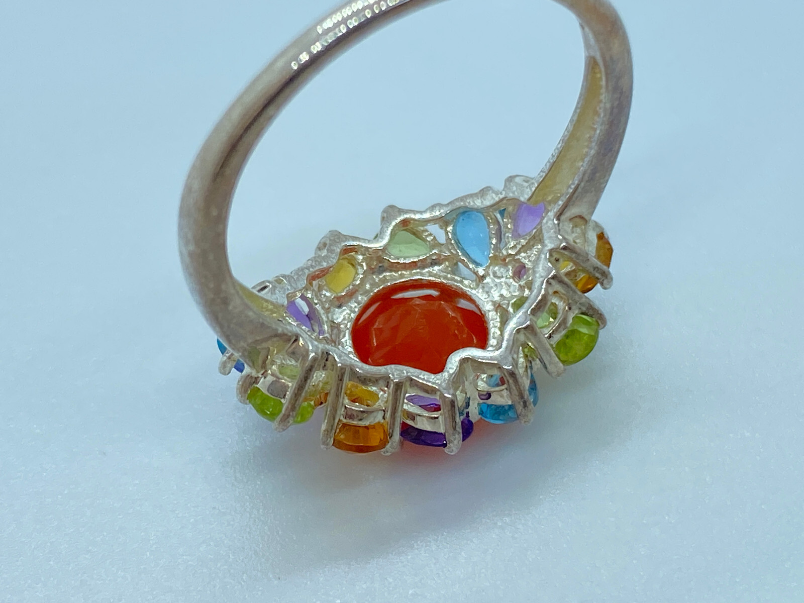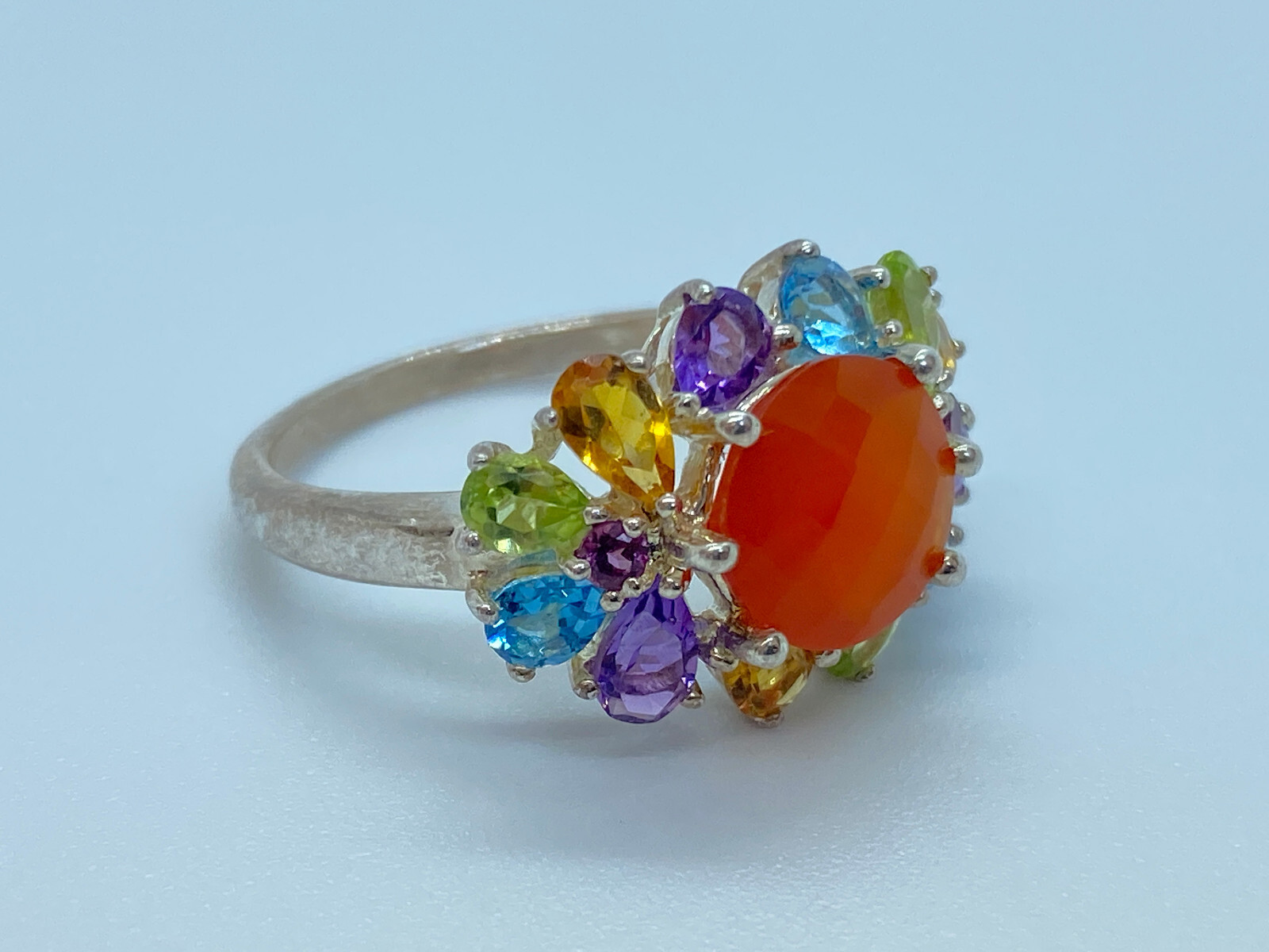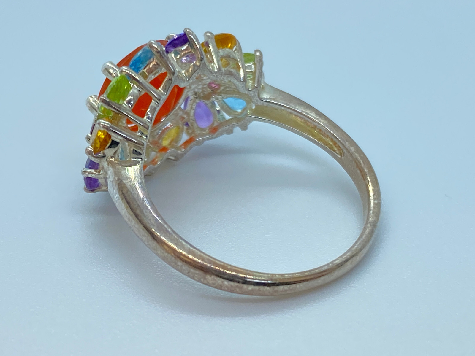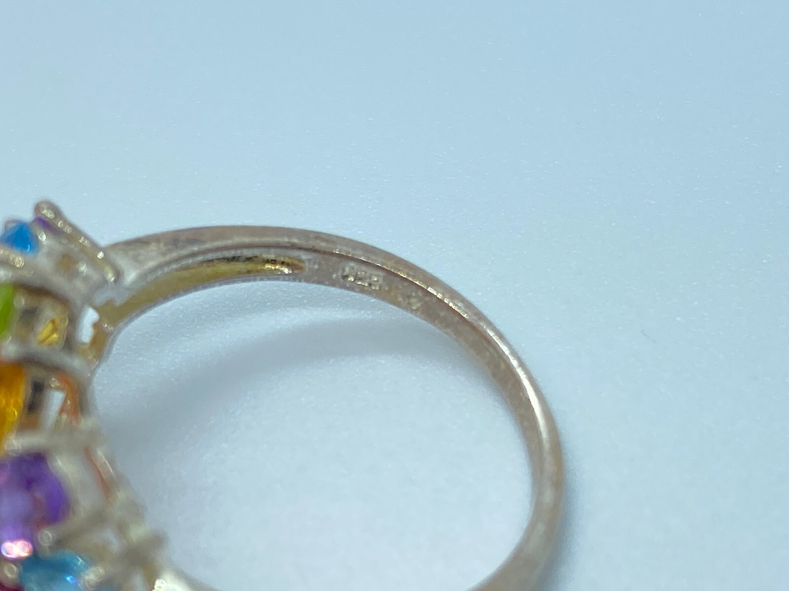 Farbenfroher Ring aus 925 Sterling Silber, gestempelt, ebenfalls mit wahrscheinlich einer 9 gestempelt. Besetzt ist der Ring zentral mit einem undursichtigen Feueropal von ca. 2,13ct., soweit in der Fassung messbar. Begleitet wird dieser von Amethysten (ca. 0,3ct.), Citrinen (ca. 0,3ct.), rosa (ca. 0,04ct.) – und grünfarbenen Turmalinen (ca. 0,4ct.) und blauen Spinellen (ca. 0,4ct.). Alle Angaben soweit sie in den Fassungen messbar waren. Die Oberfläche ist berieben, Ringgröße 59. BTH Mittelstück 2/0,7/1,4cm, B/H Ringschiene 0,2/0,1cm, Gesamtgewicht ca. 4,21g.