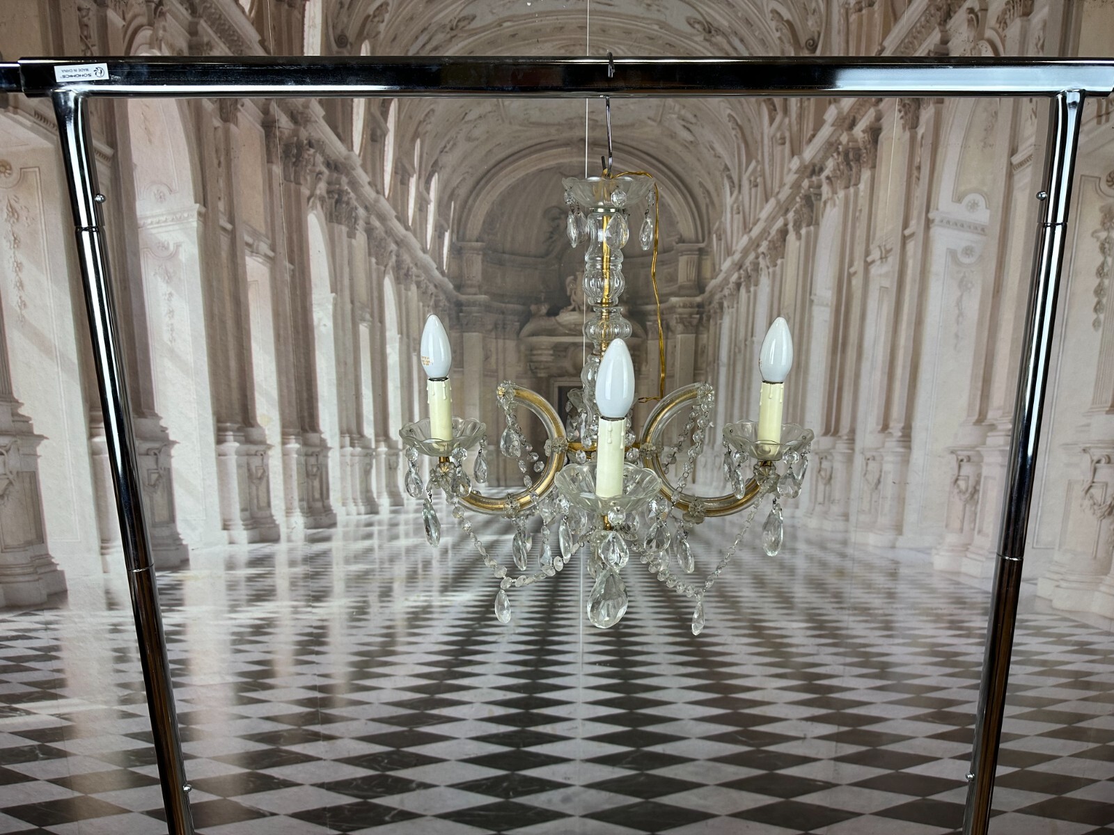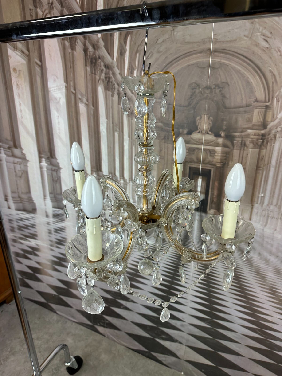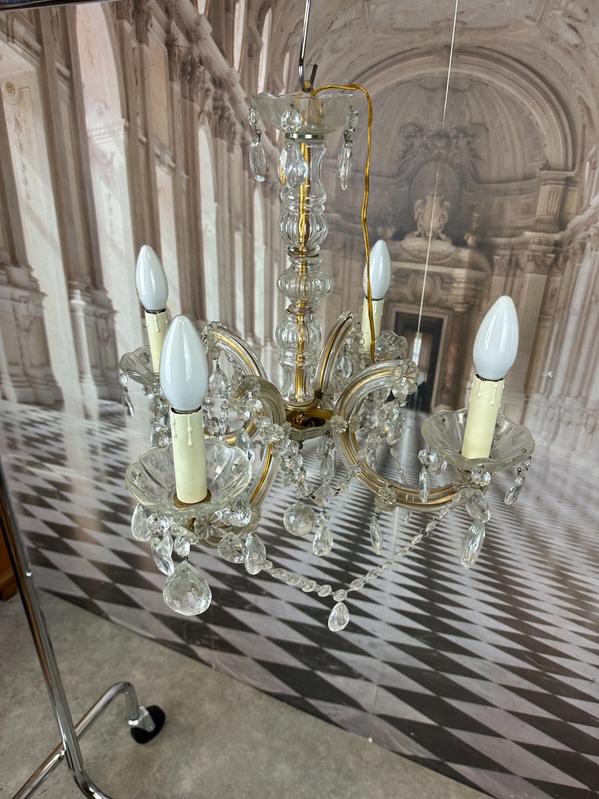 Deckenleuchter aus Glas, ebenfalls mit gläsernem Behang. Oberfläche zum Teil verstaubt, der Behang müßte gegebenenfalls nach Erhalt neu angepasst werden, dieser ist vollständig. Die Funktion war gegeben, Lieferung ohne Leuchtmittel, Abmessungen Höhe/Durchmesser 45/46cm.