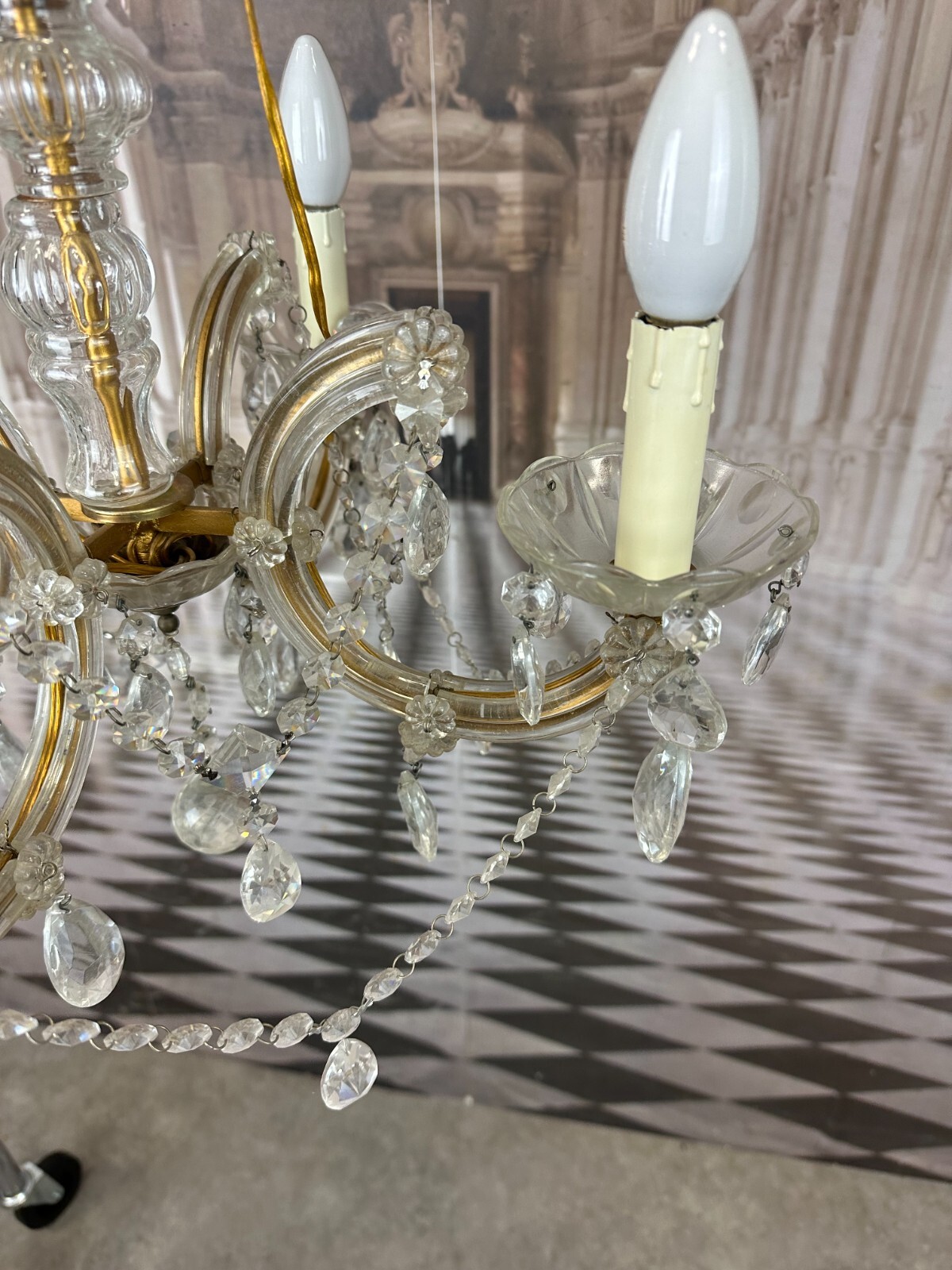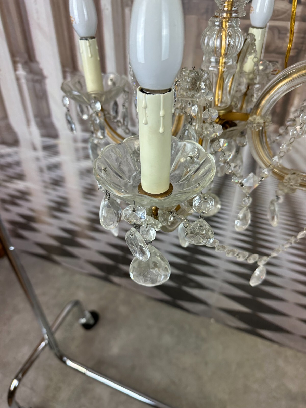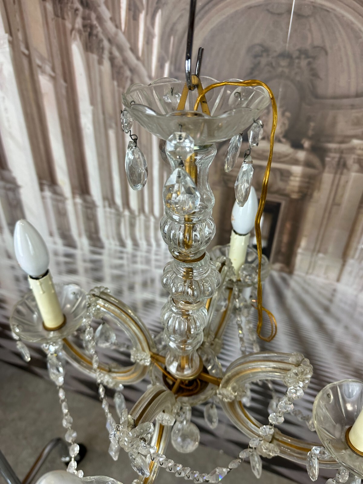 Deckenleuchter aus Glas, ebenfalls mit gläsernem Behang. Oberfläche zum Teil verstaubt, der Behang müßte gegebenenfalls nach Erhalt neu angepasst werden, dieser ist vollständig. Die Funktion war gegeben, Lieferung ohne Leuchtmittel, Abmessungen Höhe/Durchmesser 45/46cm.