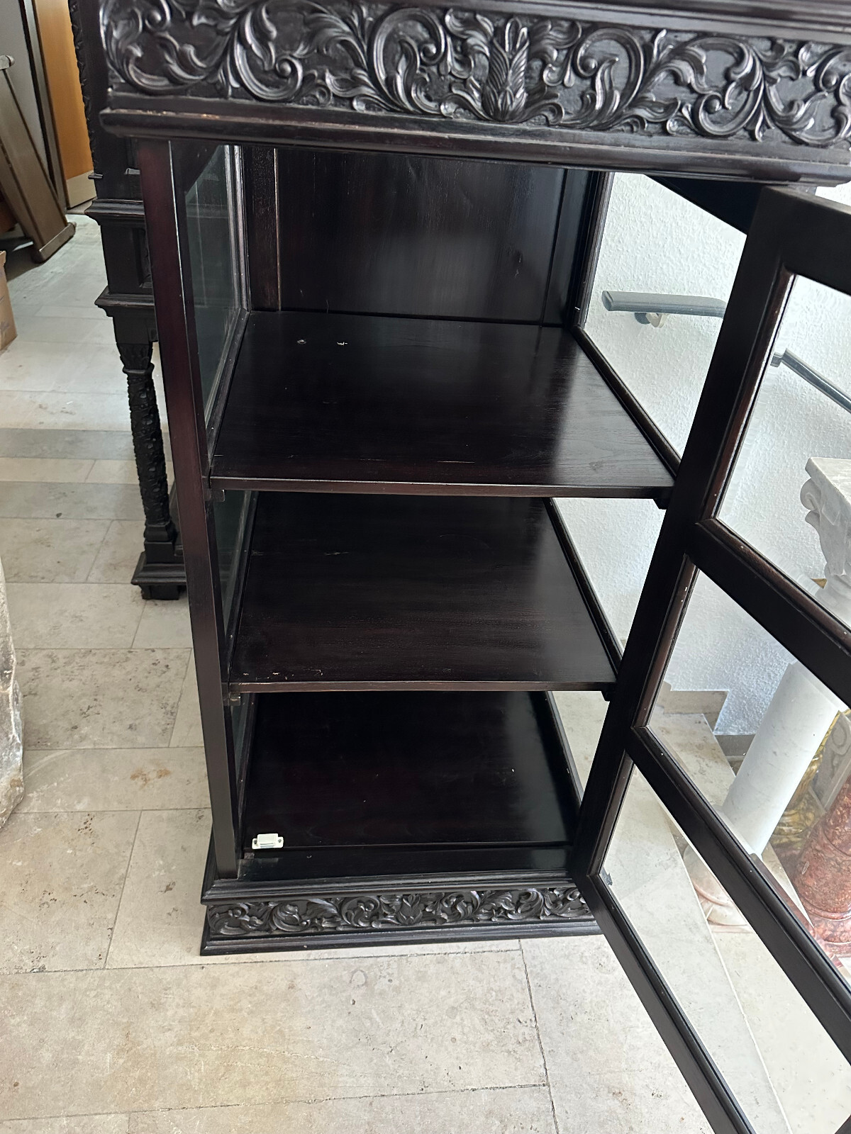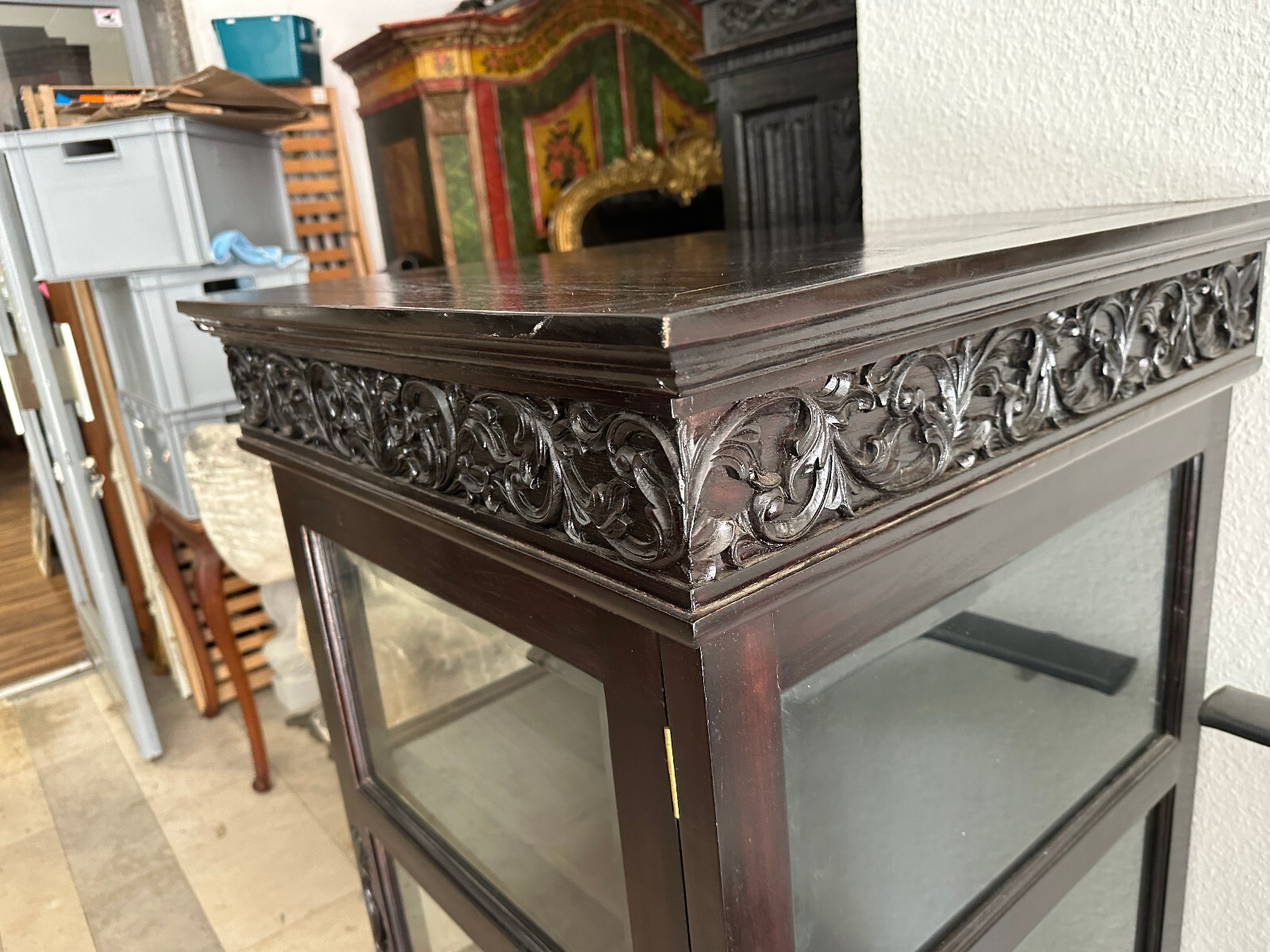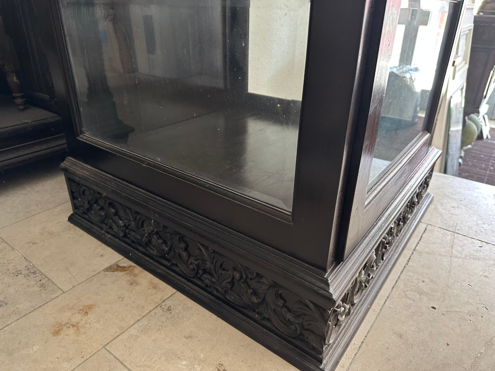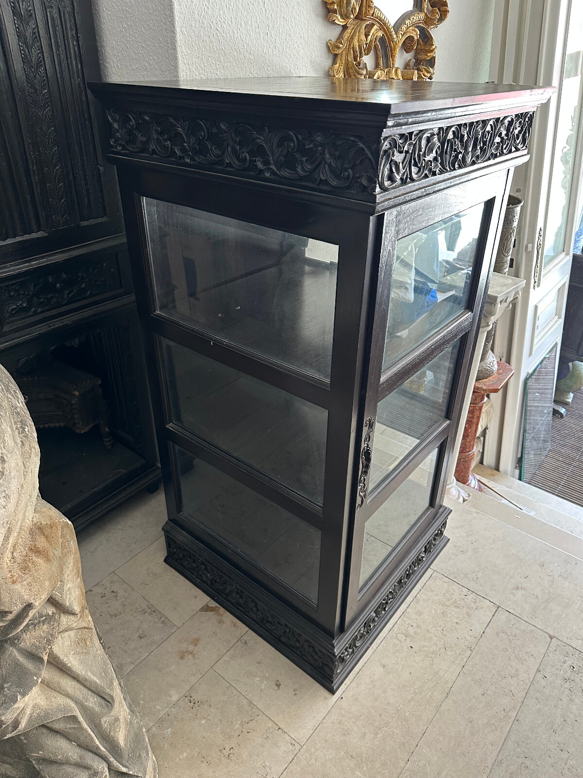 DREI SEITEN VITRINE AUS HOLZ SCHWARZ GEFASST MIT FLACHRELIEF SCHNITZEREIEN 20 JH