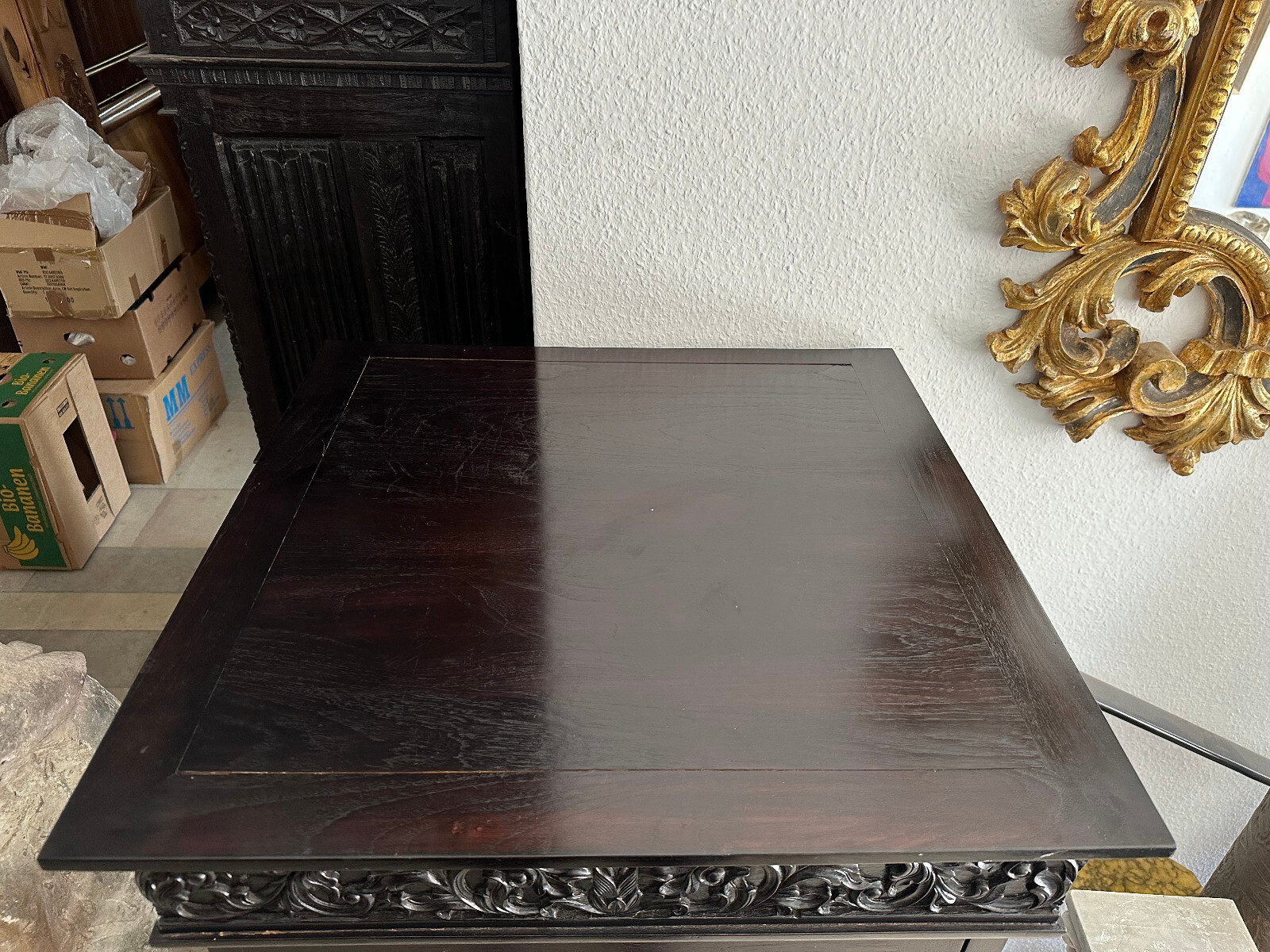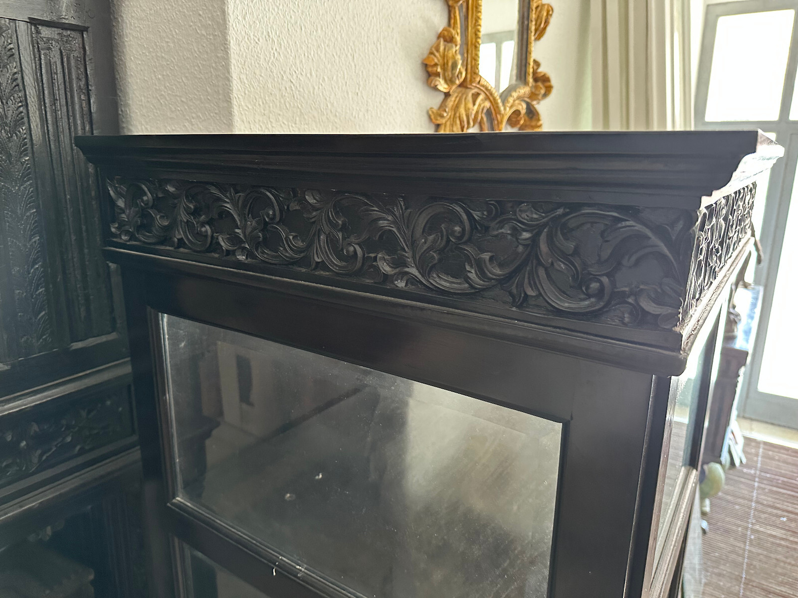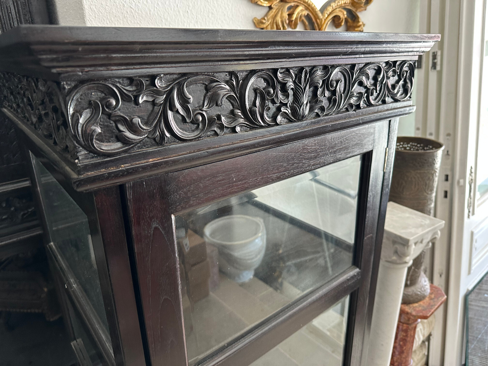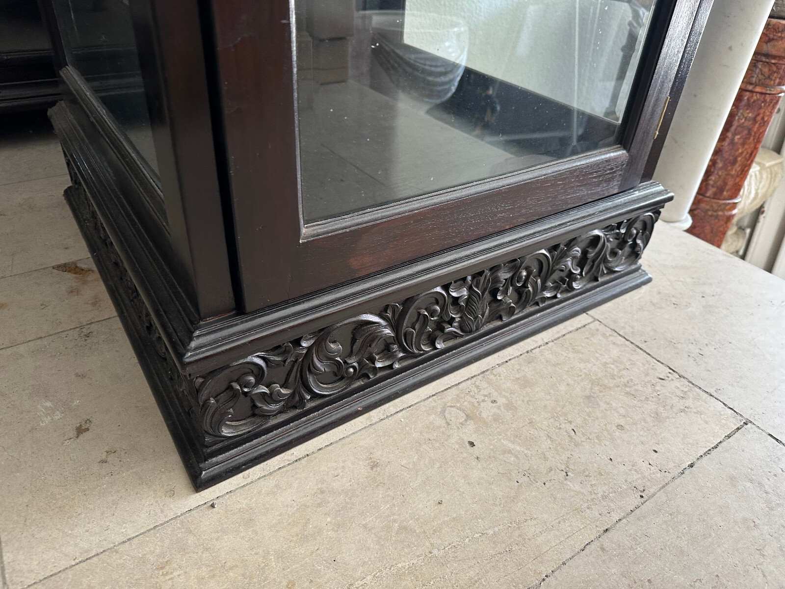 DREI SEITEN VITRINE AUS HOLZ SCHWARZ GEFASST MIT FLACHRELIEF SCHNITZEREIEN 20 JH