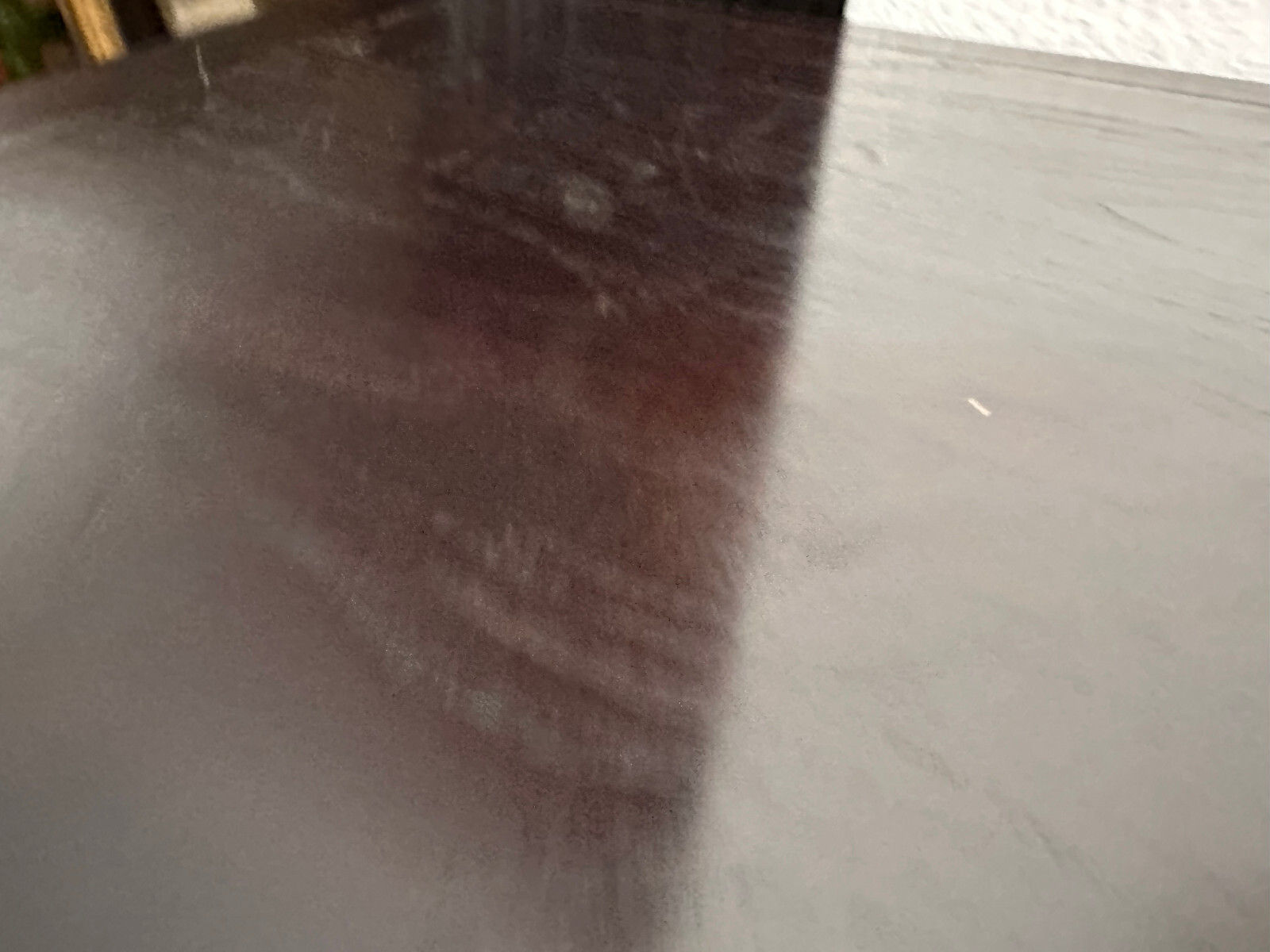 Neuzeitige Dreiseiten Vitrine aus massivem Holz, komplett schwarz gefasst. An der Oberfläche zum Teil feine Kratzer und minimale Absplitterungen in der Farbschicht. Die Gläser sind intakt, die inneren Ablagen ebenfalls mit leichtem Abrieb oder Kratzer. Die Bodenkante kann leichte Bestoßungen haben. Die Tür hatte nie einen Schließer, die Vitrin ist nicht zerlegbar und schwer. An den Zusammenfügungsstellen kleinere Dehnungsfugen (keine Risse). Abmessungen BTH: 68x66x132cm. Die oberen Ablagen sind sehr stabil und können als Ausstellungsfläche auch für etwas schwerere Gegenstände dienen (bis 10 kg ca.).