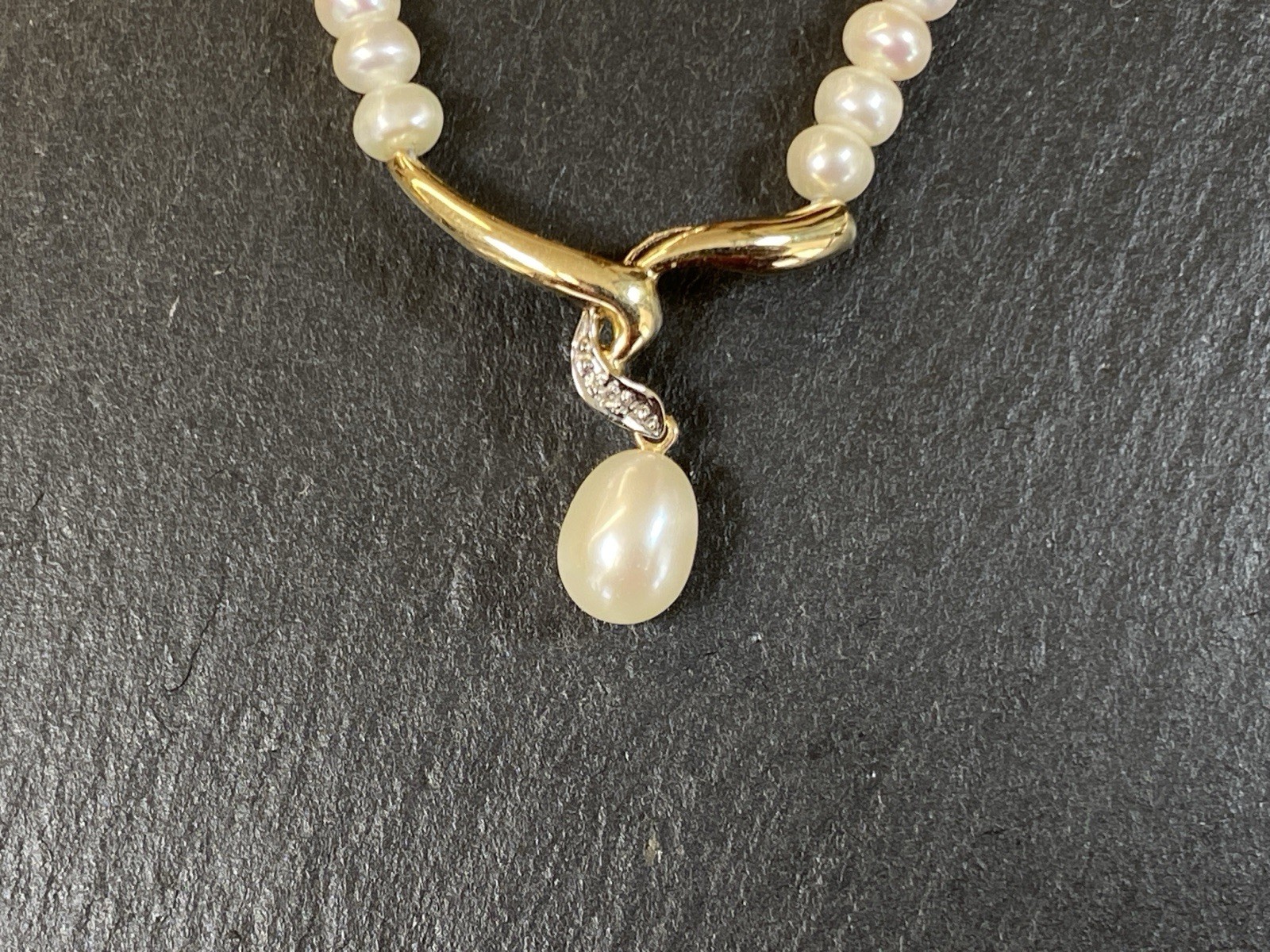 Elegante Süsswasserperlenkette mit Mittelstück aus 14K Gelbgold, gestempelt, mit einem kleinen Diamanten von ca. 0,005ct., soweit in der Fassung messbar. Die hängende Perle hat H/B von 0,9/0,66cm, die Perlen in der Kette selbst haben Durchmesser von ca. 0,4-0,45cm. Länge der Kette gesamt ca 42cm, BTH des Mittelstücks 2,35/0,4/2,3cm, Gesamtgewicht ca. 14,26g. Die Begutachtung der Stücke wird vorgenommen von einem Fachmitglied der deutschen gemmologischen Gesellschaft E.V.